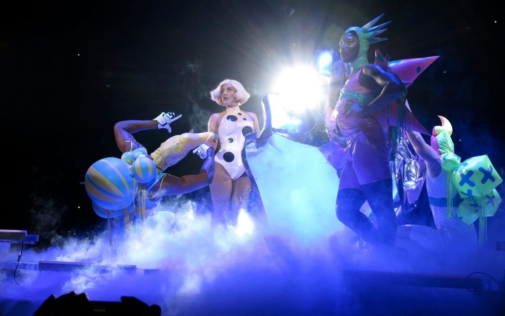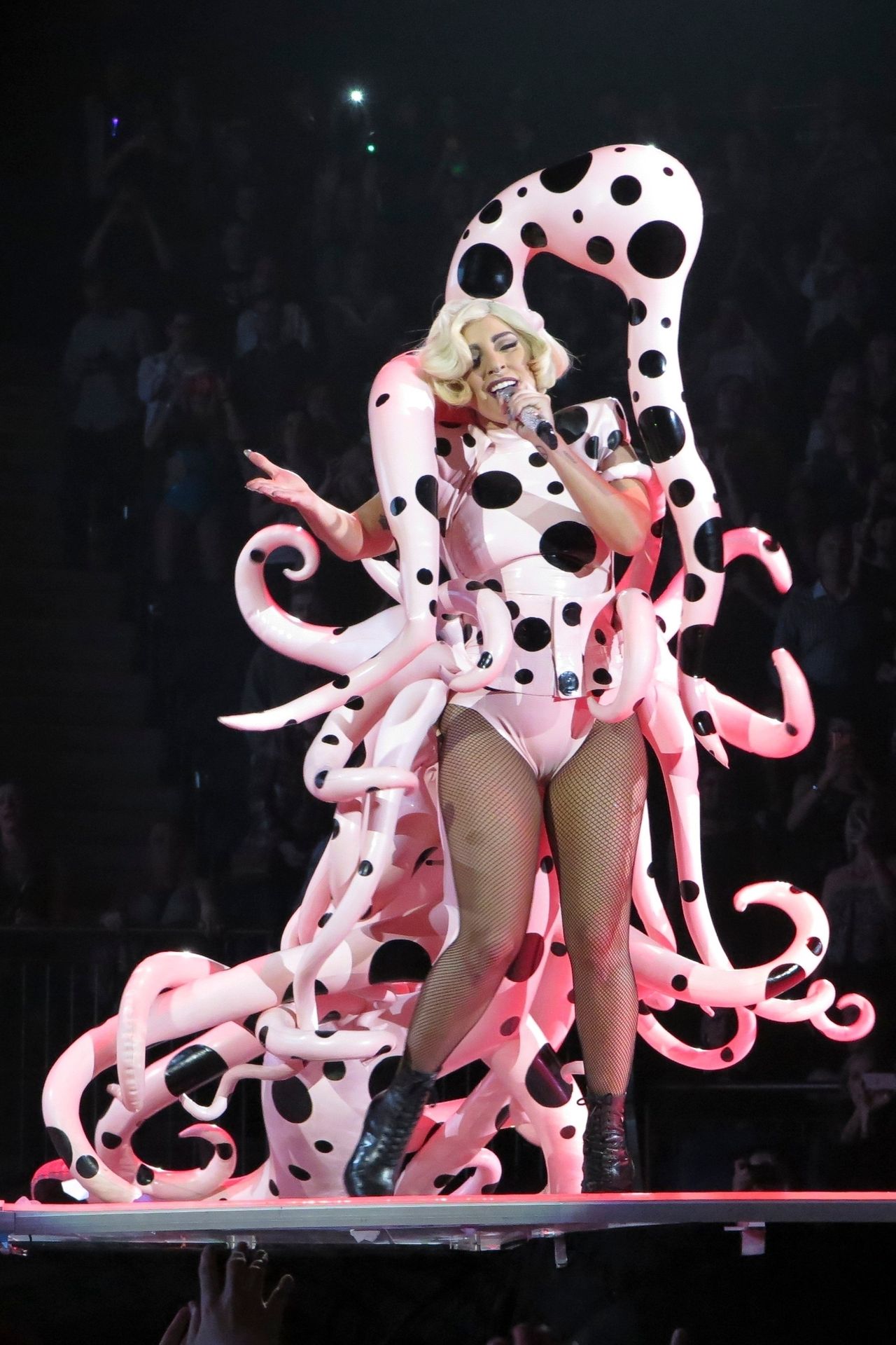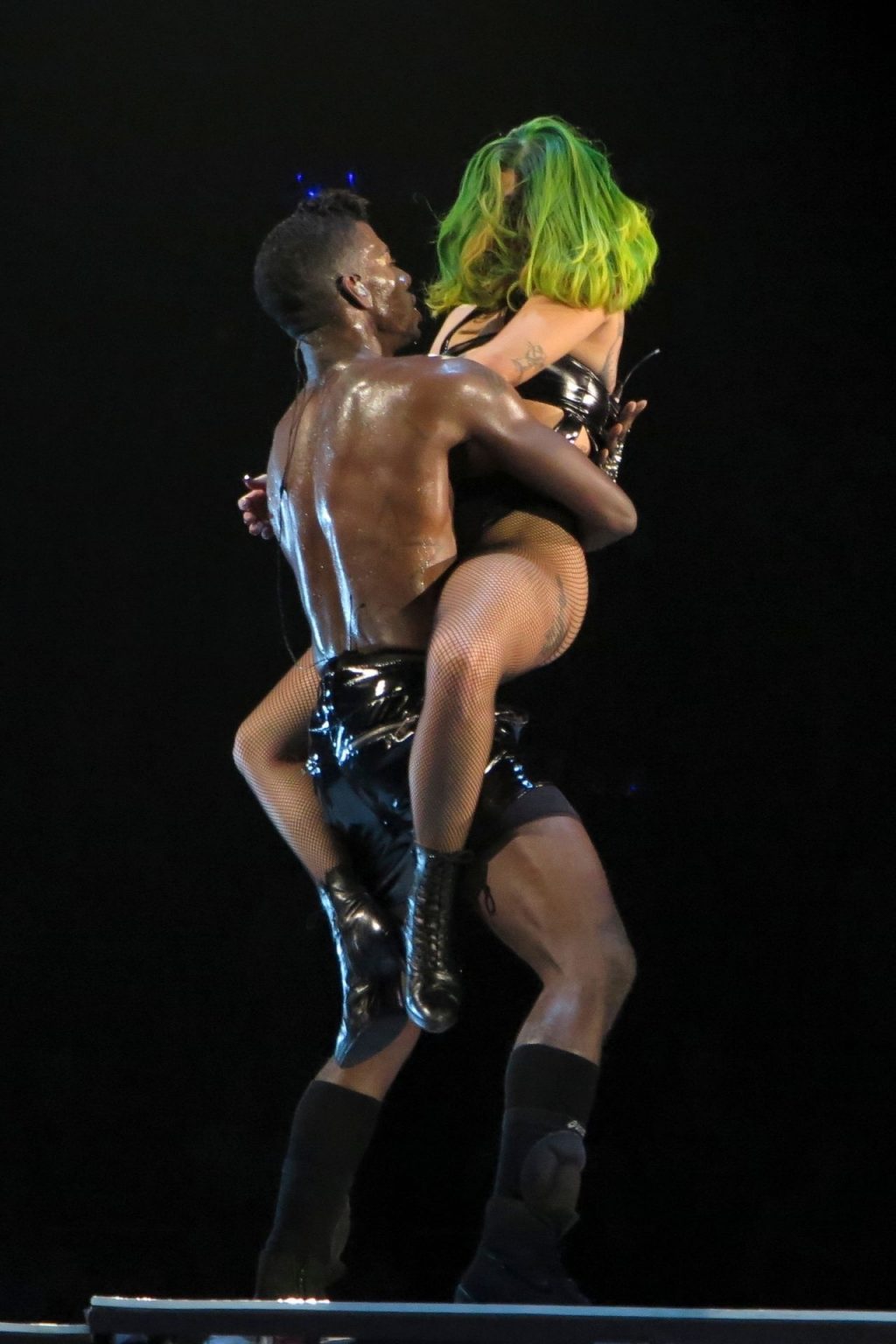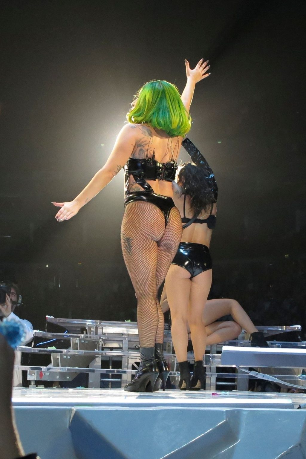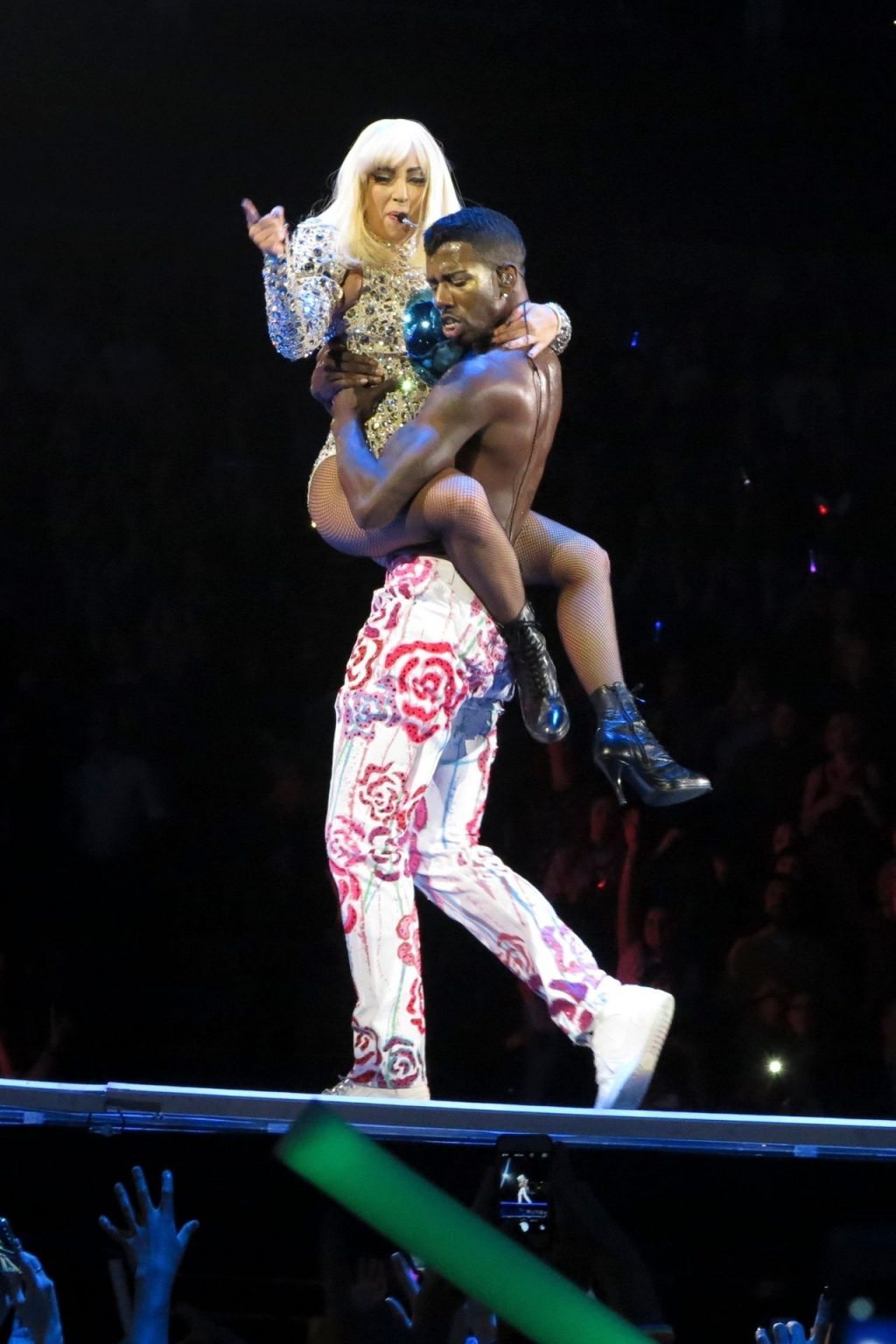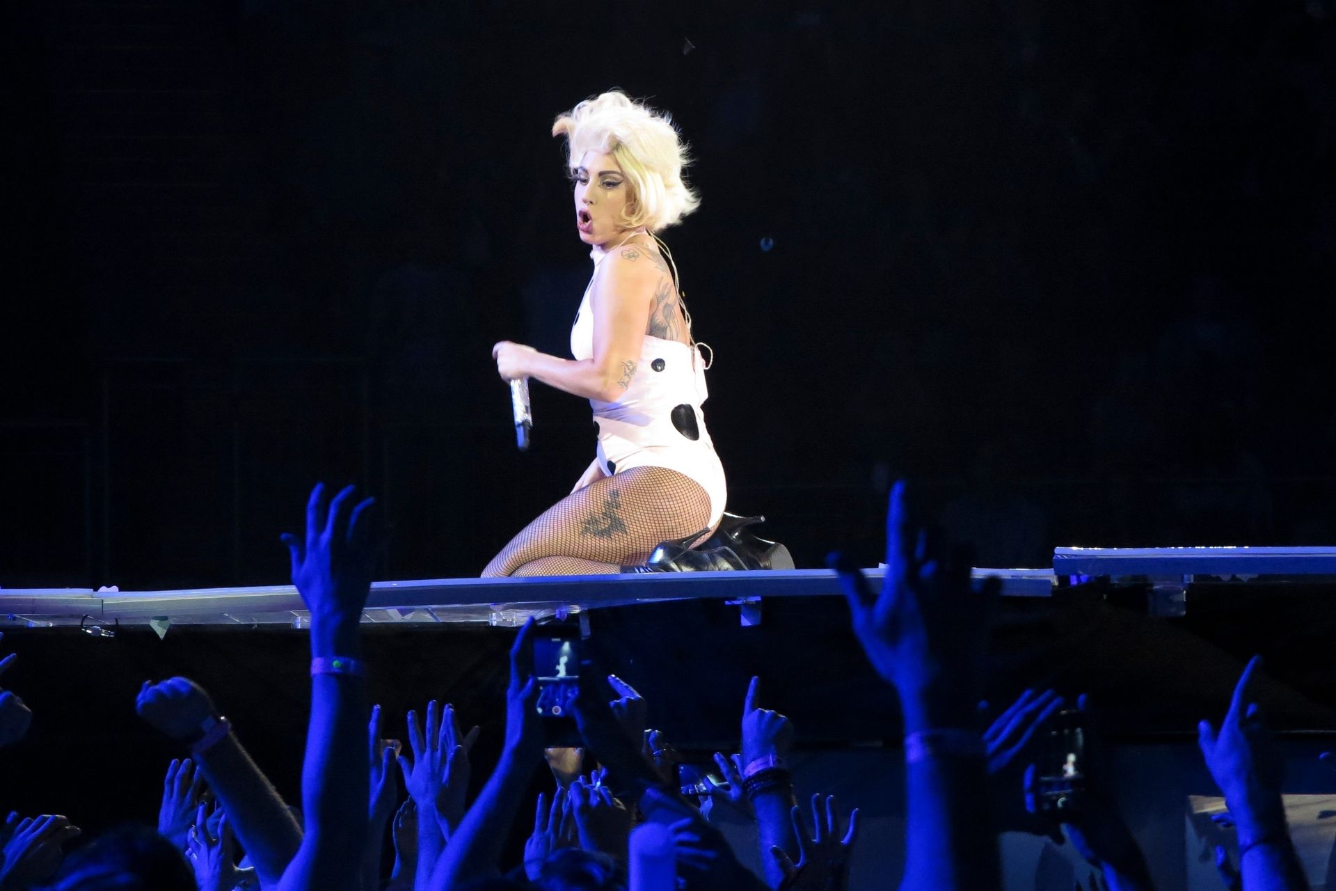 La chanteuse Lady Gaga se produit à l’O2 Arena de Londres, en Angleterre, le 23/10/2014. Elle a surpris avec ses nombreuses tenues et ses poses sexy sur scène.