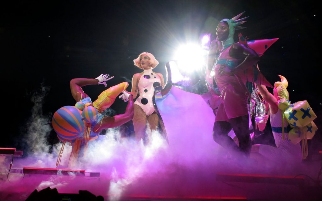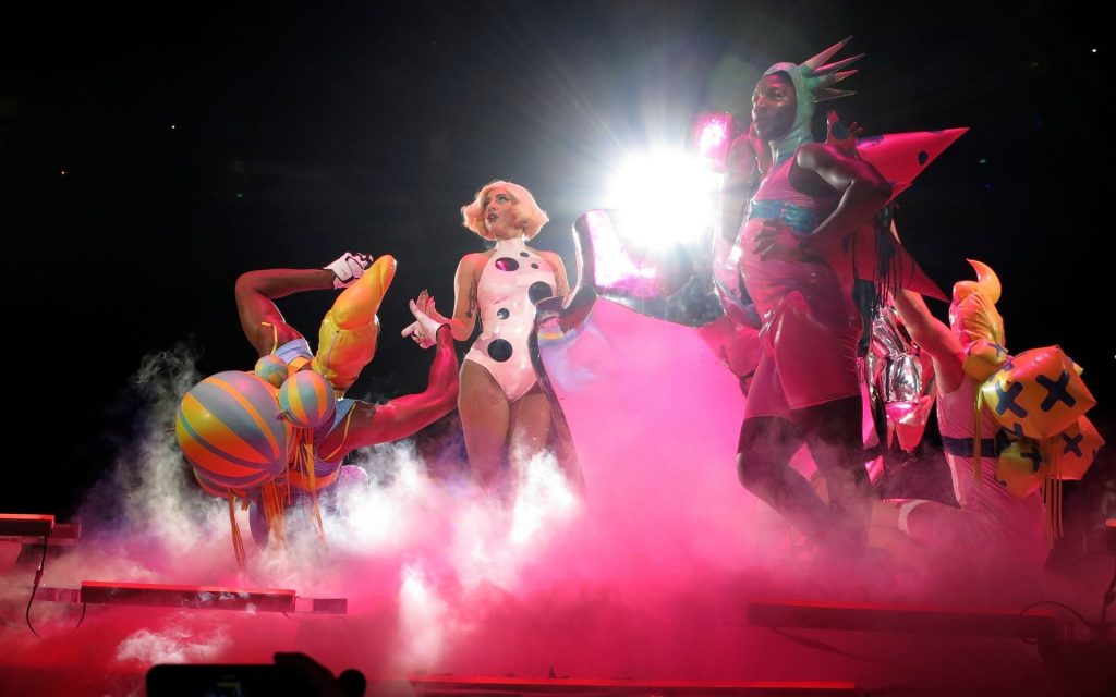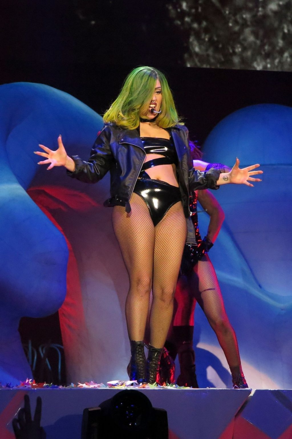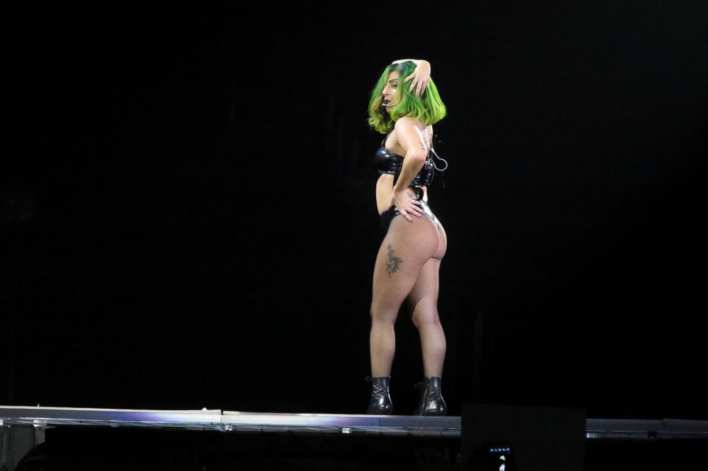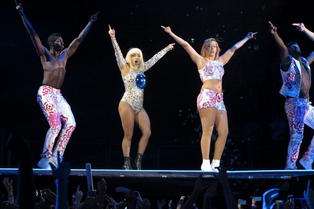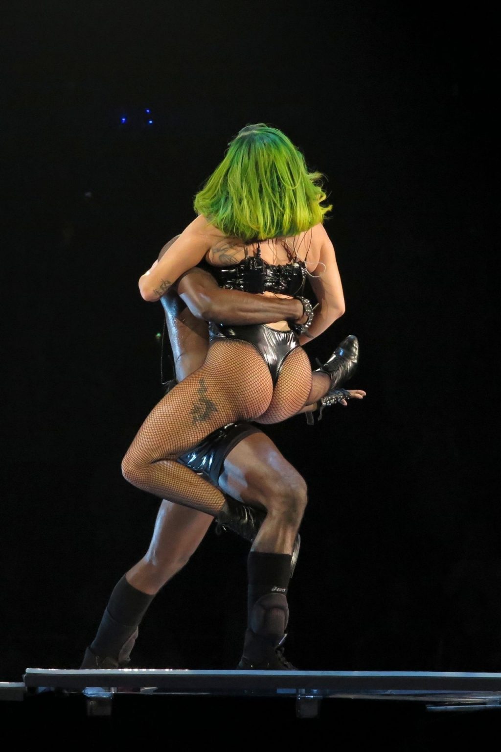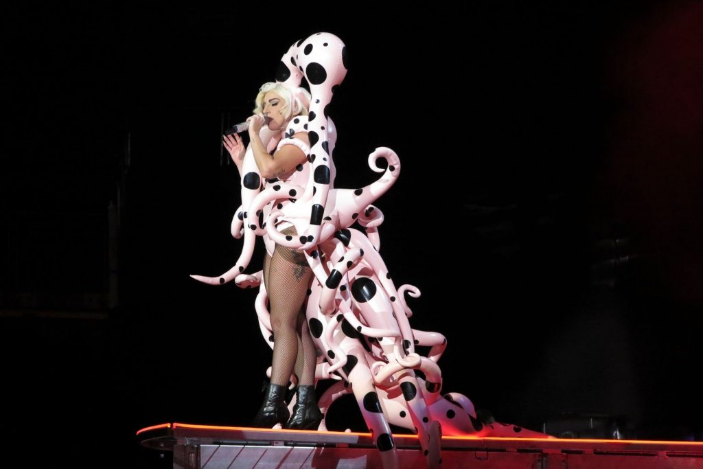 La chanteuse Lady Gaga se produit à l’O2 Arena de Londres, en Angleterre, le 23/10/2014. Elle a surpris avec ses nombreuses tenues et ses poses sexy sur scène.