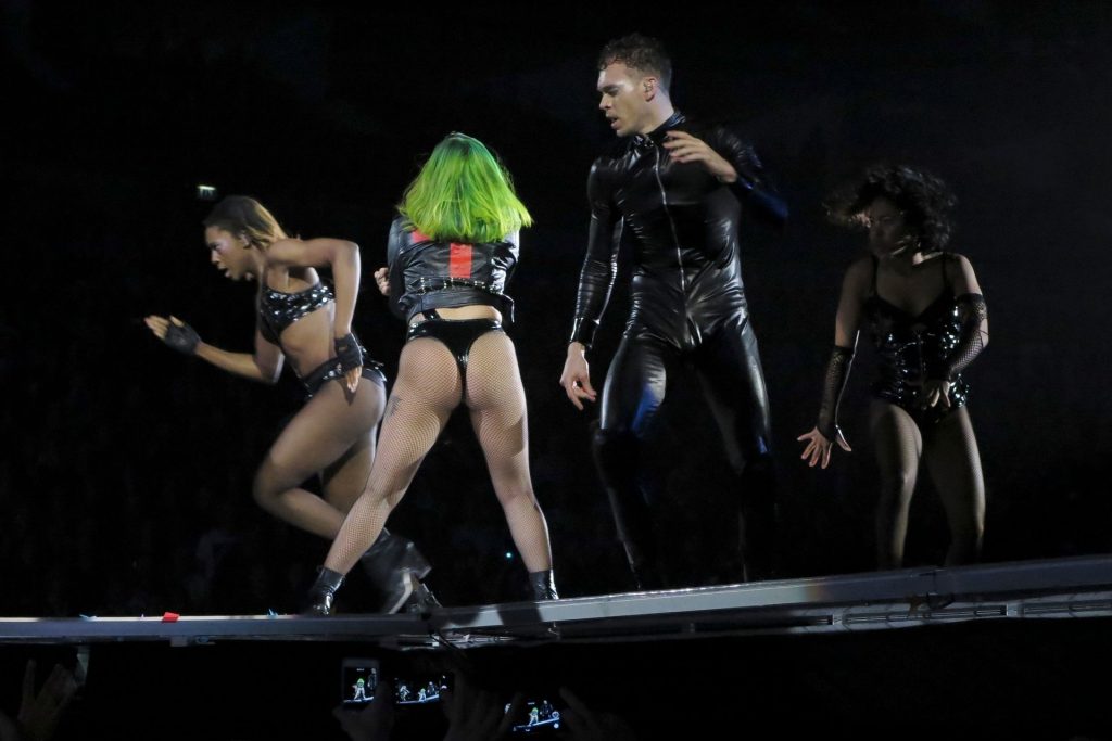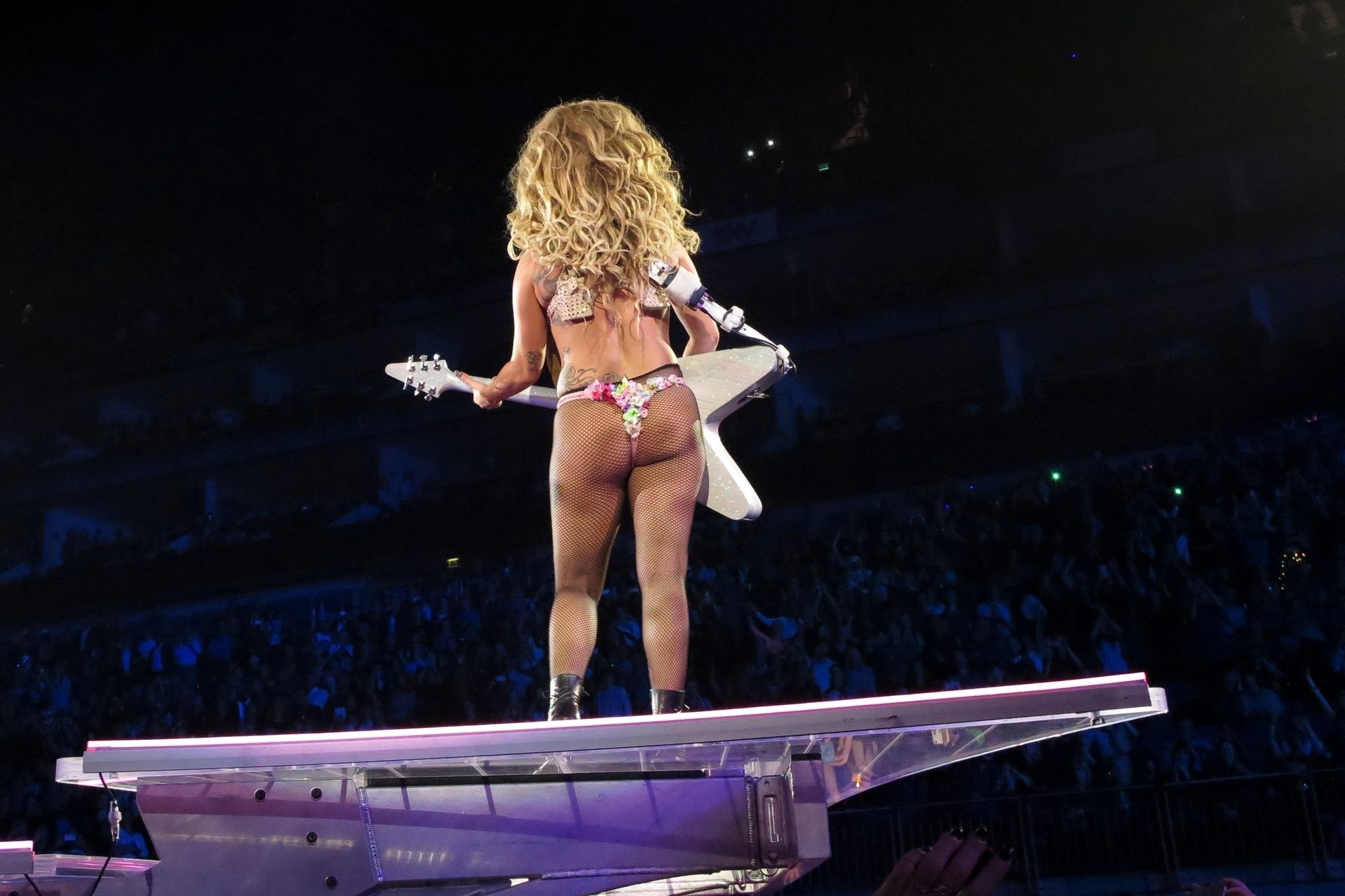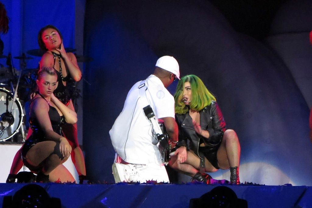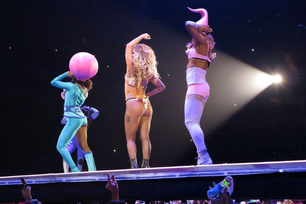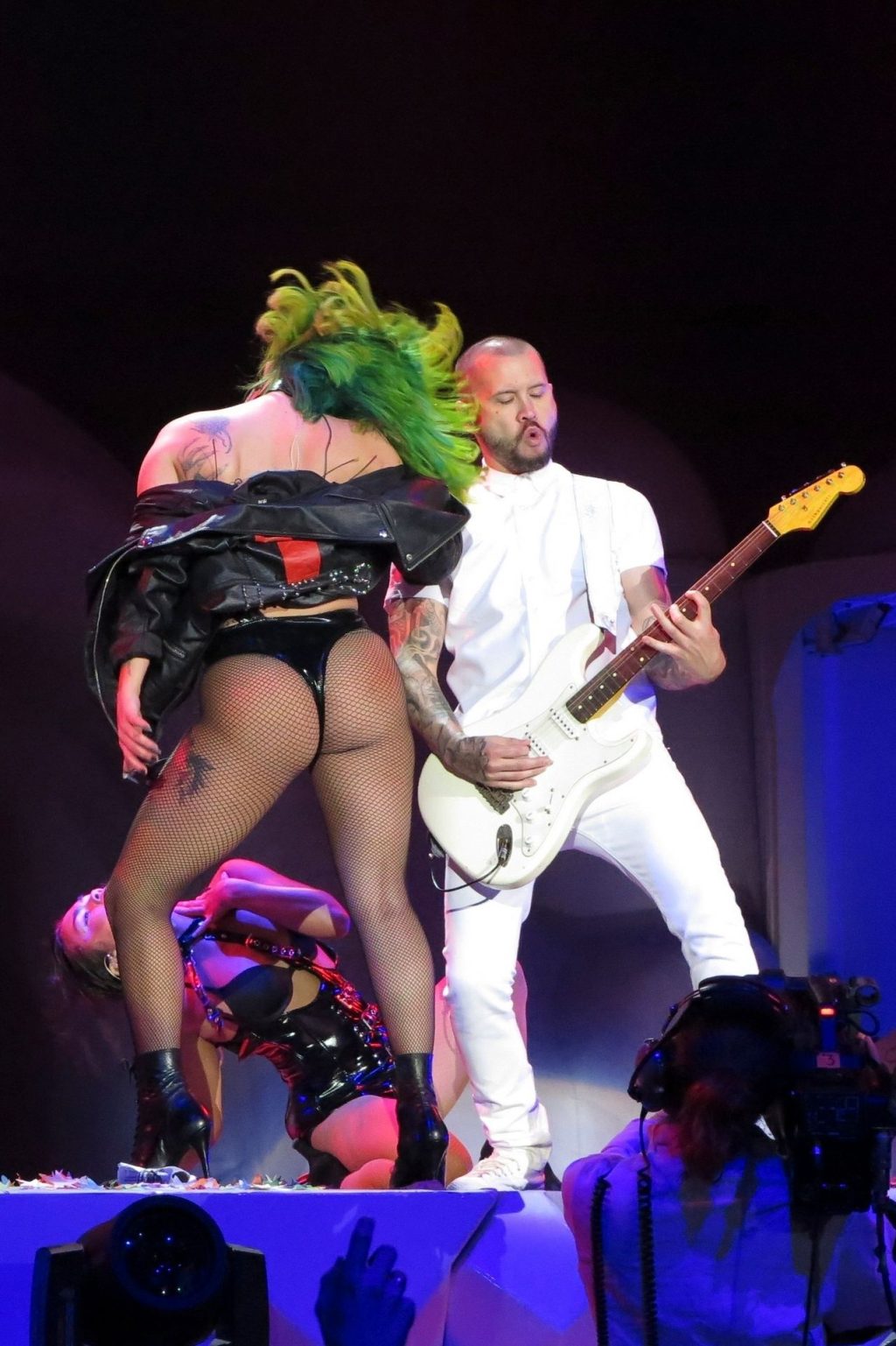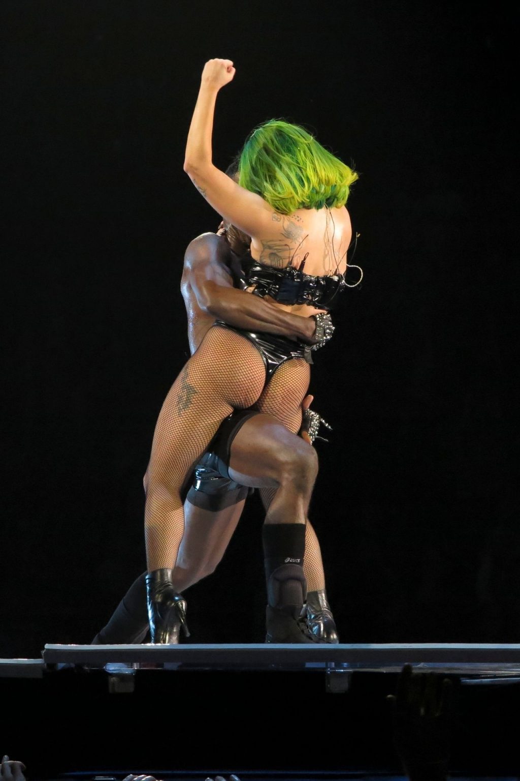 La chanteuse Lady Gaga se produit à l’O2 Arena de Londres, en Angleterre, le 23/10/2014. Elle a surpris avec ses nombreuses tenues et ses poses sexy sur scène.