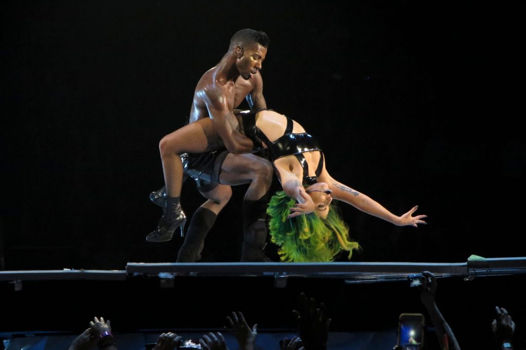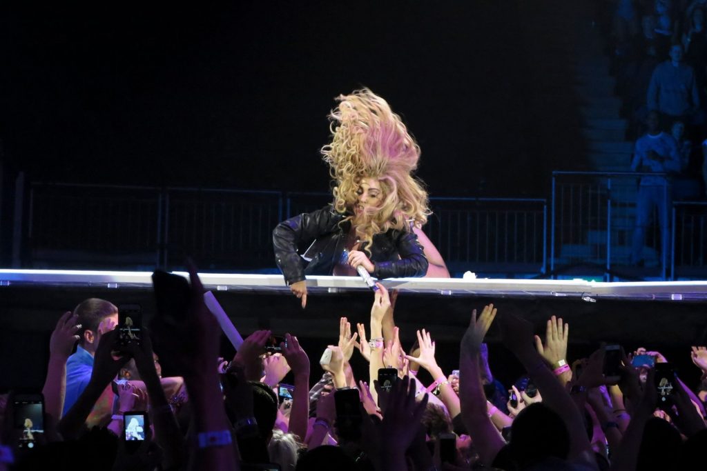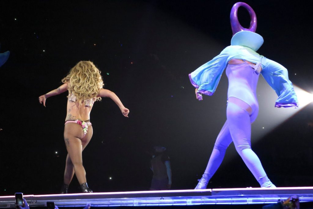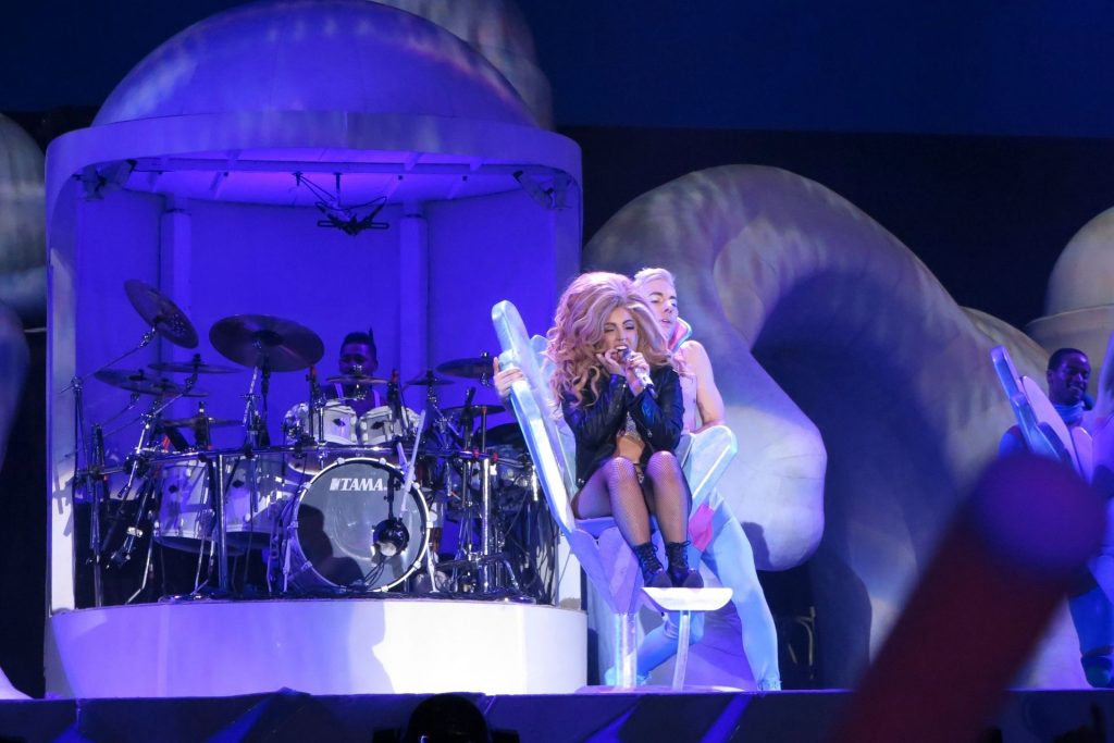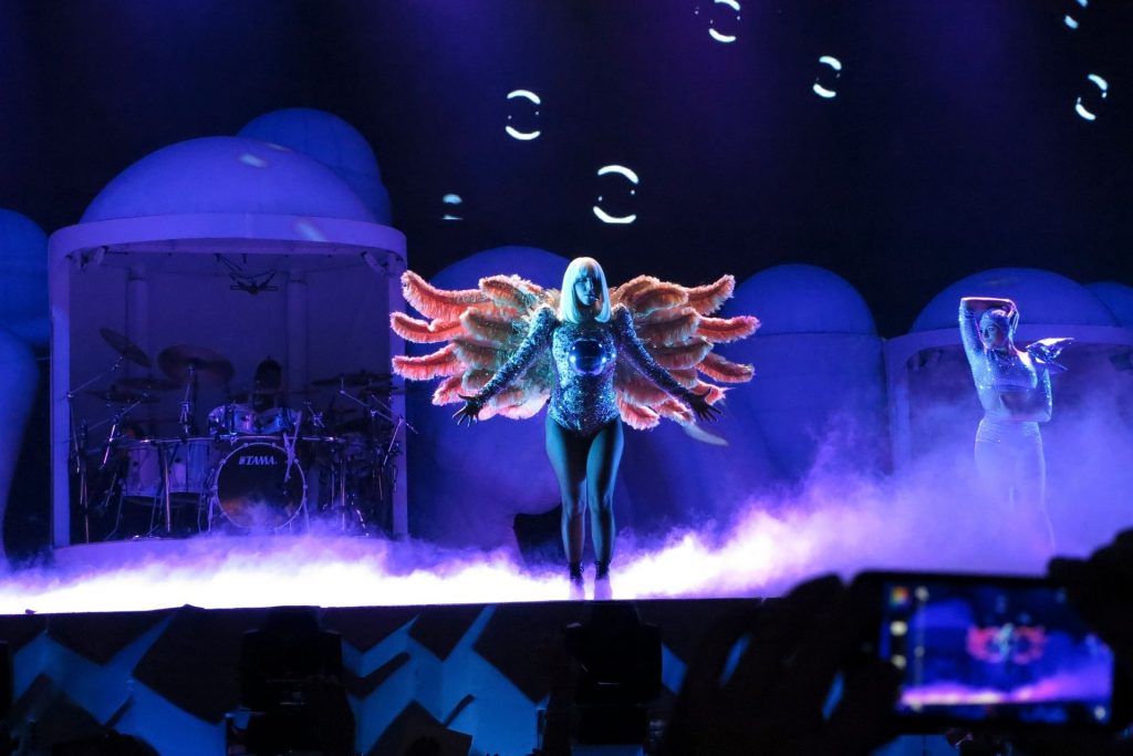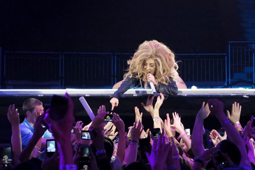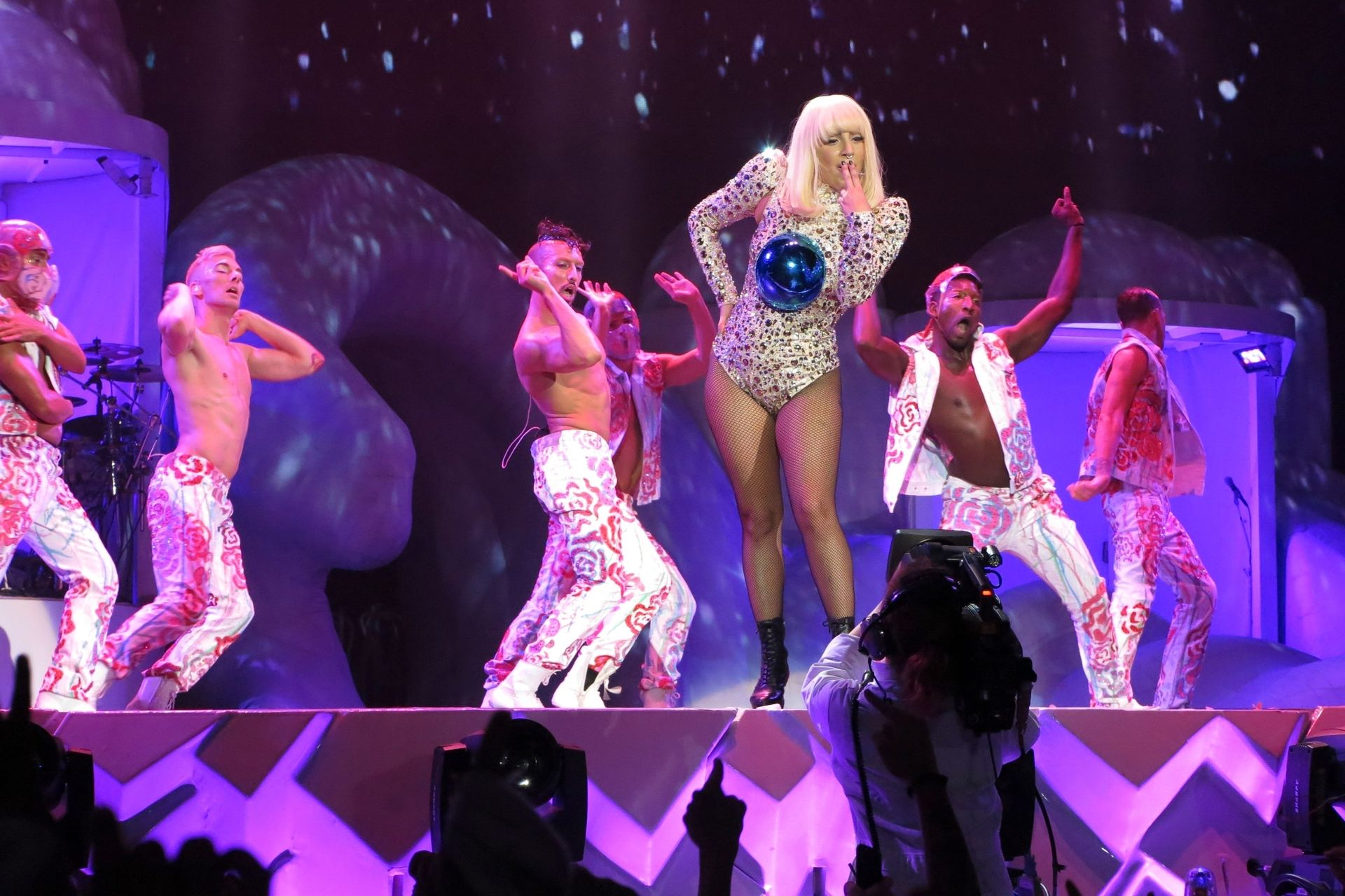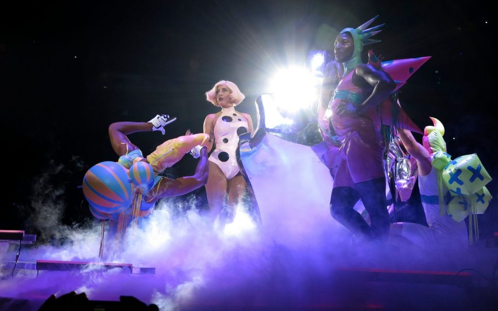 La chanteuse Lady Gaga se produit à l’O2 Arena de Londres, en Angleterre, le 23/10/2014. Elle a surpris avec ses nombreuses tenues et ses poses sexy sur scène.