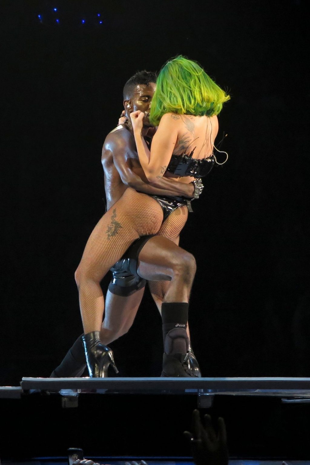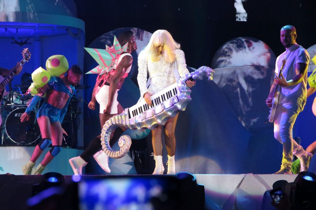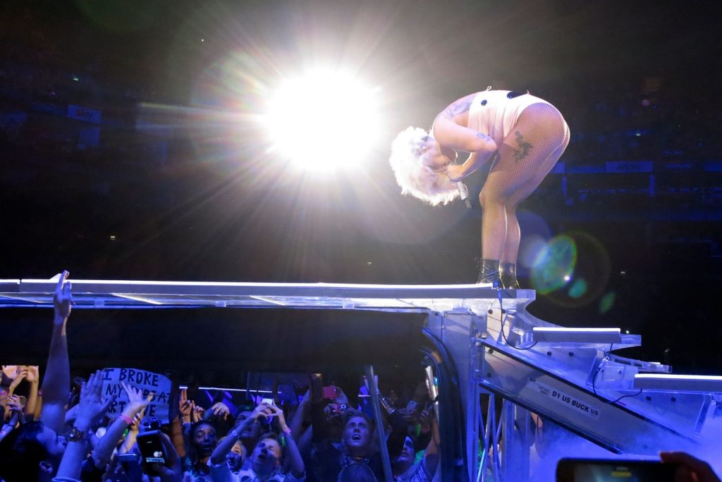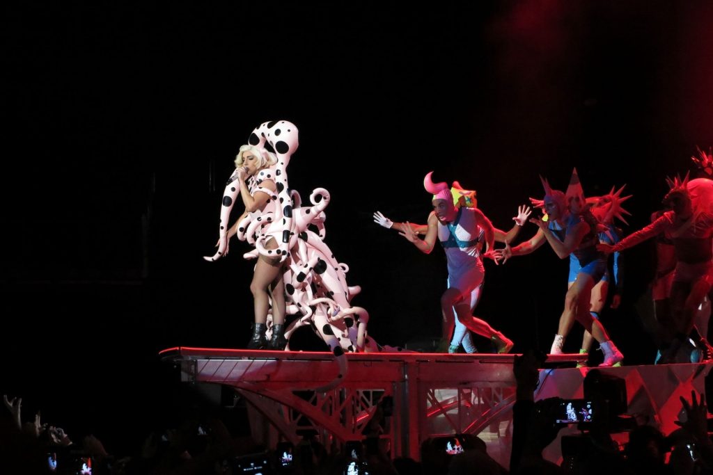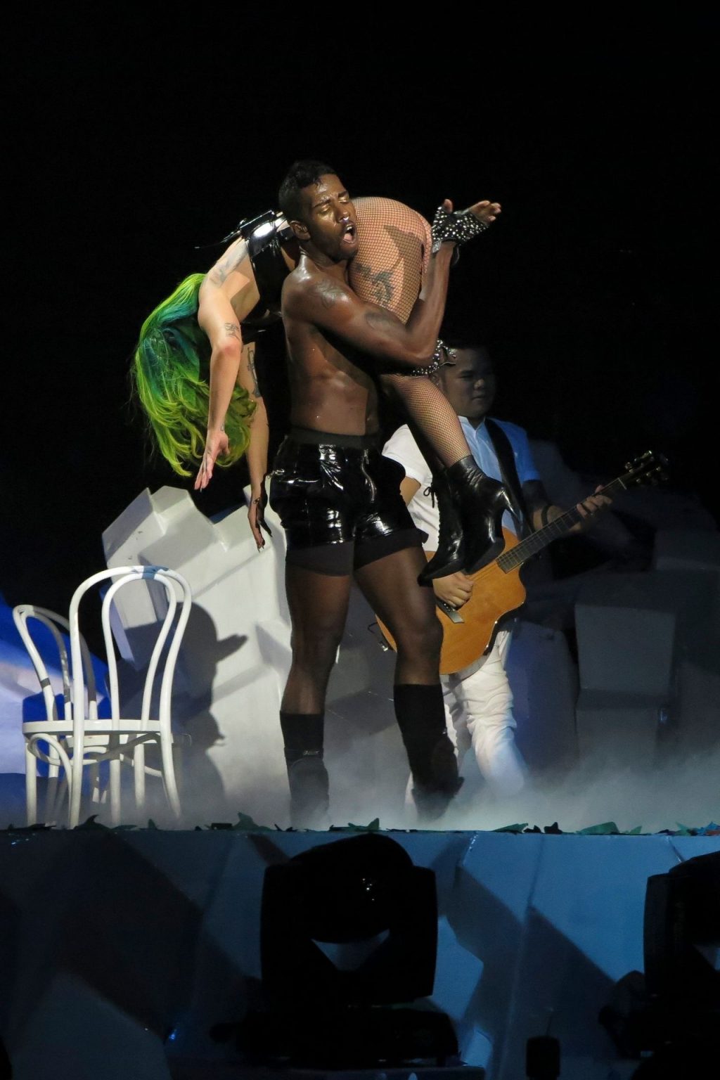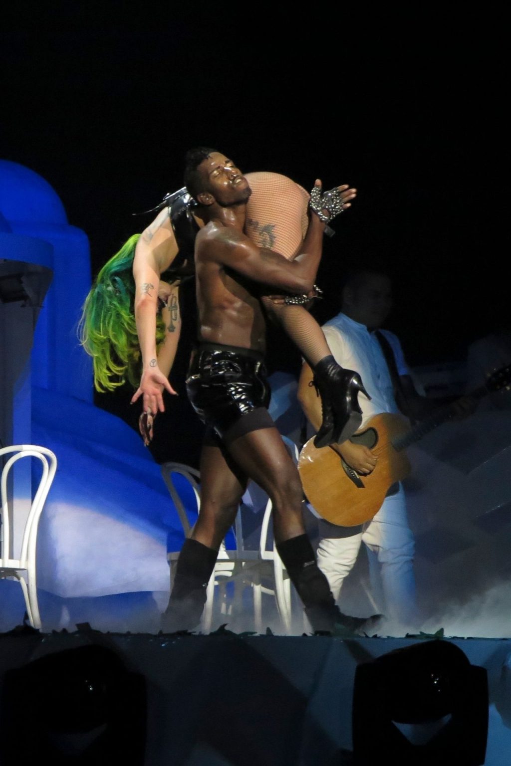 La chanteuse Lady Gaga se produit à l’O2 Arena de Londres, en Angleterre, le 23/10/2014. Elle a surpris avec ses nombreuses tenues et ses poses sexy sur scène.
