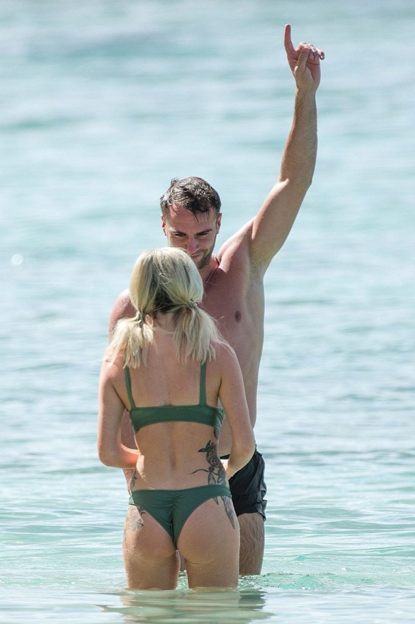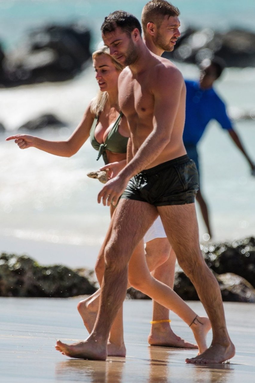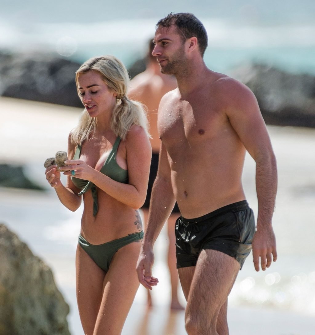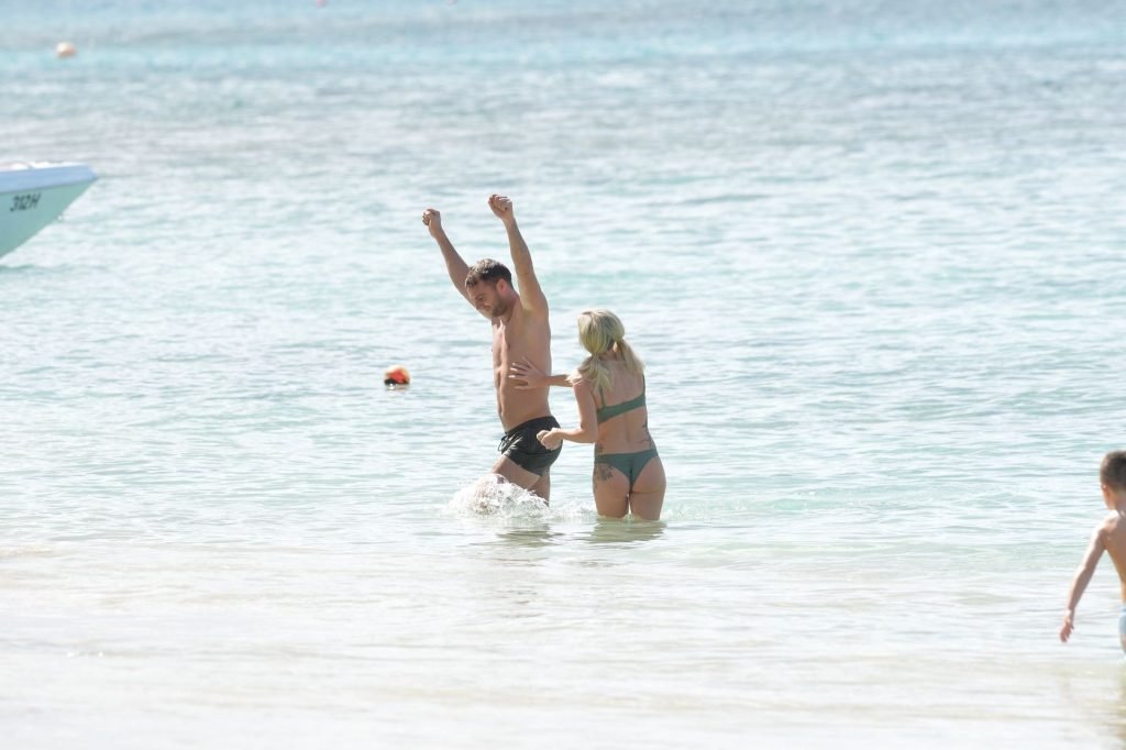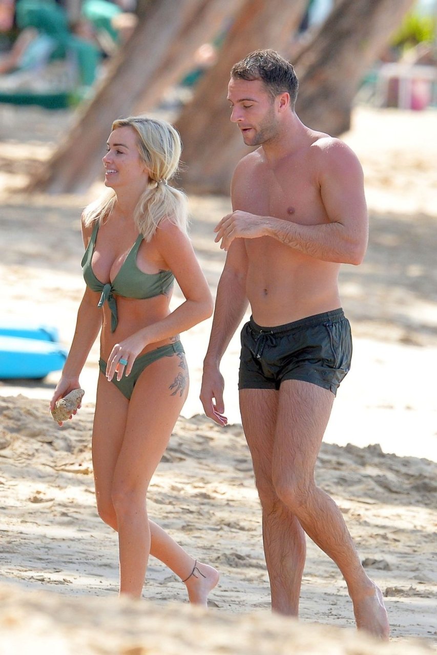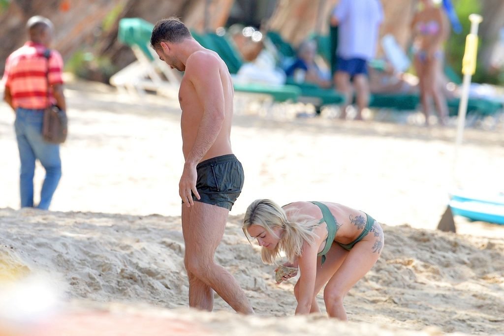 Le couple Laura Anderson et Max Morley est photographié à la Barbade, le 12/10/2018. La blonde de 29 ans a exhibé son corps sexy tatoué en bikini sur la plage.
