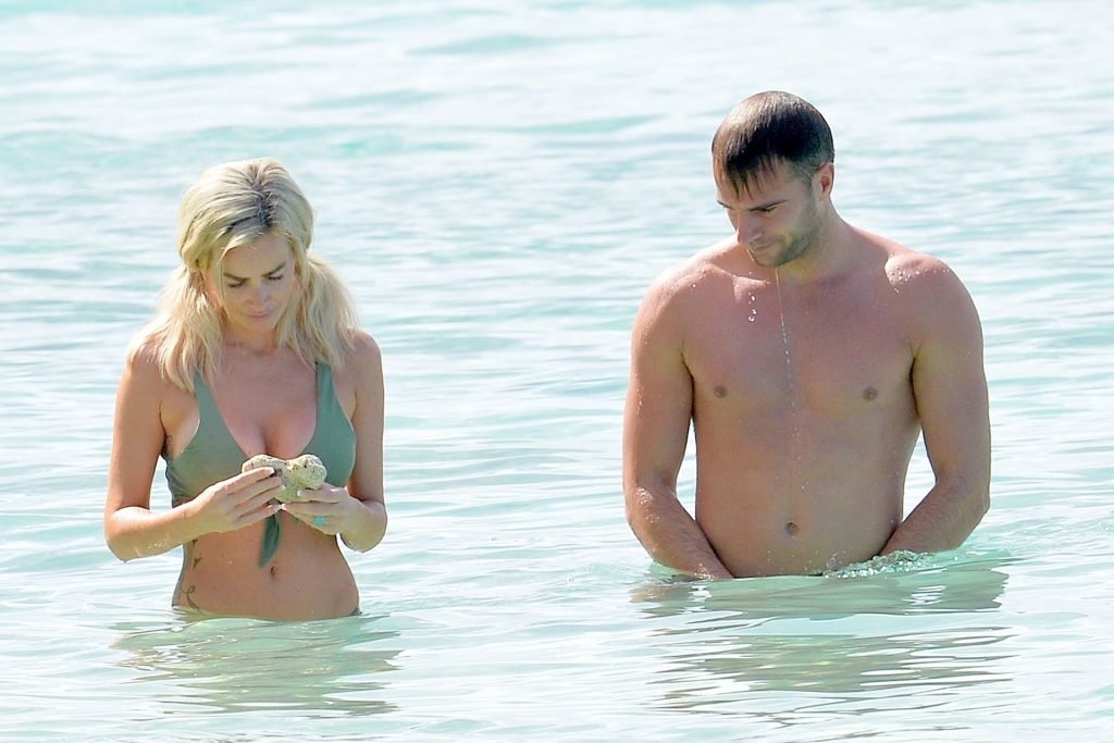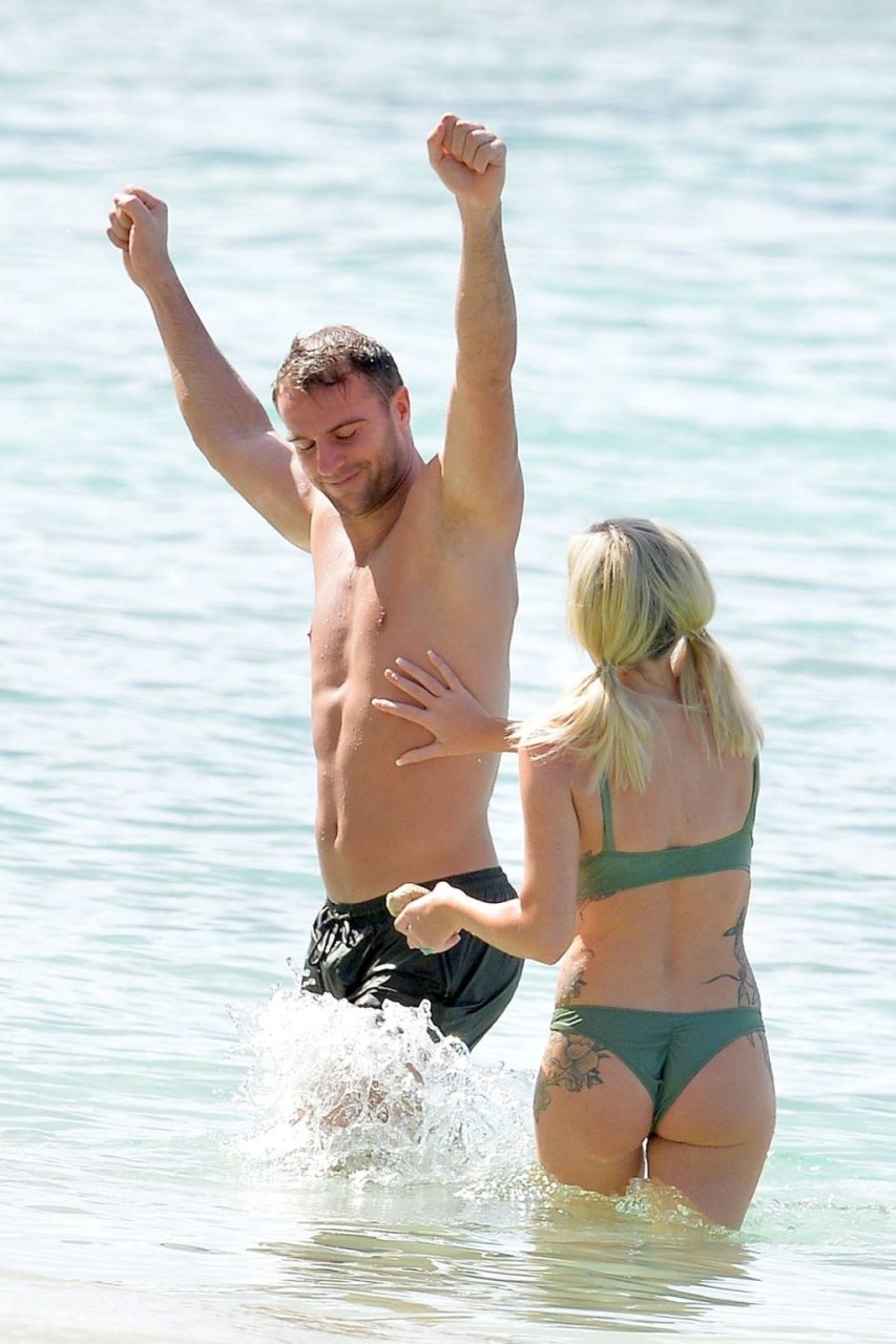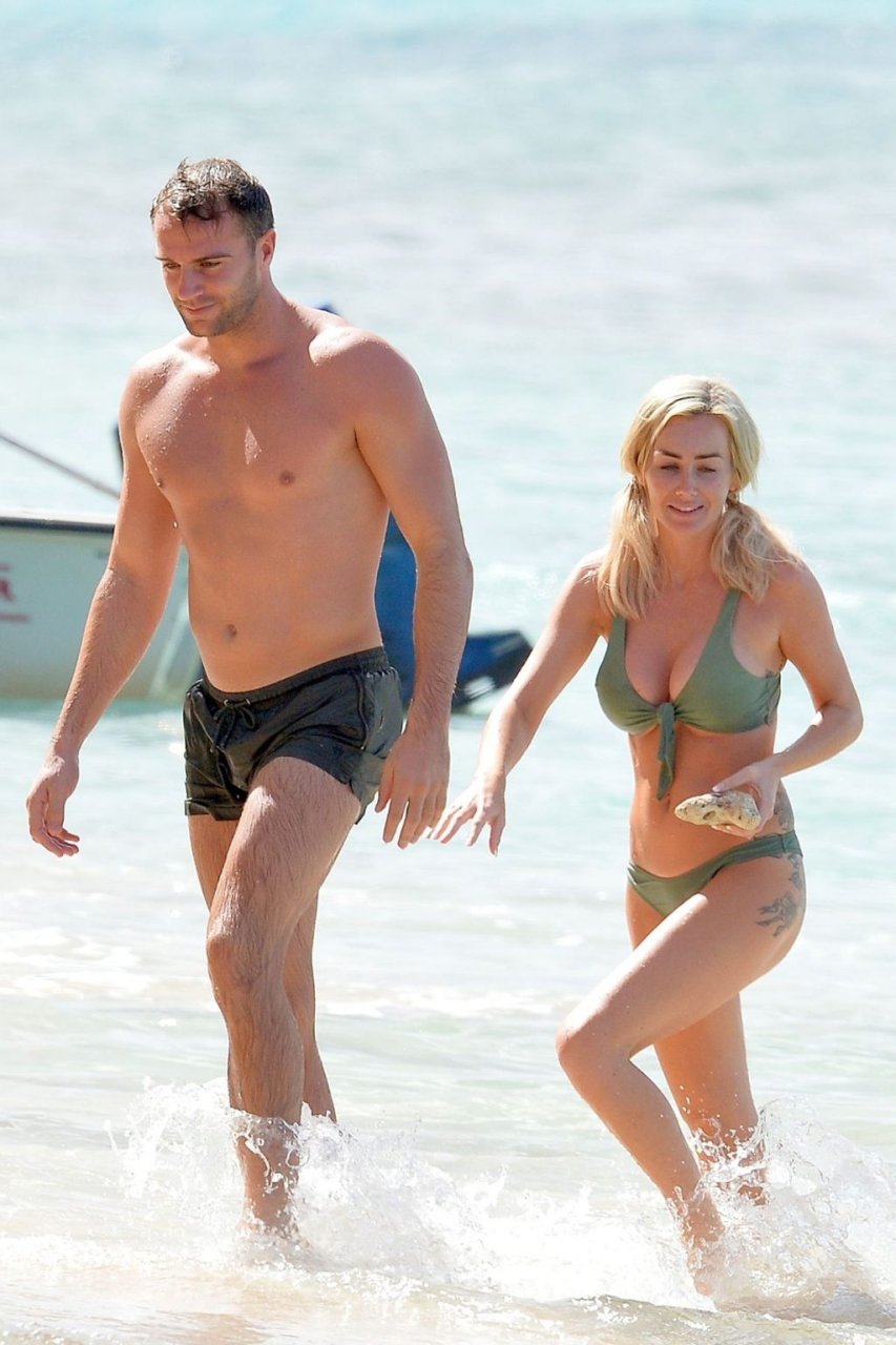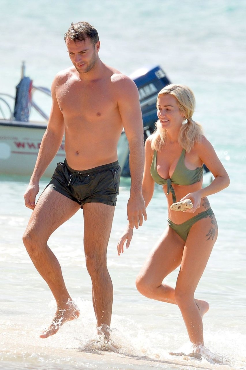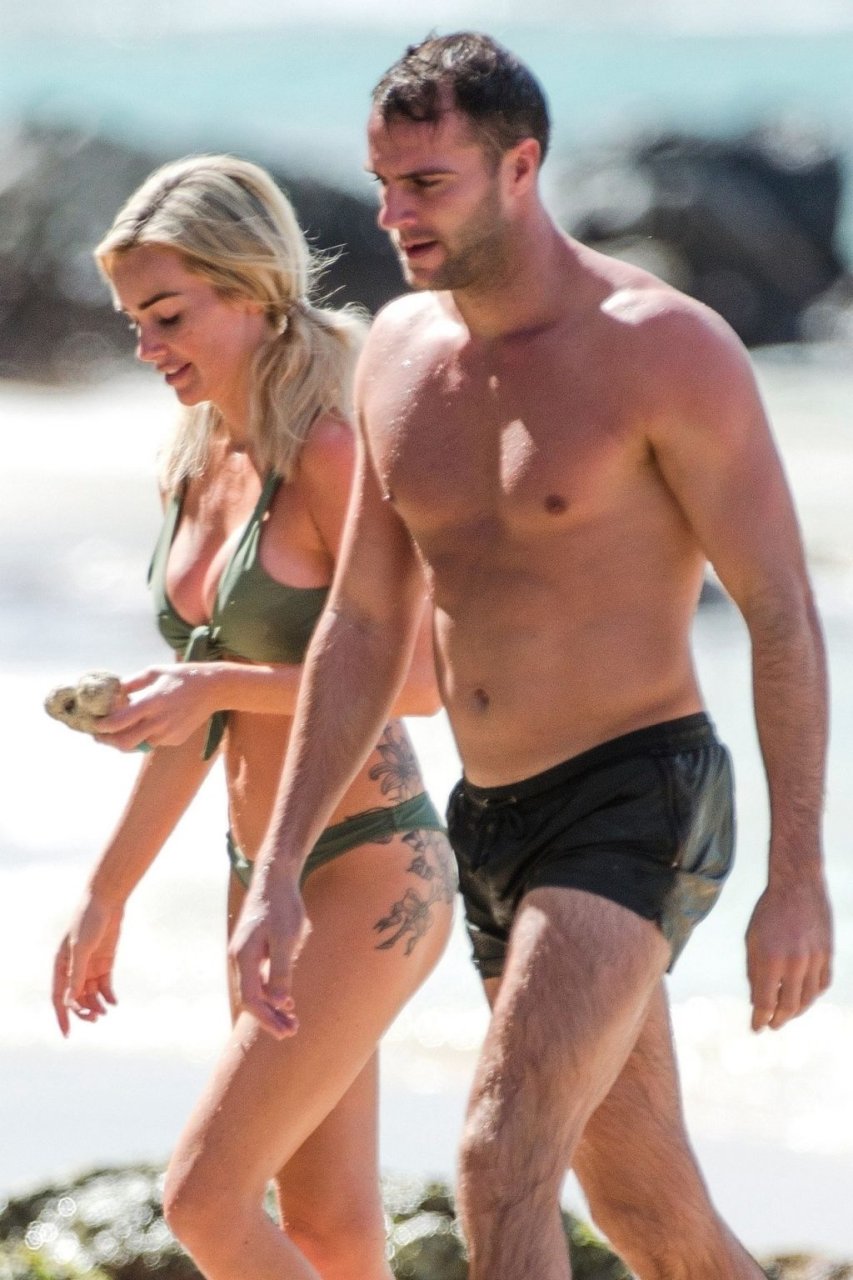 Le couple Laura Anderson et Max Morley est photographié à la Barbade, le 12/10/2018. La blonde de 29 ans a exhibé son corps sexy tatoué en bikini sur la plage.