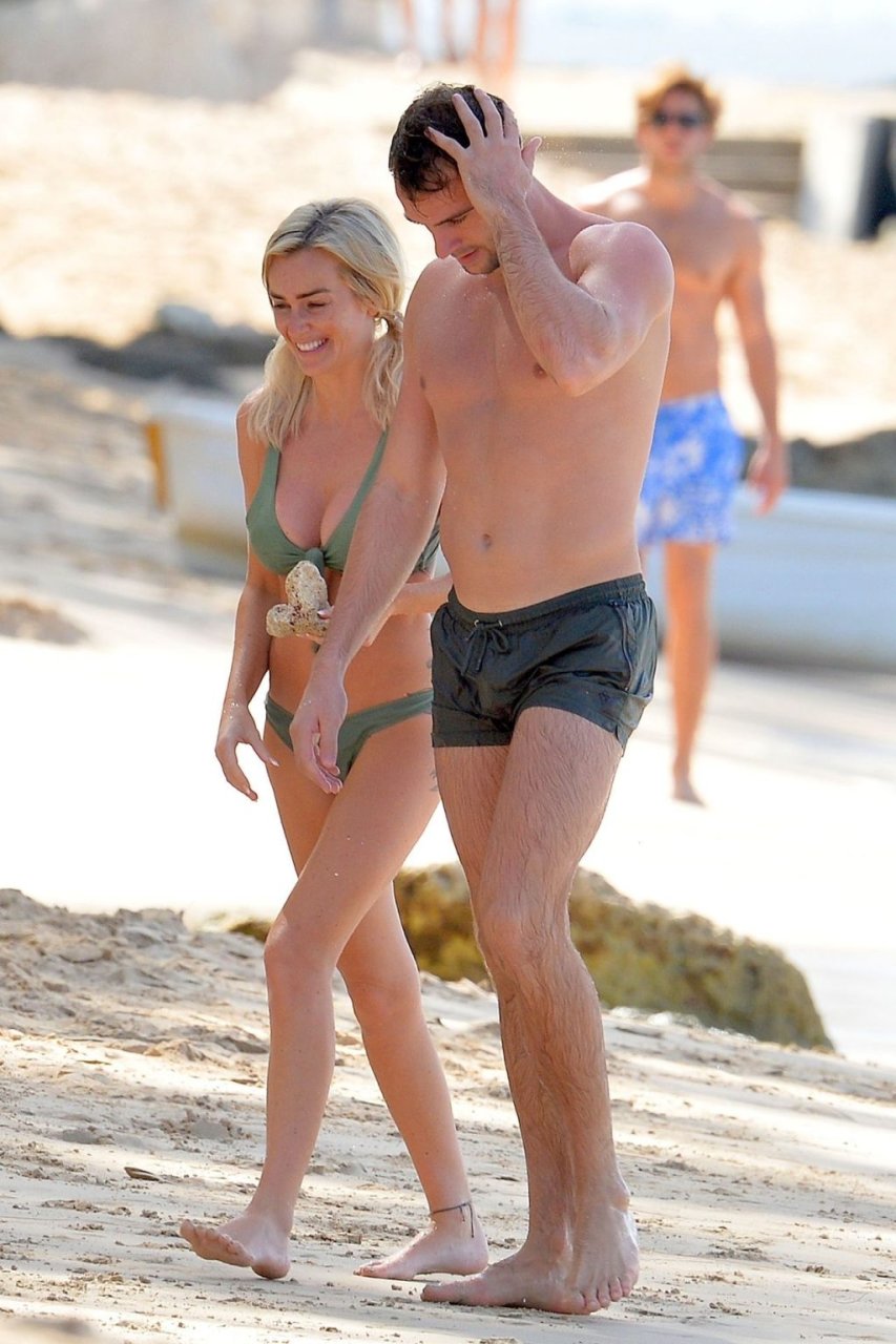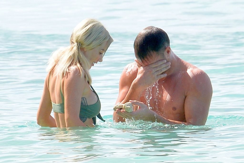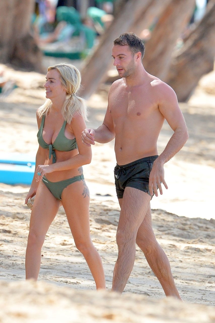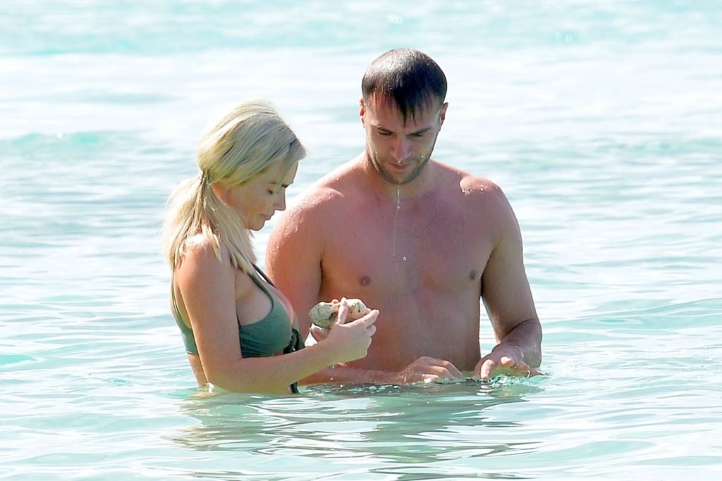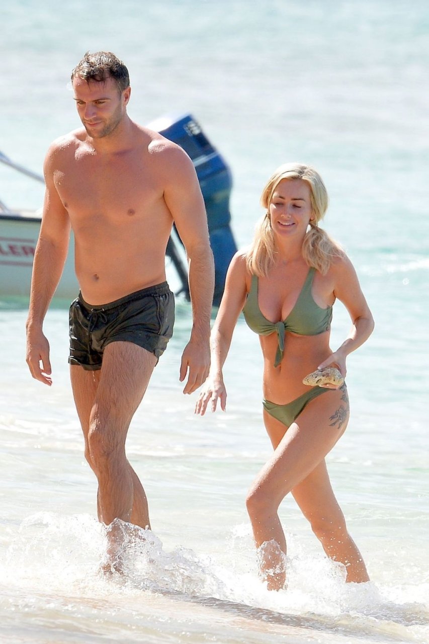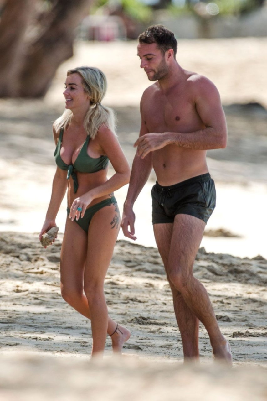 Le couple Laura Anderson et Max Morley est photographié à la Barbade, le 12/10/2018. La blonde de 29 ans a exhibé son corps sexy tatoué en bikini sur la plage.