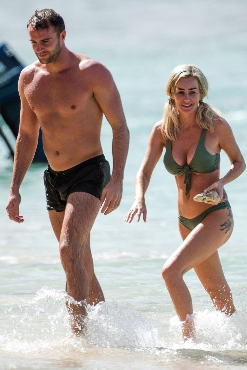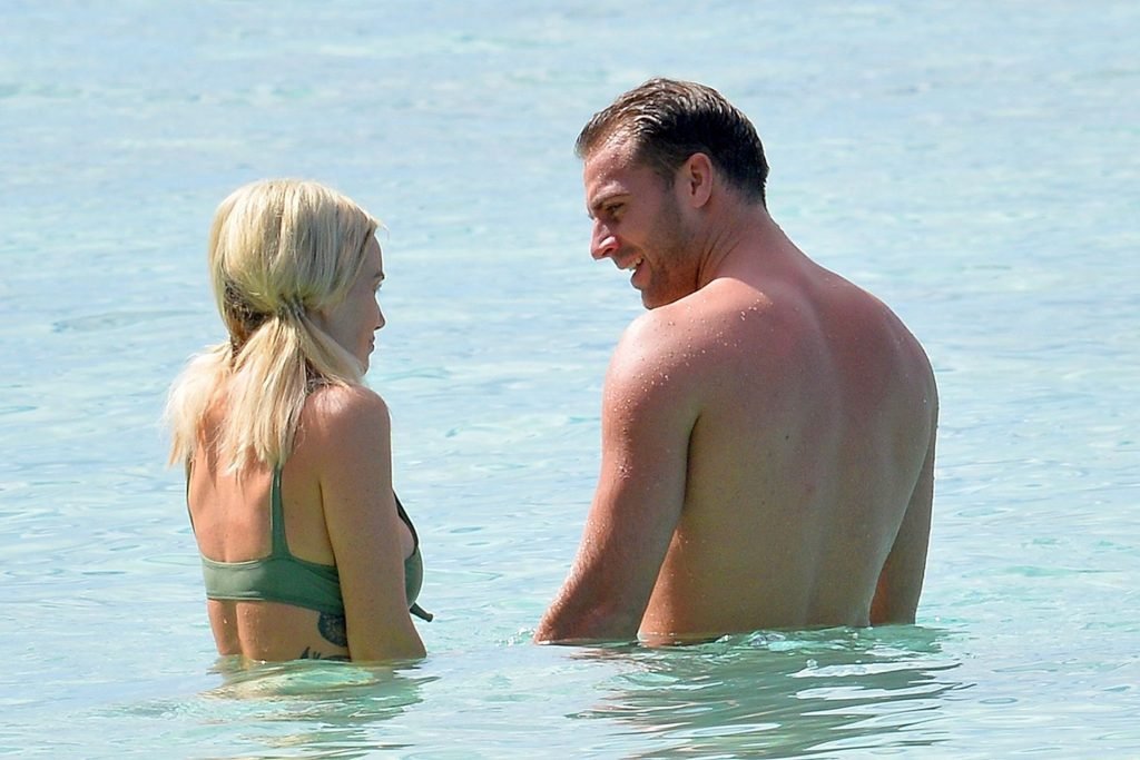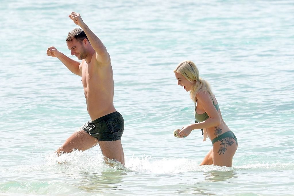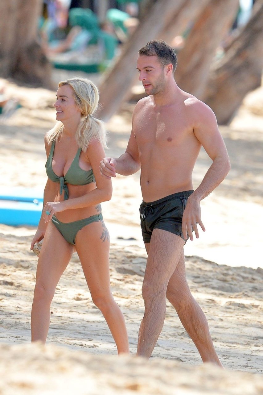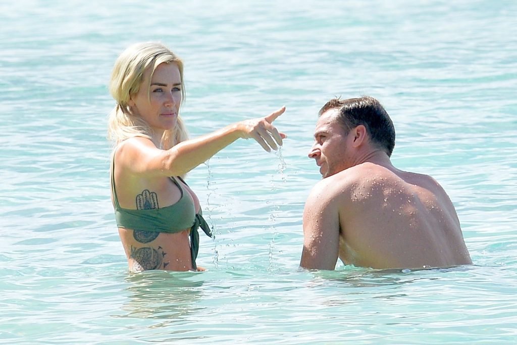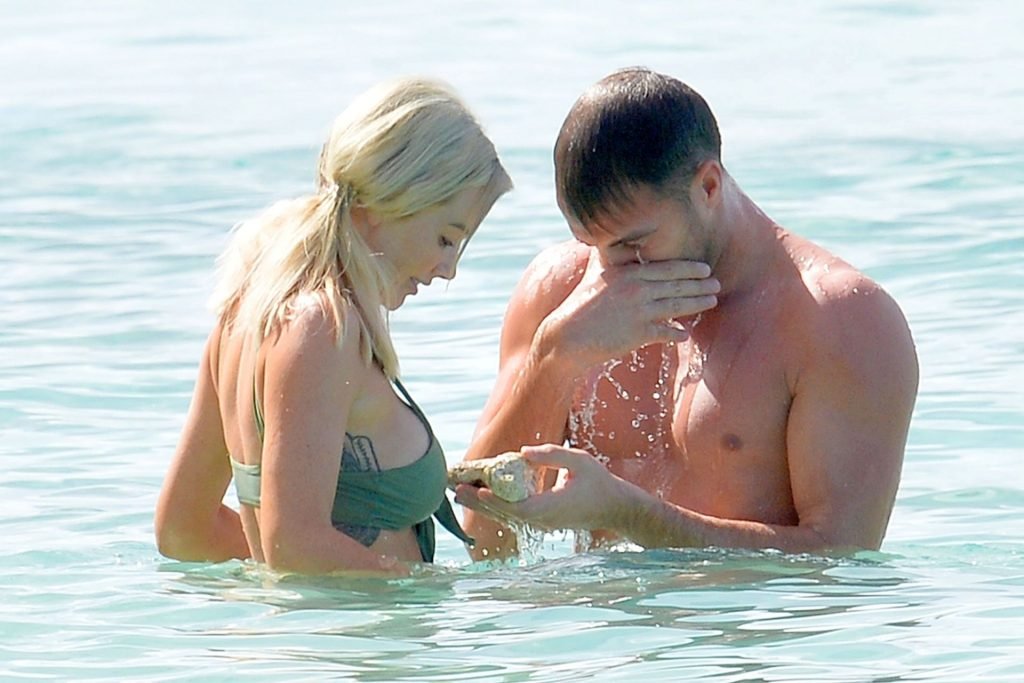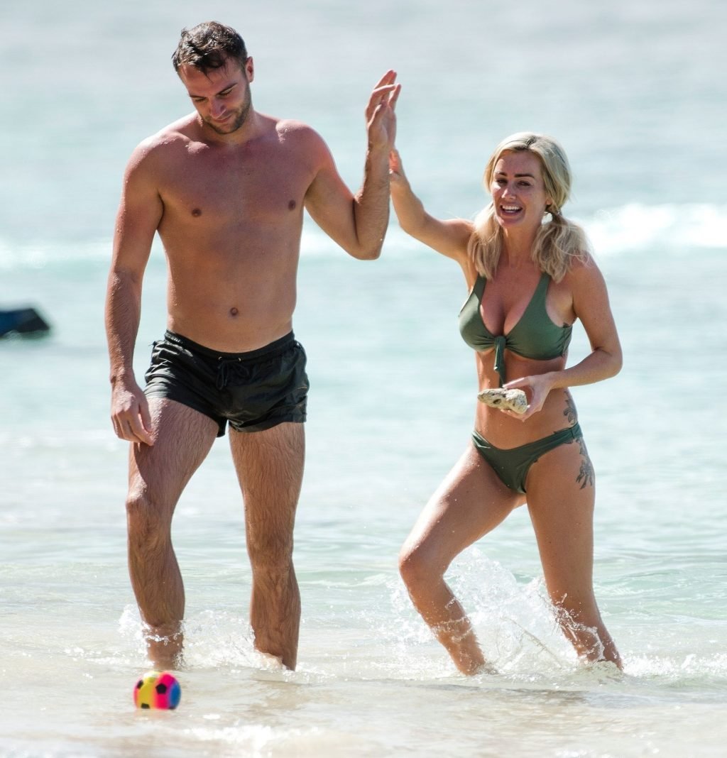 Le couple Laura Anderson et Max Morley est photographié à la Barbade, le 12/10/2018. La blonde de 29 ans a exhibé son corps sexy tatoué en bikini sur la plage.
