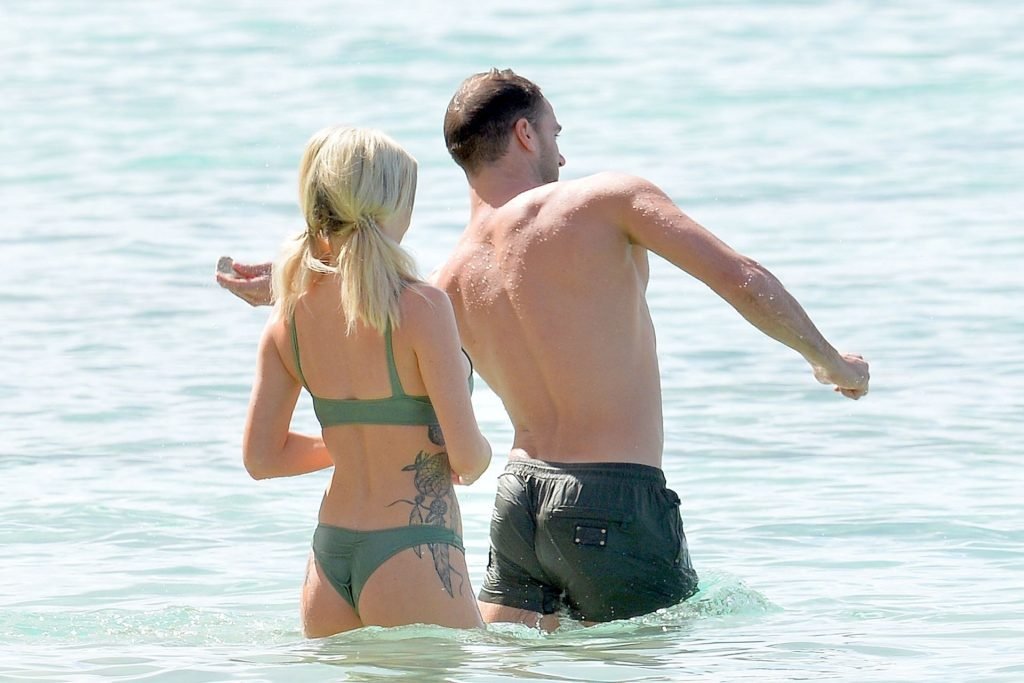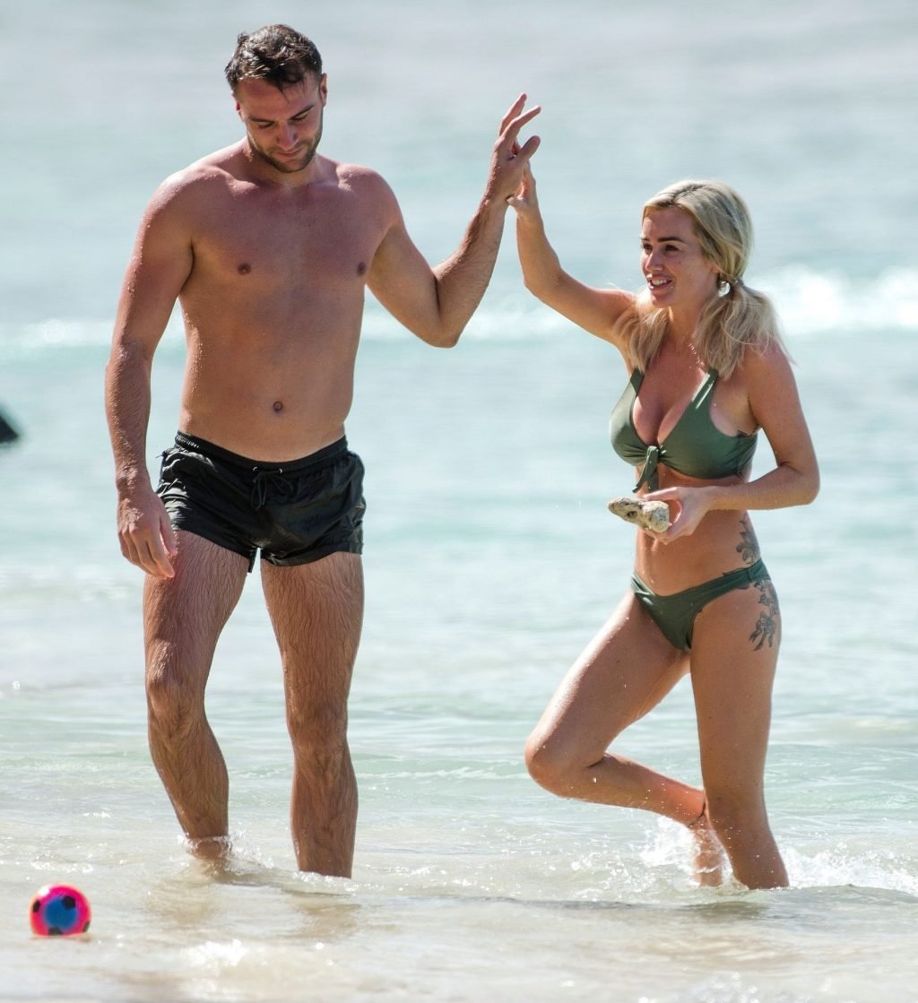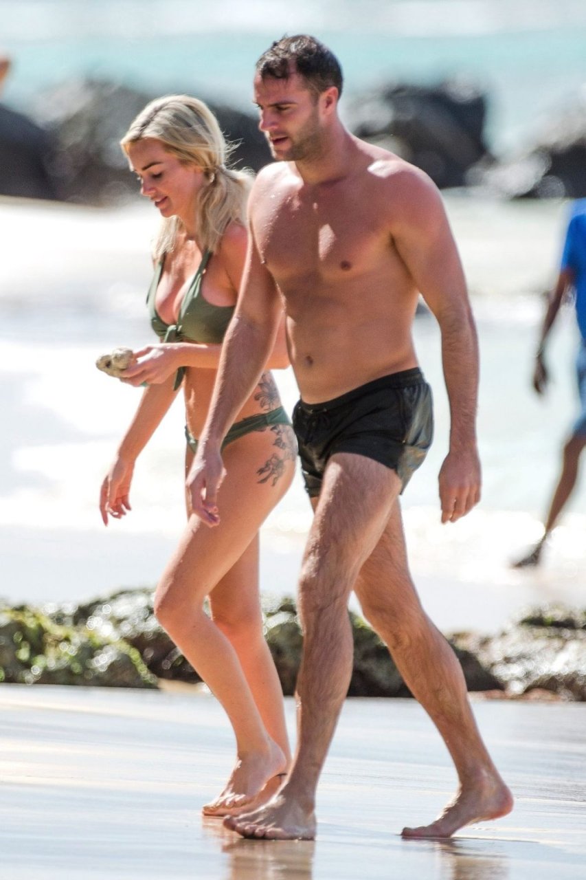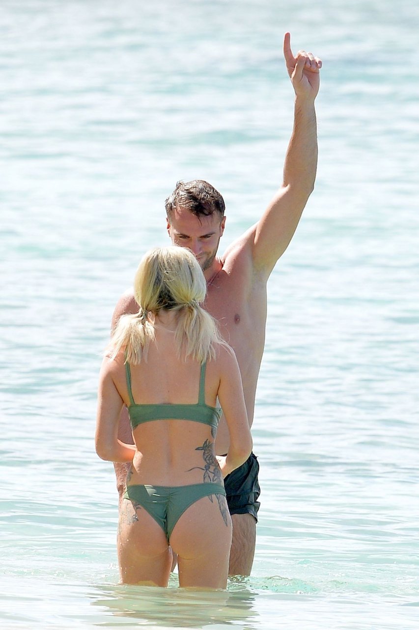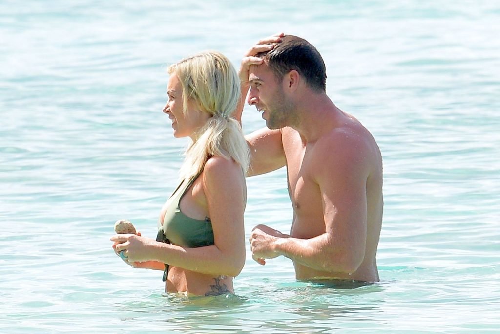 Le couple Laura Anderson et Max Morley est photographié à la Barbade, le 12/10/2018. La blonde de 29 ans a exhibé son corps sexy tatoué en bikini sur la plage.