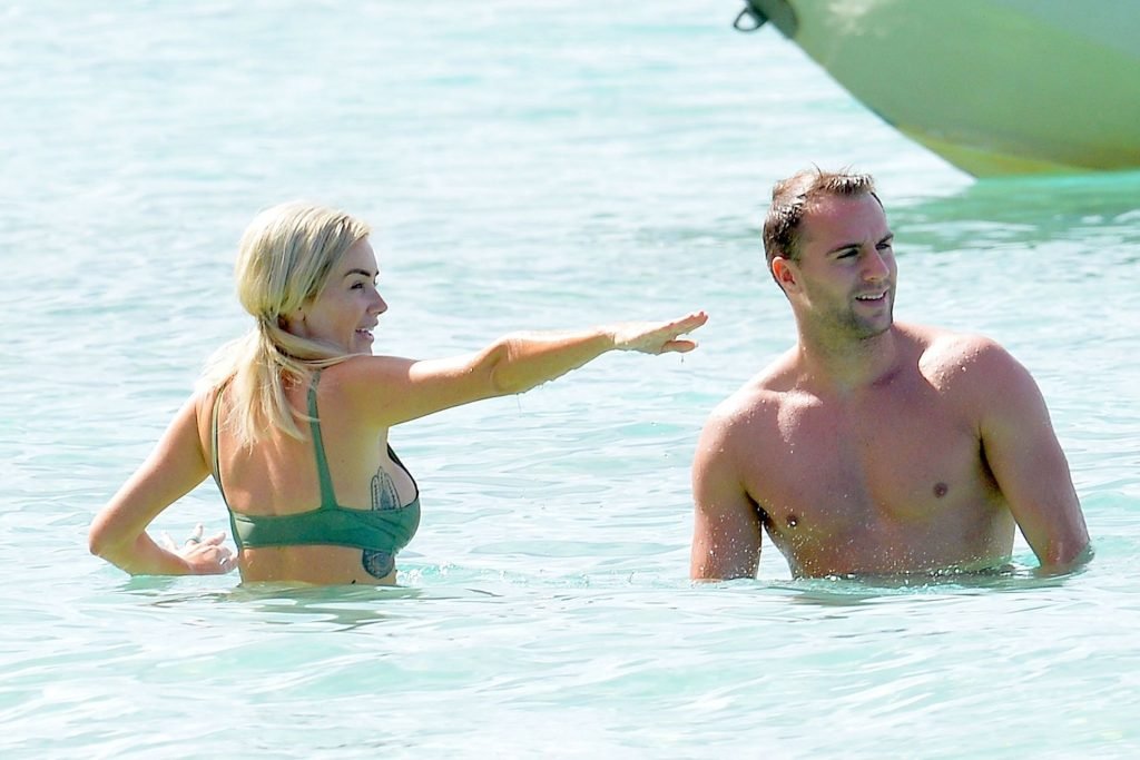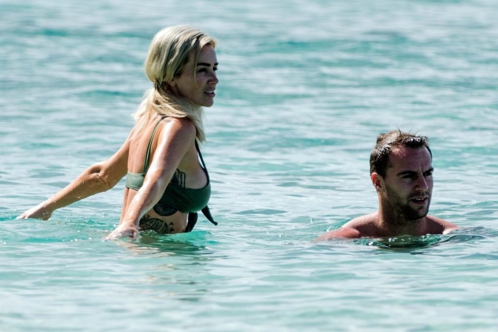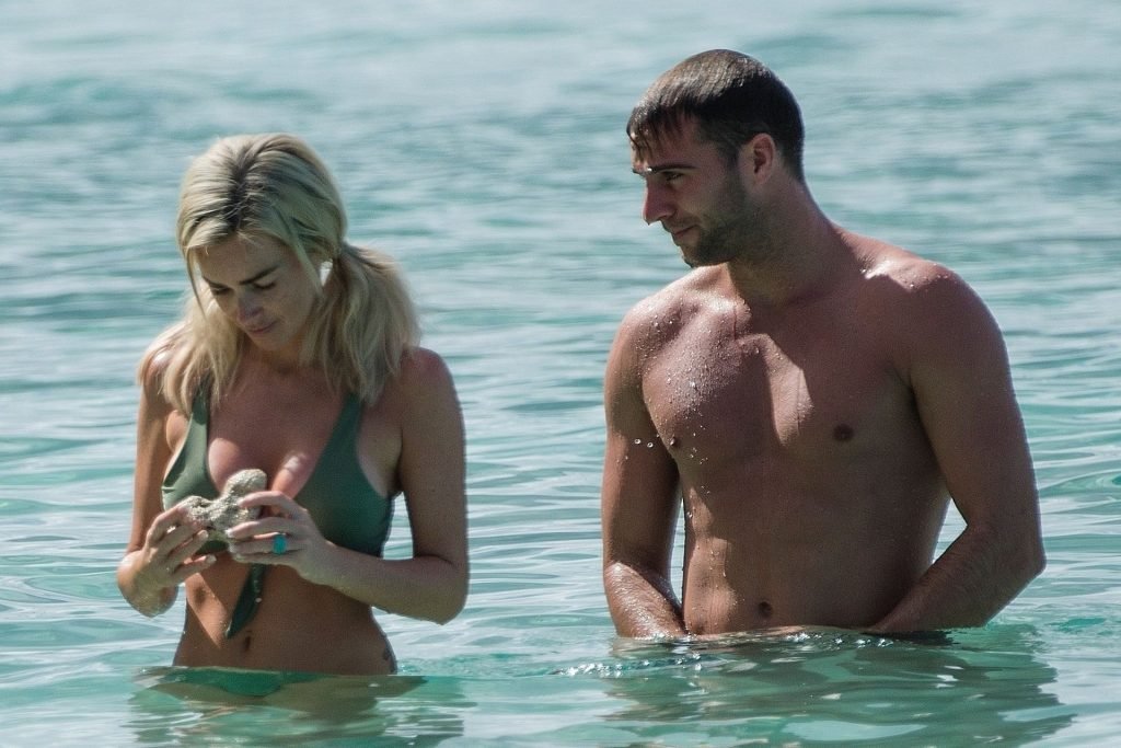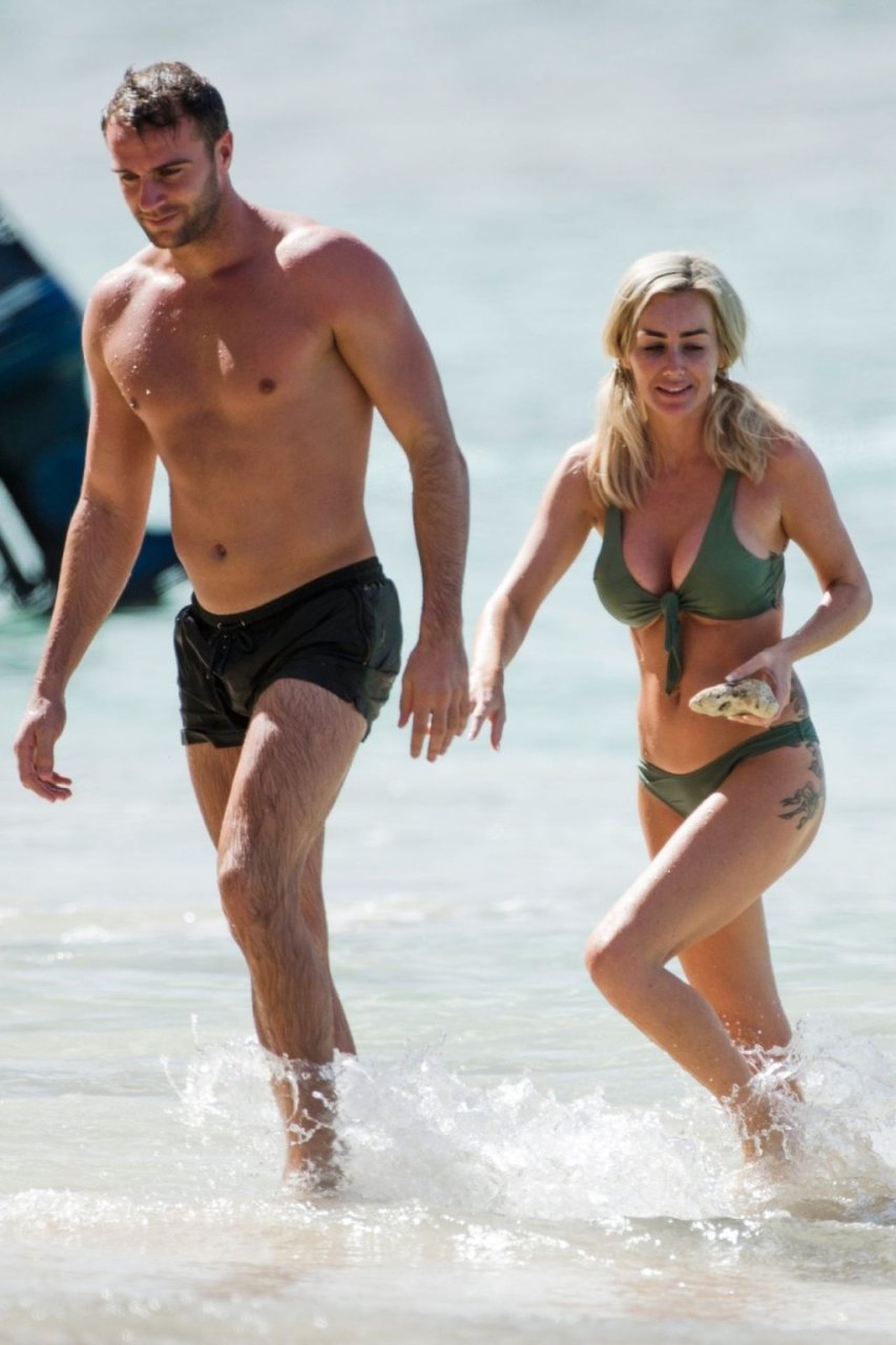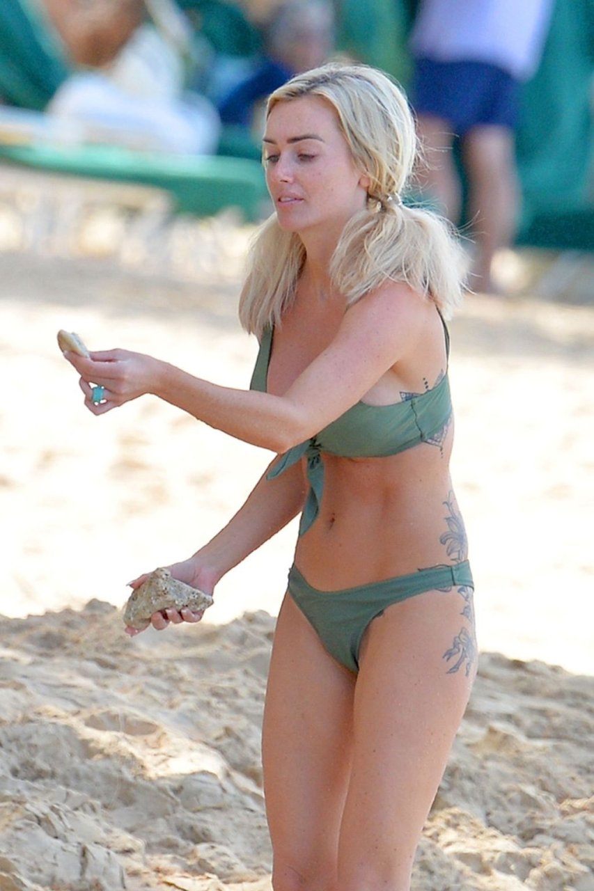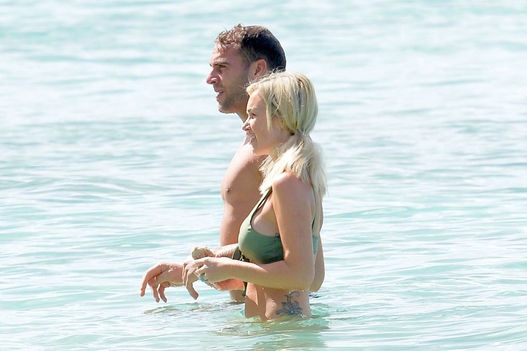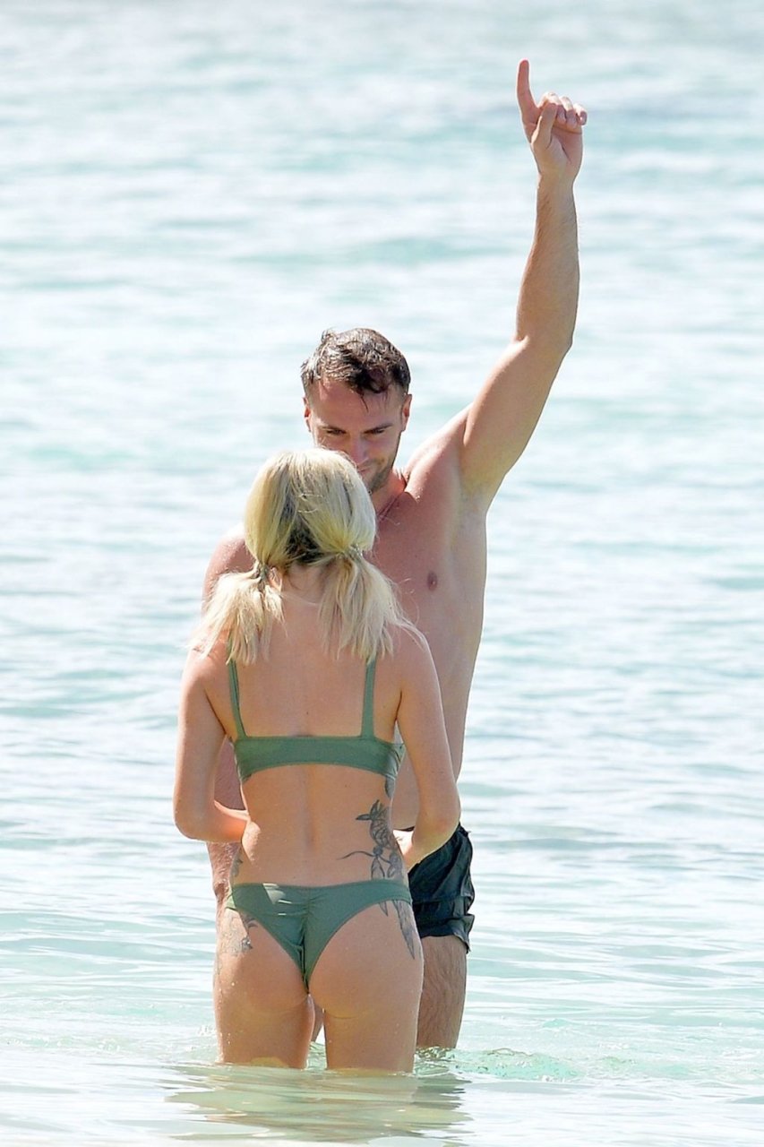 Le couple Laura Anderson et Max Morley est photographié à la Barbade, le 12/10/2018. La blonde de 29 ans a exhibé son corps sexy tatoué en bikini sur la plage.