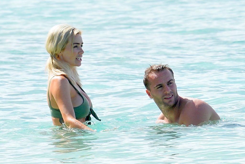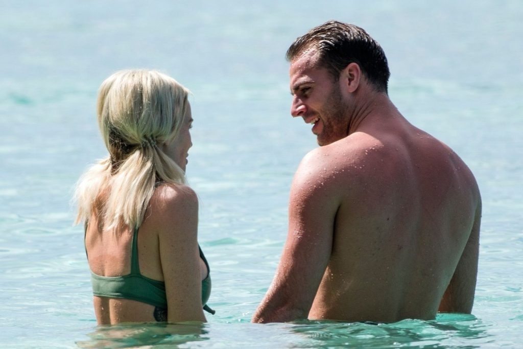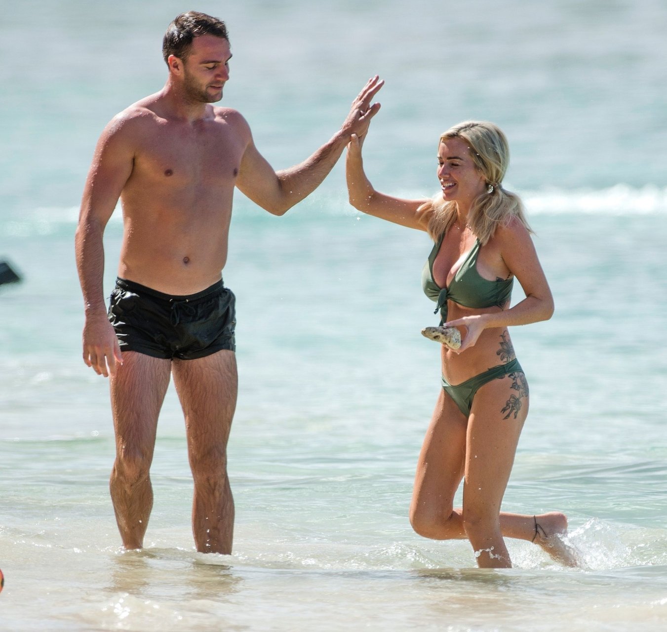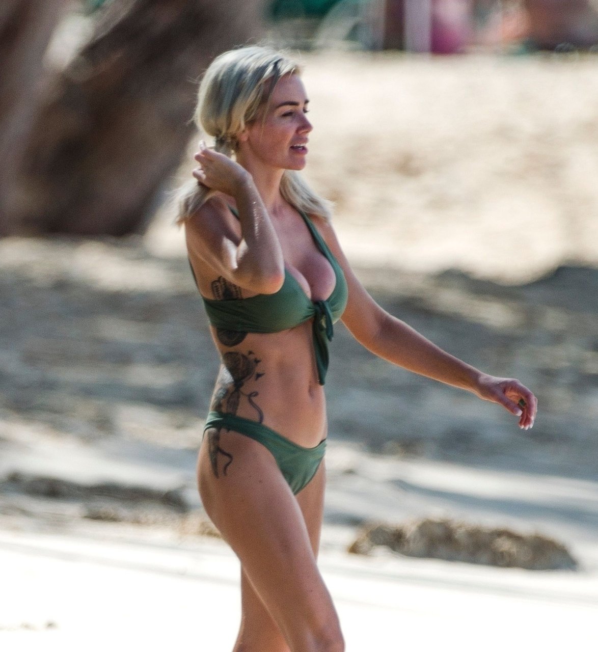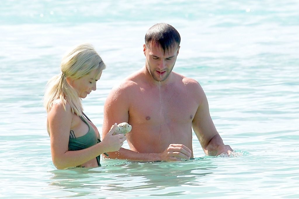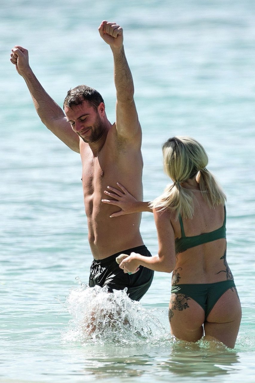 Le couple Laura Anderson et Max Morley est photographié à la Barbade, le 12/10/2018. La blonde de 29 ans a exhibé son corps sexy tatoué en bikini sur la plage.