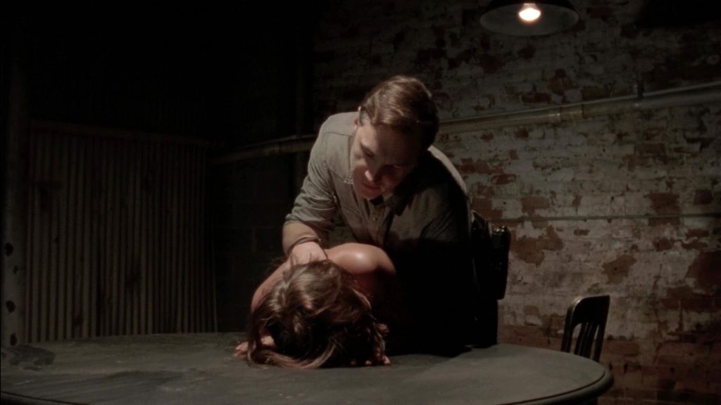 Here Lauren Cohan is standing in a room with the man. She is showing cleavage in a black bra, as the guy is sitting at a table. He tells Cohan to take it off, as the result she goes topless and covers boobs with hands. Lauren then gets angry, until finally, we see the man stands up and walks over to her. One more hot scene in a row of forced sex!