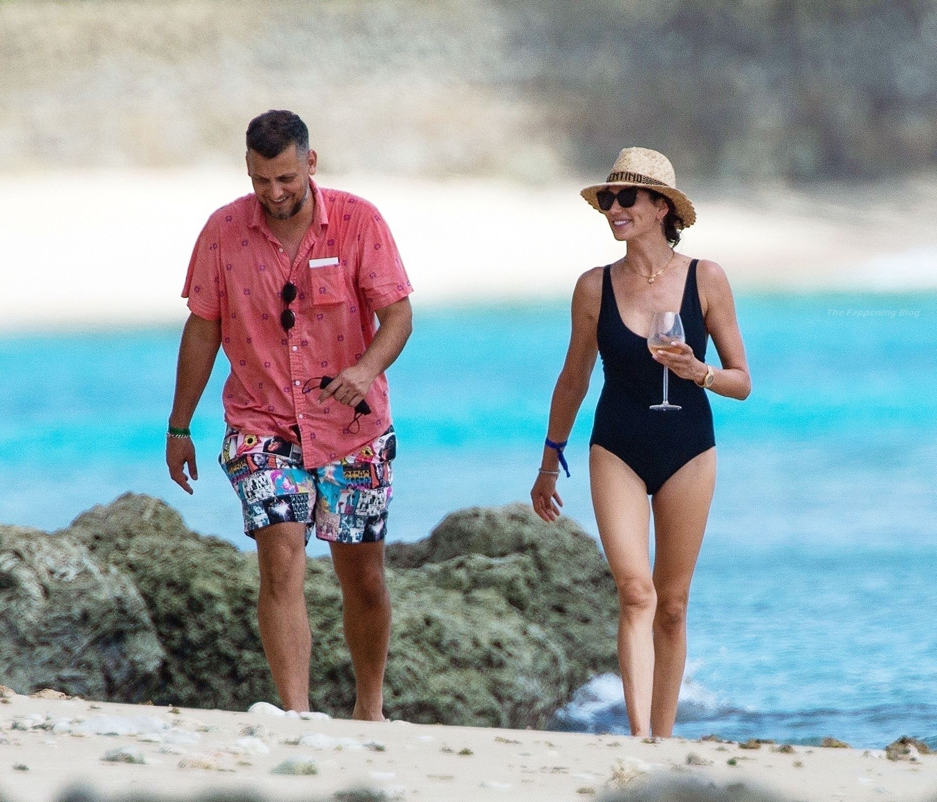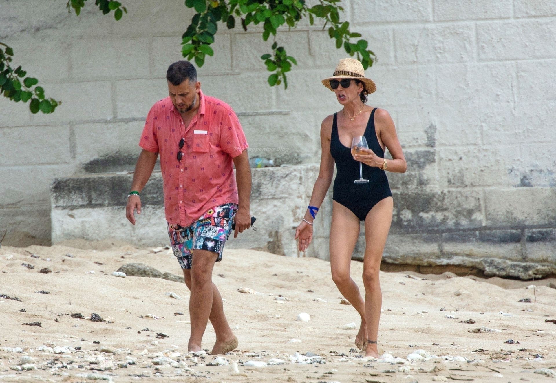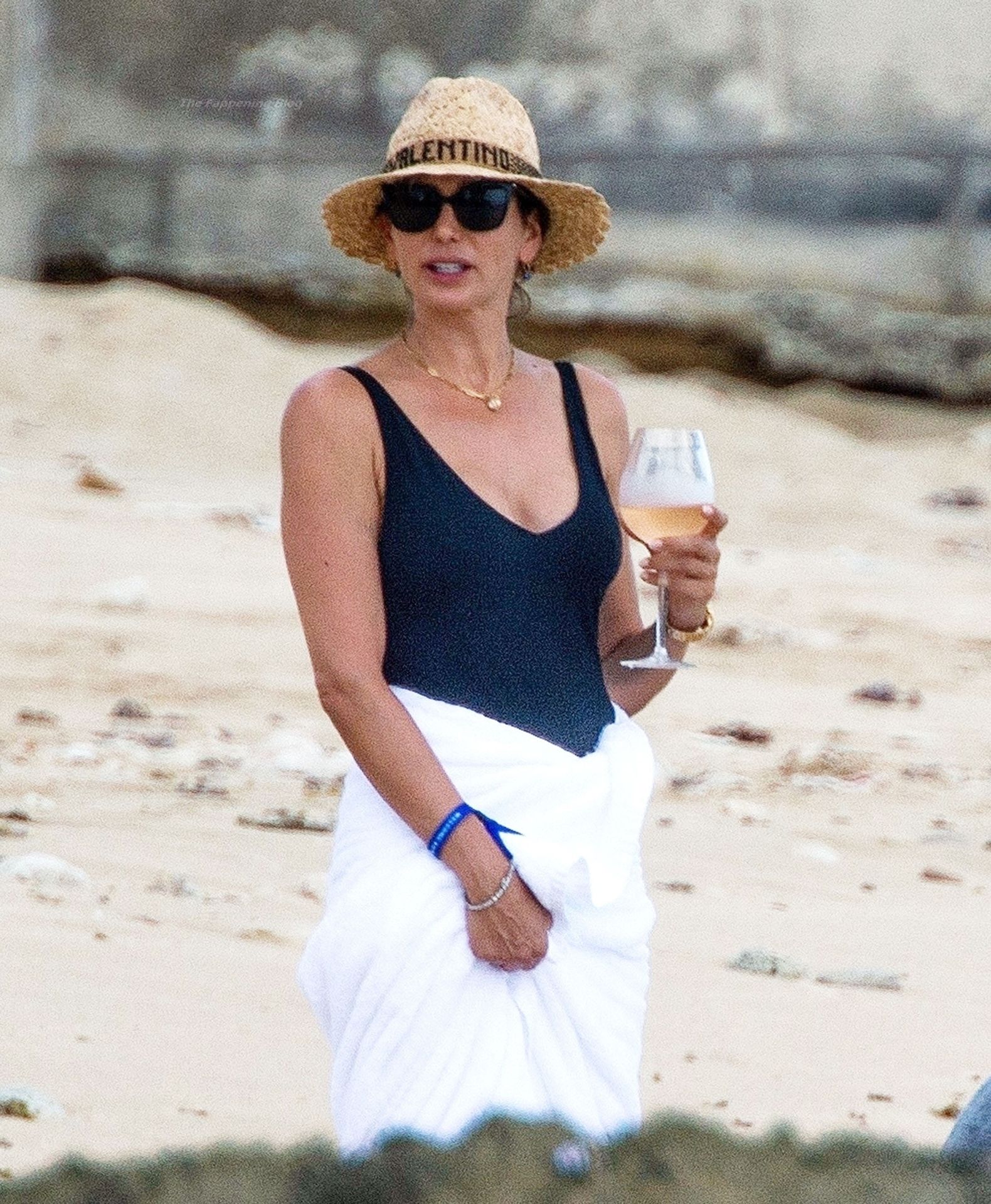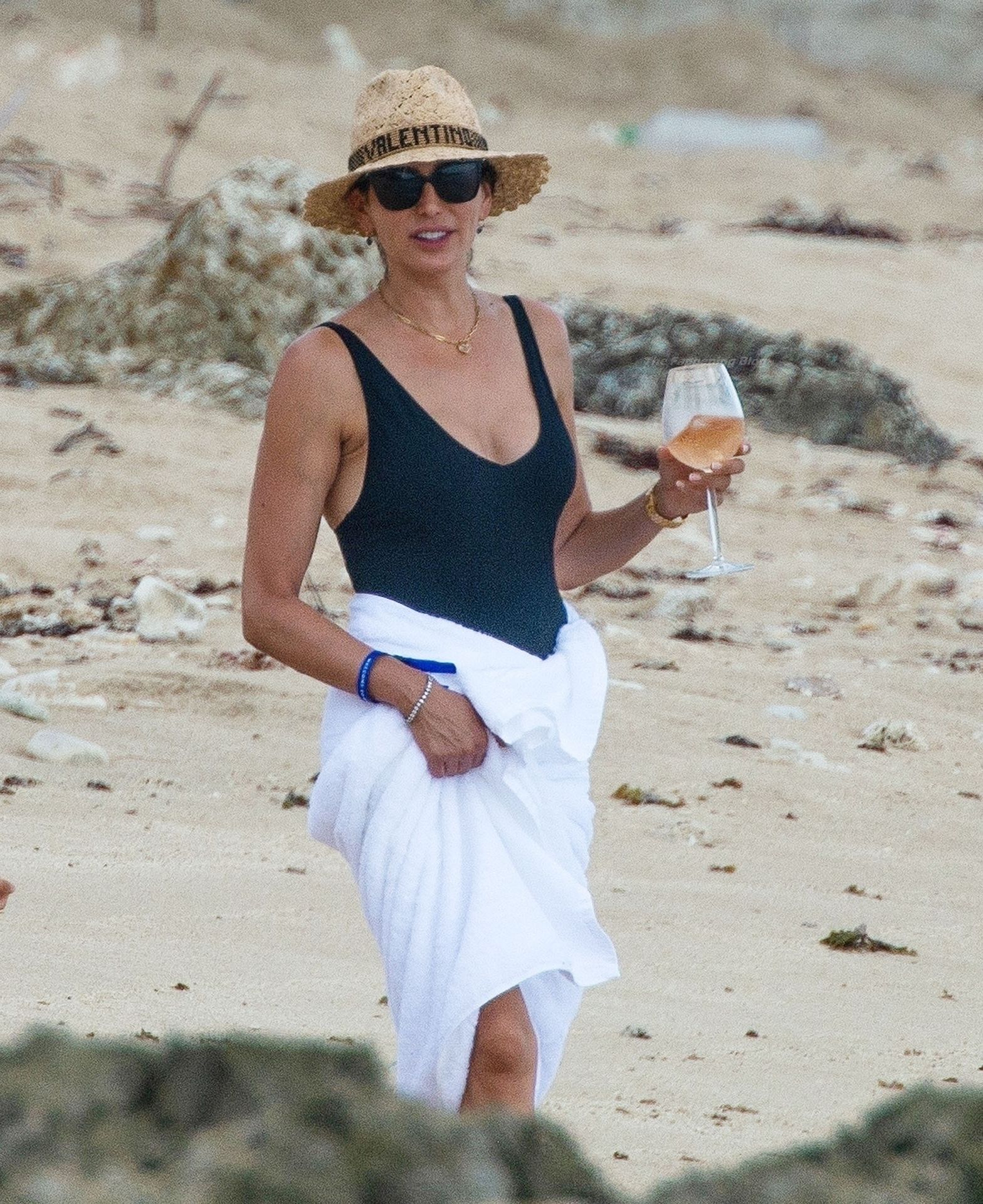 Avec un verre à la main, portant son chapeau de paille Valentino et des lunettes de soleil foncées, Lauren dégageait un sex-appeal évident lors de sa promenade sur la plage, accompagnée d’un bain de mer, vêtue de son séduisant maillot de bain noir, mettant en valeur son physique tonique et une possible perte de poids.