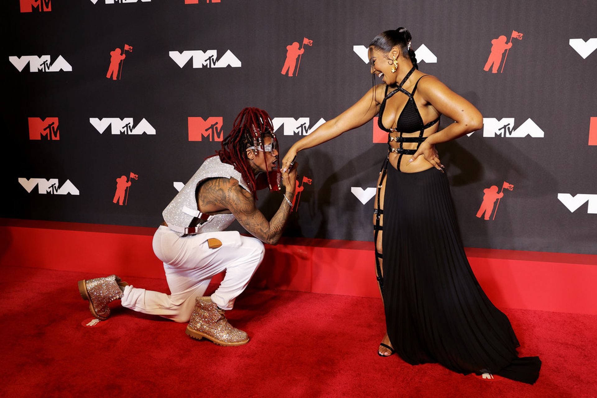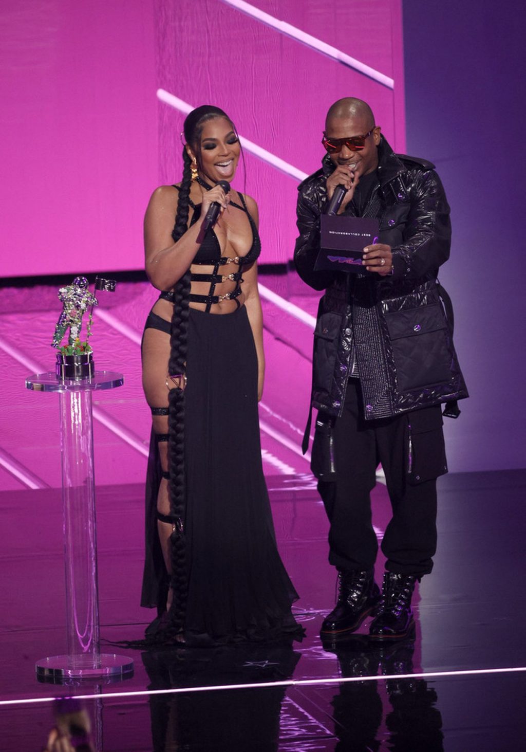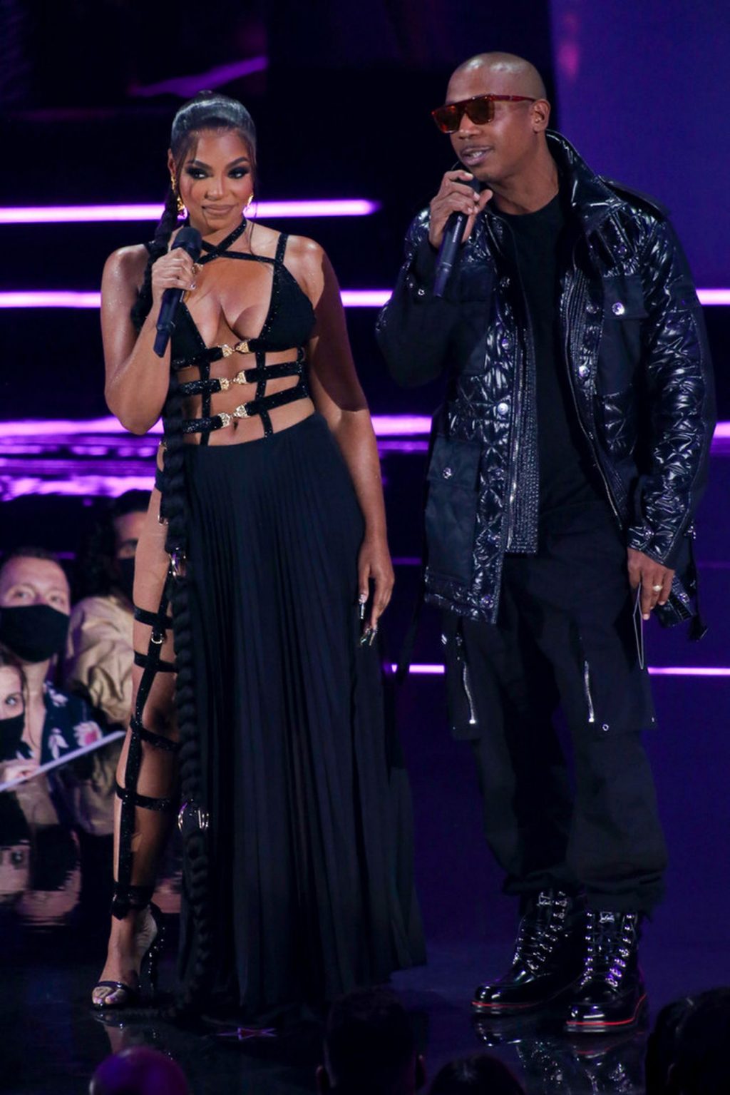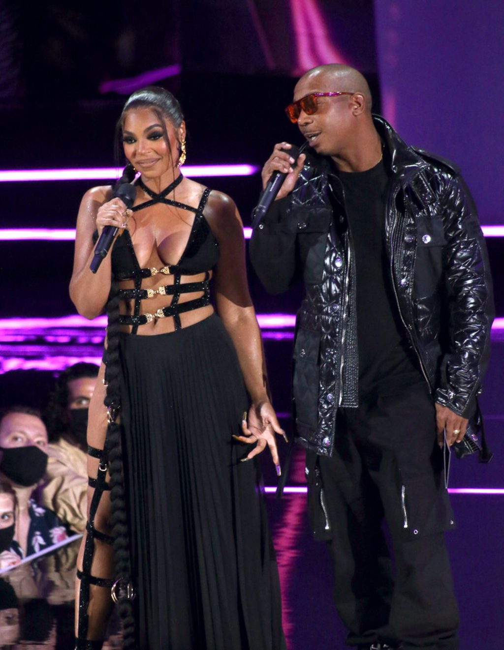 La chanteuse Ashanti montre ses jambes aux MTV VMAs 2021 au Barclays Center de Brooklyn à New York, le 12/09/2021.