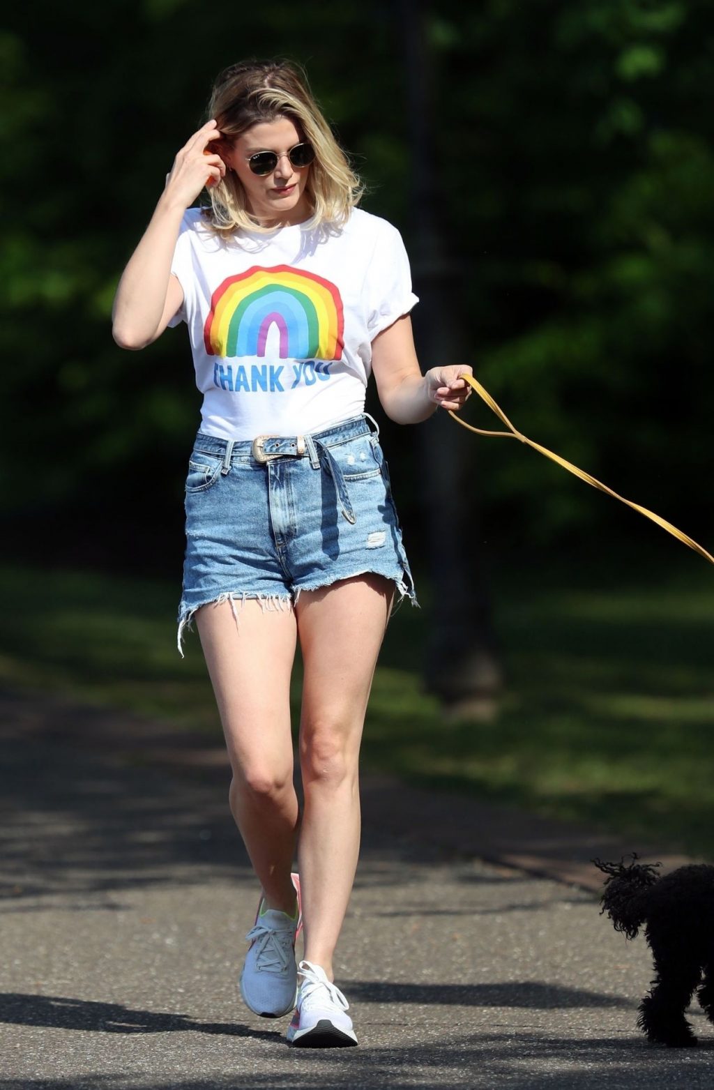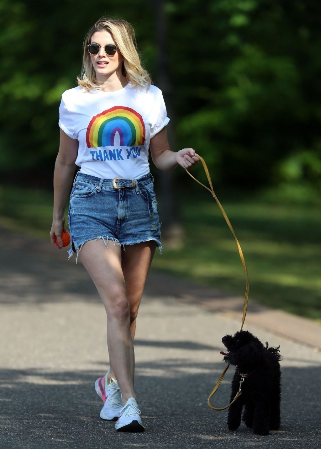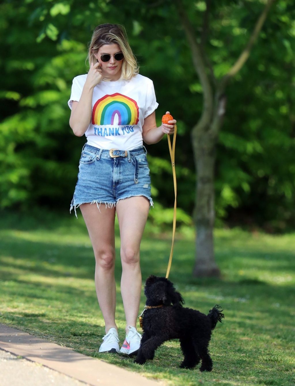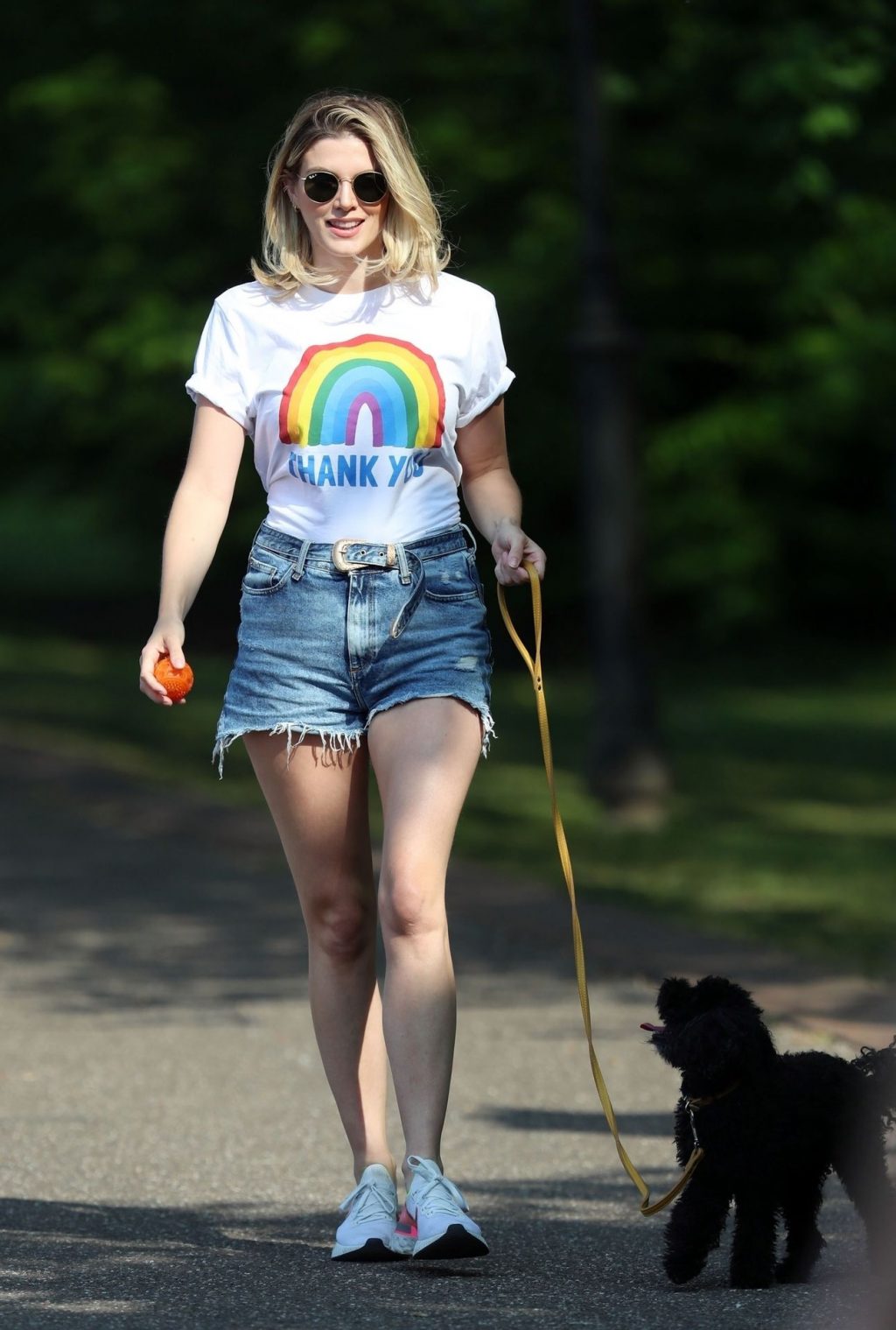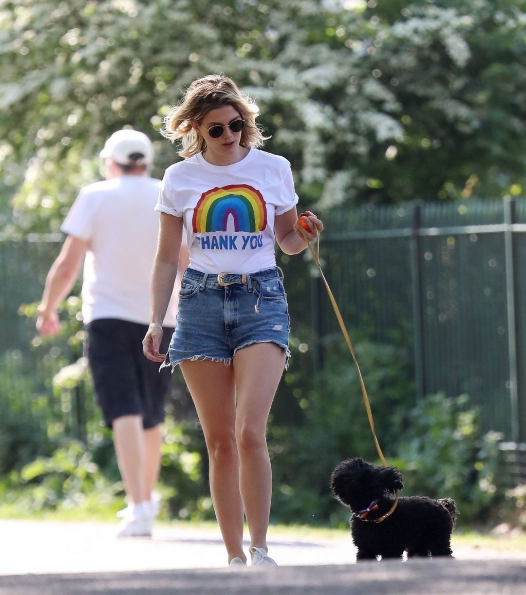 La présentatrice TV et DJ Ashley James a été photographiée, superbe dans un short en jean style « Daisy Duke », alors qu’elle soutenait le NHS avec un T-shirt tout en profitant de sa promenade avec son chien dans un parc local à Londres, le 24/04/2020.
