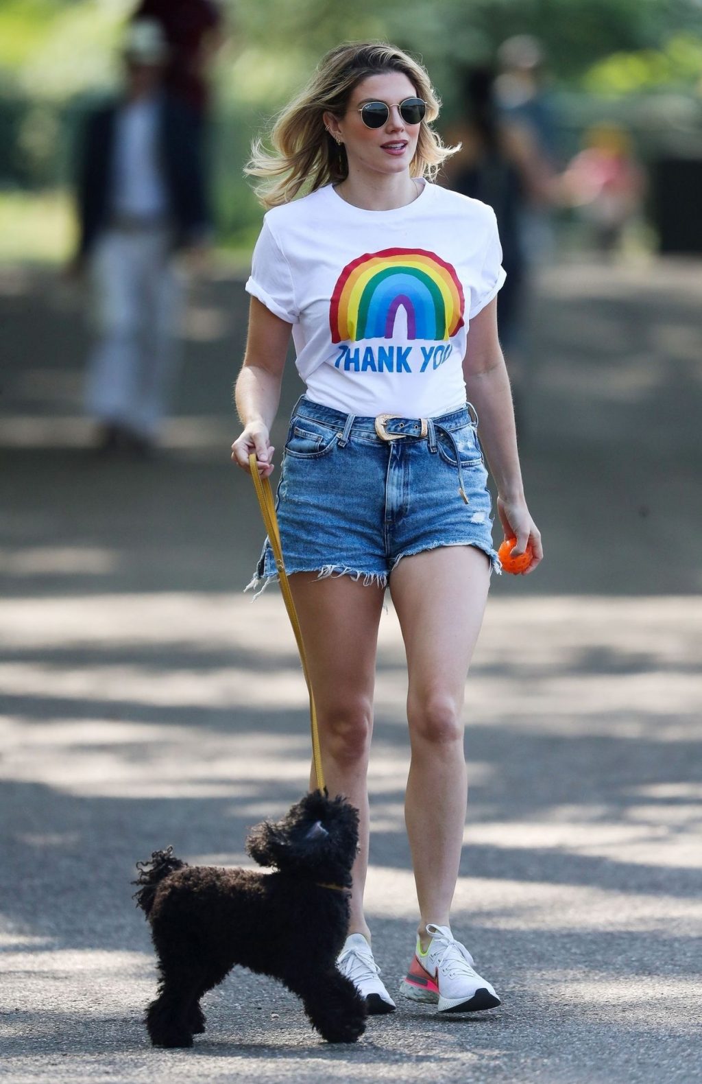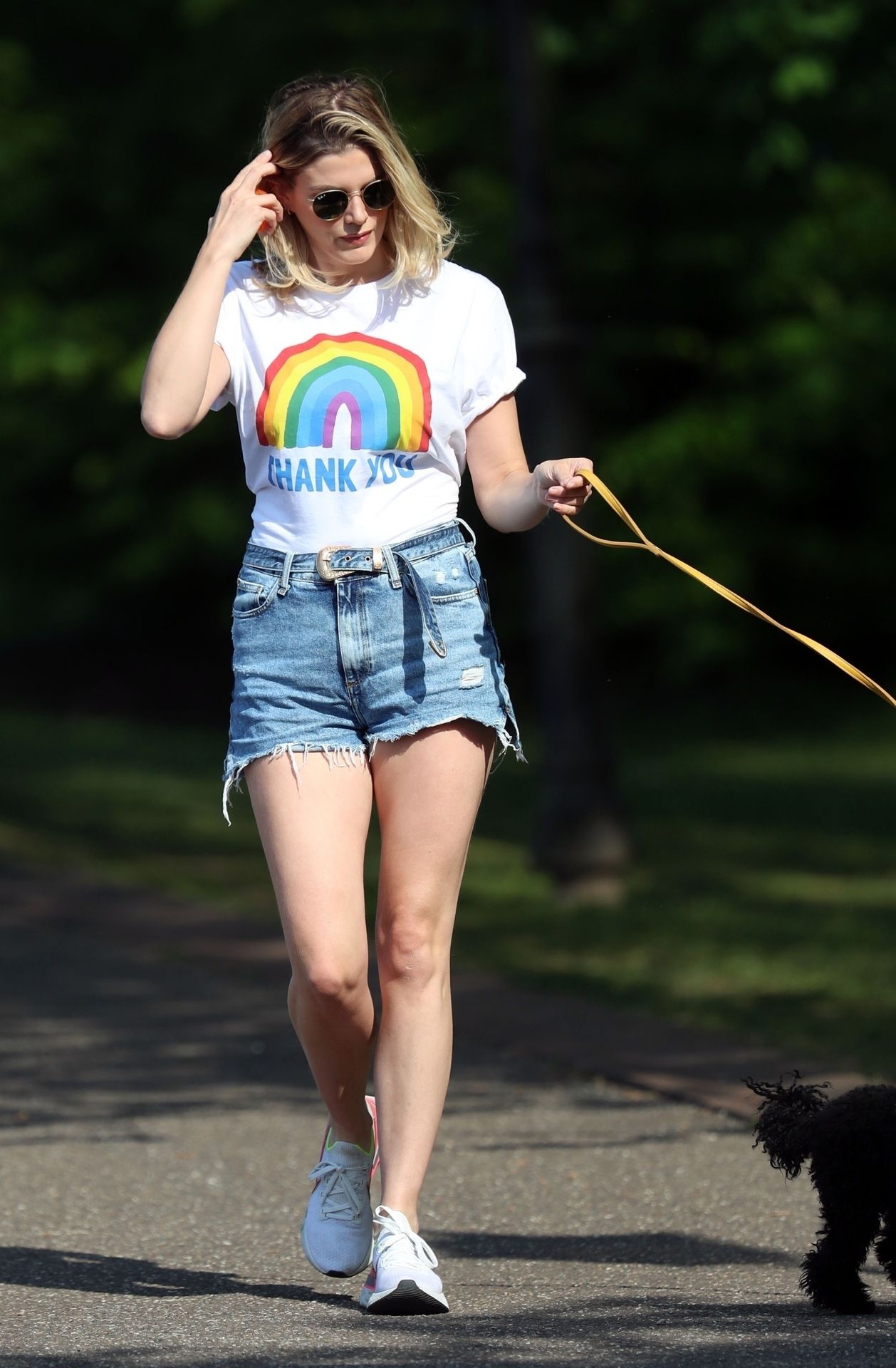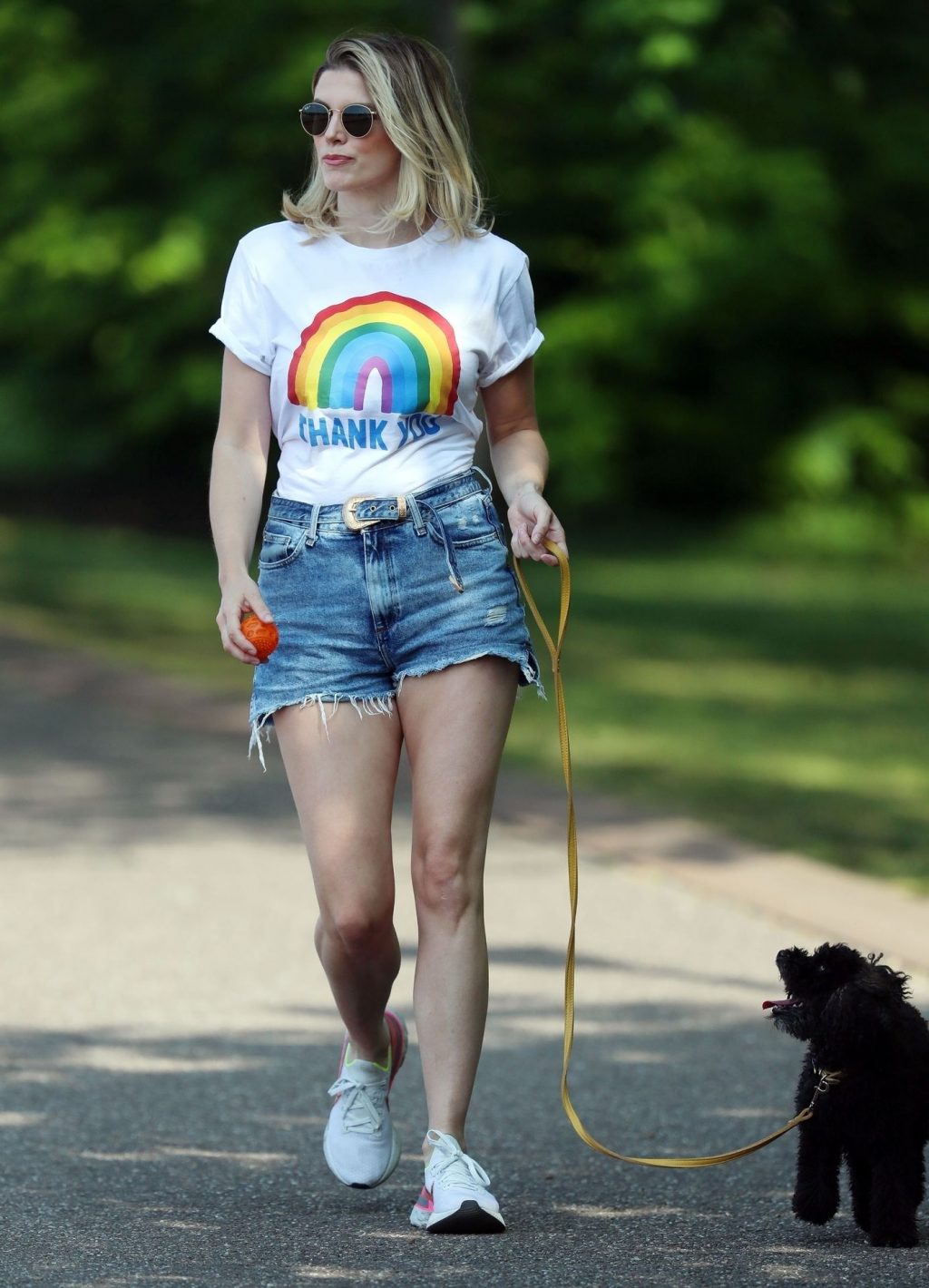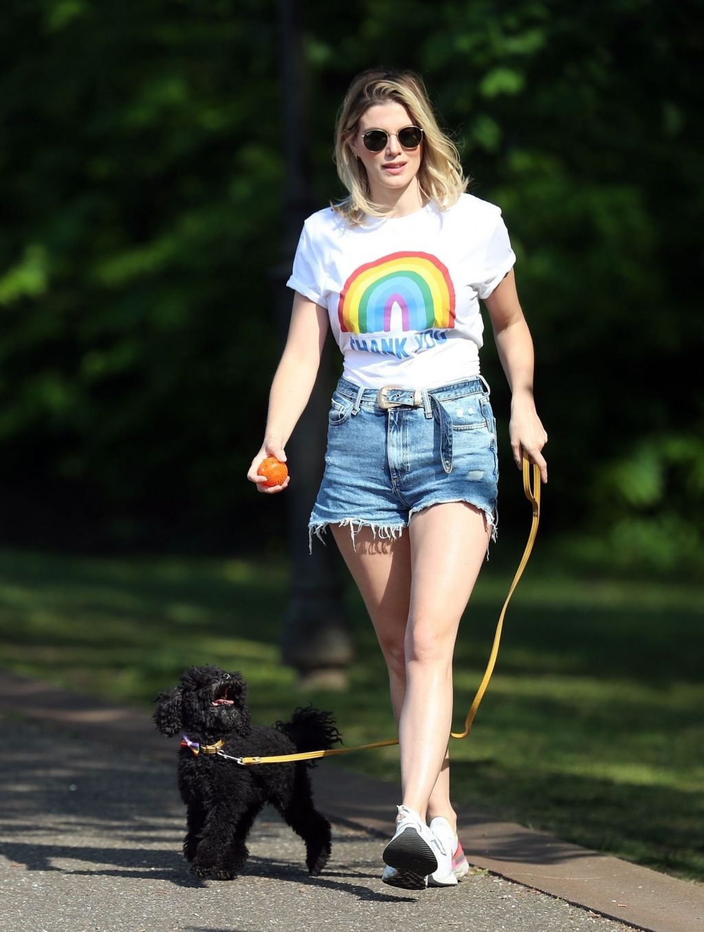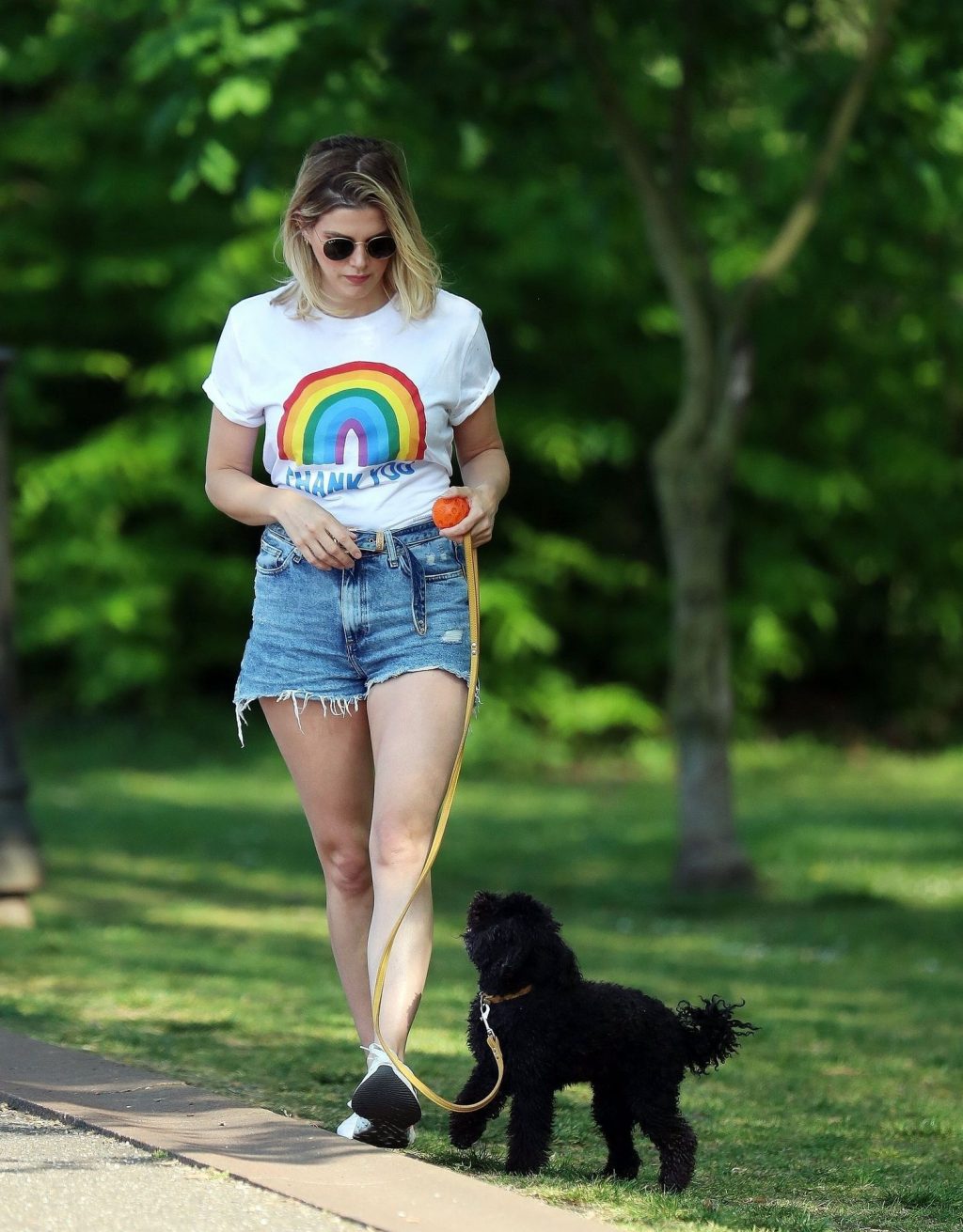 La présentatrice TV et DJ Ashley James a été photographiée, superbe dans un short en jean style « Daisy Duke », alors qu’elle soutenait le NHS avec un T-shirt tout en profitant de sa promenade avec son chien dans un parc local à Londres, le 24/04/2020.