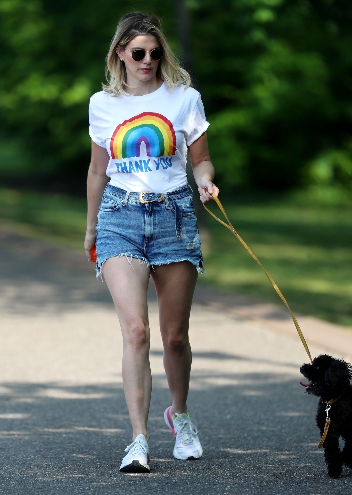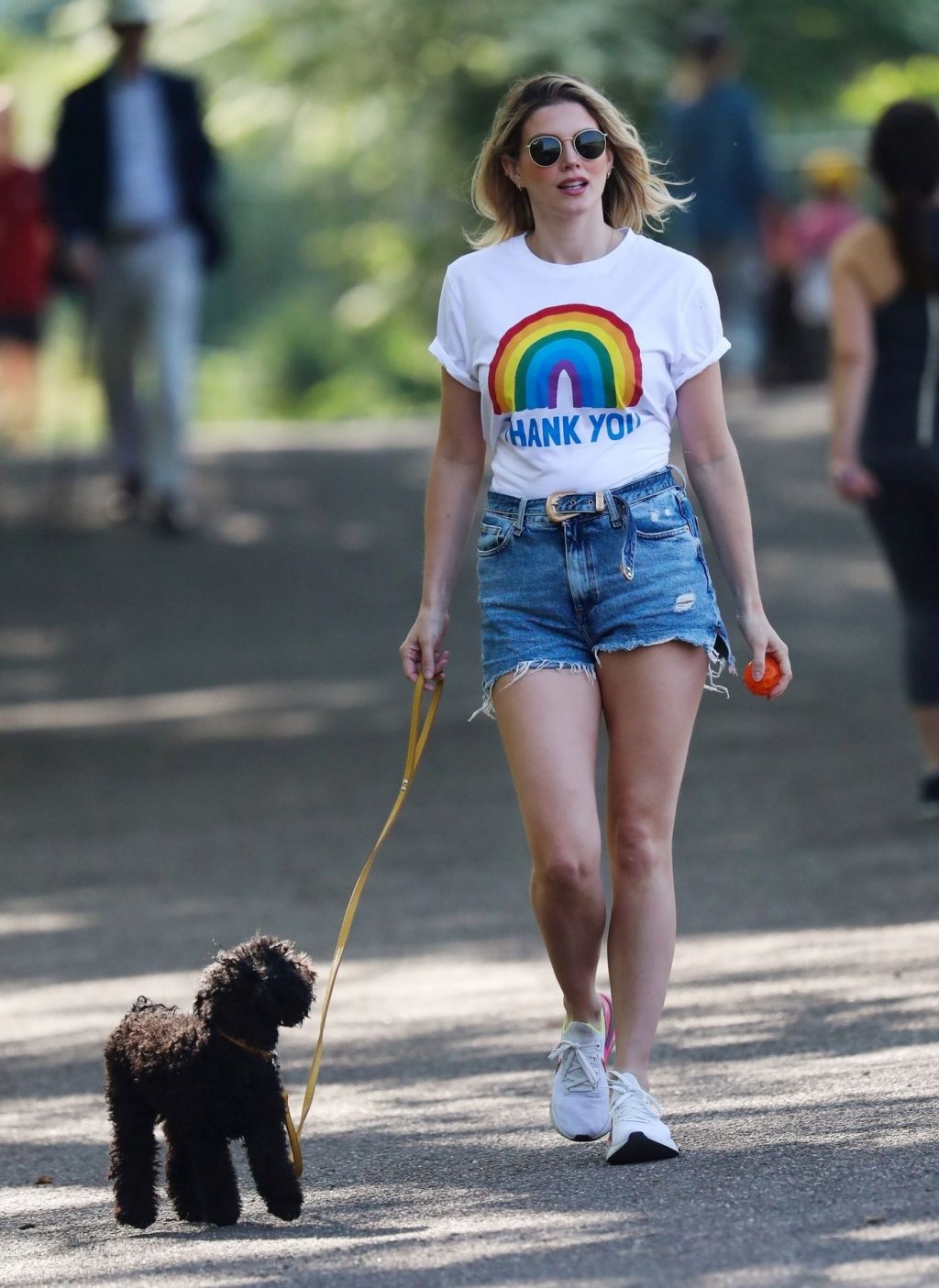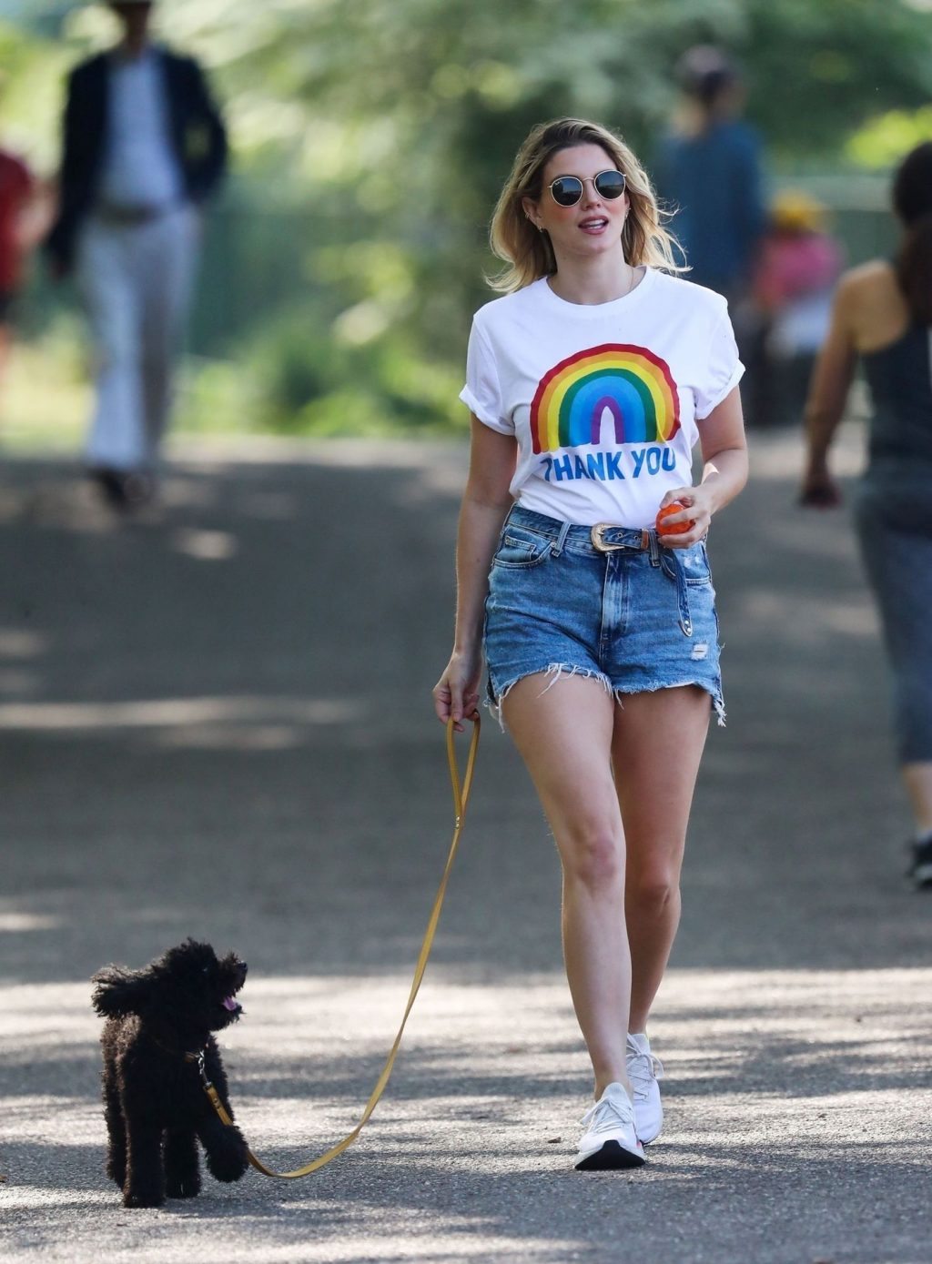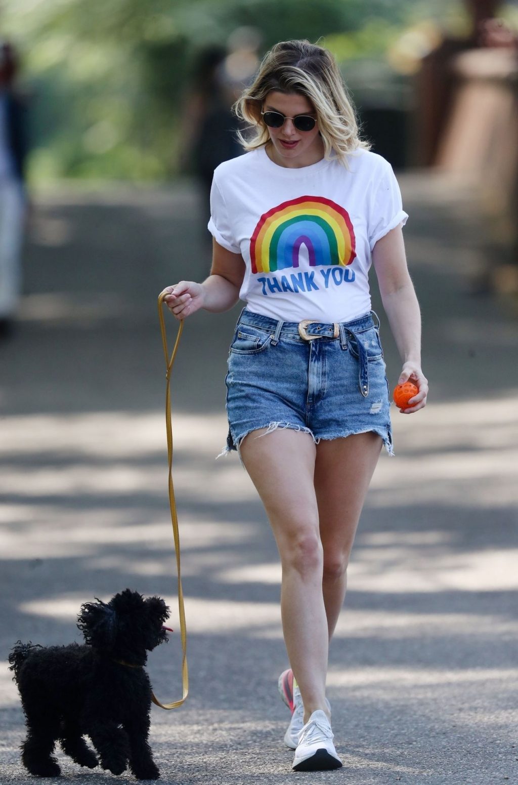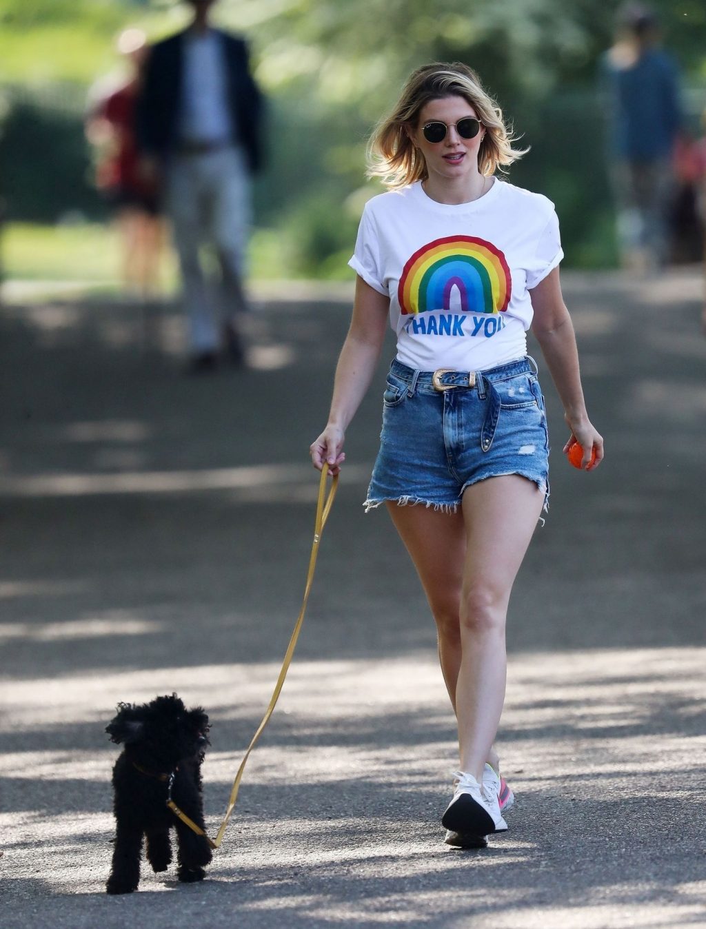 La présentatrice TV et DJ Ashley James a été photographiée, superbe dans un short en jean style « Daisy Duke », alors qu’elle soutenait le NHS avec un T-shirt tout en profitant de sa promenade avec son chien dans un parc local à Londres, le 24/04/2020.