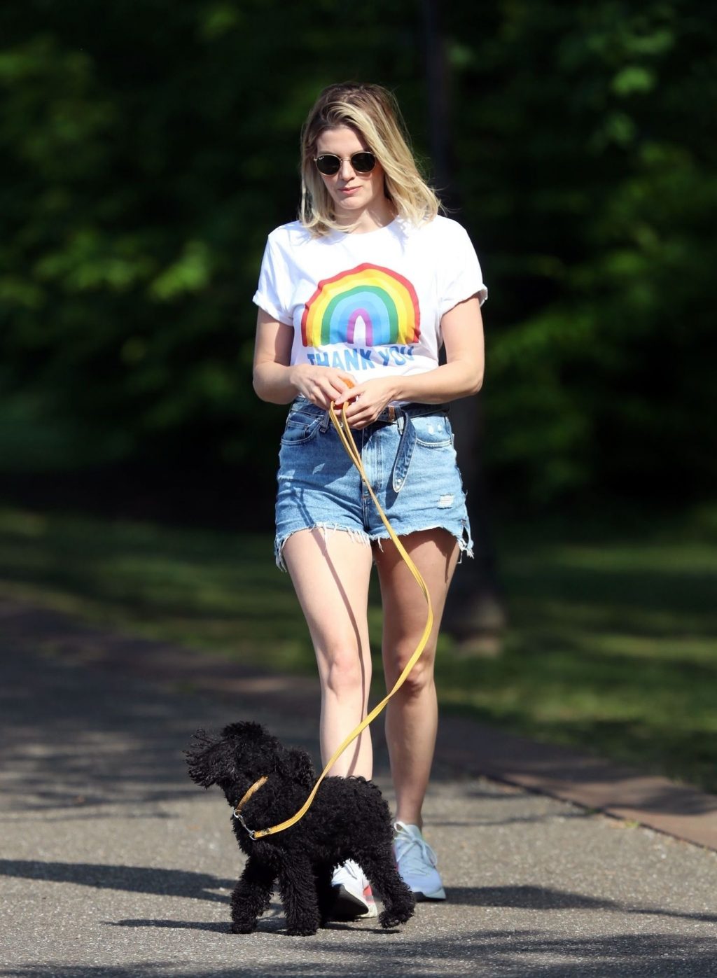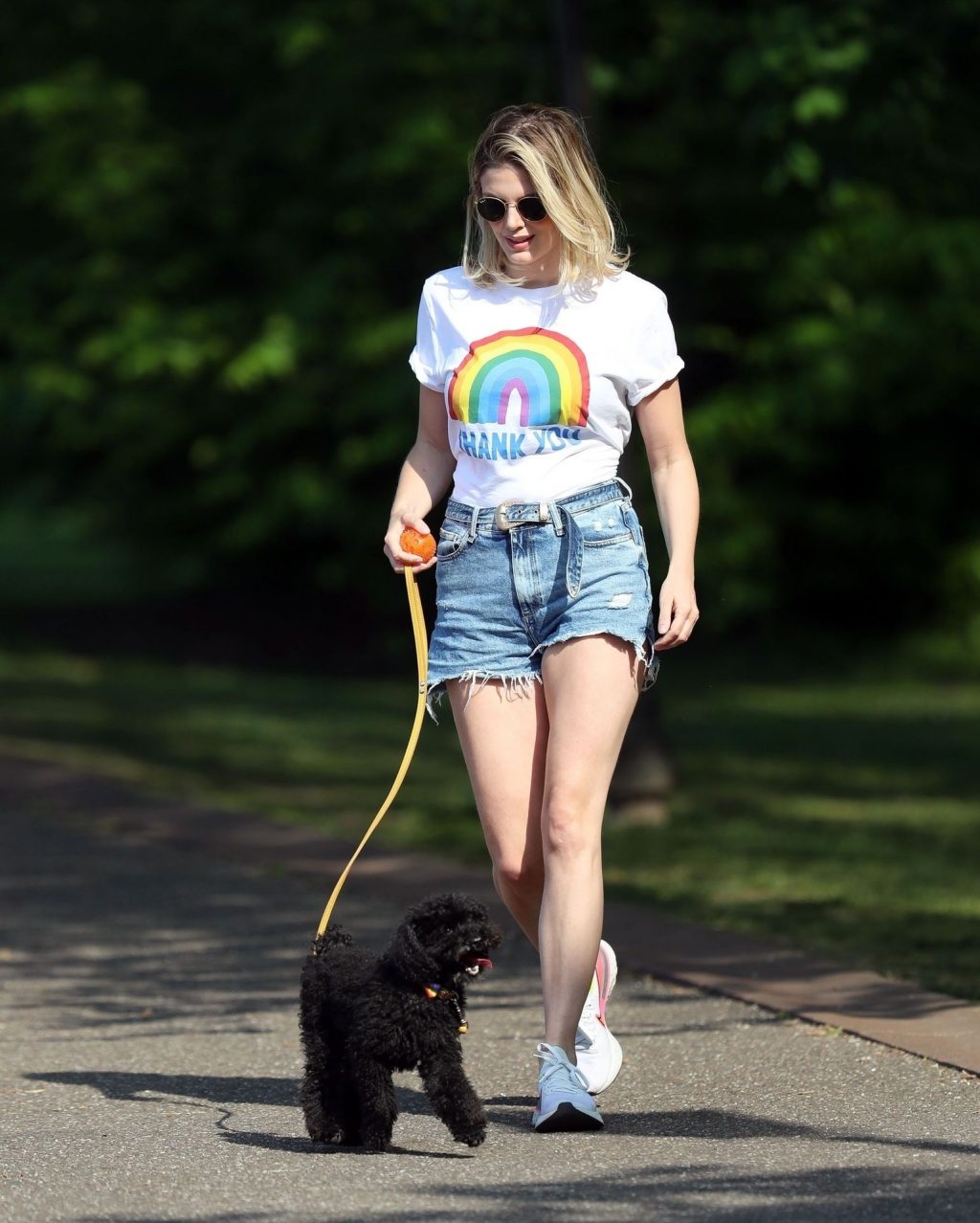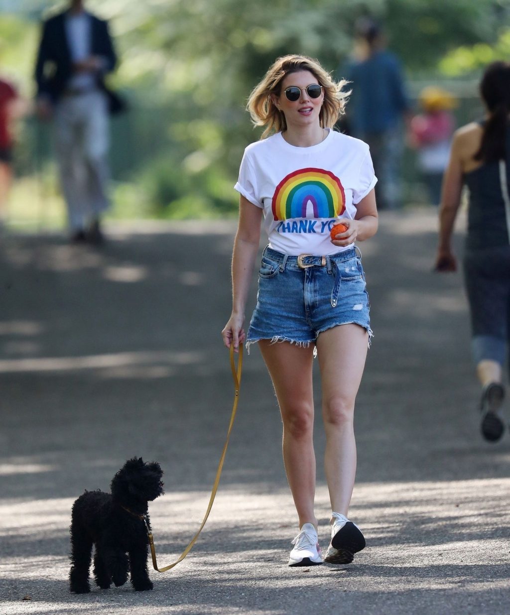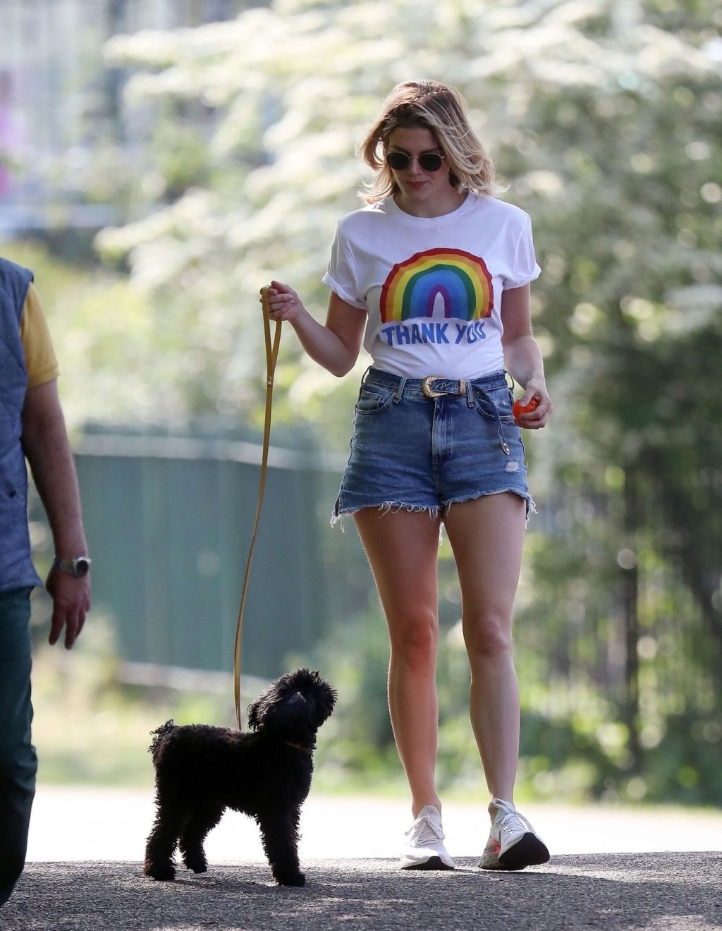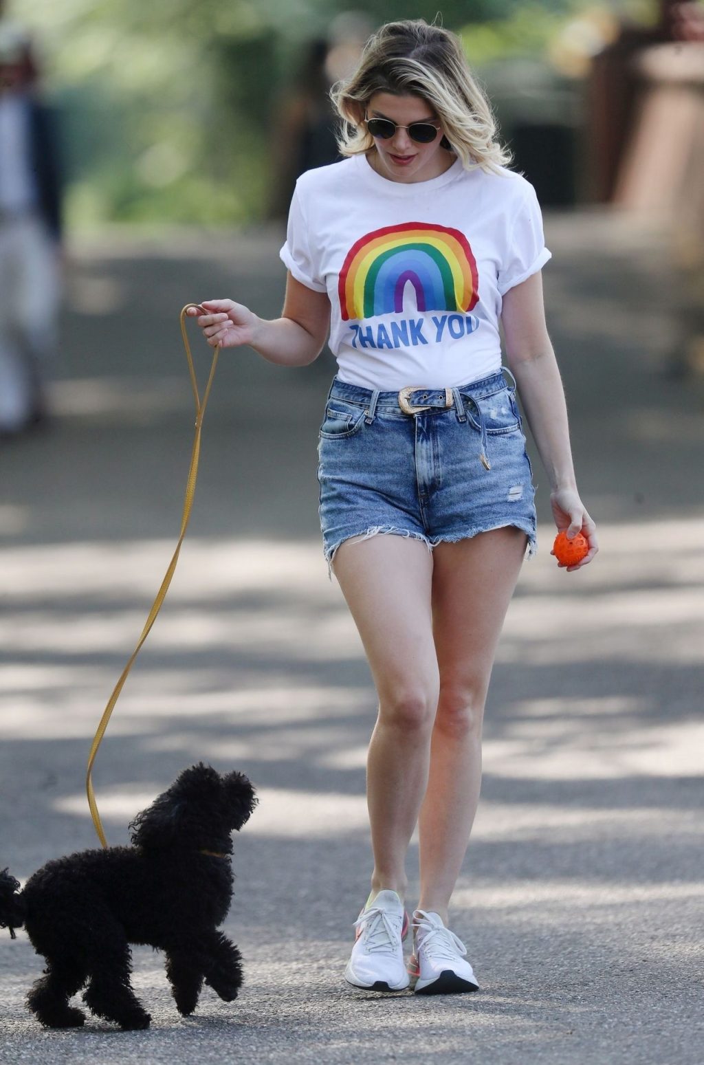 La présentatrice TV et DJ Ashley James a été photographiée, superbe dans un short en jean style « Daisy Duke », alors qu’elle soutenait le NHS avec un T-shirt tout en profitant de sa promenade avec son chien dans un parc local à Londres, le 24/04/2020.