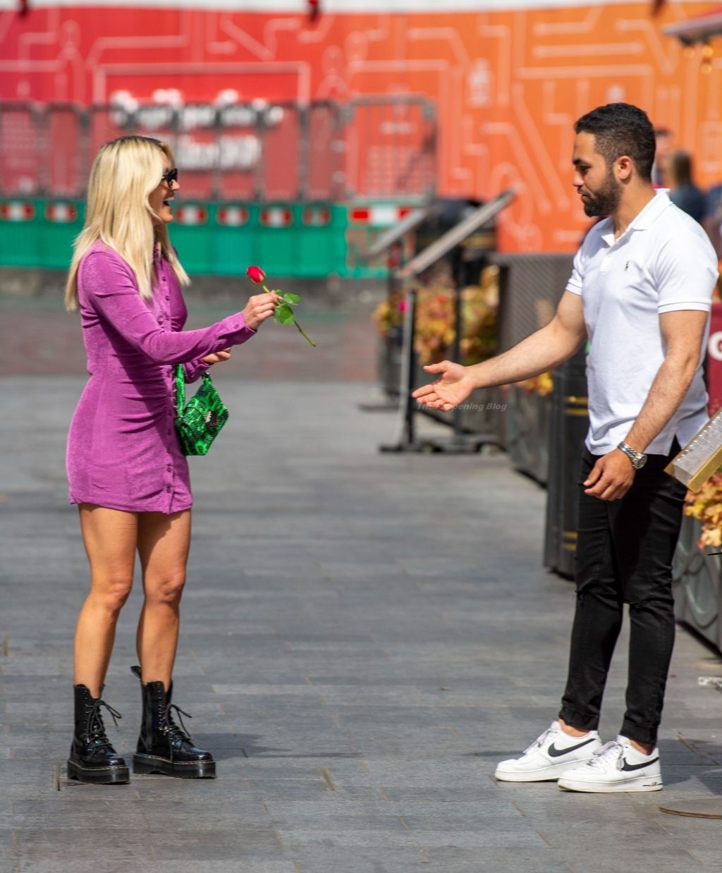 La bombe blonde reçoit une rose rouge d’un gentleman devant les studios.