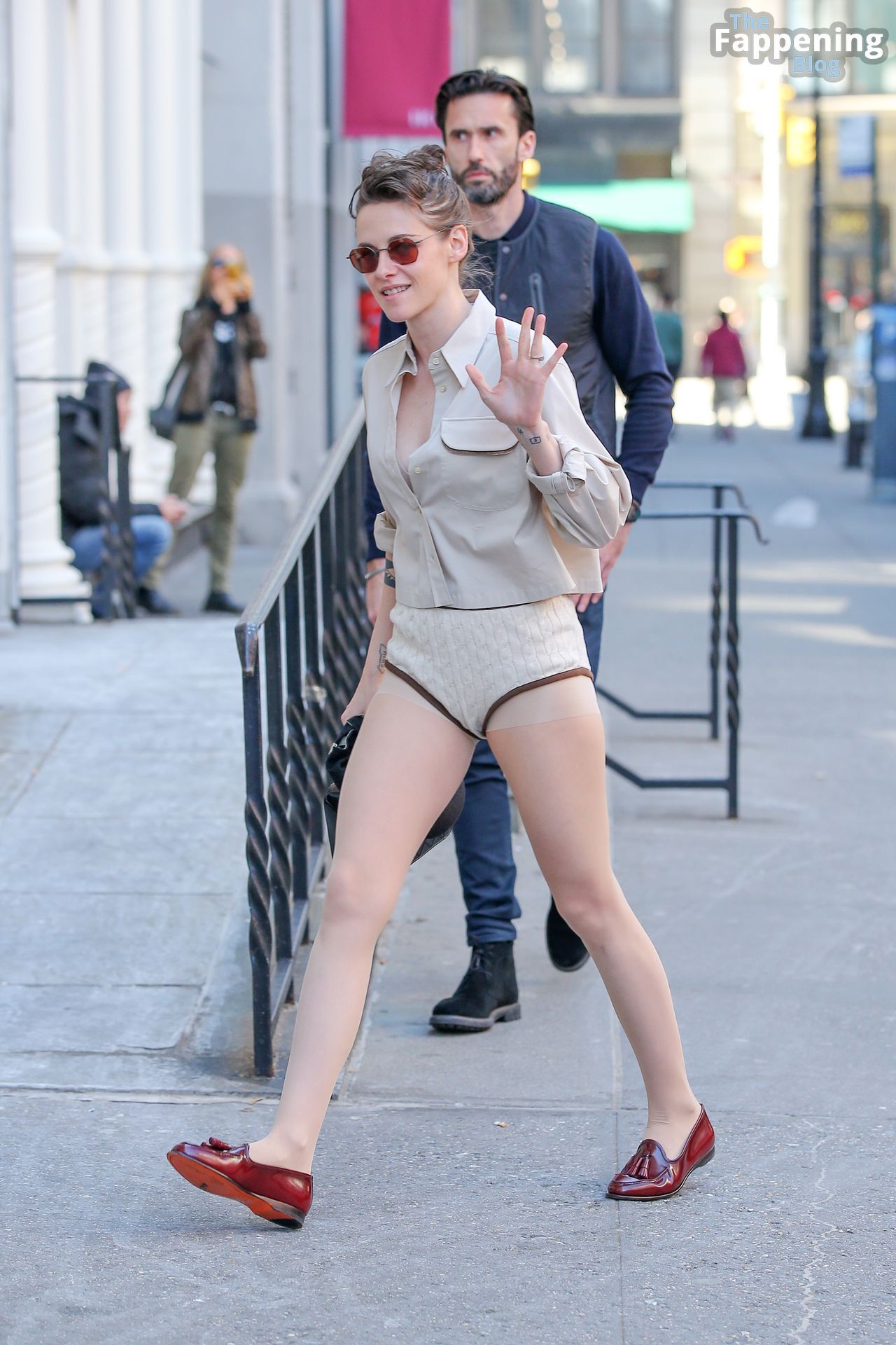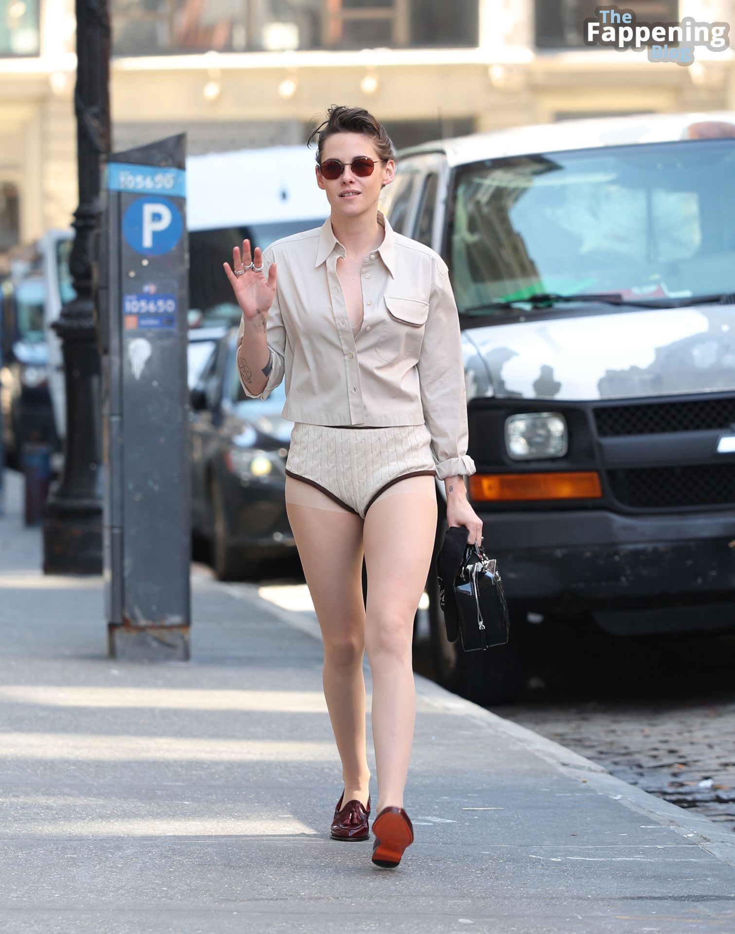 Kristen Stewart a été photographiée en train de sortir à New York, le 12/03/2024. L’actrice américaine portait un sac Chanel et arborait un chemisier beige, un short assorti, des collants couleur chair et des mocassins bordeaux.