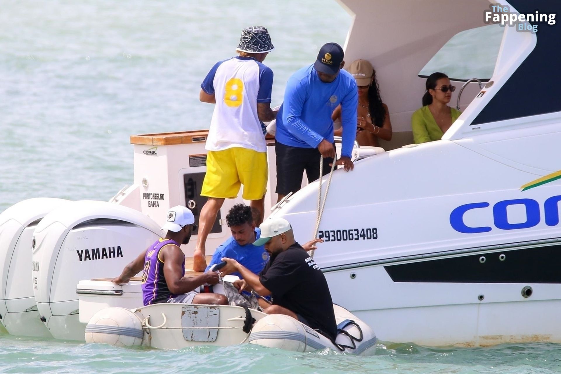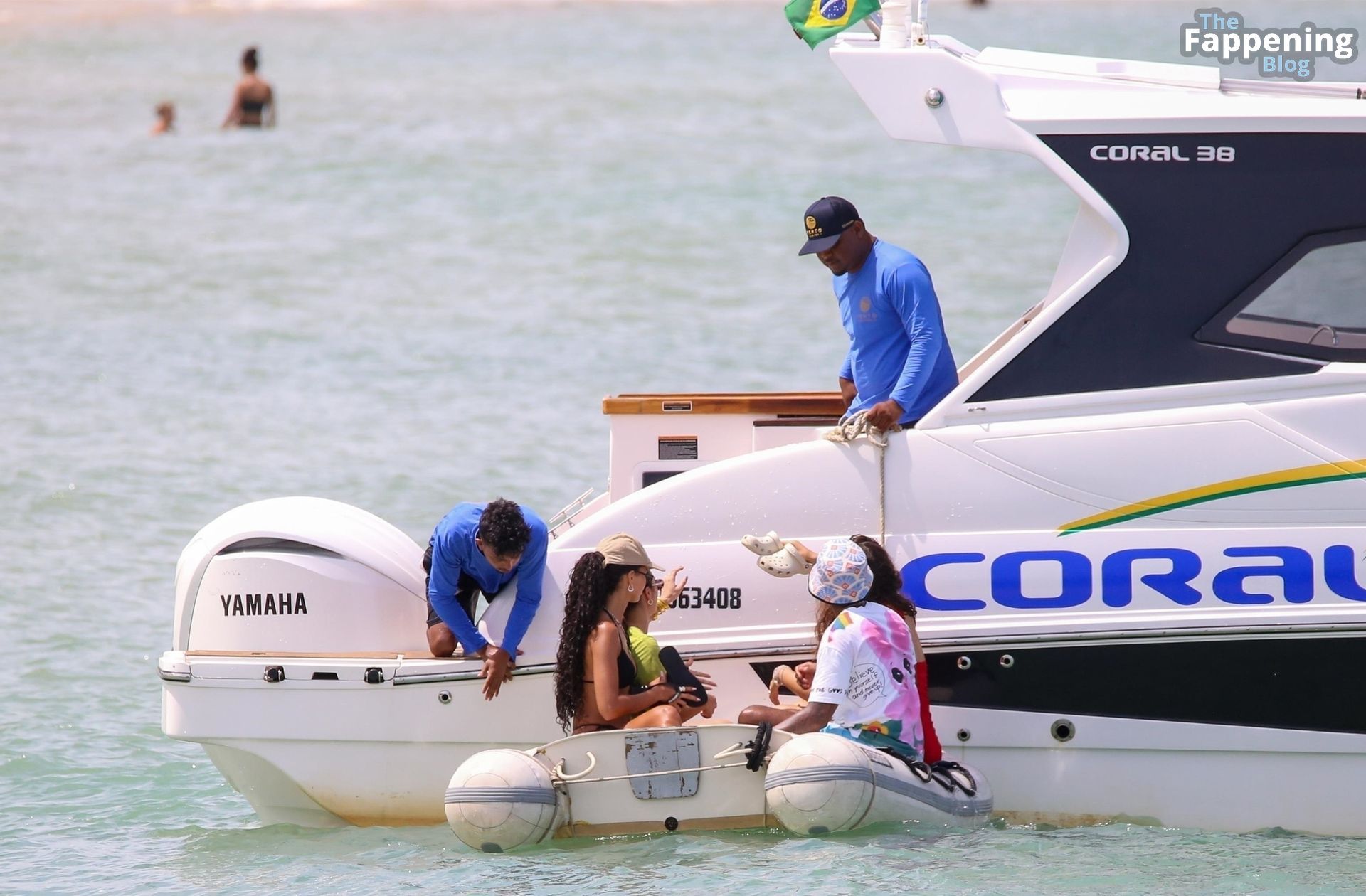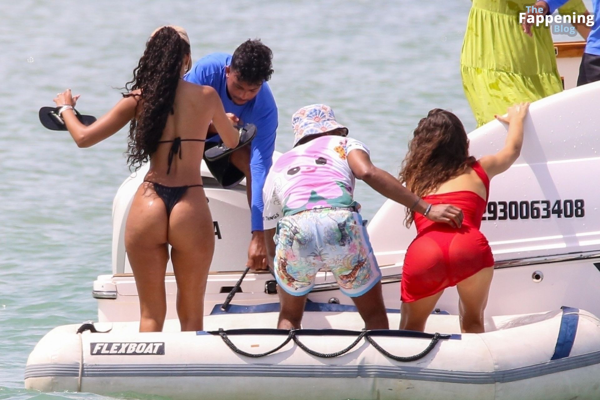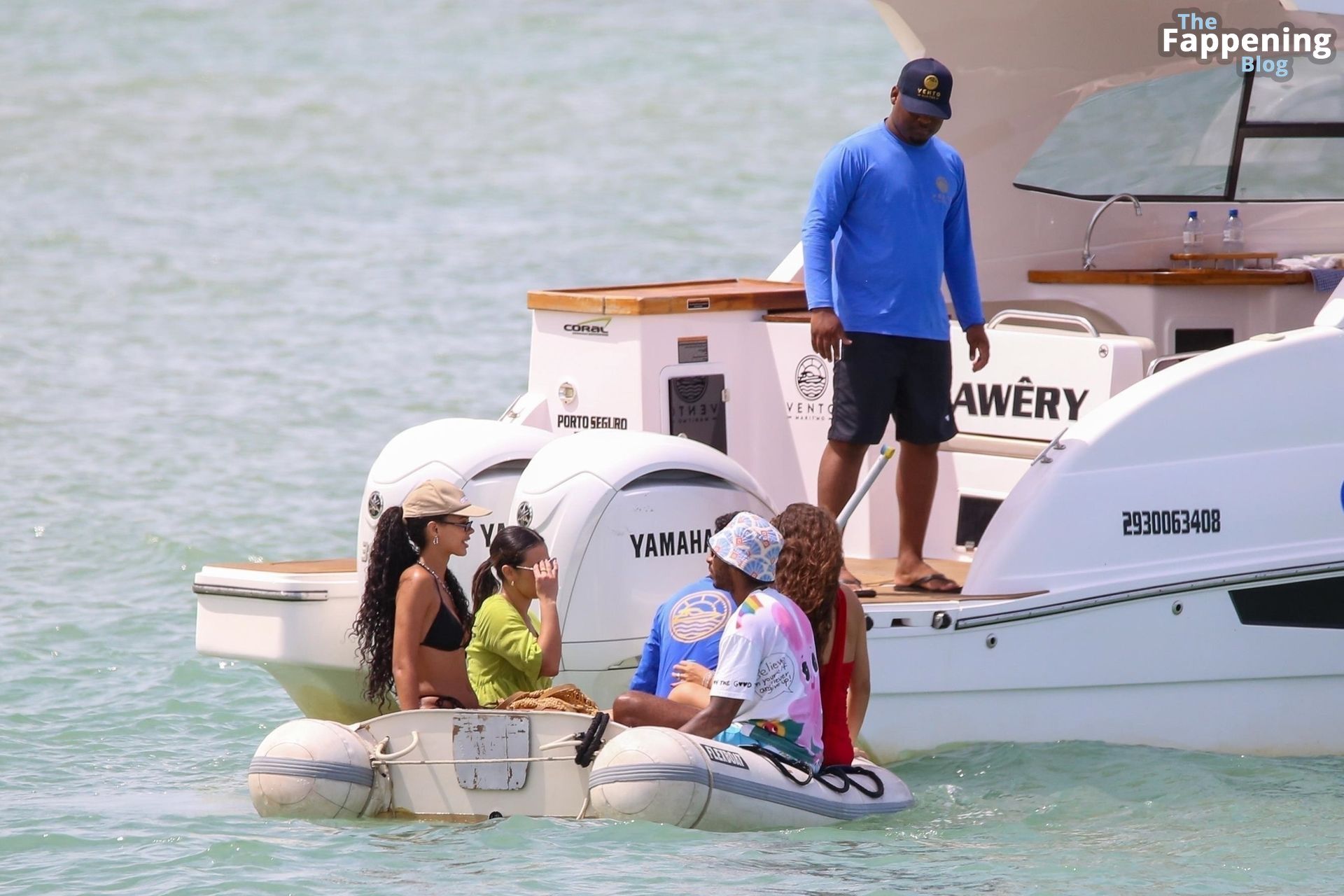 La star de la Formule 1 Lewis Hamilton et le mannequin Juliana Nalu sont photographiés avec des amis en train de monter à bord d’un bateau pendant leurs vacances à Trancoso, au Brésil, le 01/01/2024.