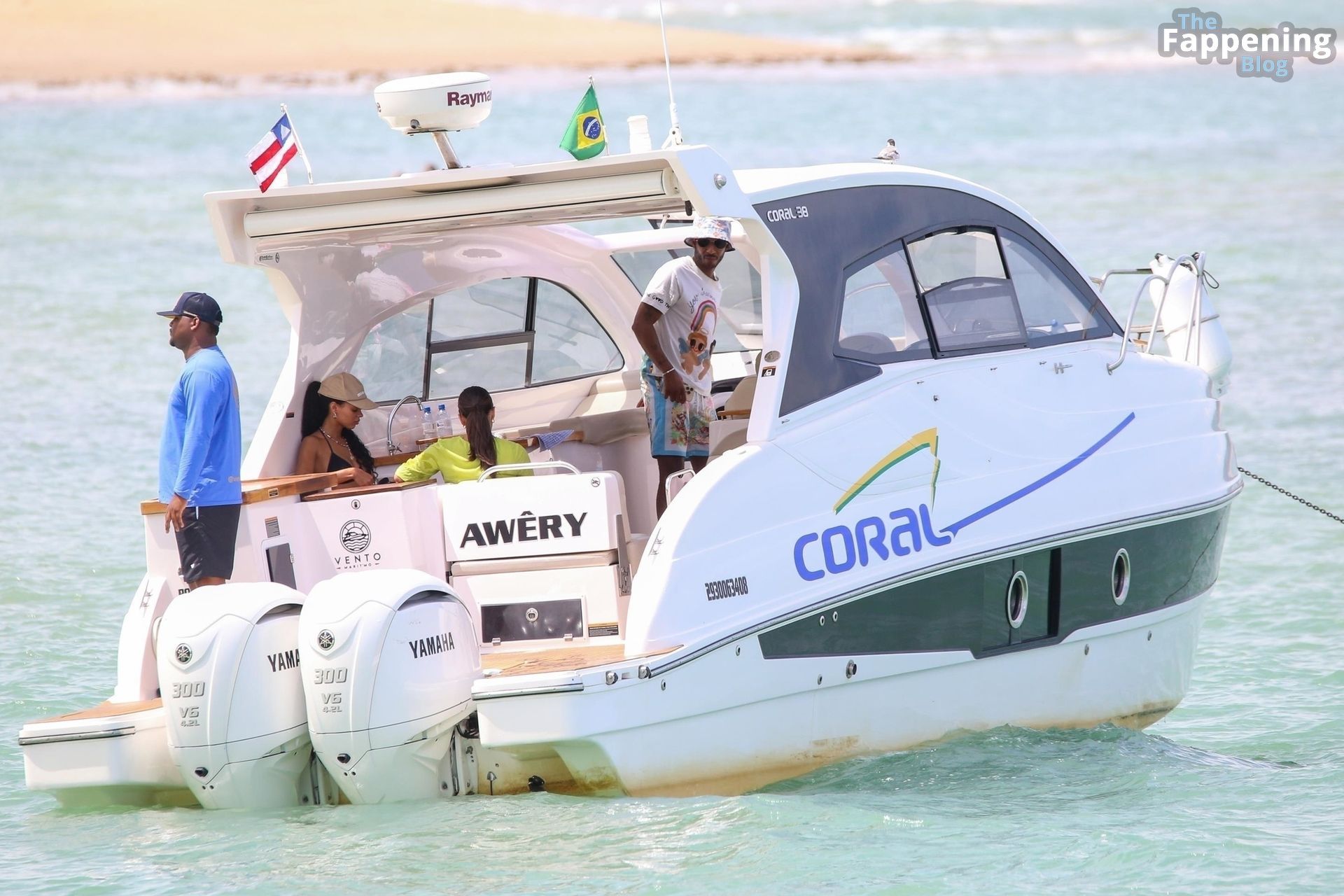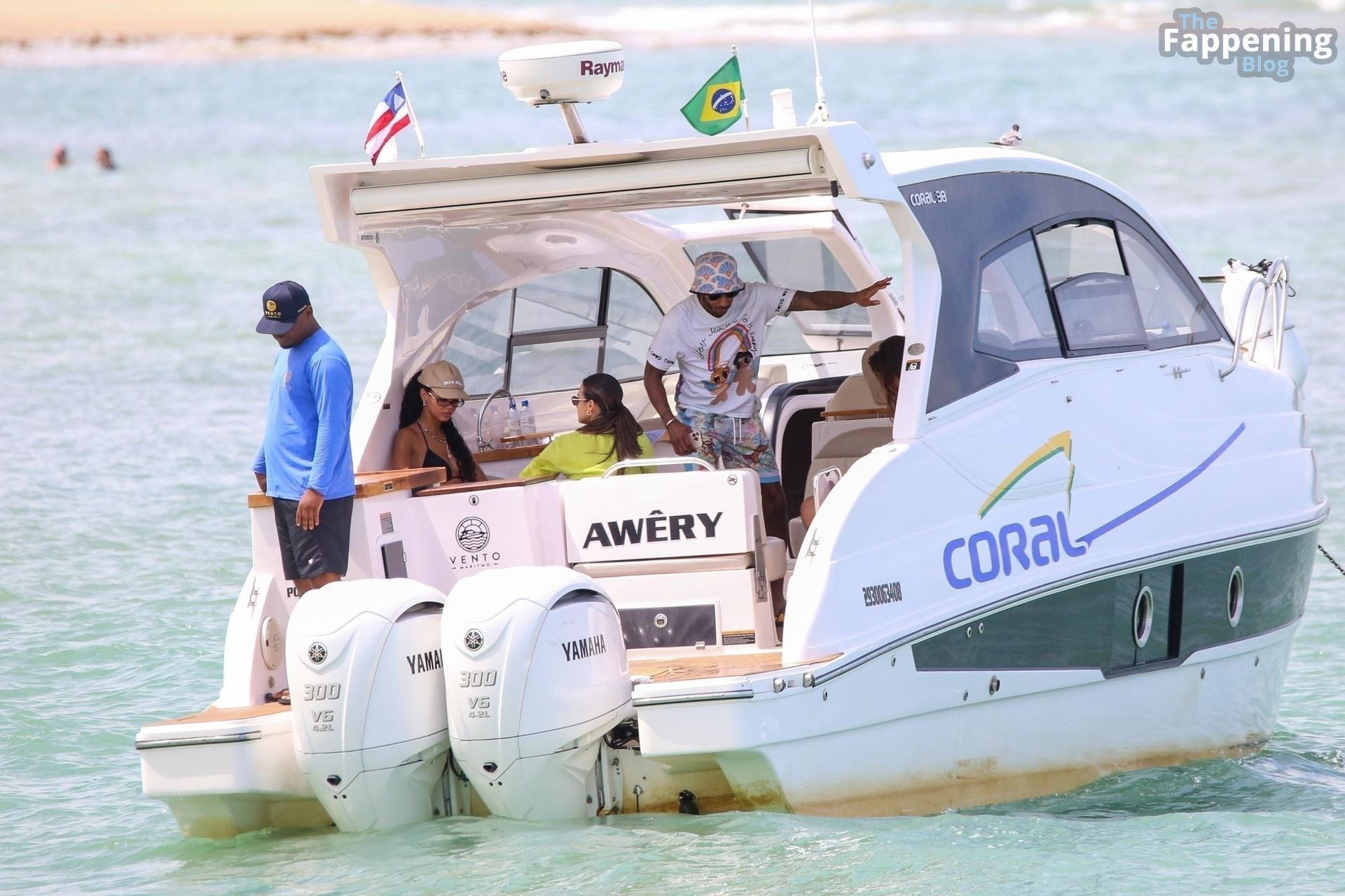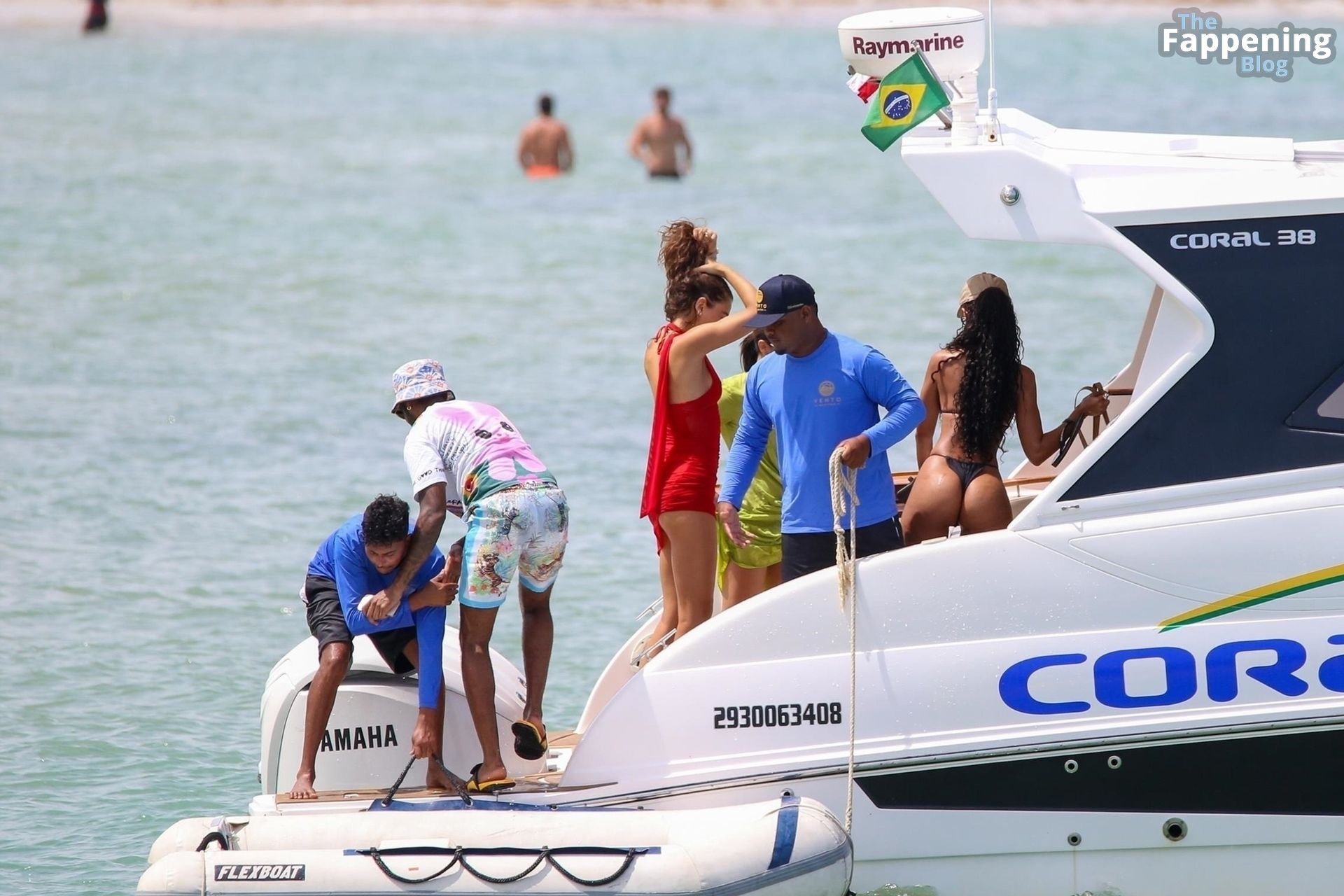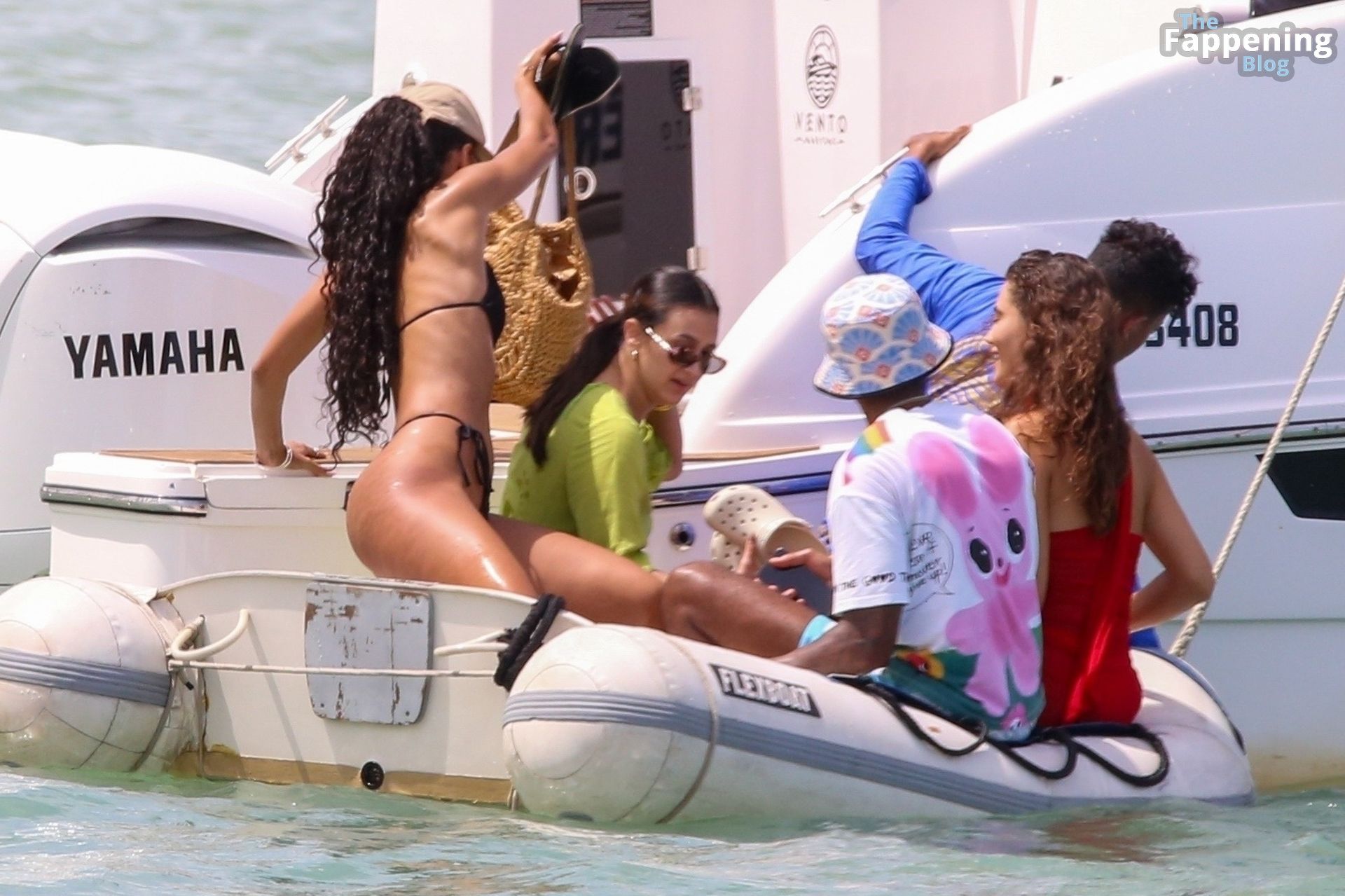 La star de la Formule 1 Lewis Hamilton et le mannequin Juliana Nalu sont photographiés avec des amis en train de monter à bord d’un bateau pendant leurs vacances à Trancoso, au Brésil, le 01/01/2024.