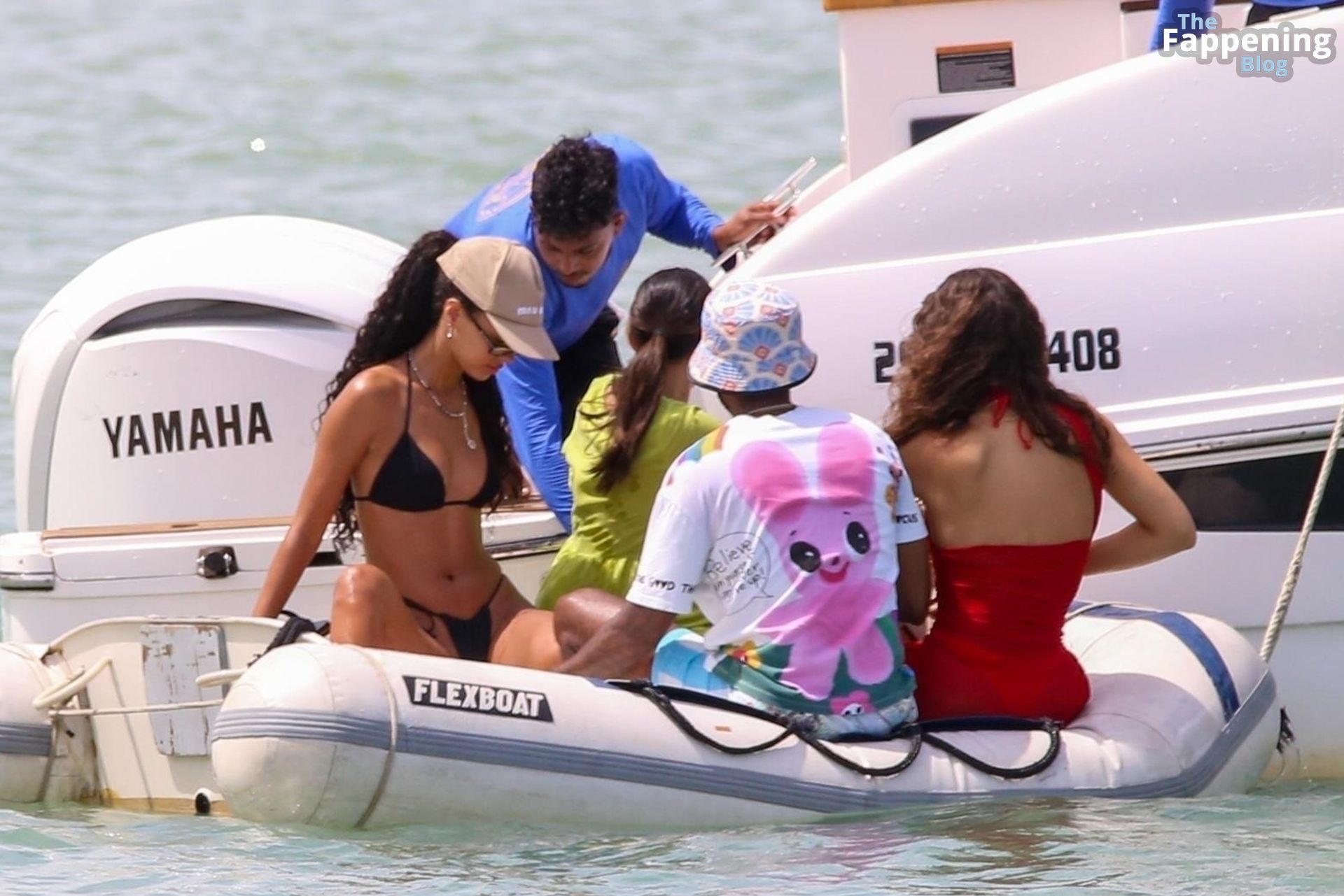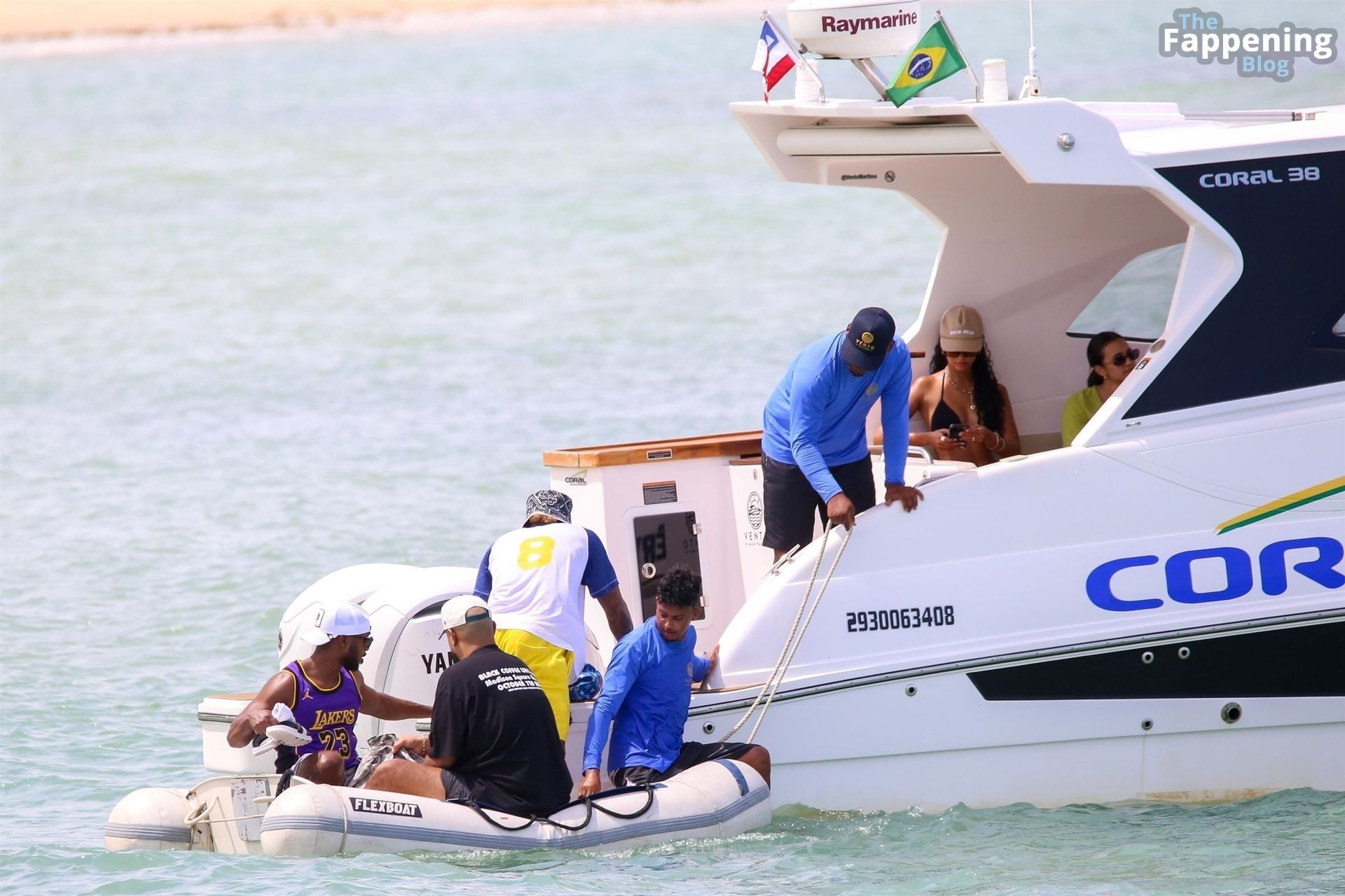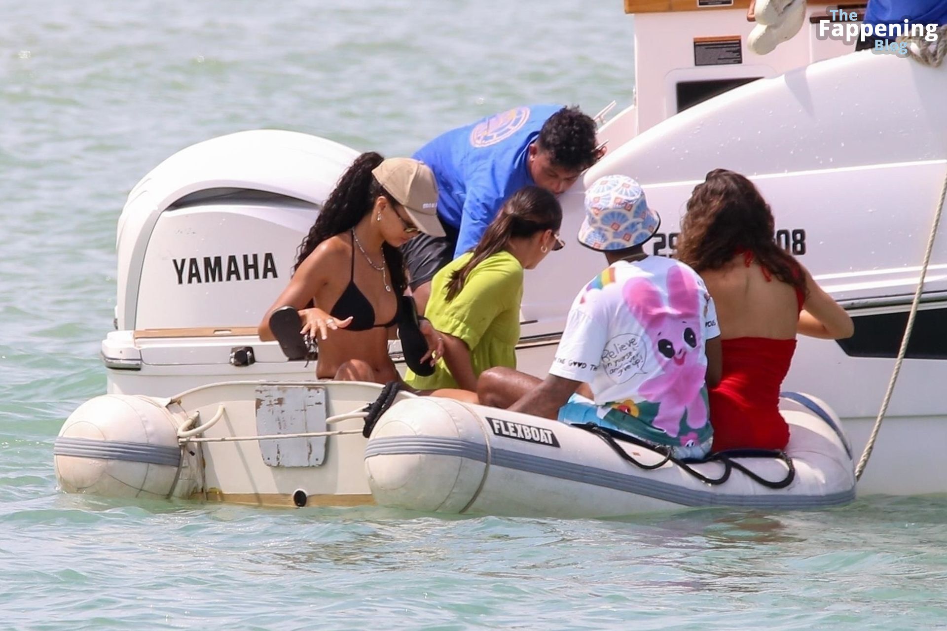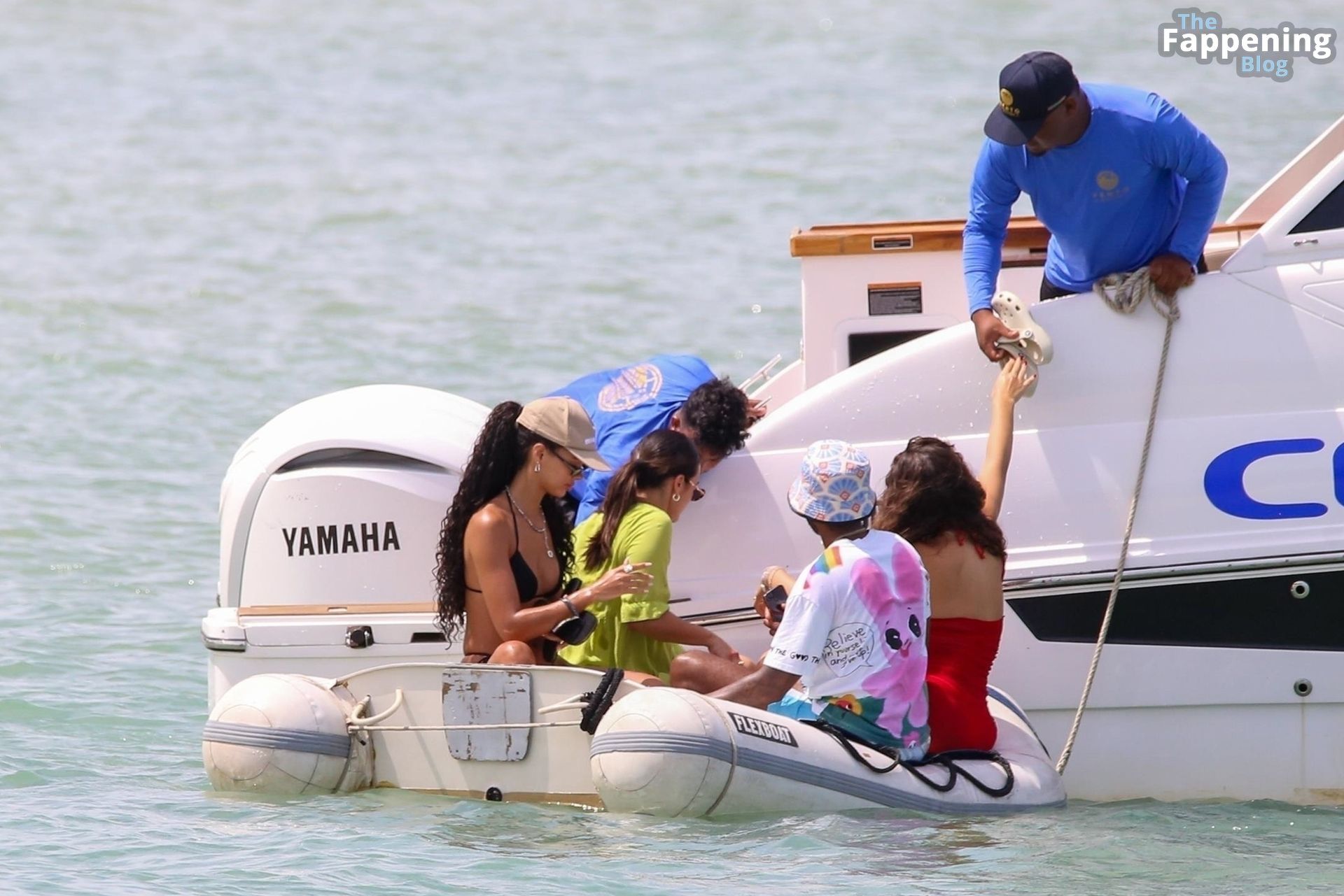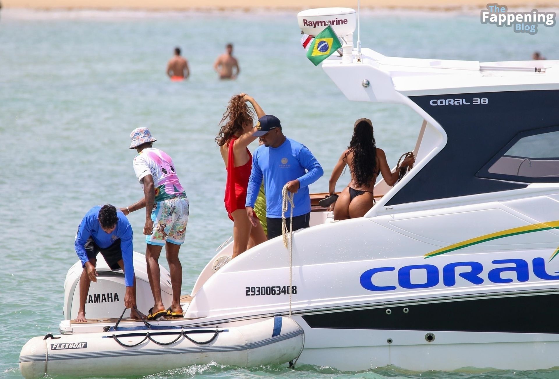 La star de la Formule 1 Lewis Hamilton et le mannequin Juliana Nalu sont photographiés avec des amis en train de monter à bord d’un bateau pendant leurs vacances à Trancoso, au Brésil, le 01/01/2024.