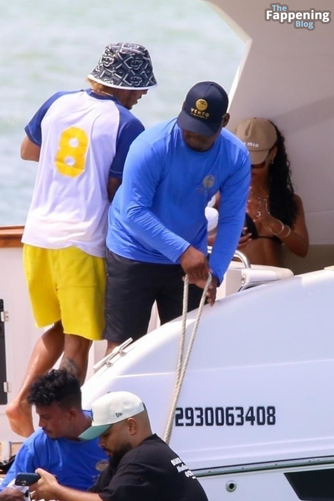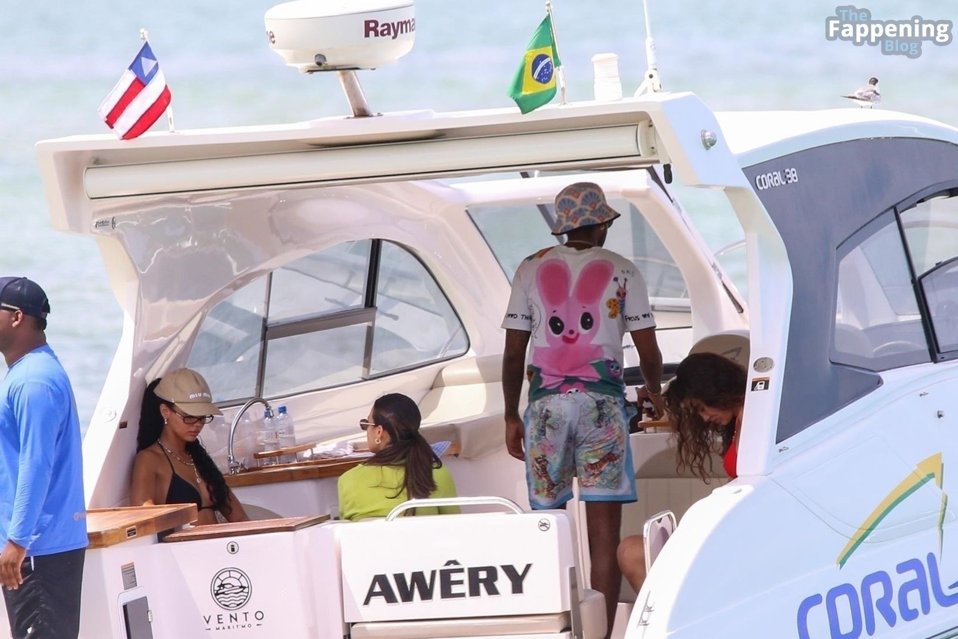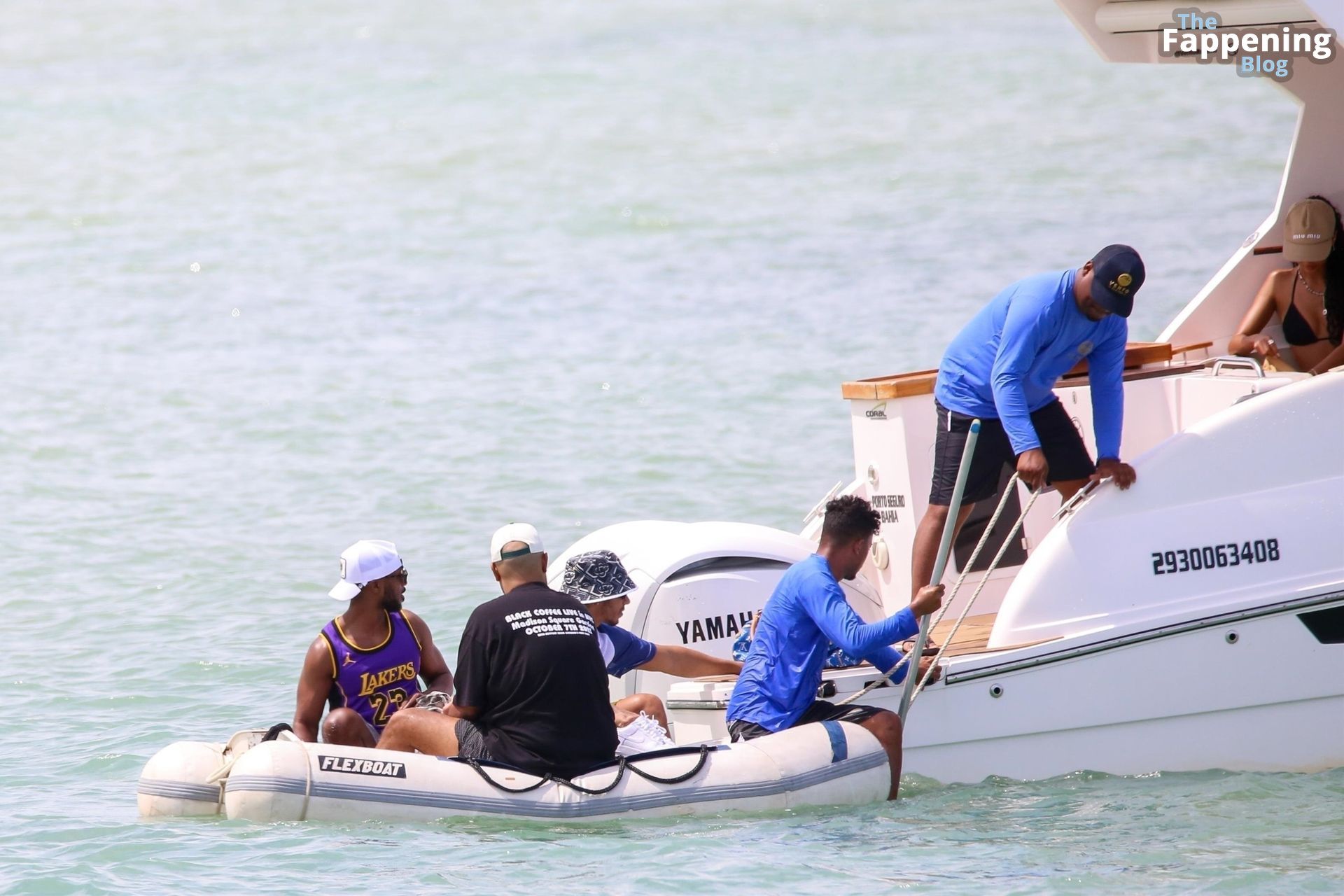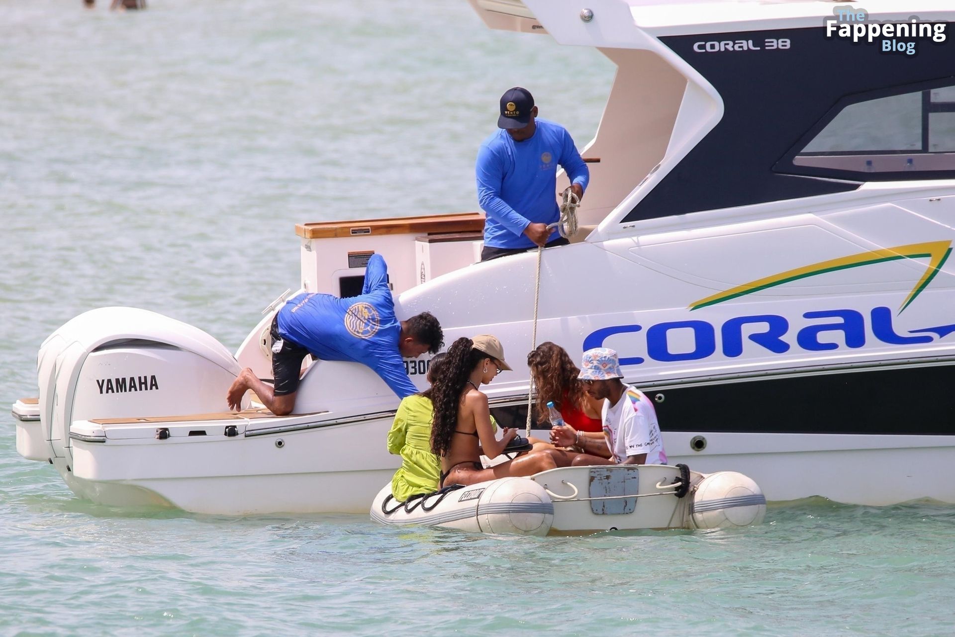 La star de la Formule 1 Lewis Hamilton et le mannequin Juliana Nalu sont photographiés avec des amis en train de monter à bord d’un bateau pendant leurs vacances à Trancoso, au Brésil, le 01/01/2024.