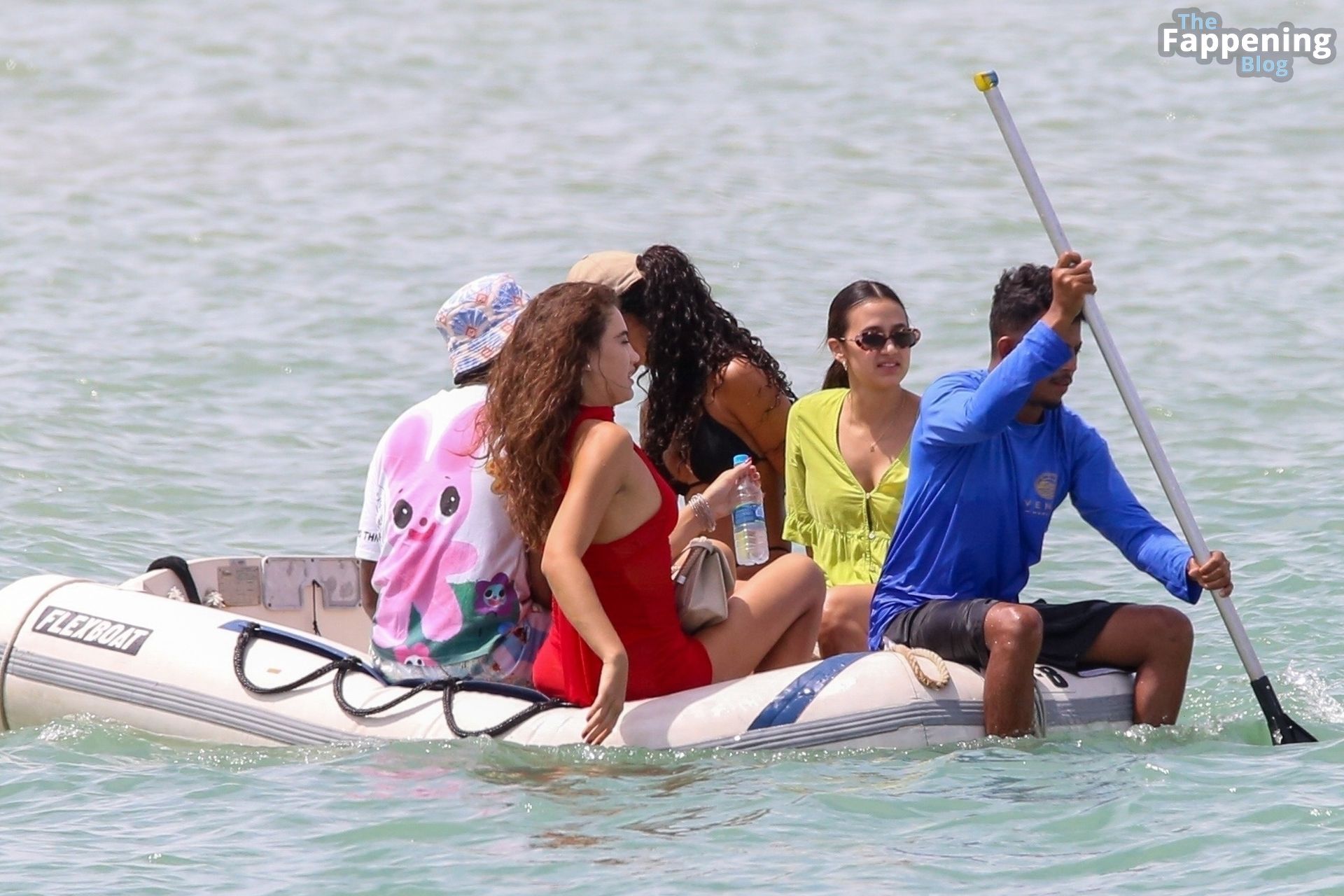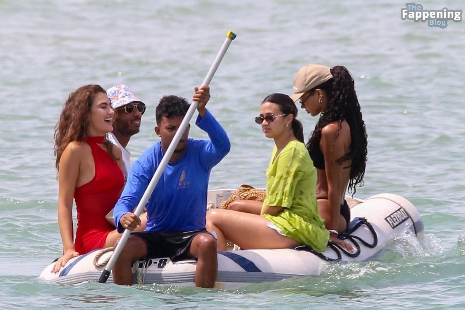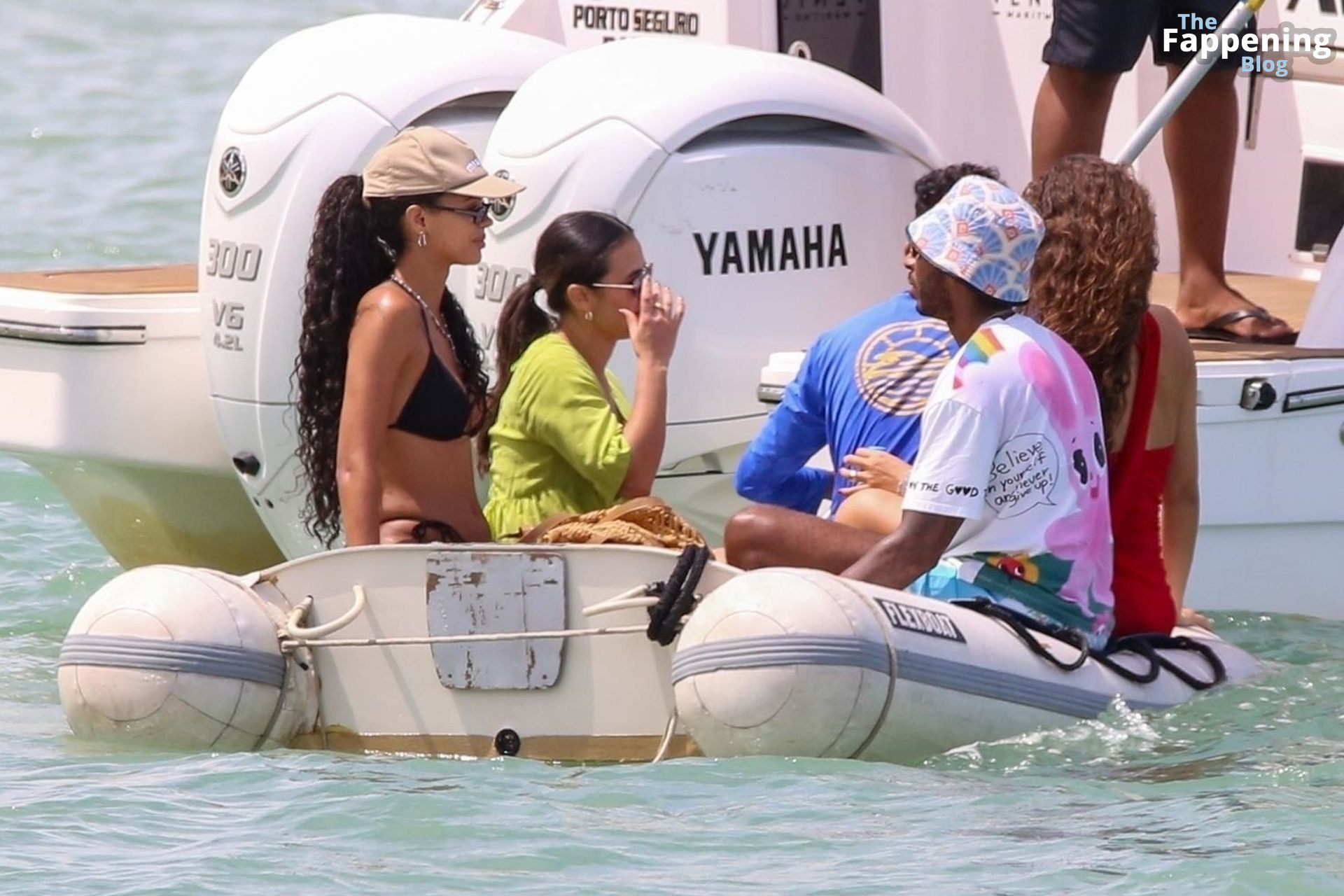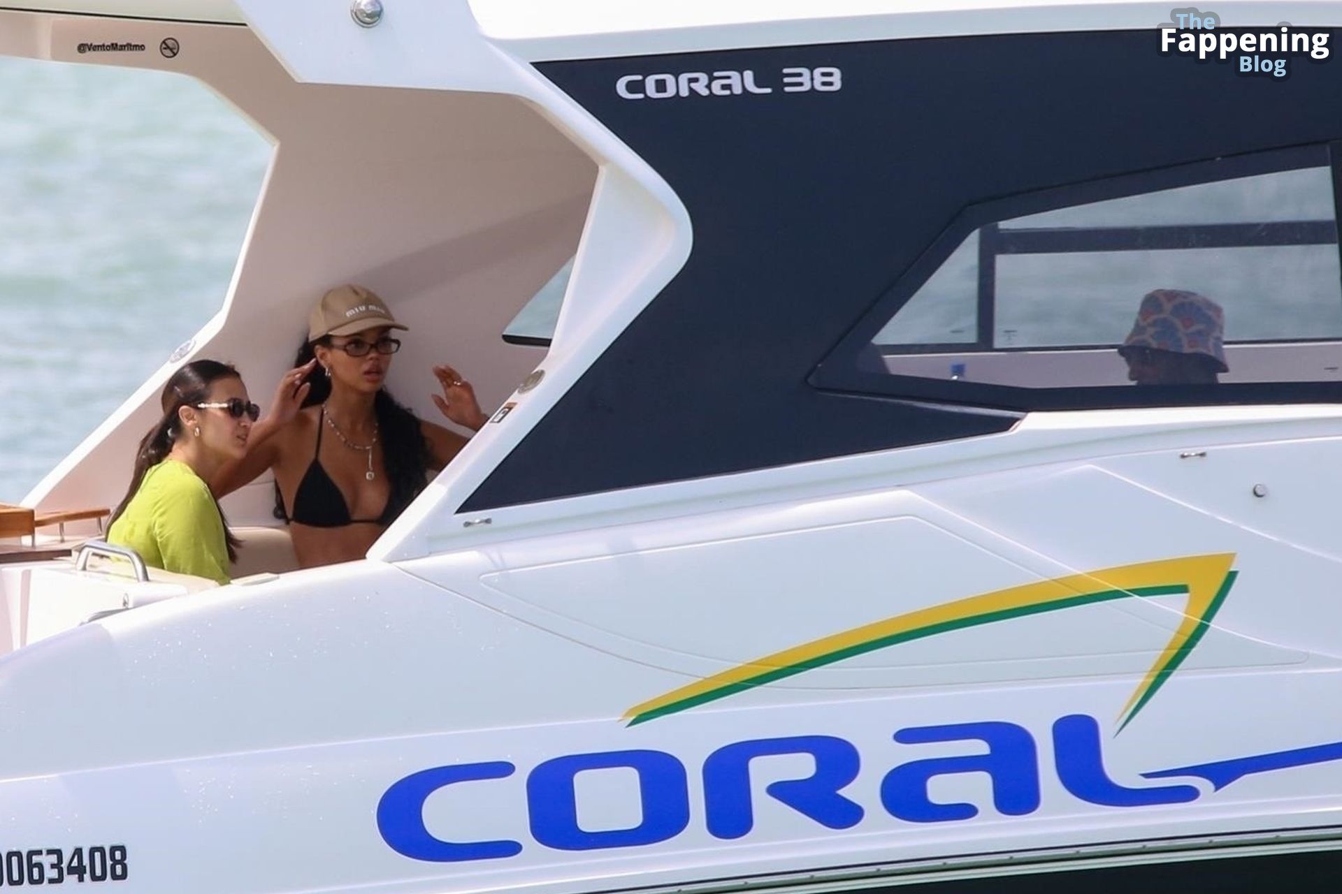 La star de la Formule 1 Lewis Hamilton et le mannequin Juliana Nalu sont photographiés avec des amis en train de monter à bord d’un bateau pendant leurs vacances à Trancoso, au Brésil, le 01/01/2024.