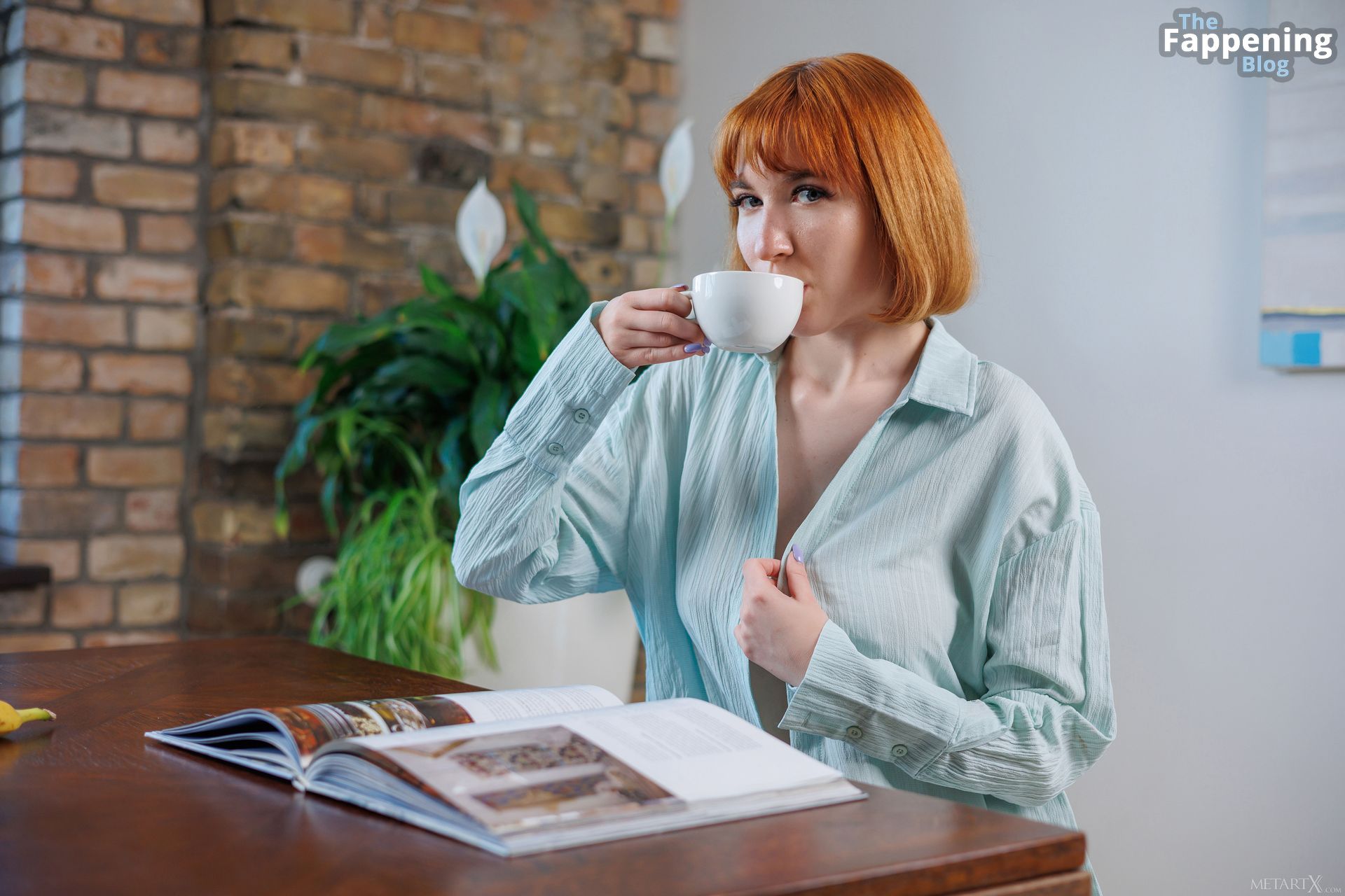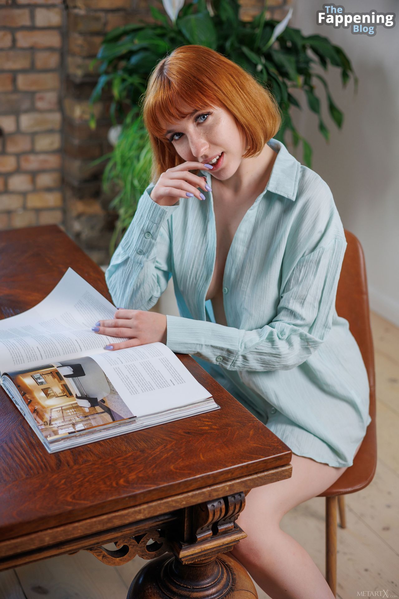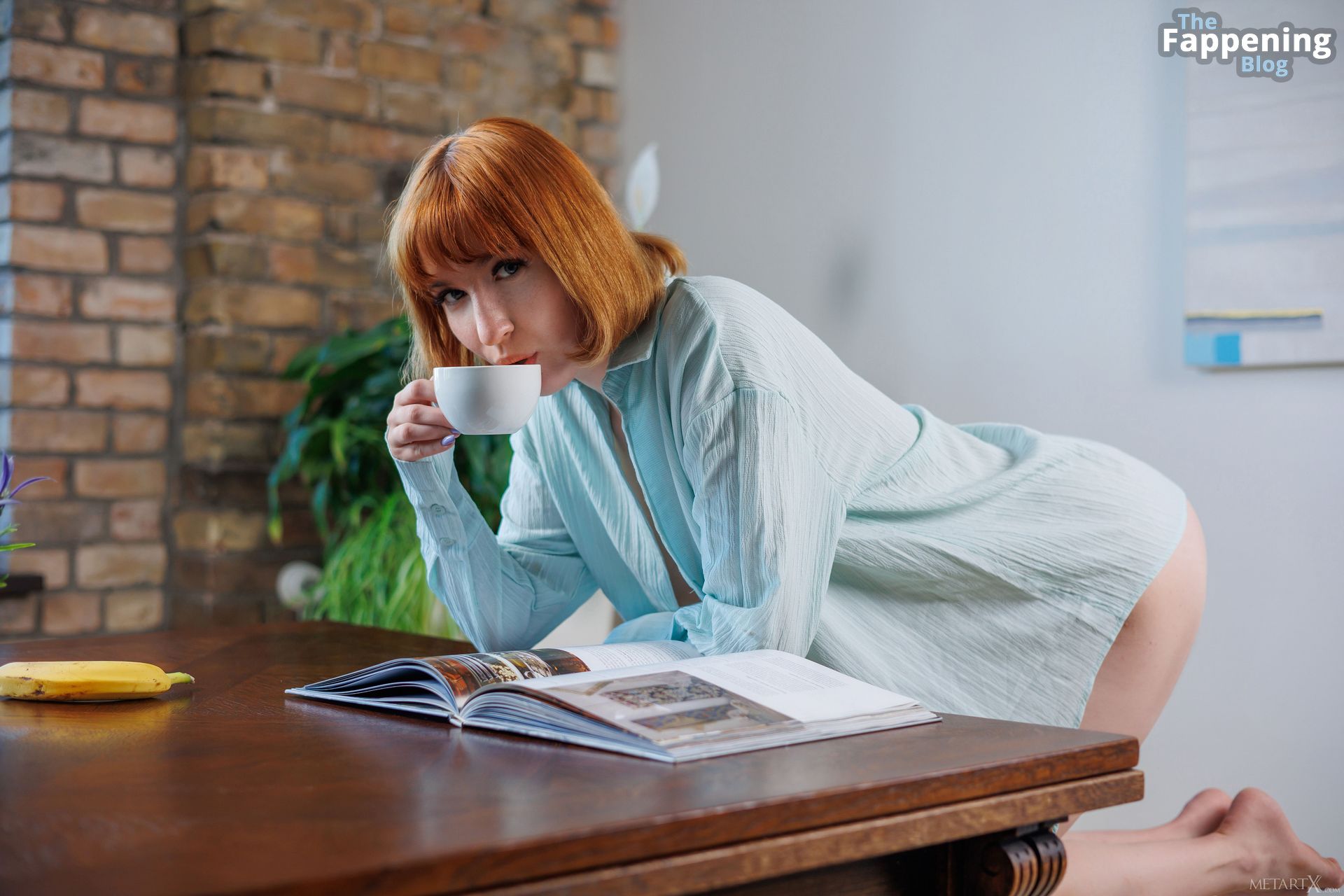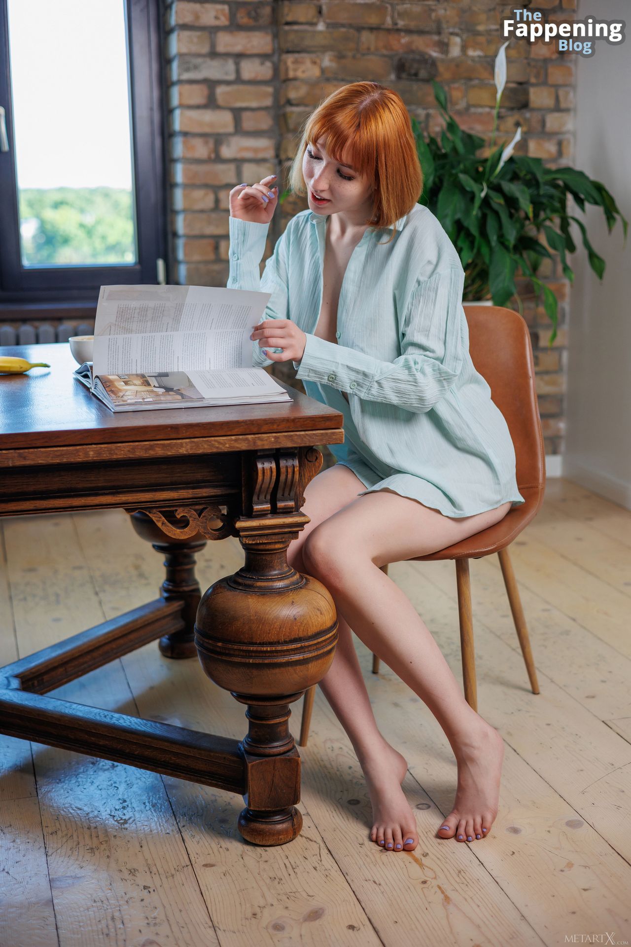 Des photos de la superbe rousse Lilly Mays entièrement nue sur la table de la cuisine, mais elle ne sert pas le petit-déjeuner. À la place, Lilly nous offre la vue de son magnifique corps nu, en retirant sa culotte juste devant la caméra.