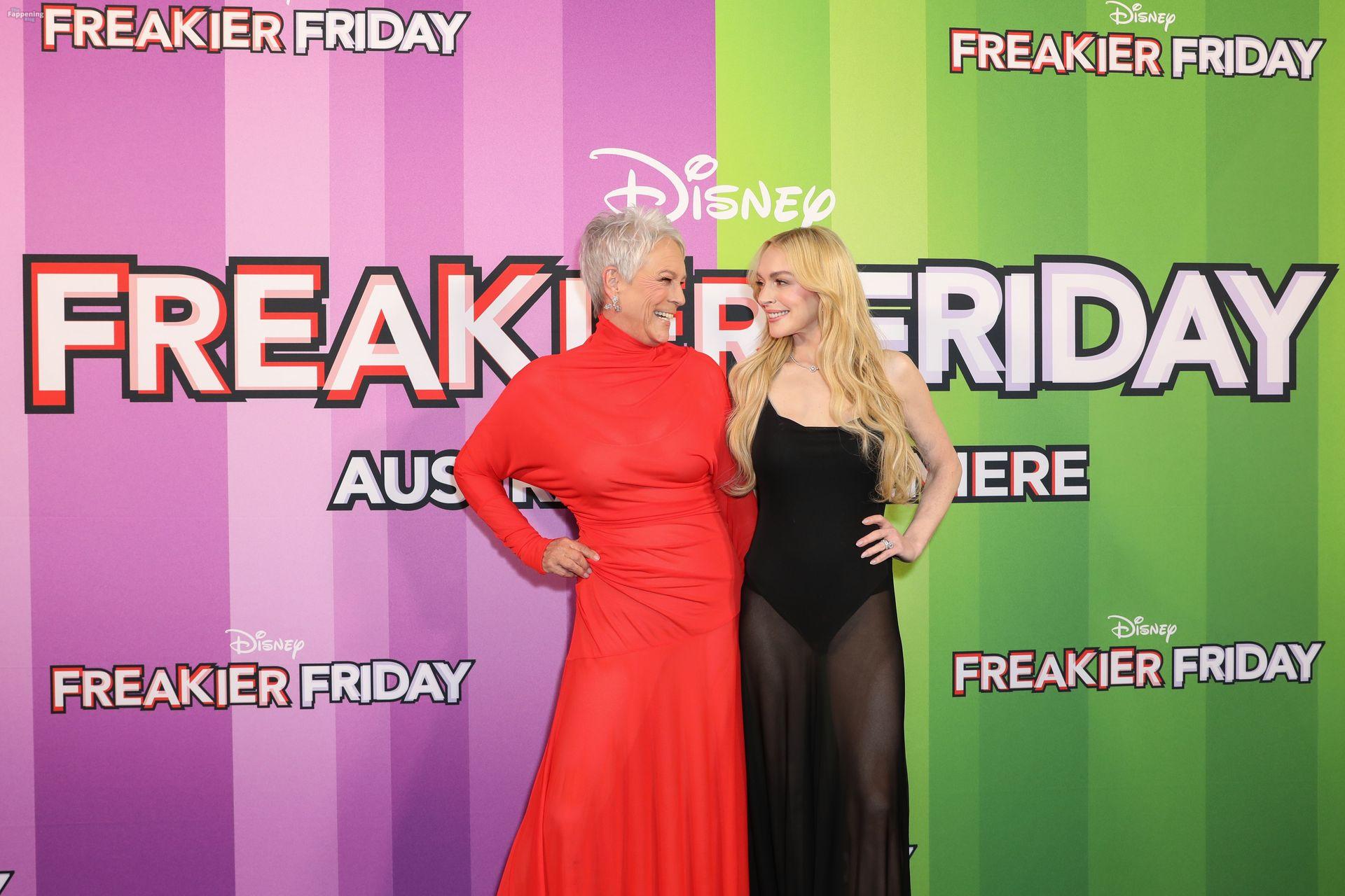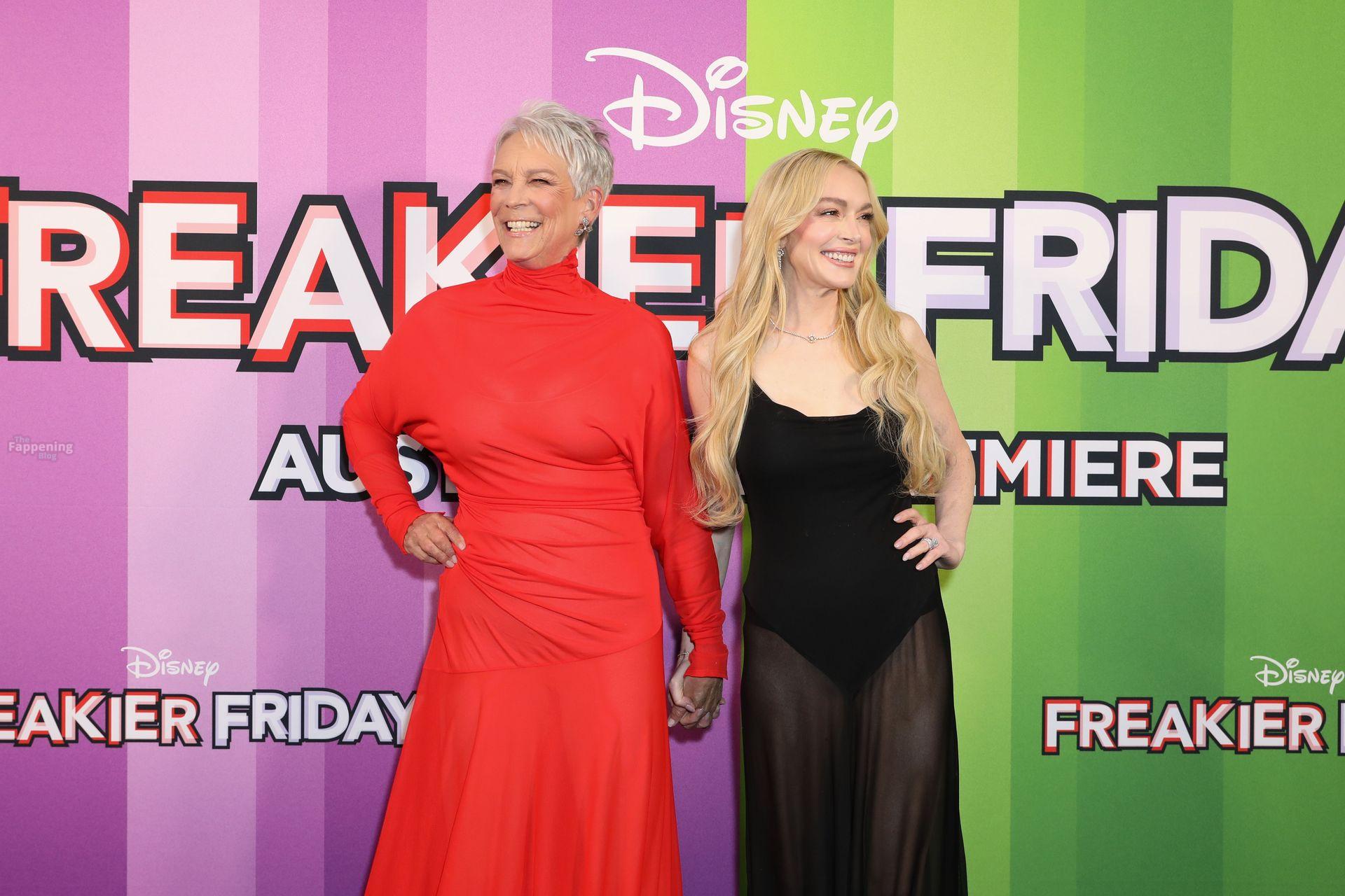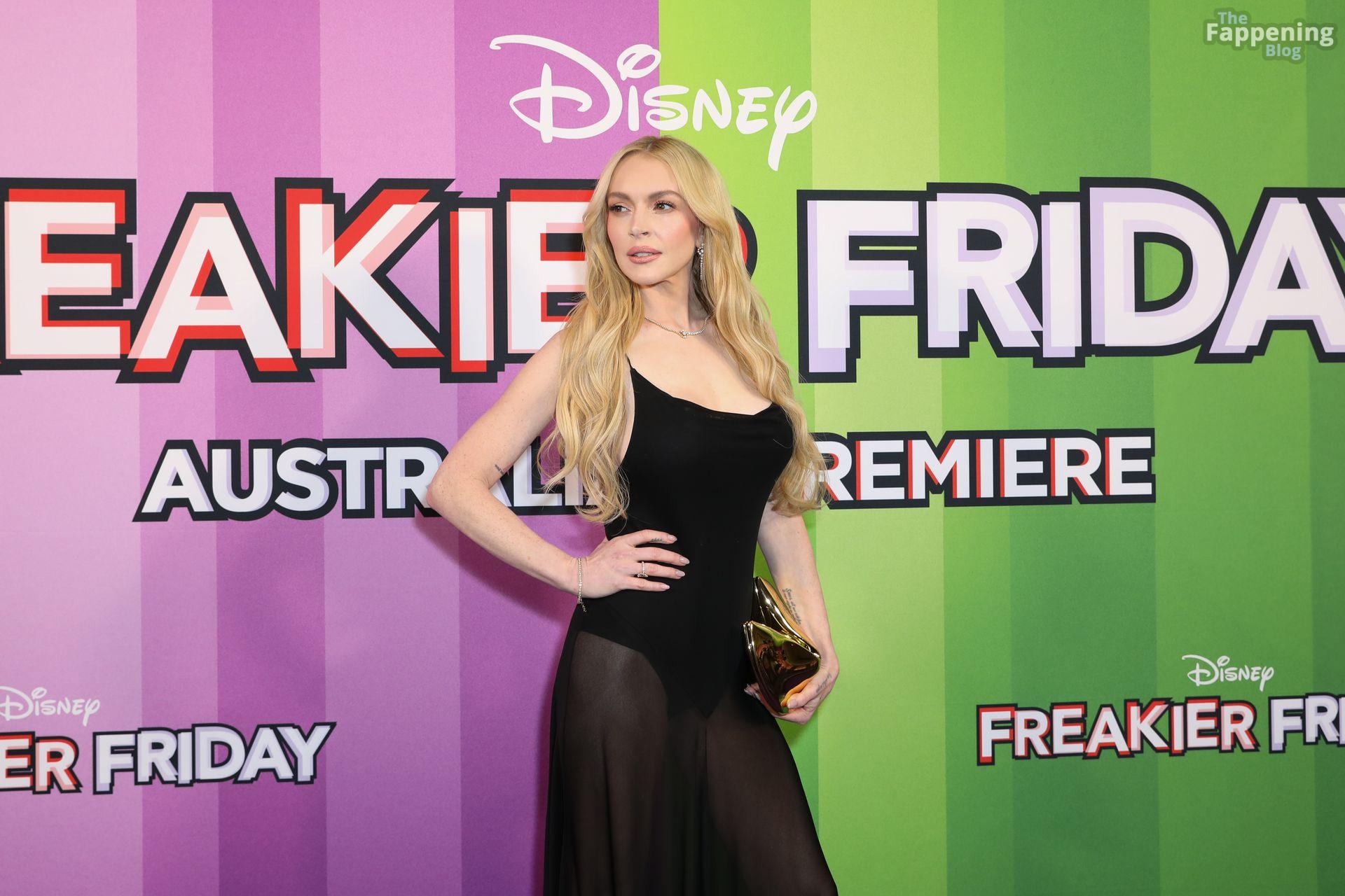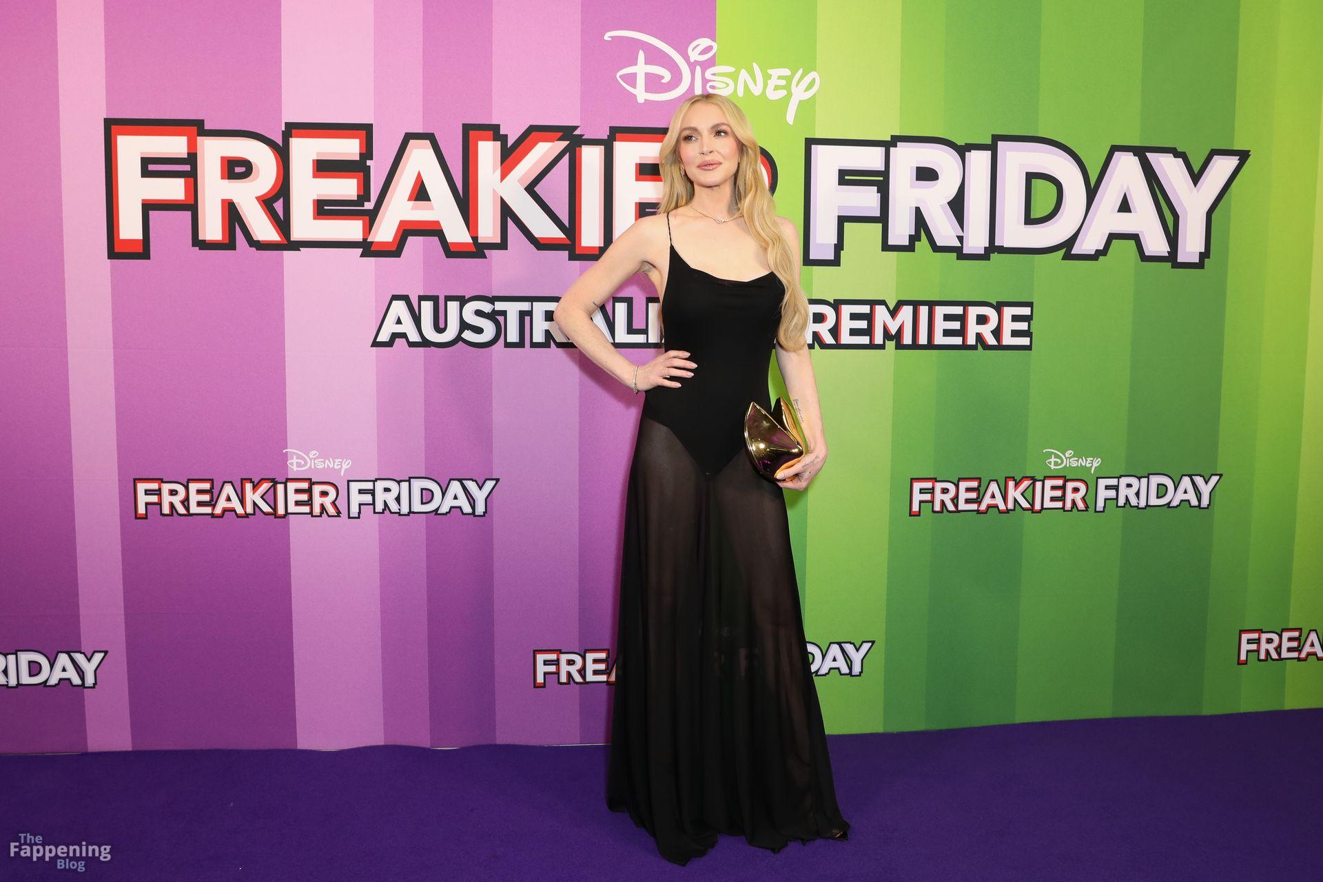 Lindsay Lohan affiche sa nouvelle silhouette élancée à la première de “Freakier Friday” à Sydney, en Australie, arborant une robe noire transparente.