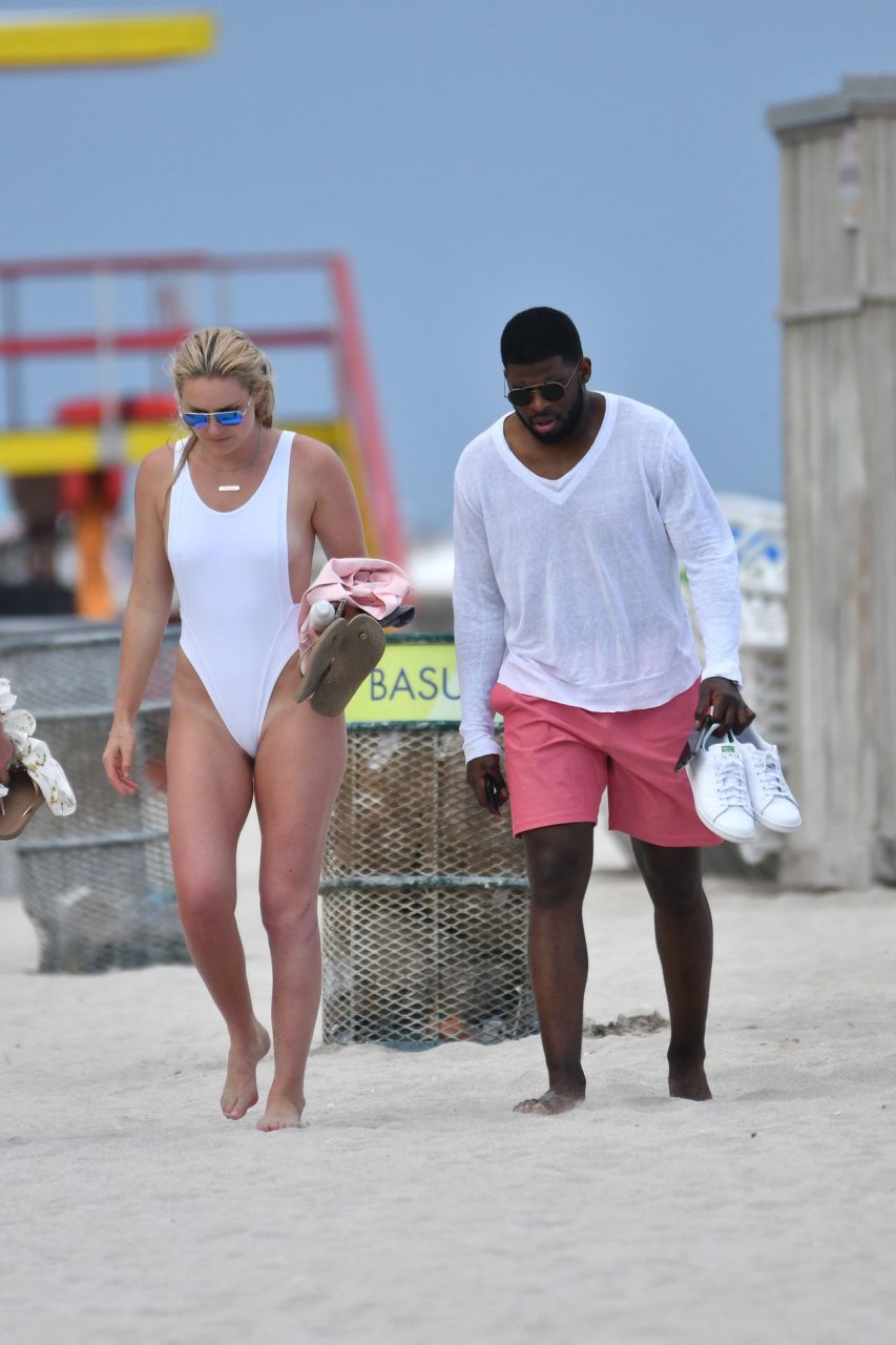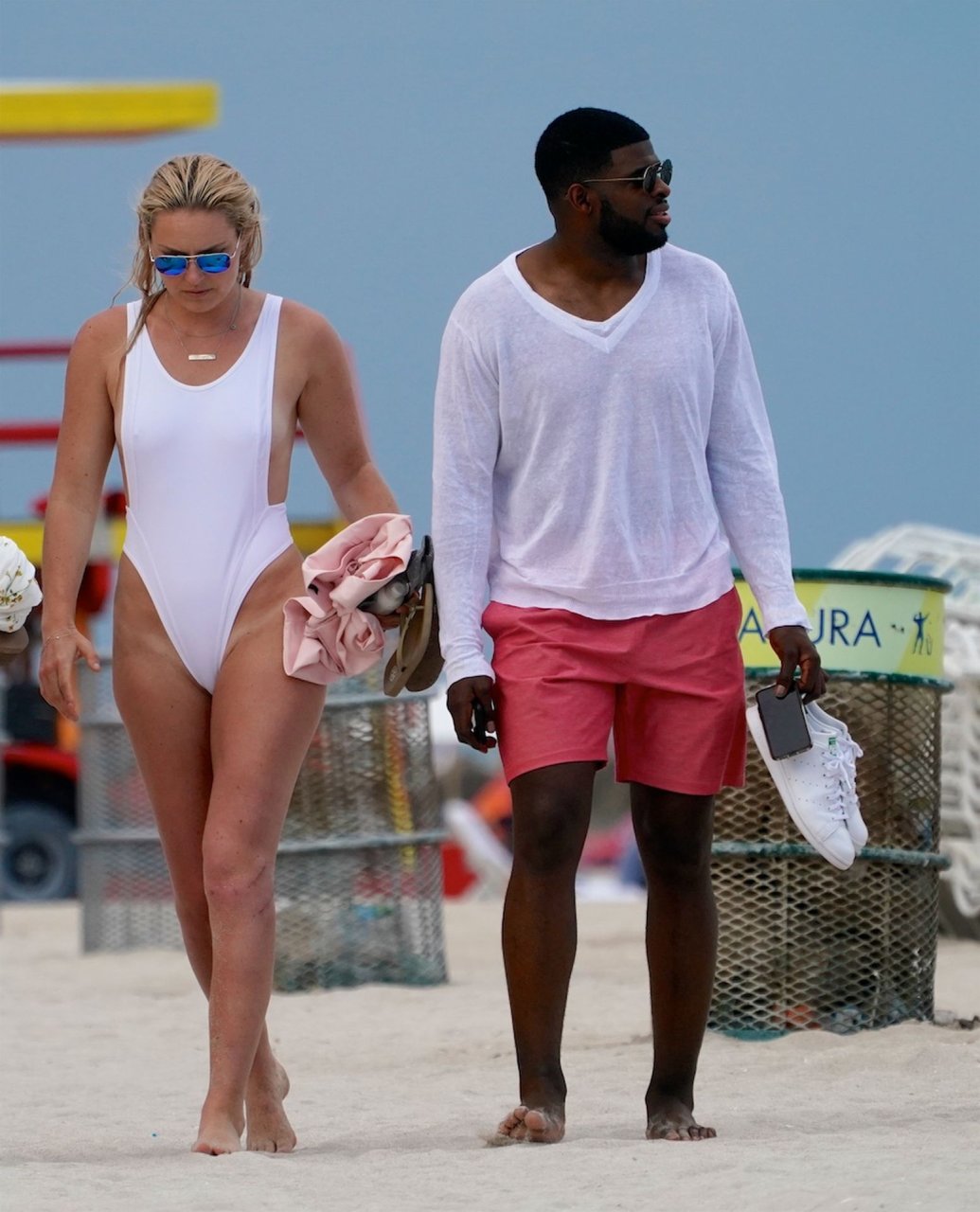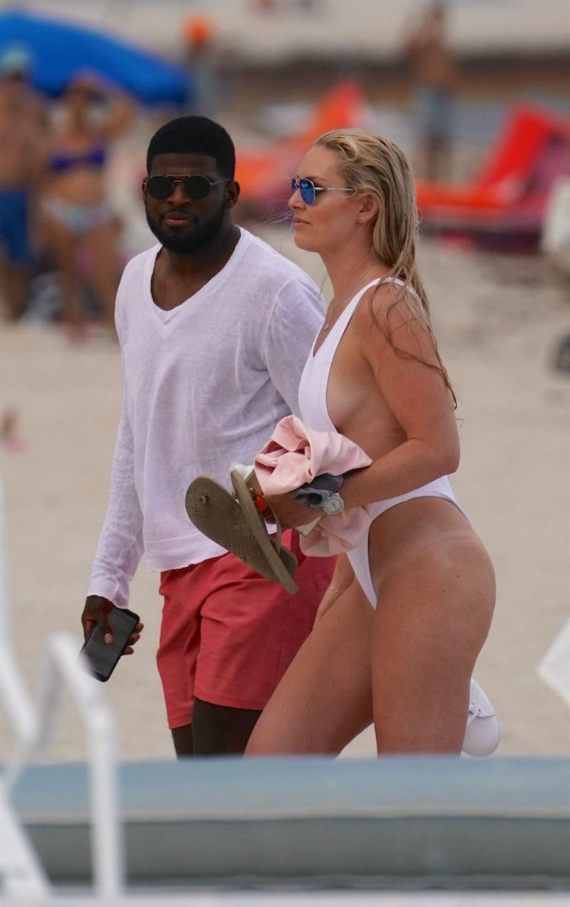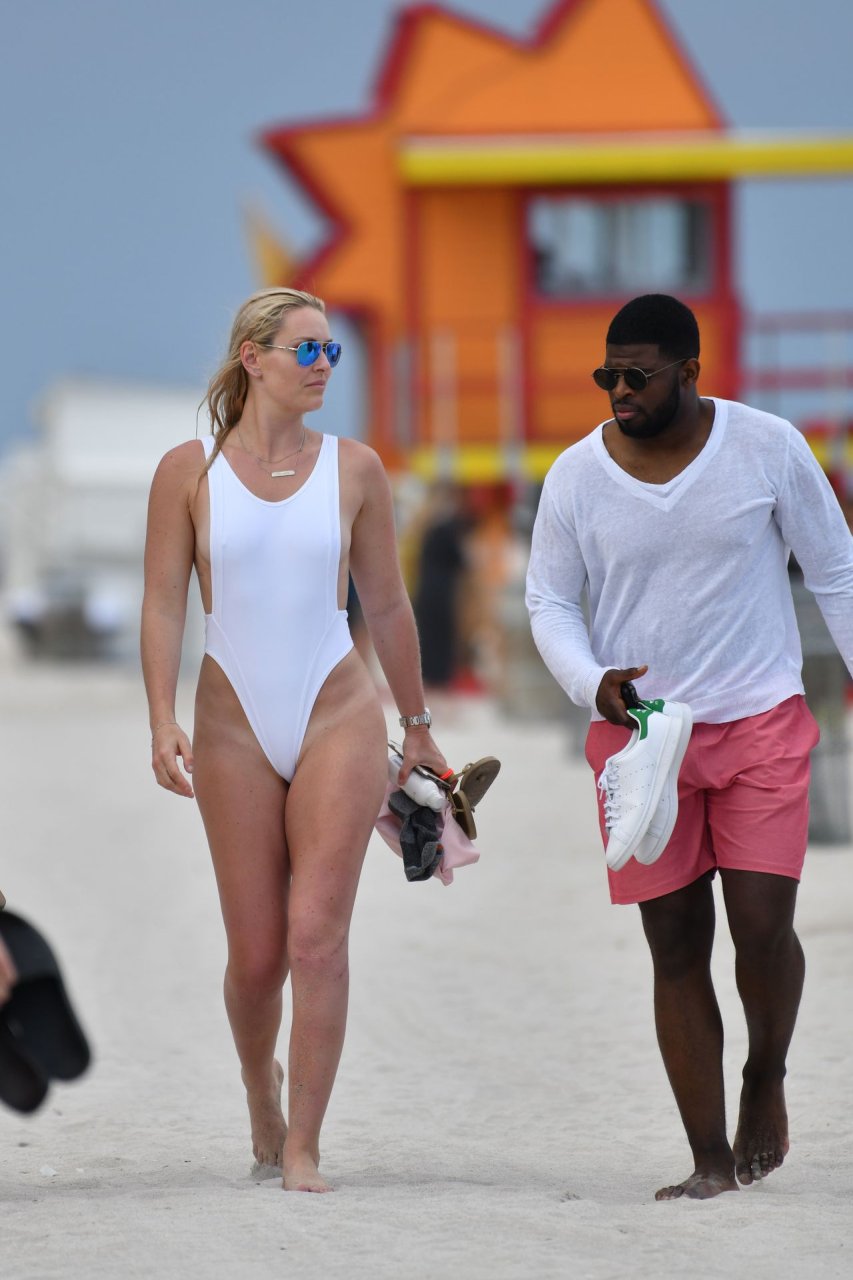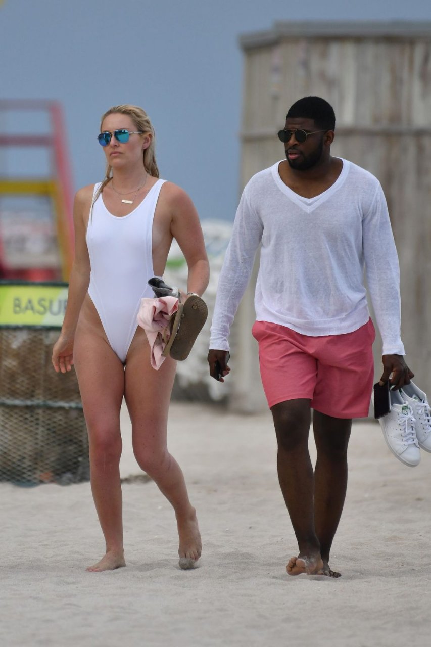 Lindsey Vonn met en valeur sa silhouette athlétique dans un très sexy maillot de bain une pièce blanc alors qu’elle se promène avec son petit ami P.K. Subban et un ami sur la plage de Miami, 05/04/2019.