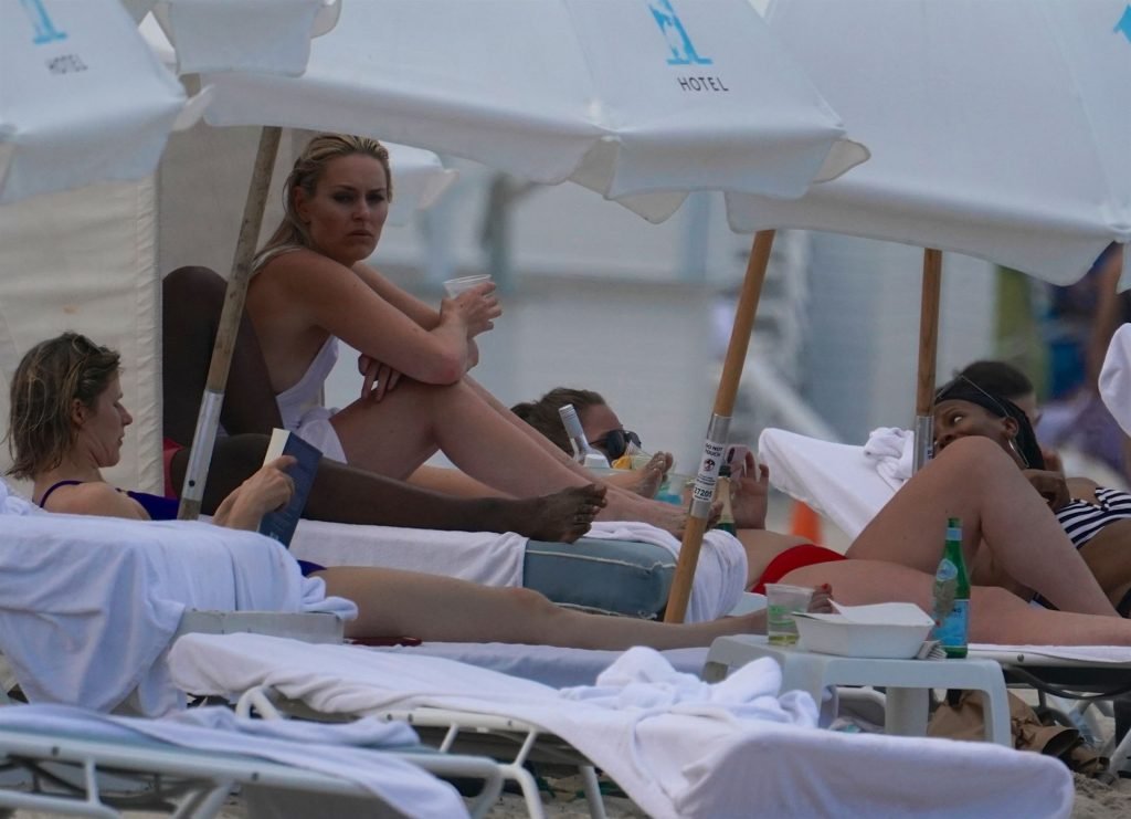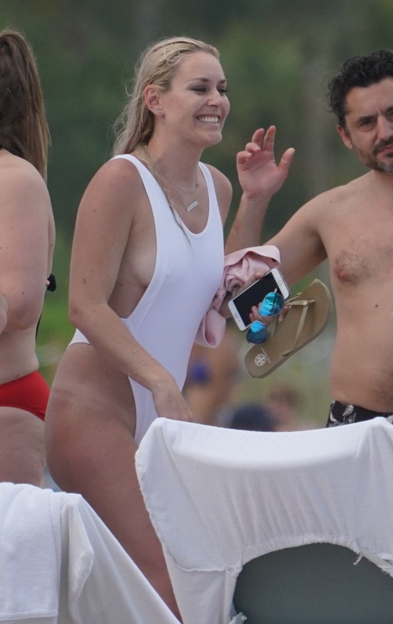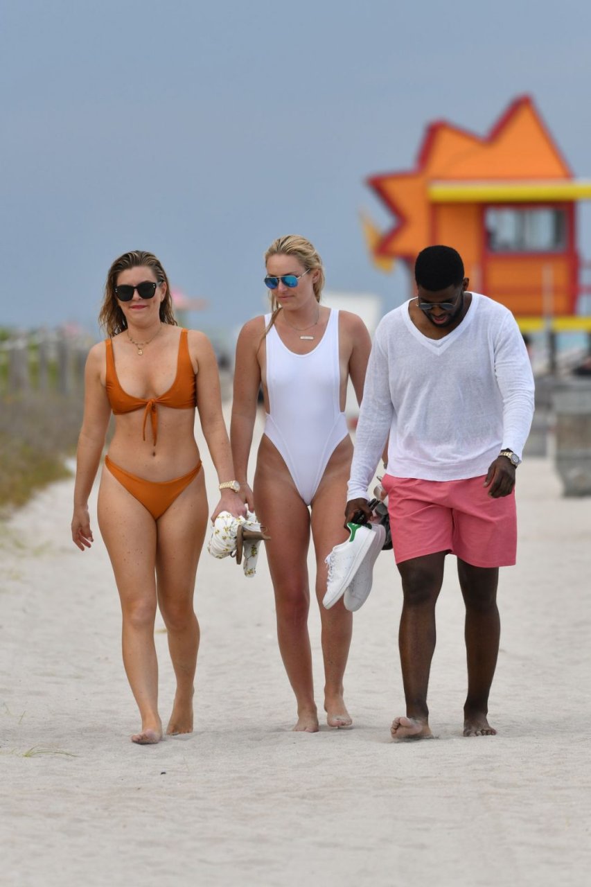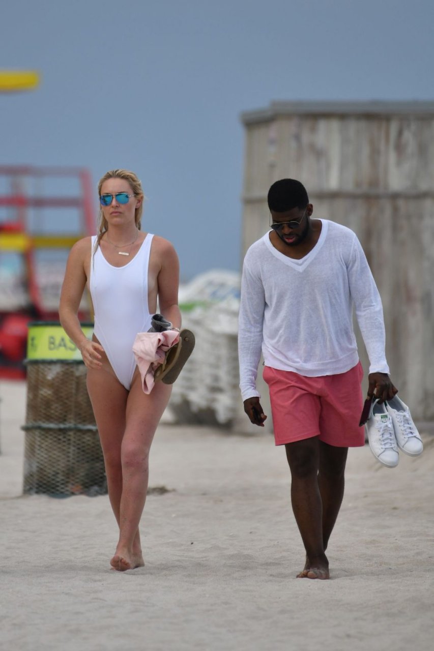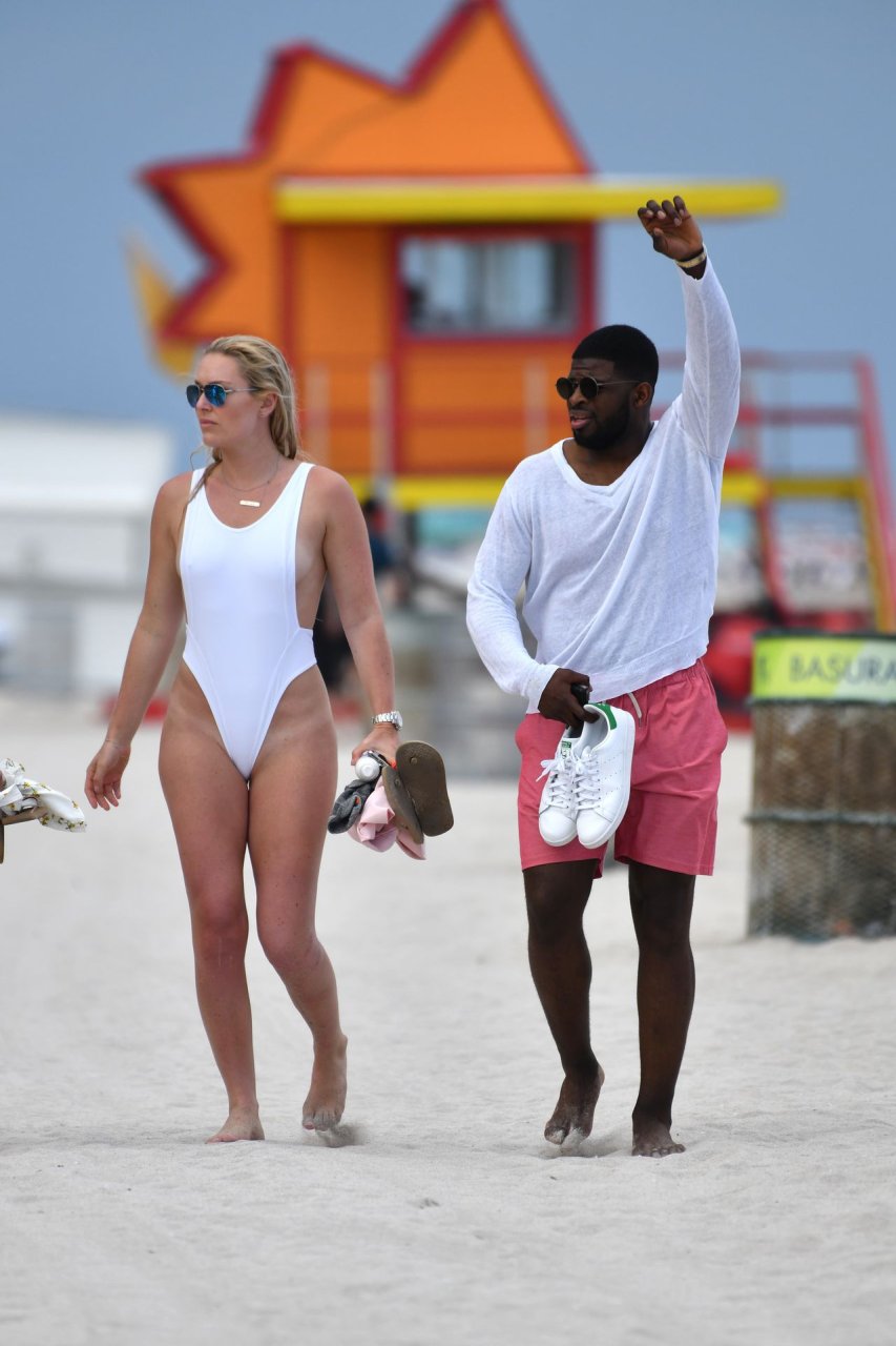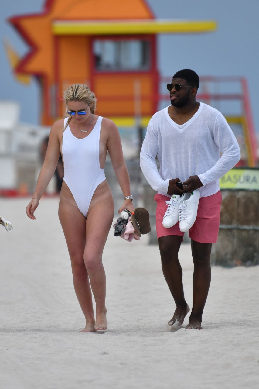 Lindsey Vonn met en valeur sa silhouette athlétique dans un très sexy maillot de bain une pièce blanc alors qu’elle se promène avec son petit ami P.K. Subban et un ami sur la plage de Miami, 05/04/2019.
