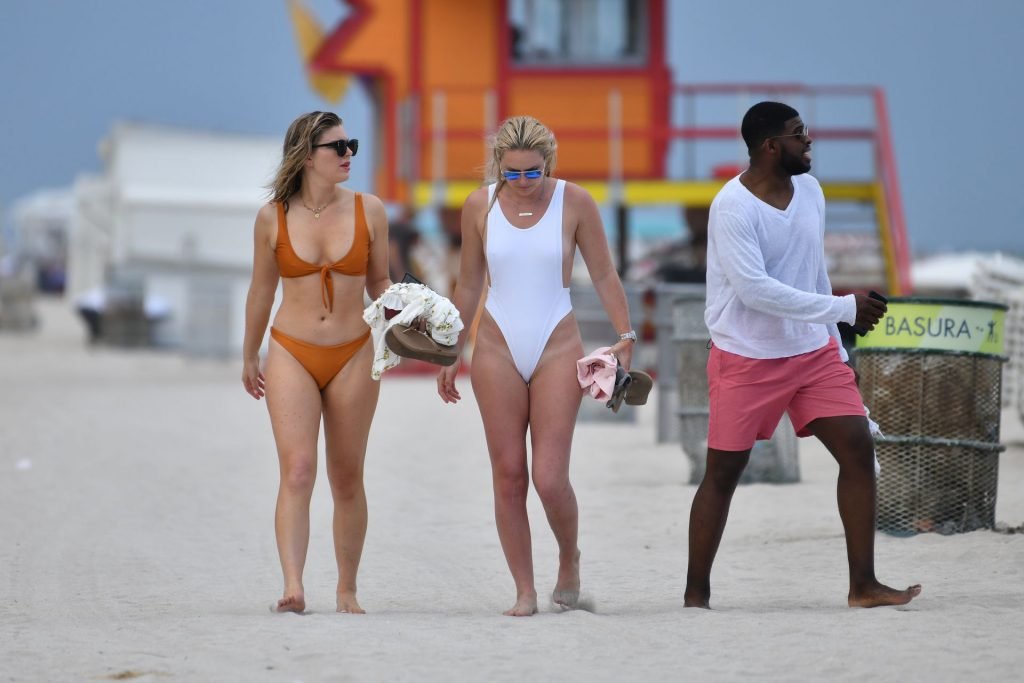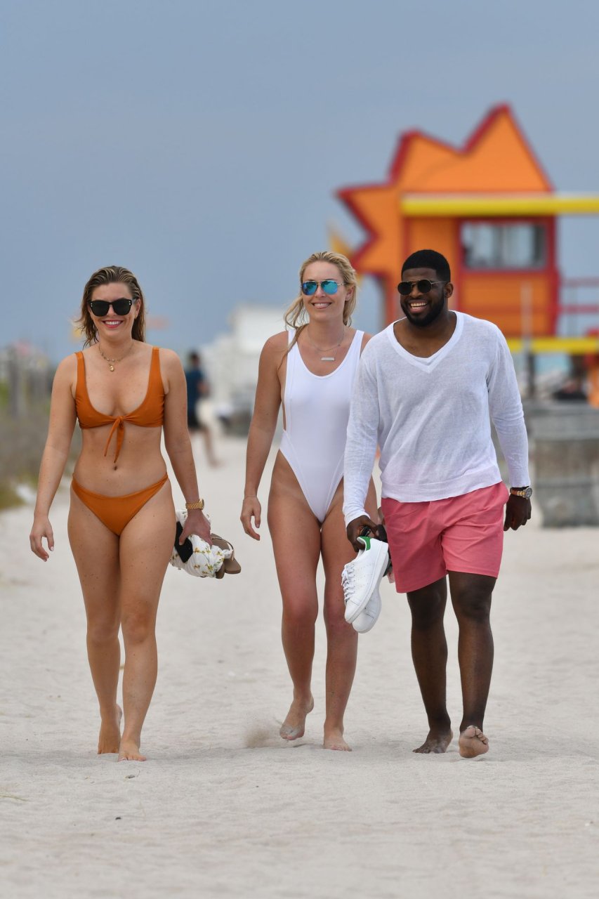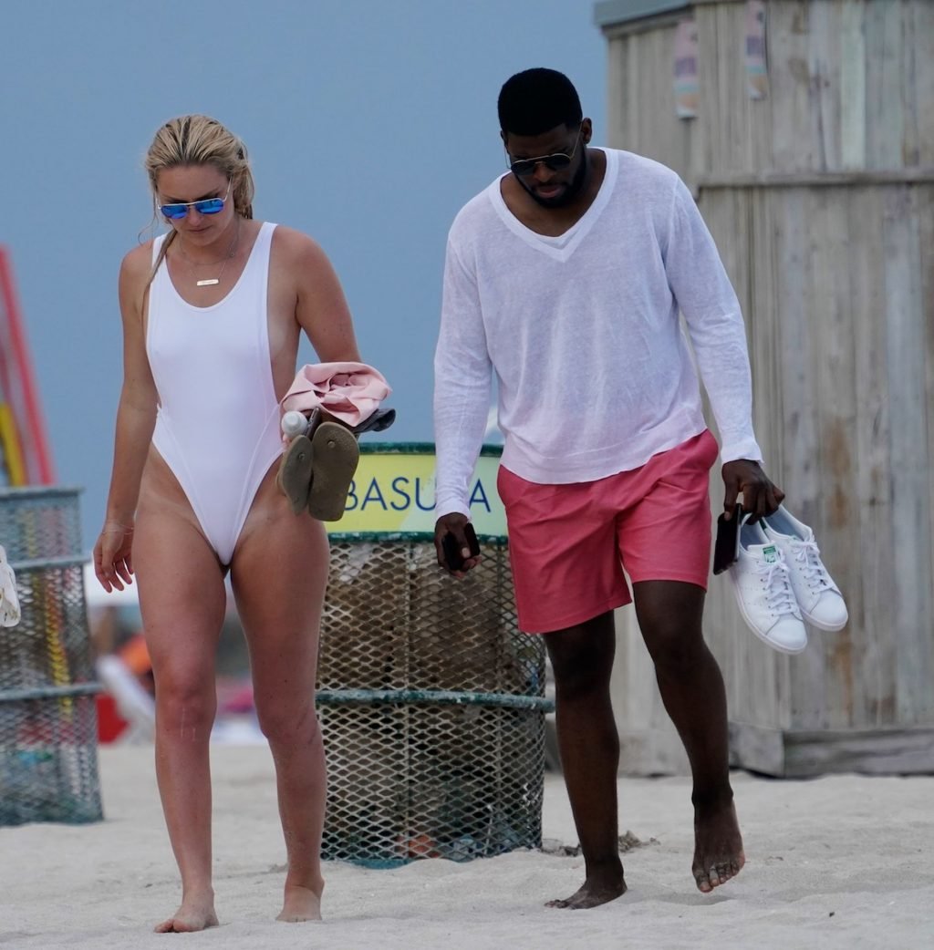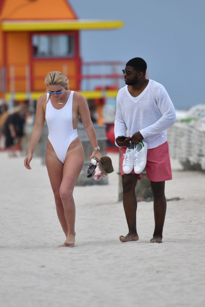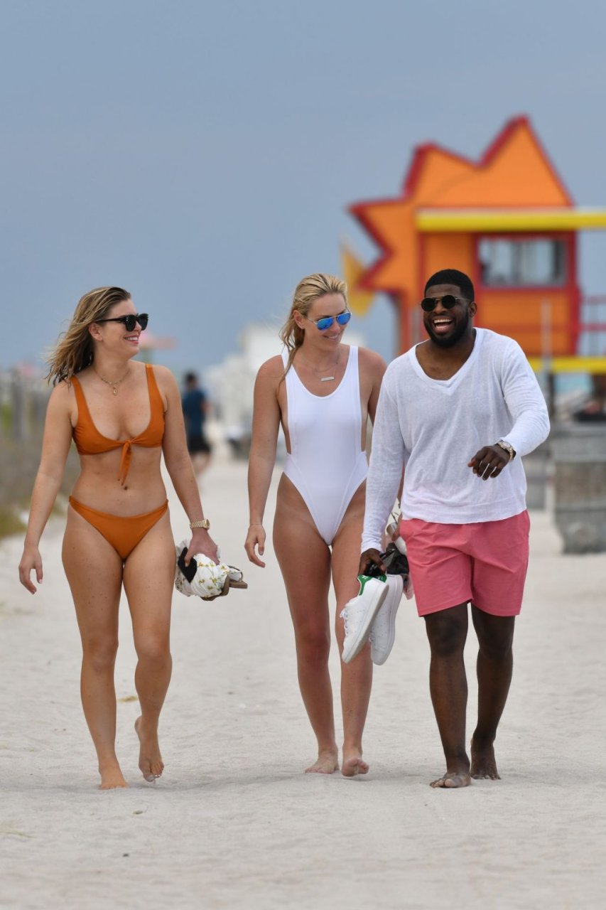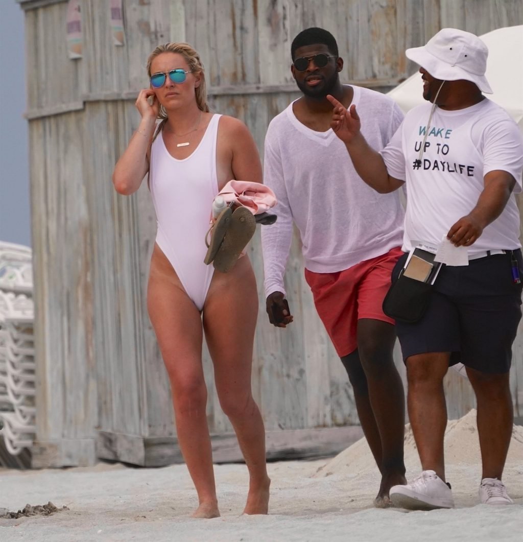 Lindsey Vonn met en valeur sa silhouette athlétique dans un très sexy maillot de bain une pièce blanc alors qu’elle se promène avec son petit ami P.K. Subban et un ami sur la plage de Miami, 05/04/2019.