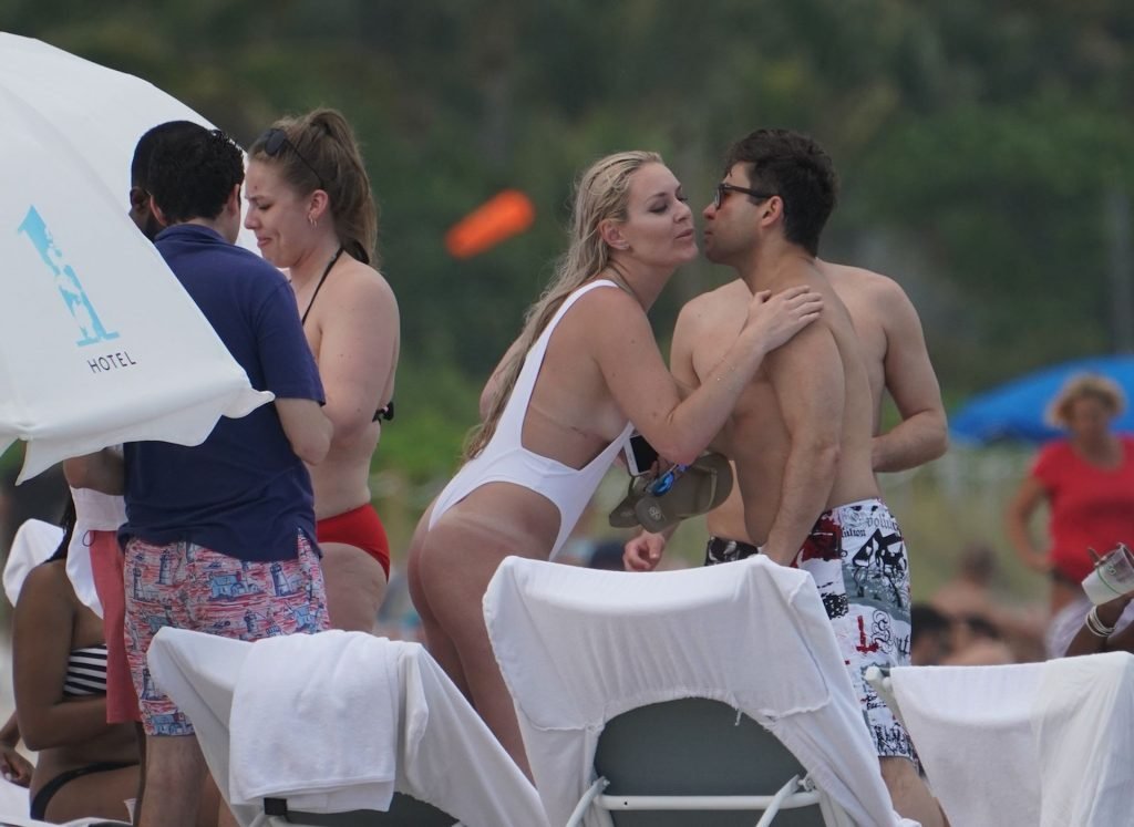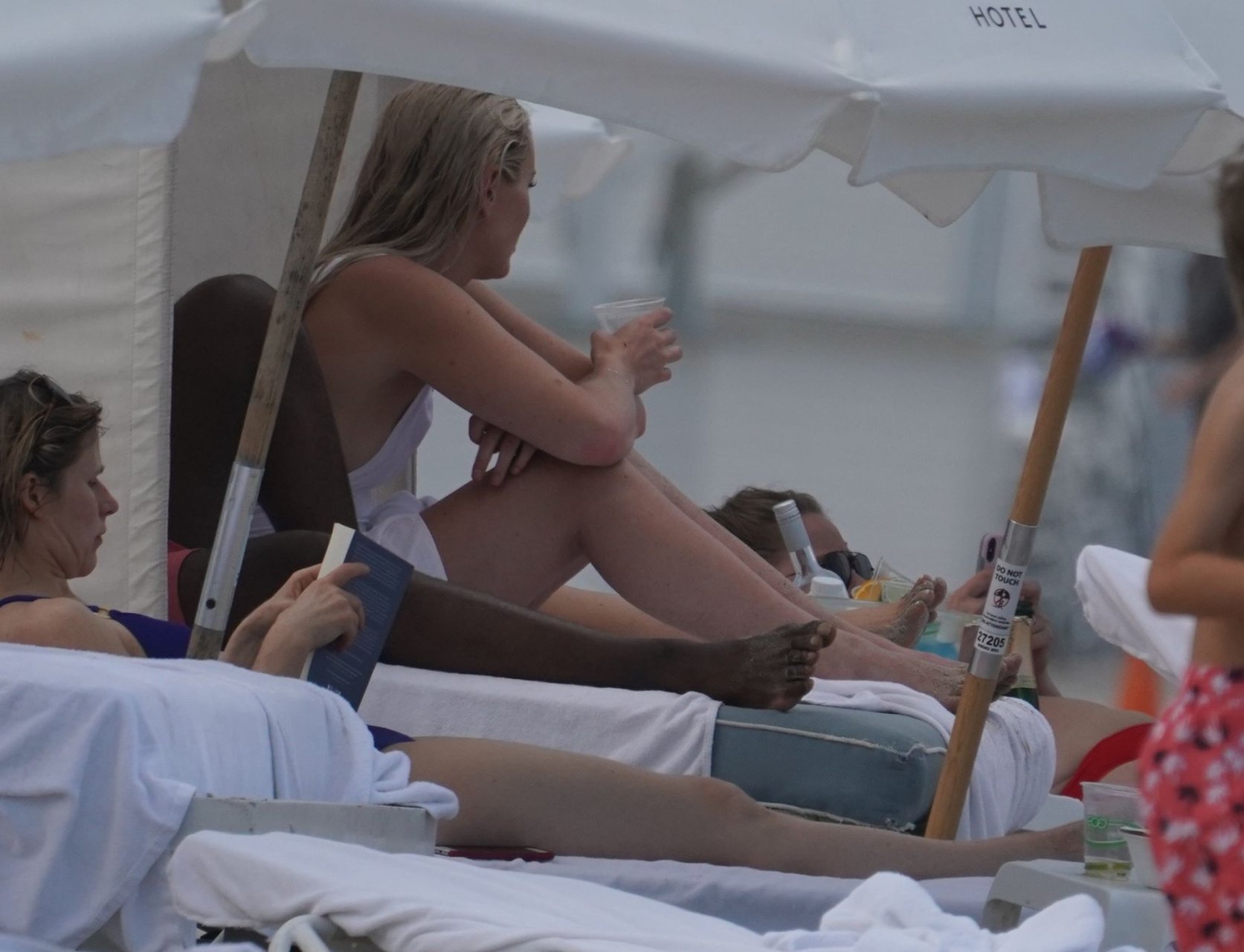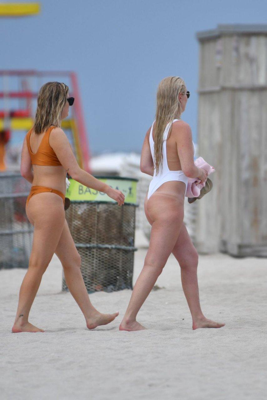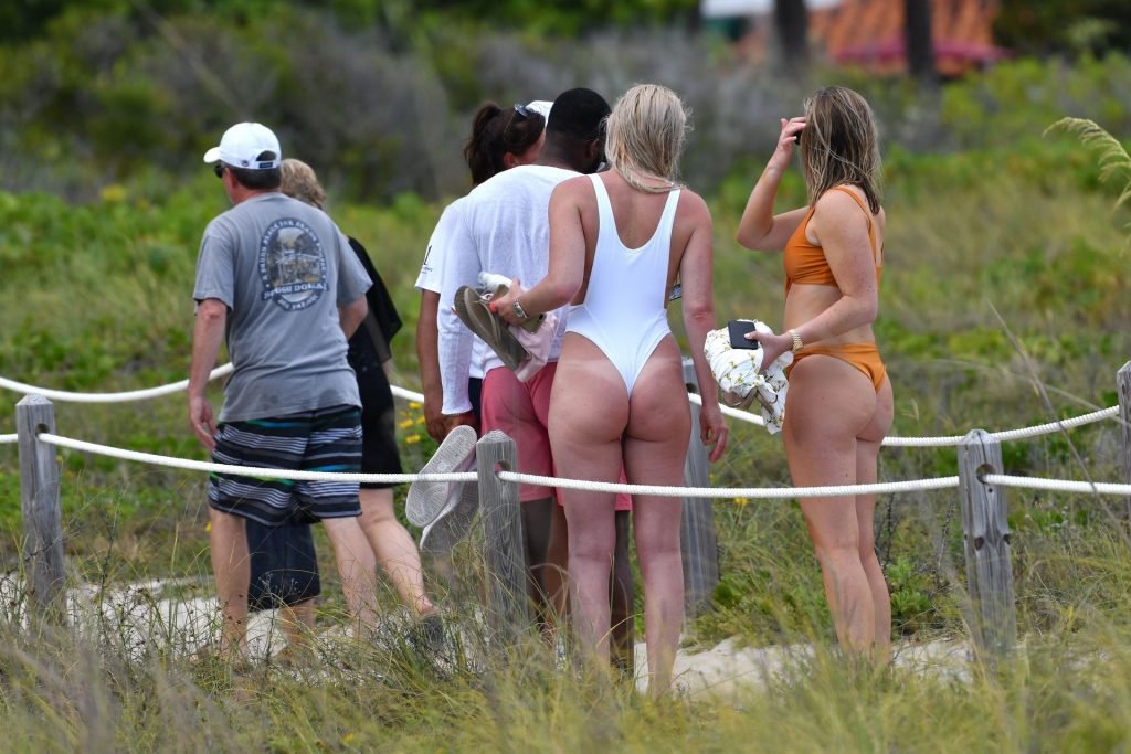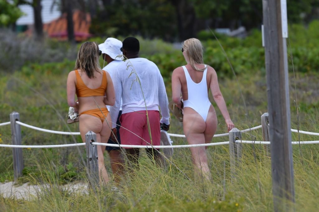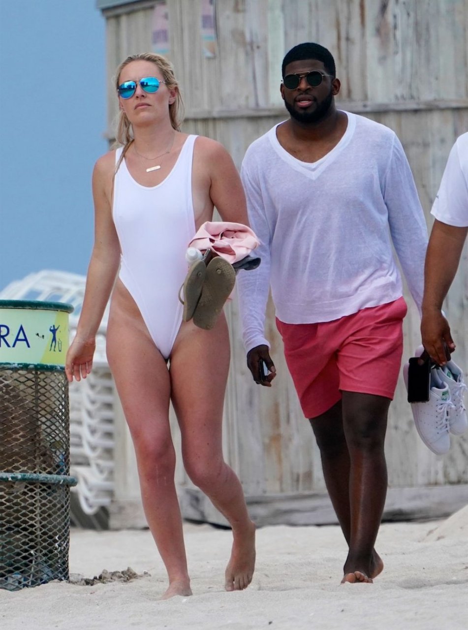 Lindsey Vonn met en valeur sa silhouette athlétique dans un très sexy maillot de bain une pièce blanc alors qu’elle se promène avec son petit ami P.K. Subban et un ami sur la plage de Miami, 05/04/2019.