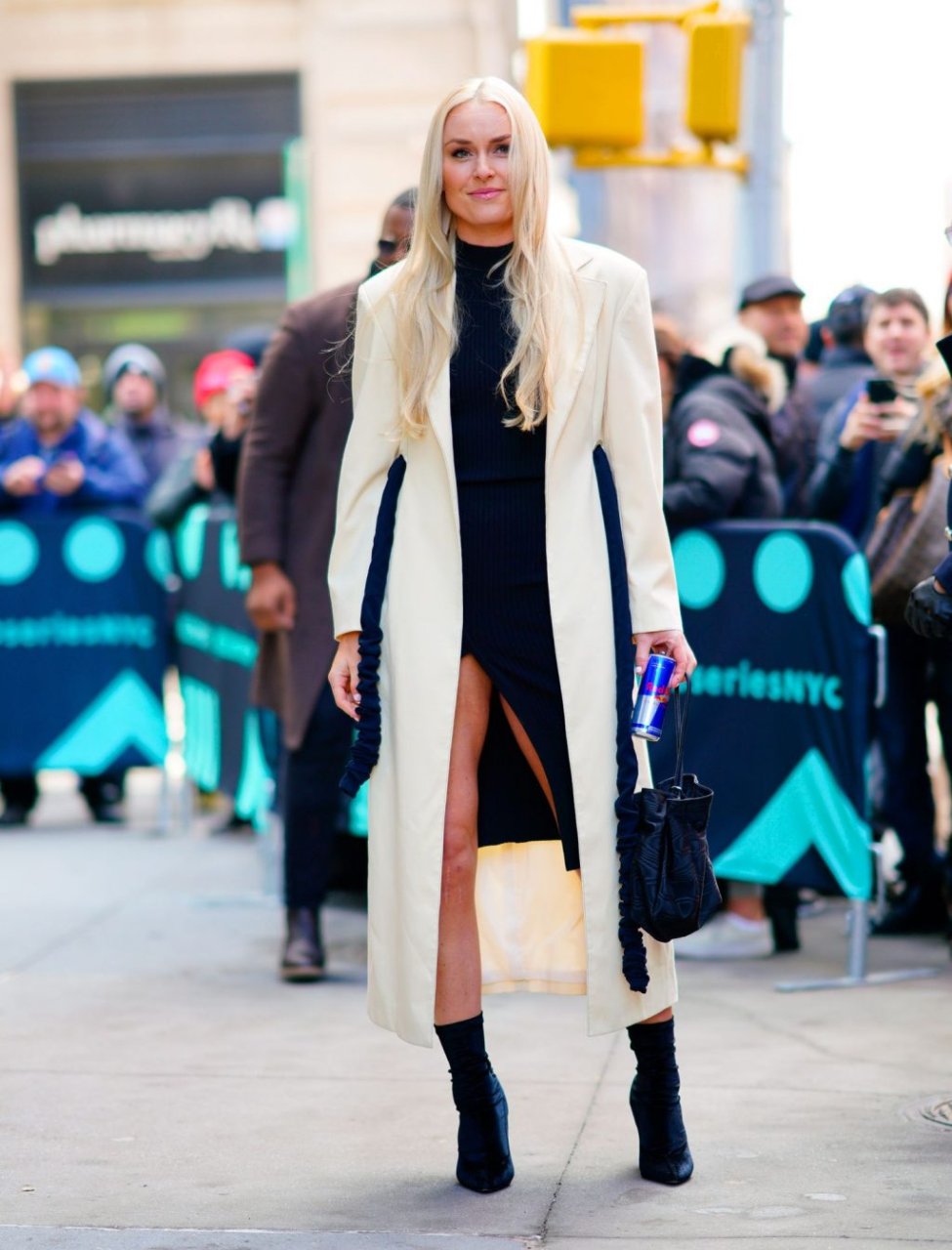 La skieuse olympique américaine Lindsey Vonn sort du studio AOL Build Series après être apparue dans l’émission, révélant ce qui semble être sa lingerie dans sa robe noire fendue à New York, le 21/02/2019.