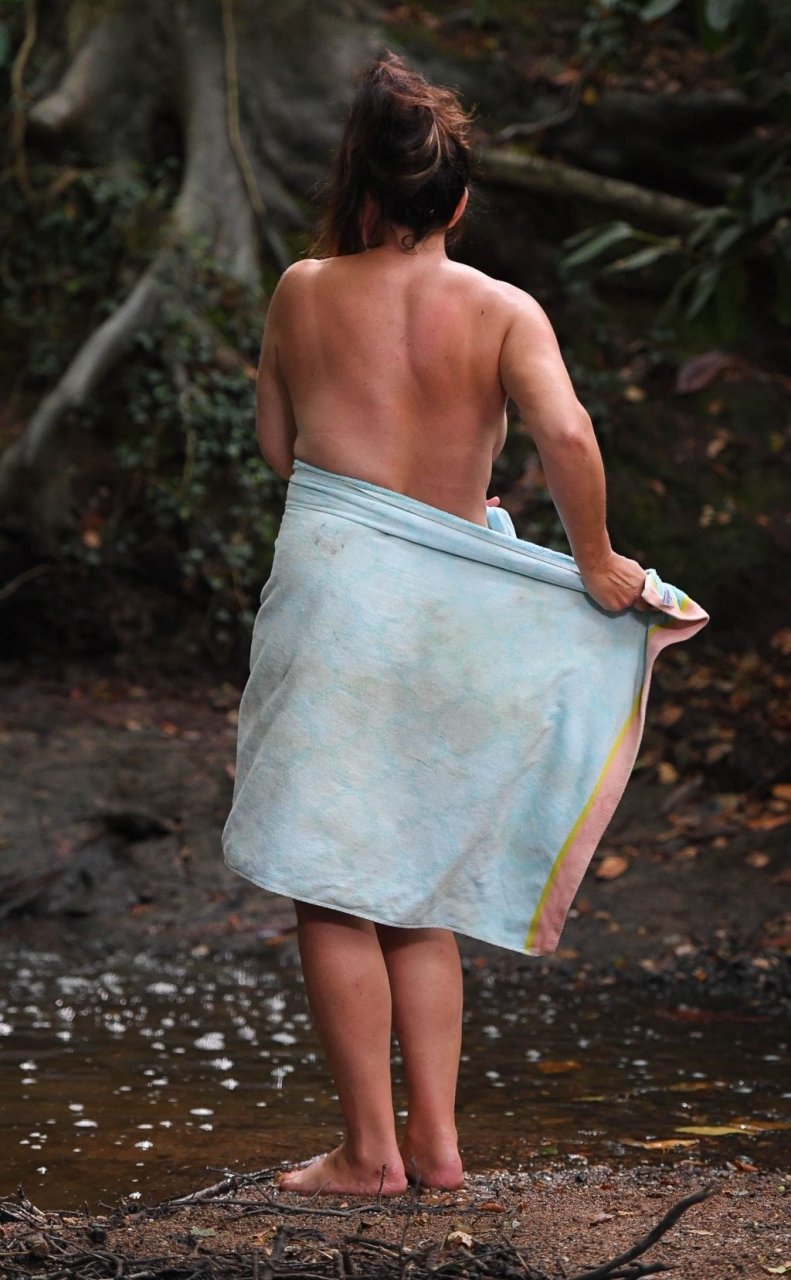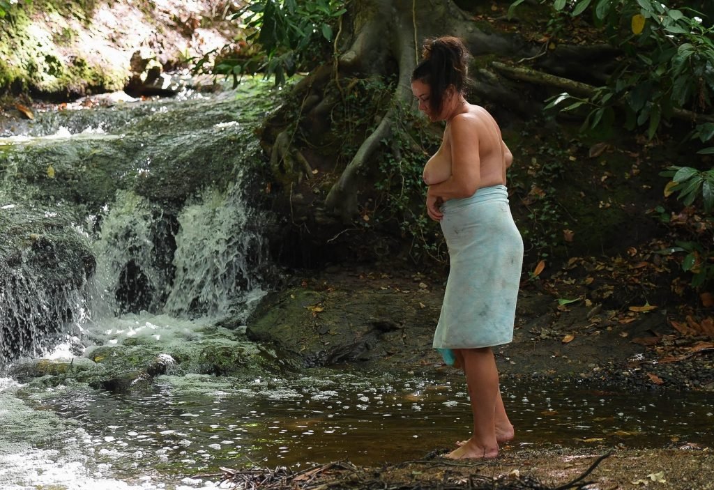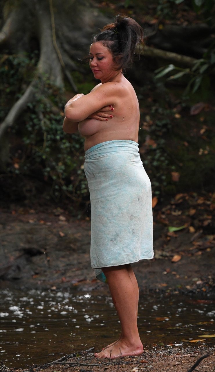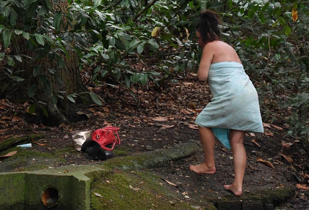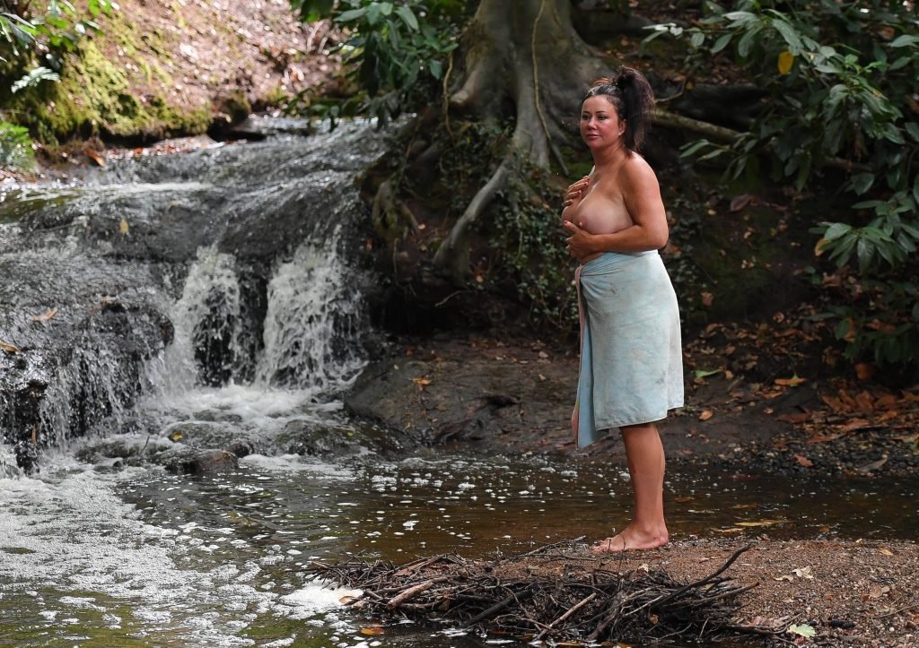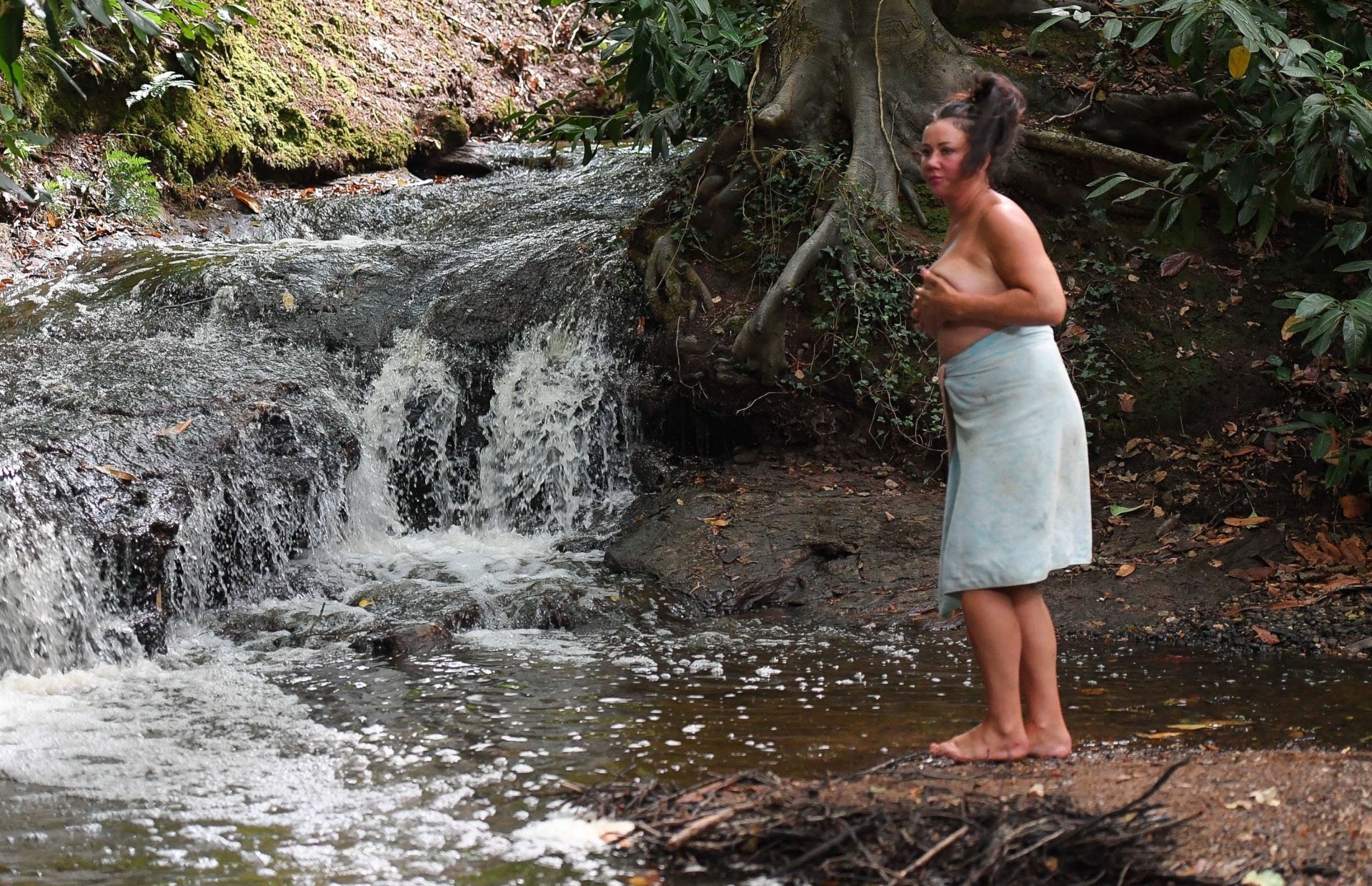 La personnalité de la télé-réalité Lisa Appleton (50 ans) se lavait dans un ruisseau à côté de sa cabane dans les arbres dans le Shropshire où elle vit désormais après avoir traversé des moments difficiles, 30/08/2018.