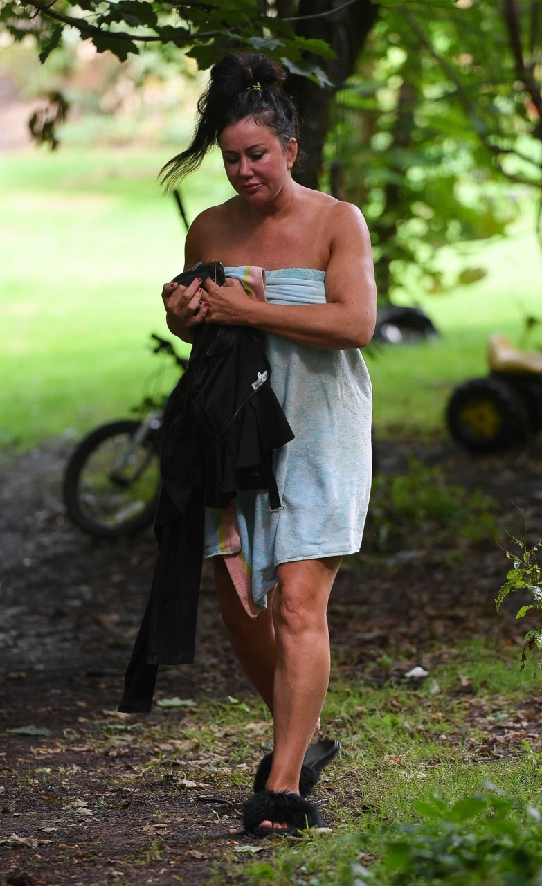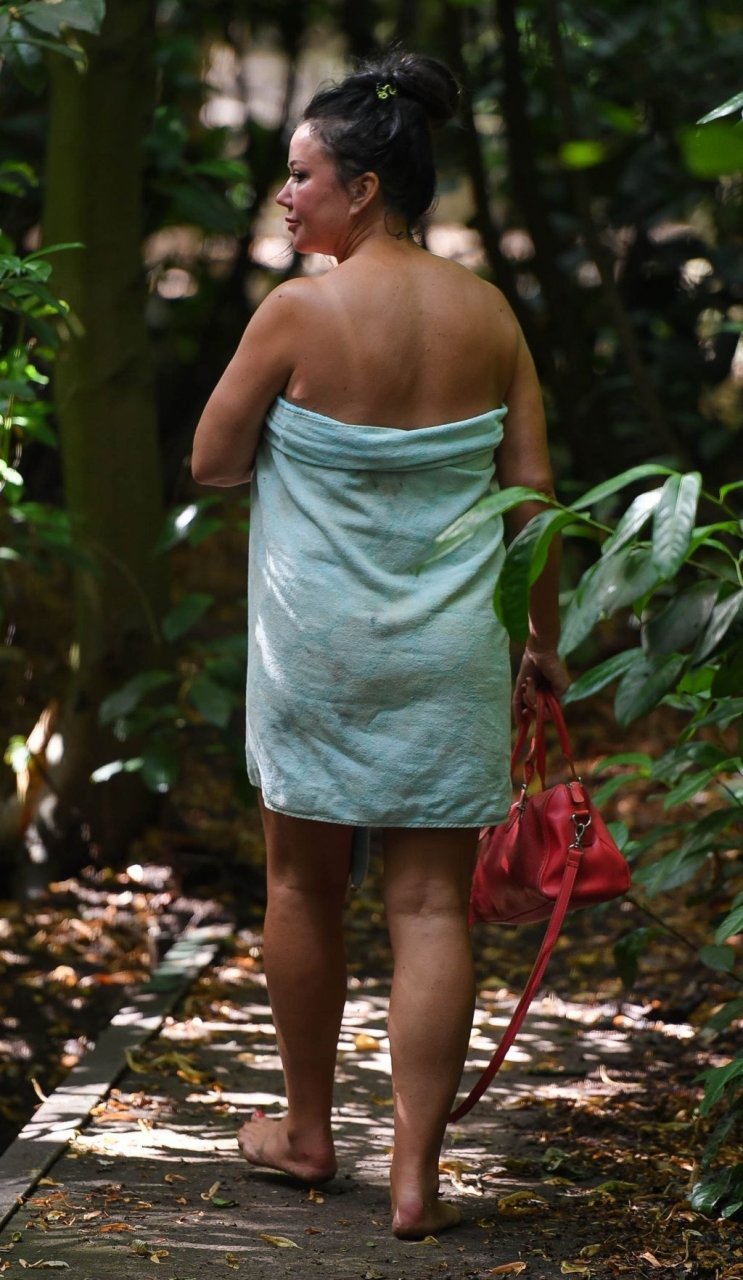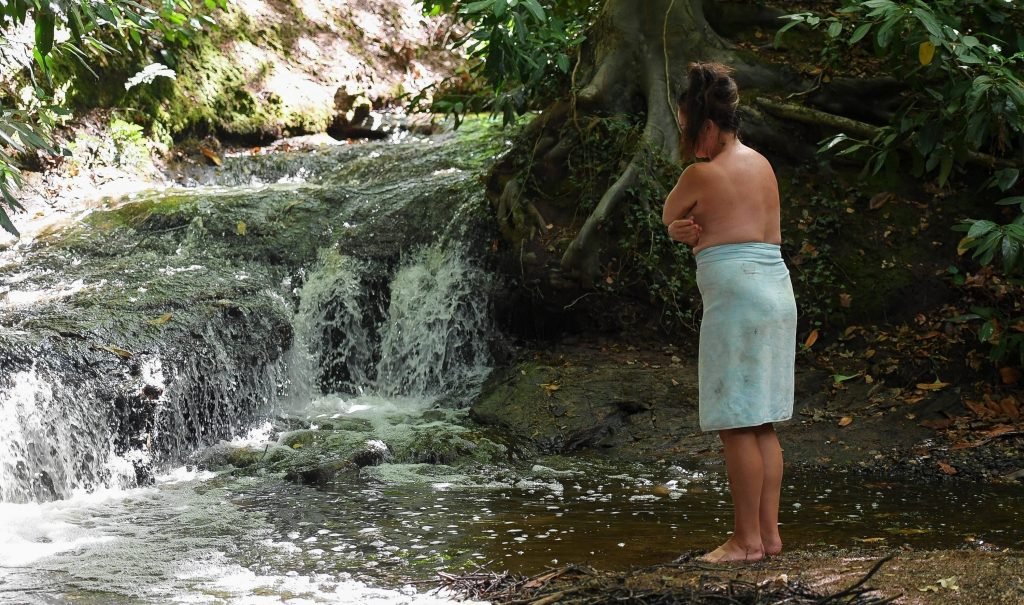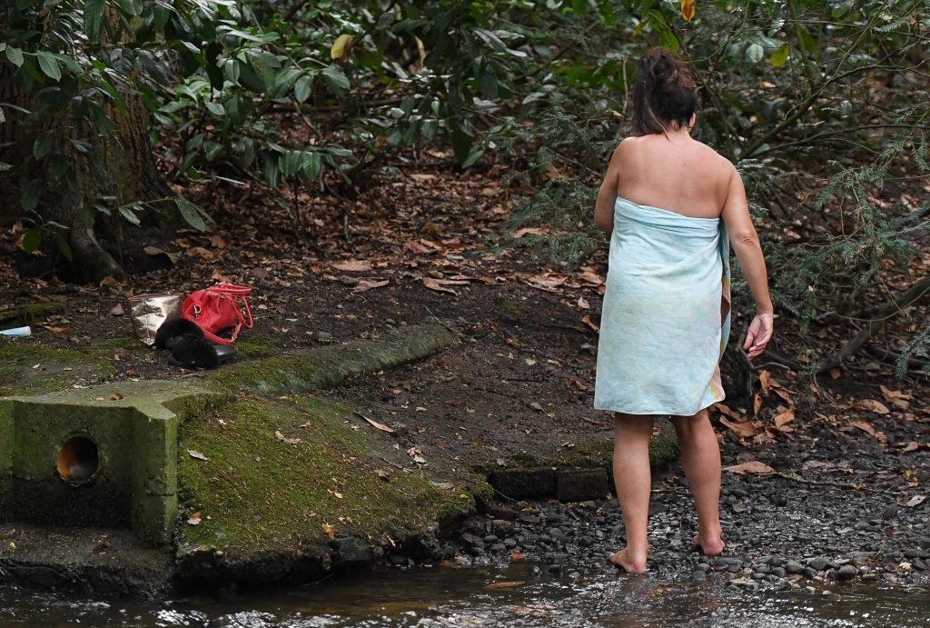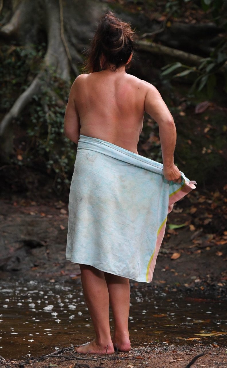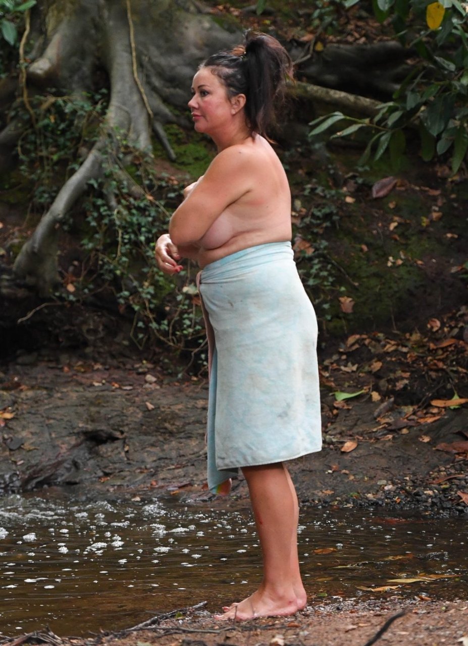 La personnalité de la télé-réalité Lisa Appleton (50 ans) se lavait dans un ruisseau à côté de sa cabane dans les arbres dans le Shropshire où elle vit désormais après avoir traversé des moments difficiles, 30/08/2018.