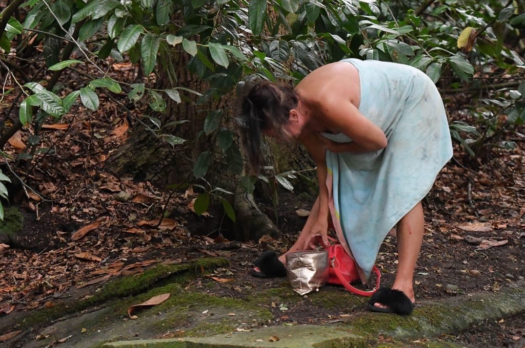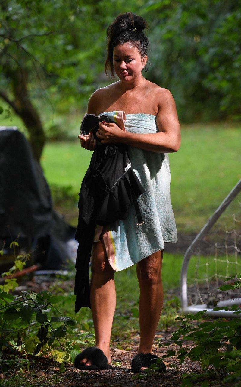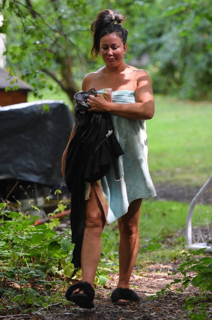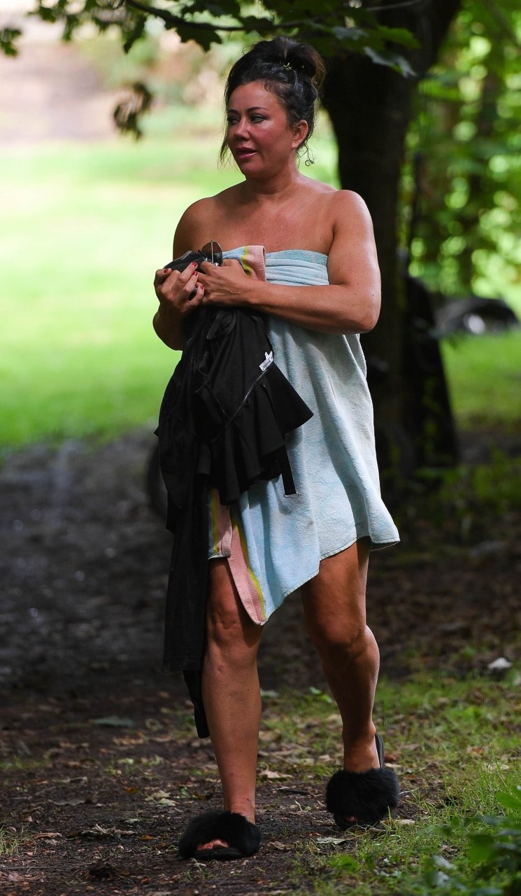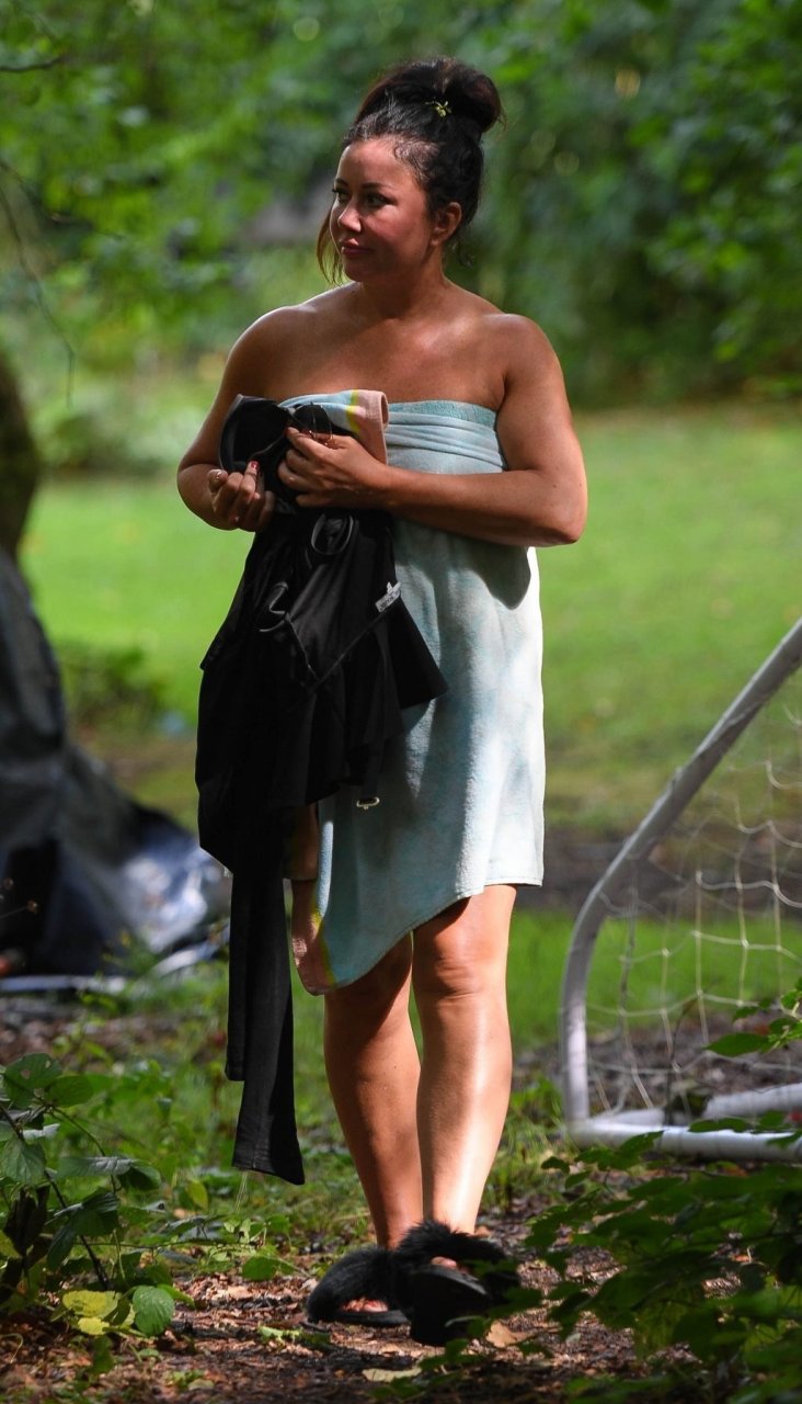 La personnalité de la télé-réalité Lisa Appleton (50 ans) se lavait dans un ruisseau à côté de sa cabane dans les arbres dans le Shropshire où elle vit désormais après avoir traversé des moments difficiles, 30/08/2018.