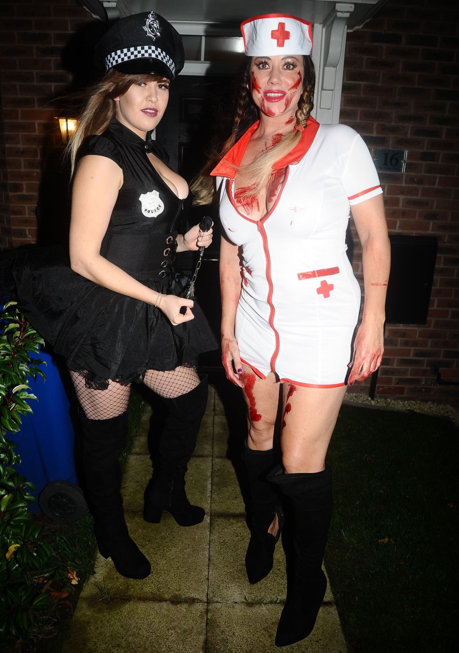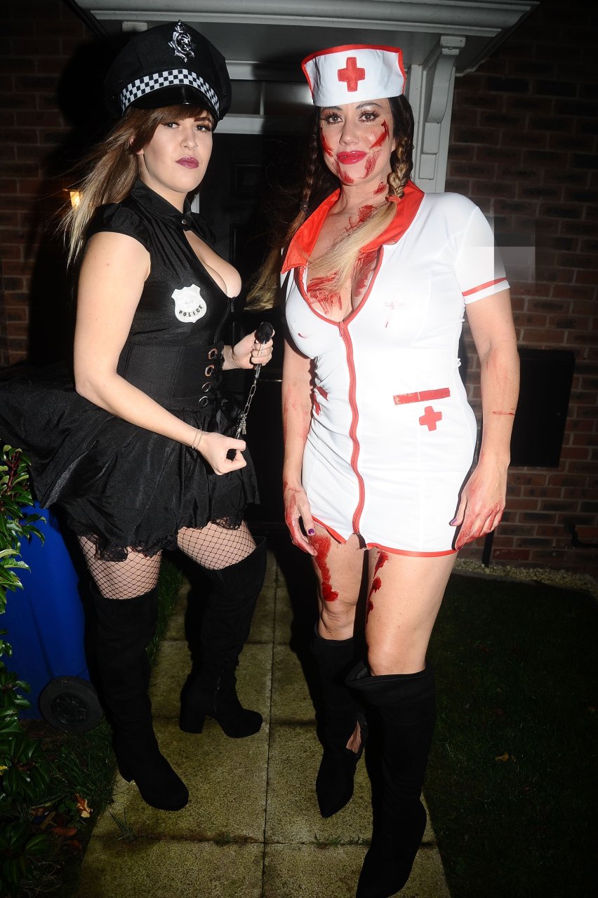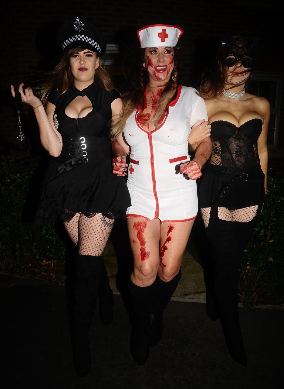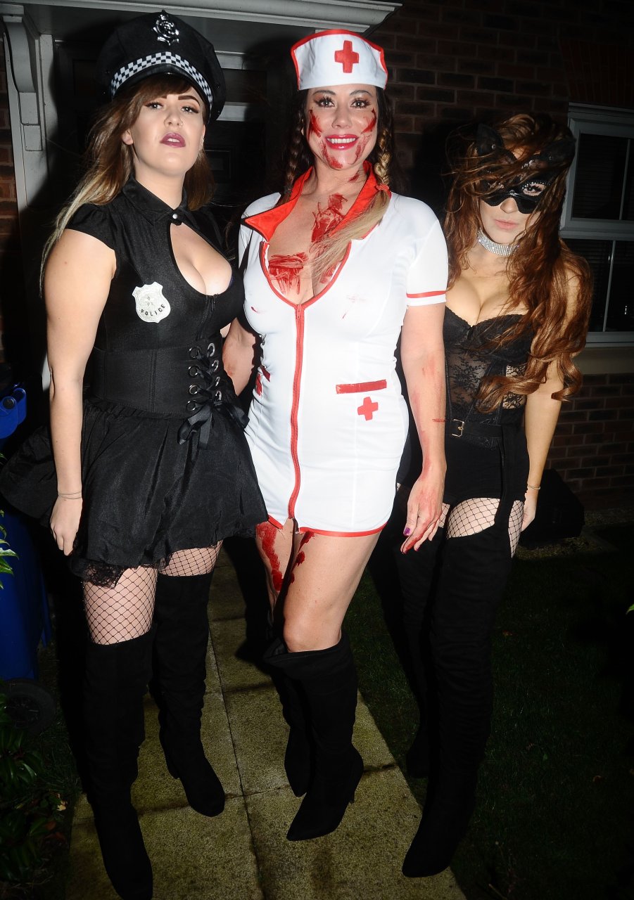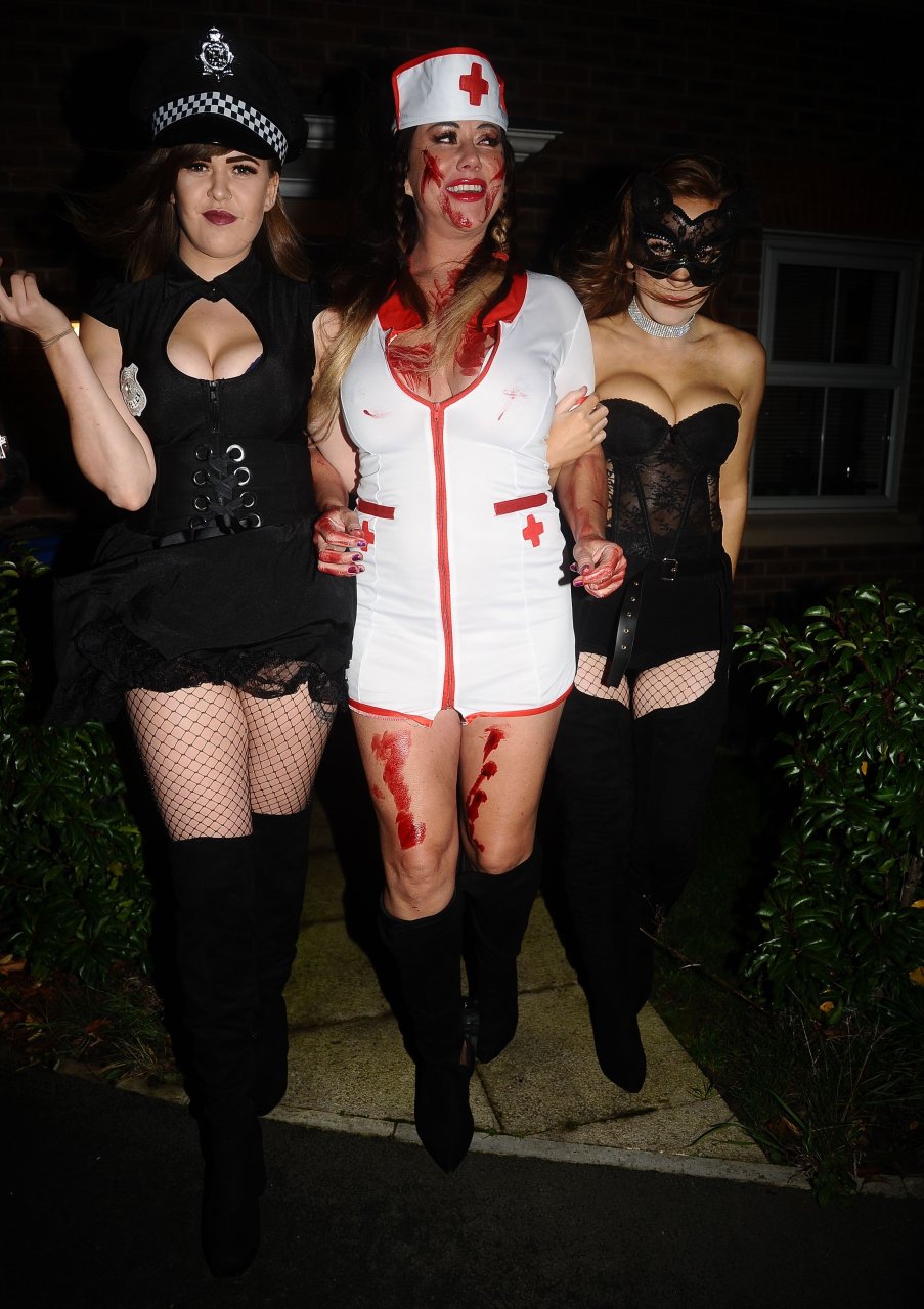 Lisa Appleton porte un costume d’infirmière ensanglanté et montre ses gros seins alors qu’elle assiste à une fête d’Halloween avec ses amies plantureuses à Manchester, le 28/10/2017. Lisa Appleton est une star britannique de la télé-réalité. Âge – 49 ans (23 mai 1968).