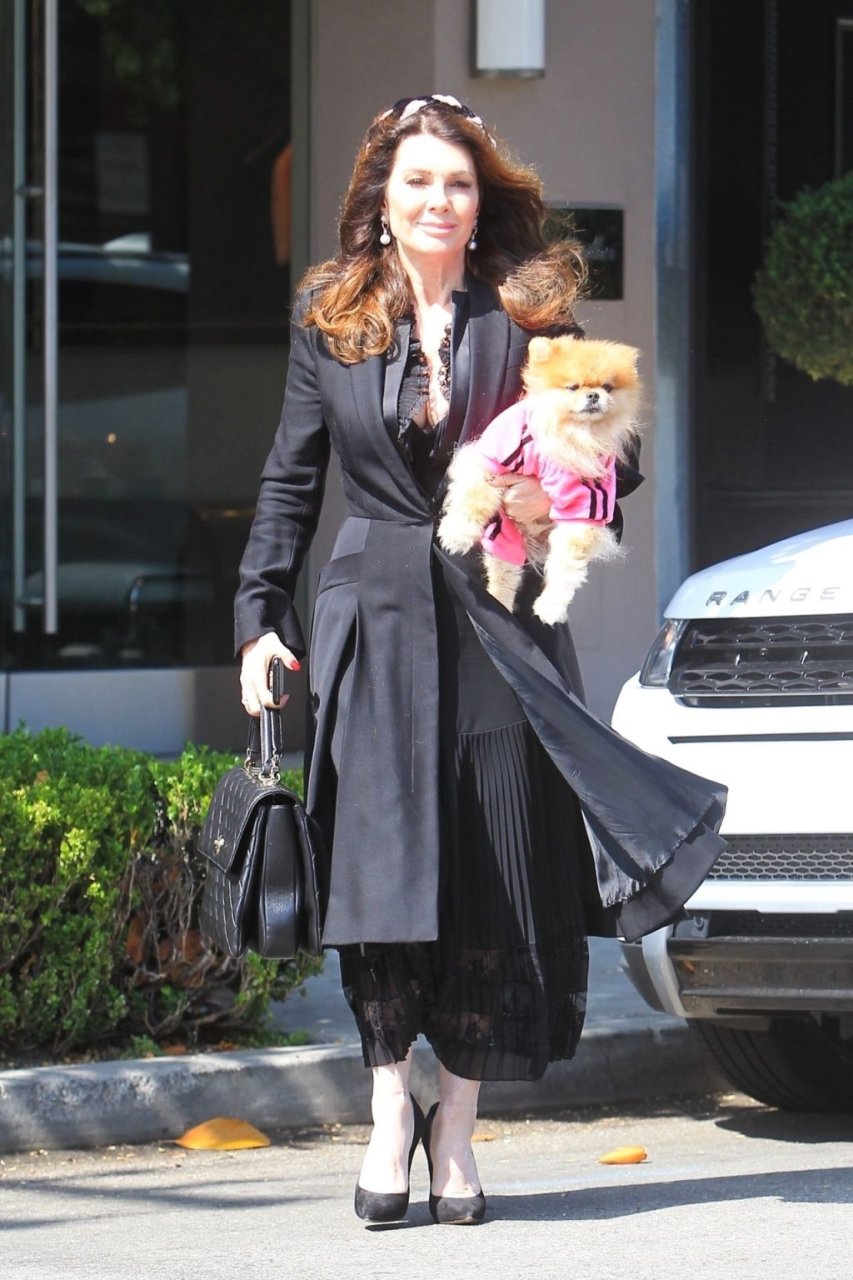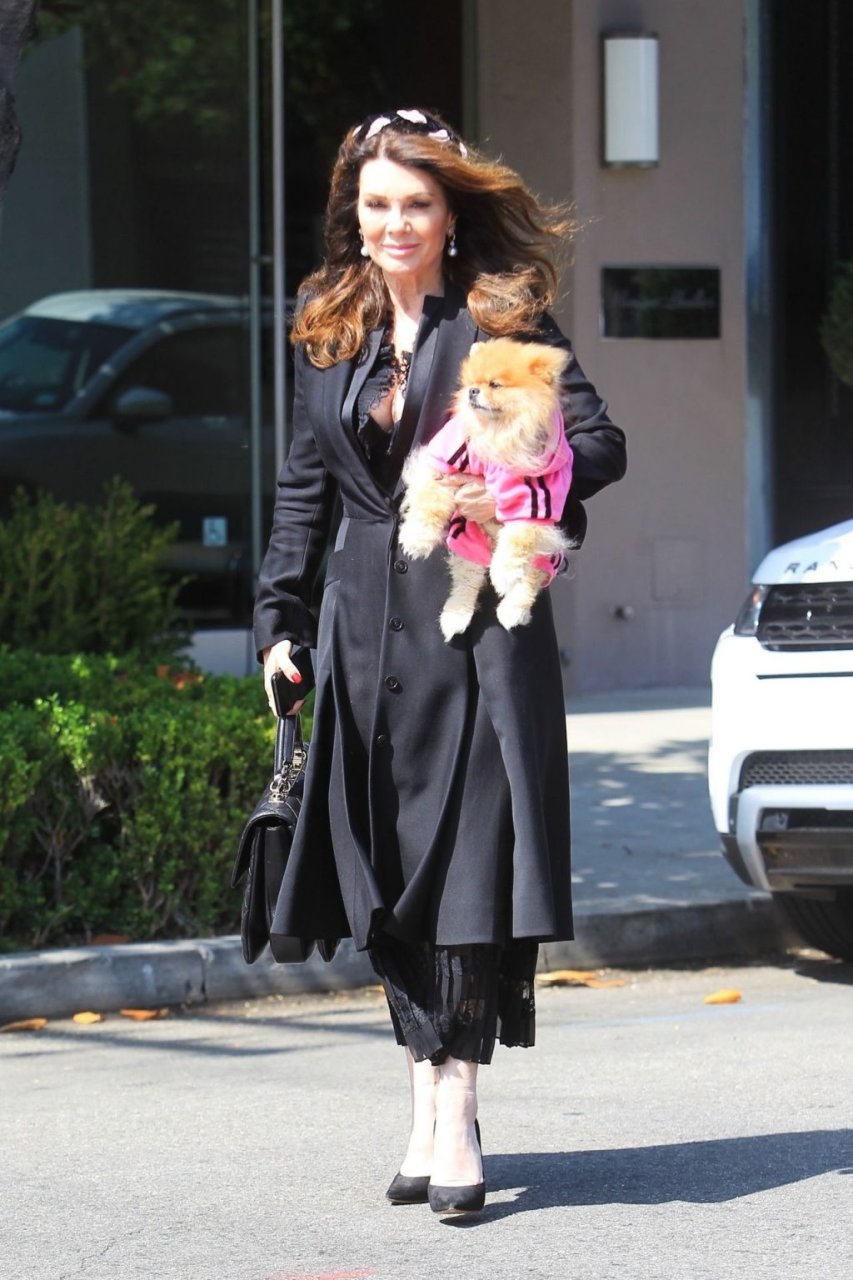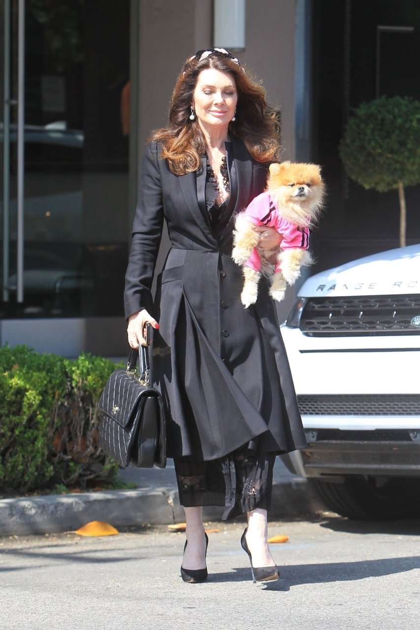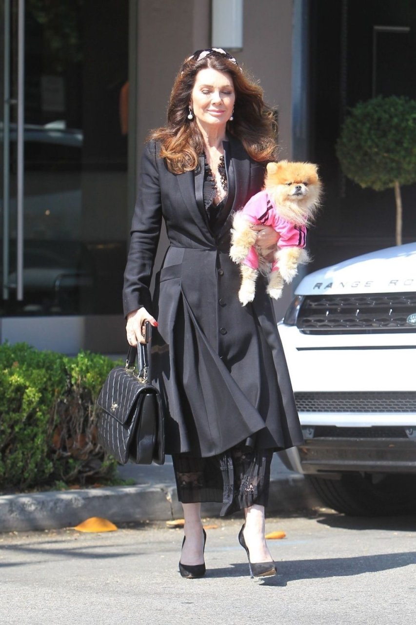 La restauratrice britannique et personnalité de la télévision Lisa Vanderpump emmène son chien faire des courses à Melrose Place à Hollywood, 24/06/2019.
