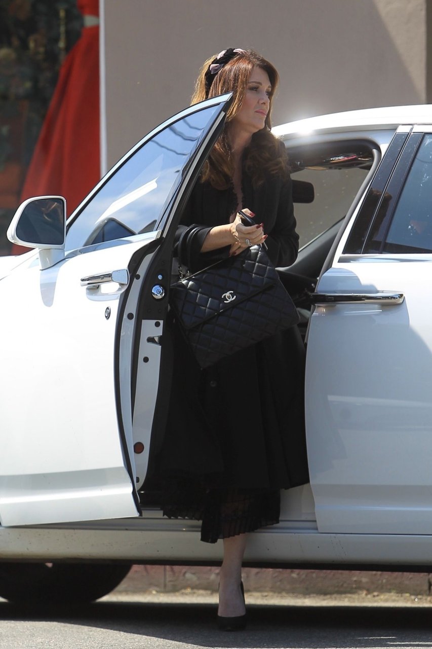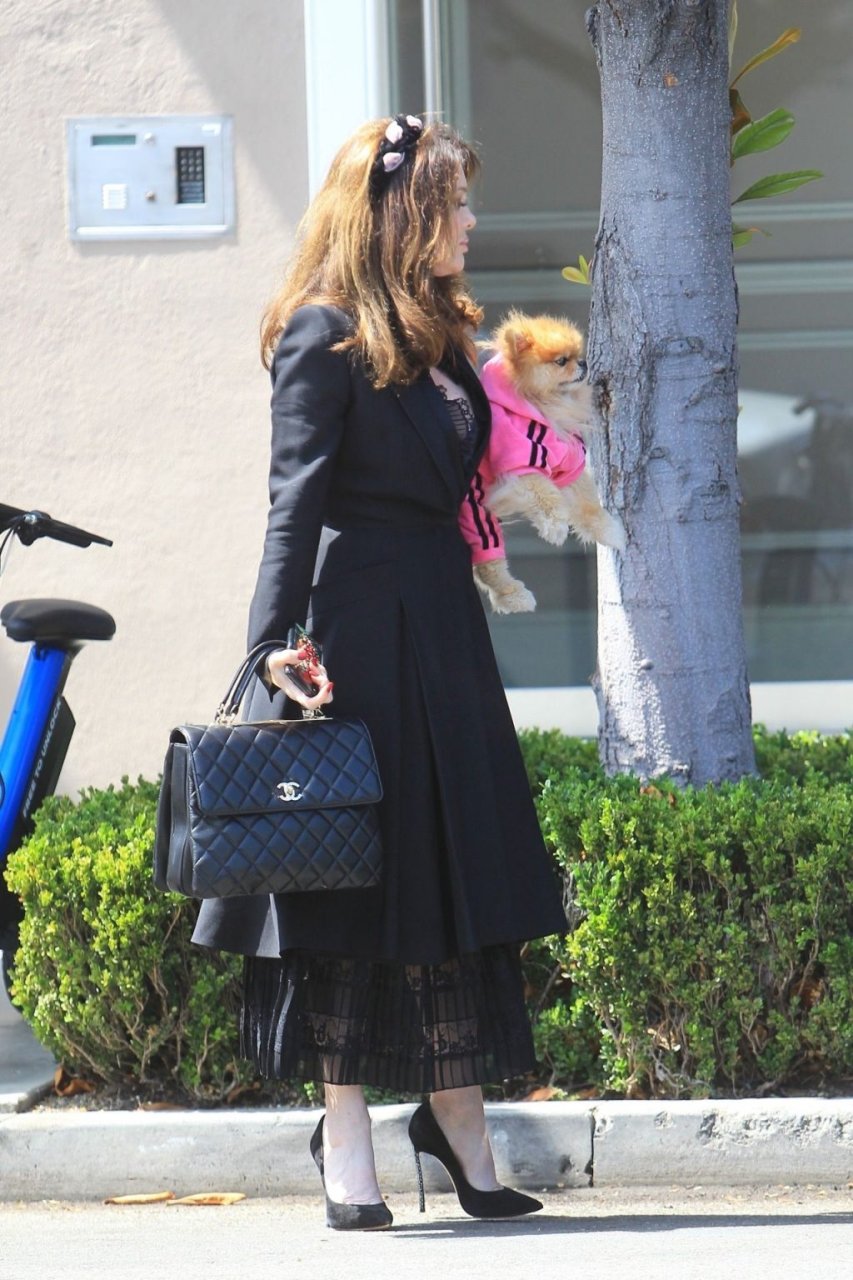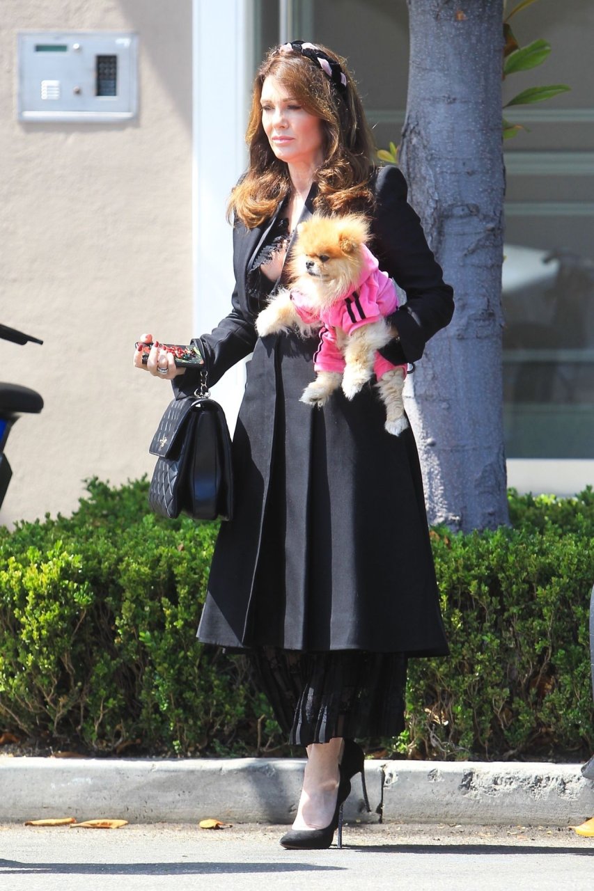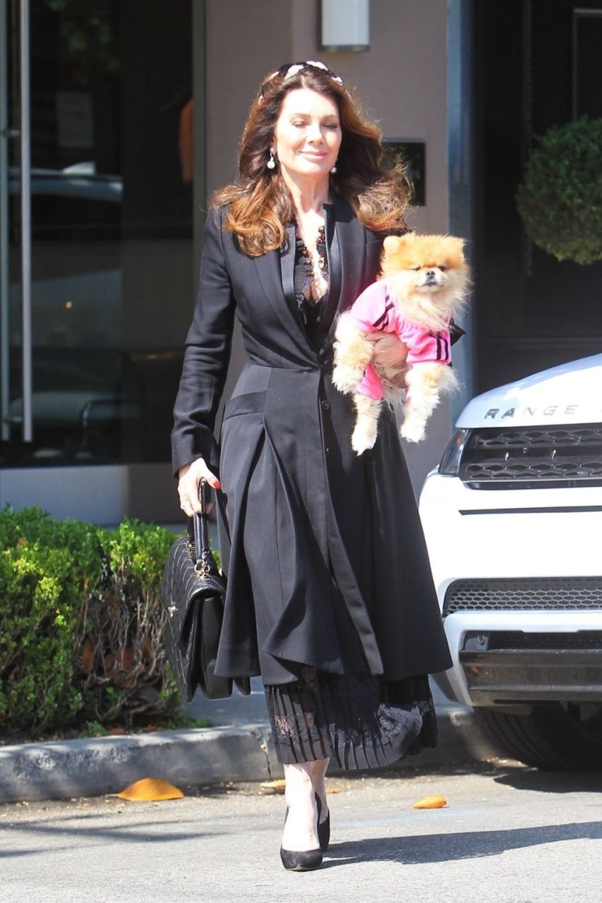 La restauratrice britannique et personnalité de la télévision Lisa Vanderpump emmène son chien faire des courses à Melrose Place à Hollywood, 24/06/2019.