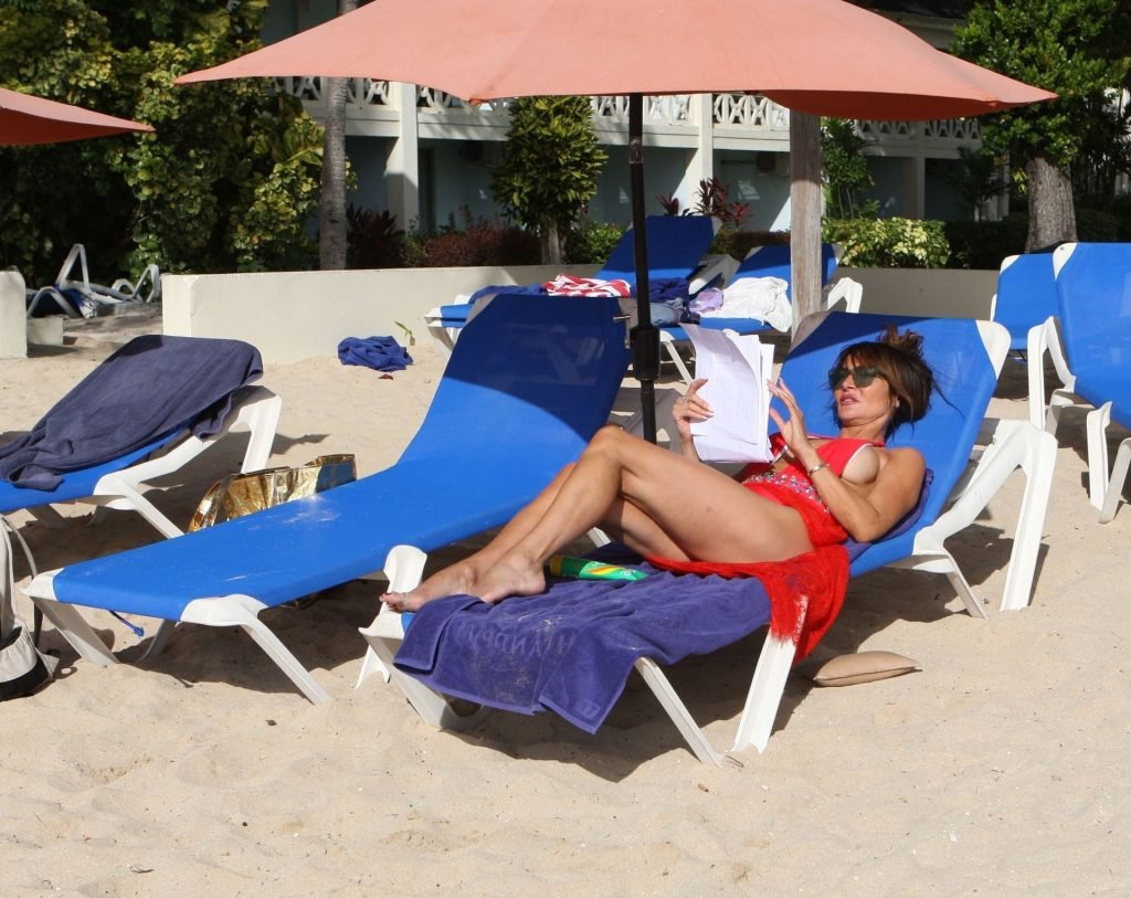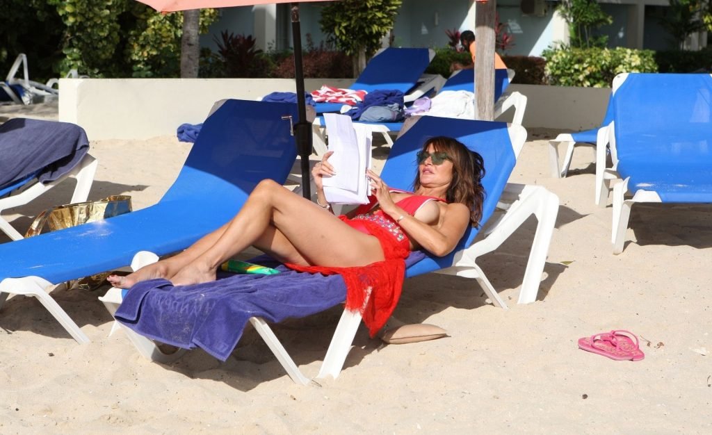 Lizzie Cundy semble apprendre ses répliques en lisant un script sur sa chaise longue tout en passant des vacances sur l’île ensoleillée de la Barbade, 30/12/2018. Lizzie a ébloui dans une robe de plage fluide à col halter révélant beaucoup de côtés de poitrine.