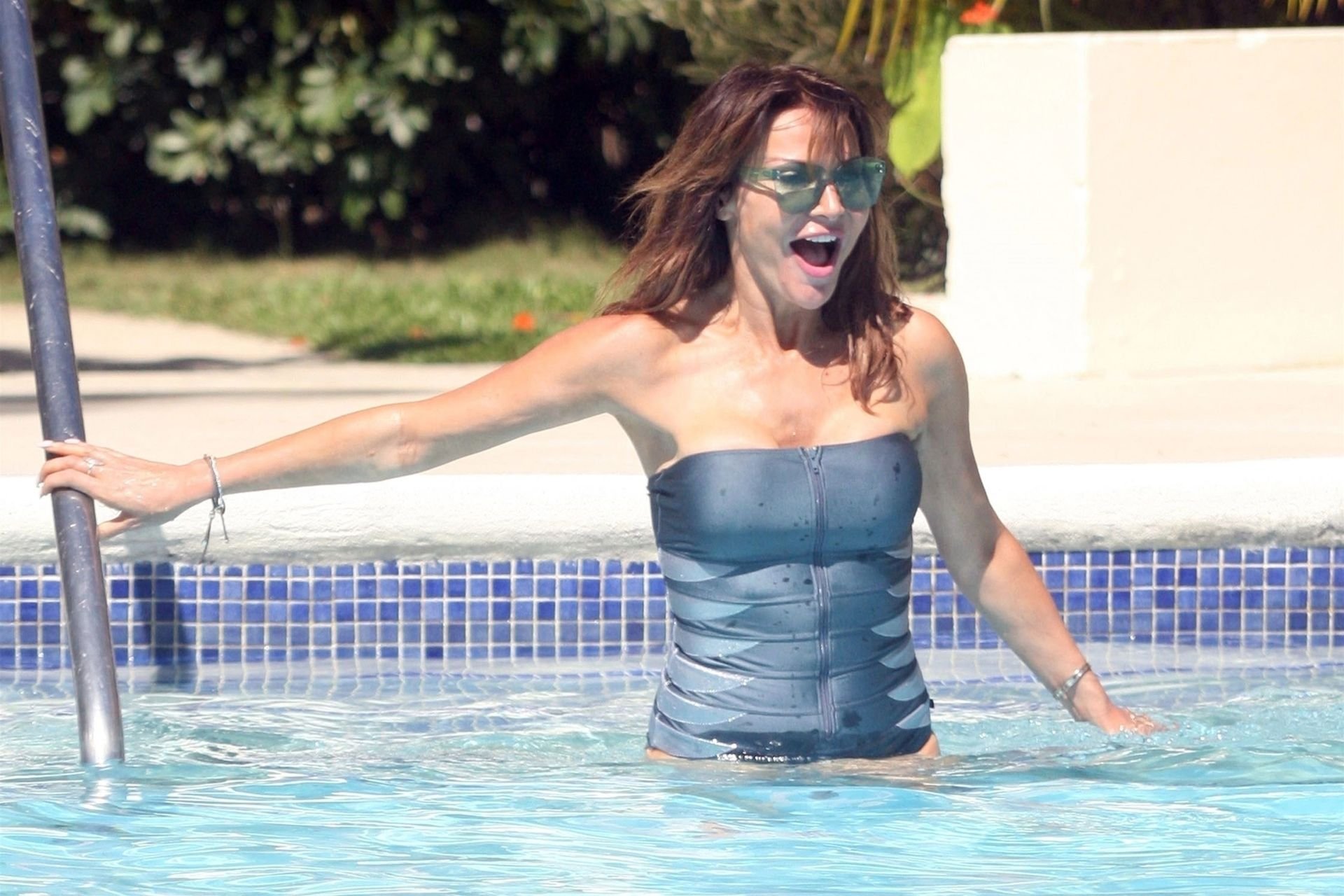 La présentatrice télé britannique Lizzie Cundy, 49 ans, montre sa silhouette élancée en posant pour des photos vêtue d’un maillot de bain argenté, profitant d’une baignade dans la piscine lors de ses vacances à la Barbade, 01/02/2019.