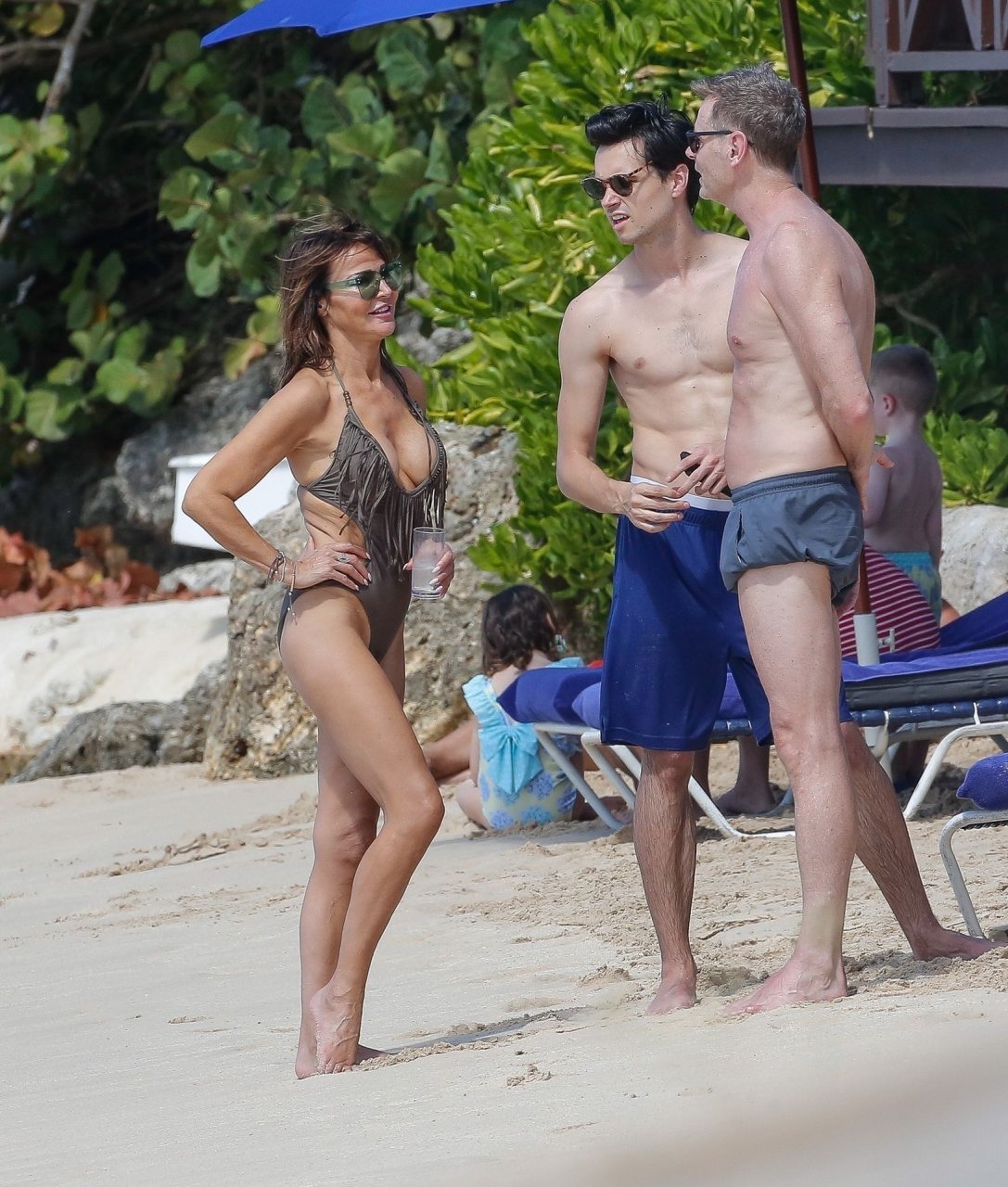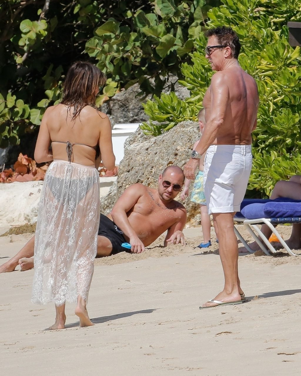 Le danseur Bruno Tonioli est aperçu avec Liz Cundy sur la plage pendant des vacances à la Barbade, le 30/12/2018. La star anglaise de la télévision a eu un léger problème de tenue pendant la baignade.