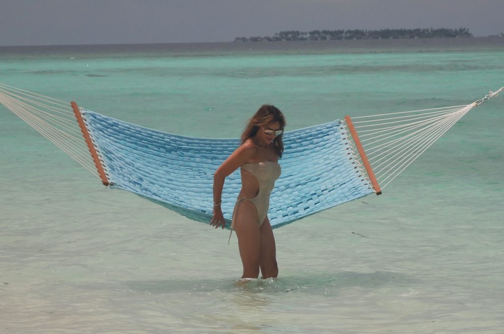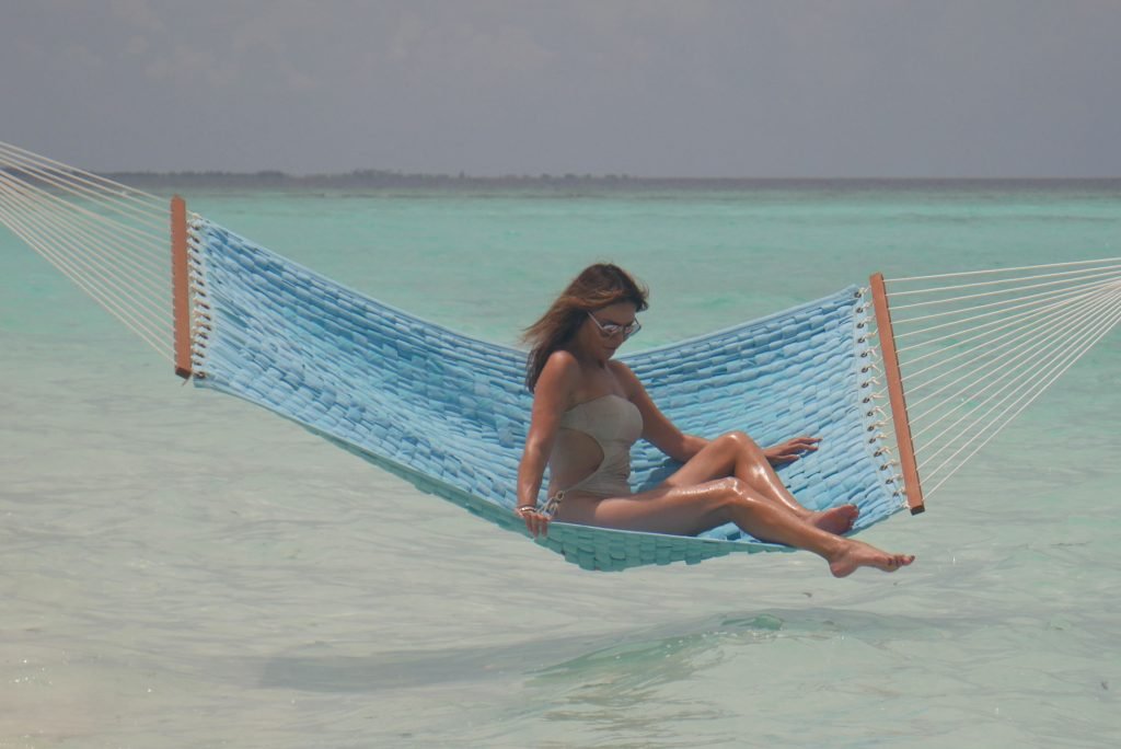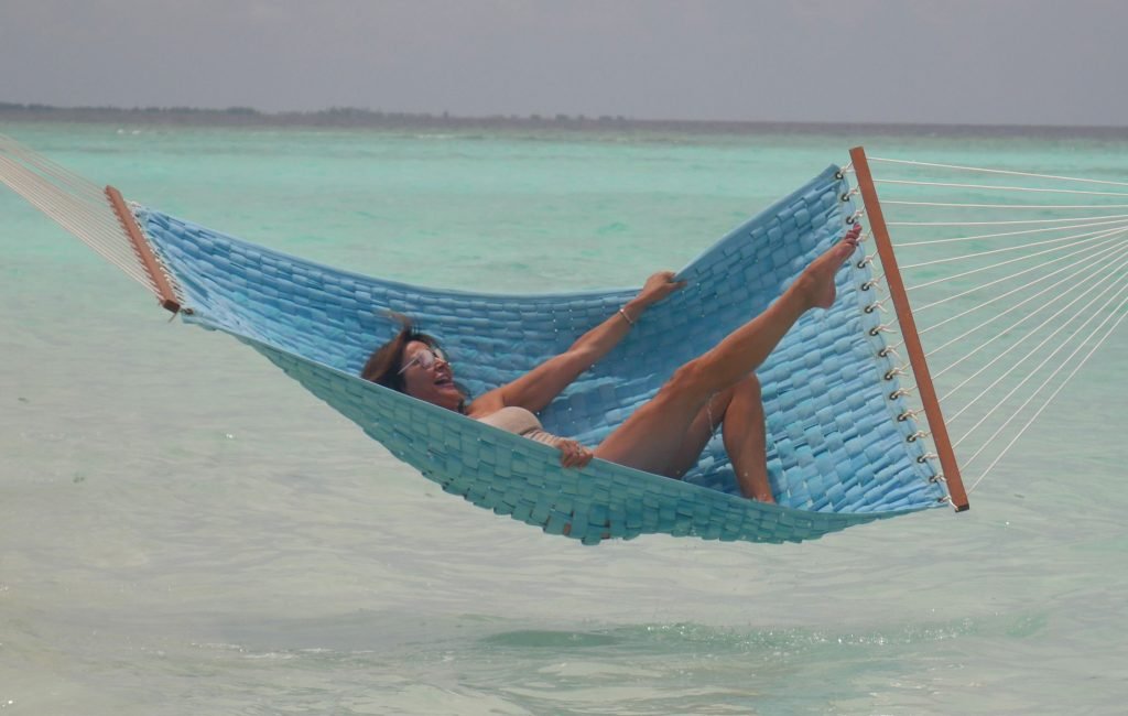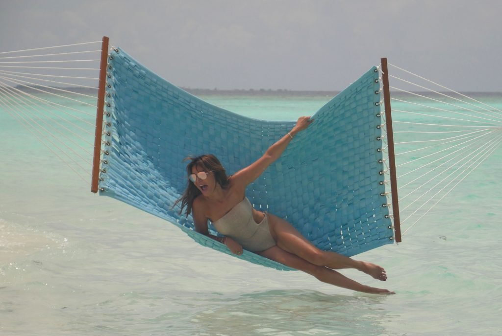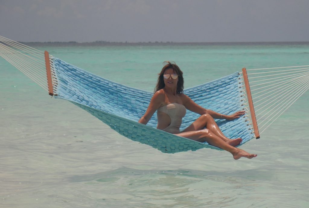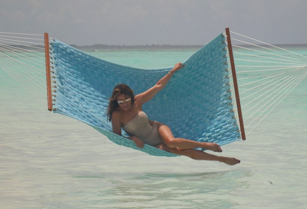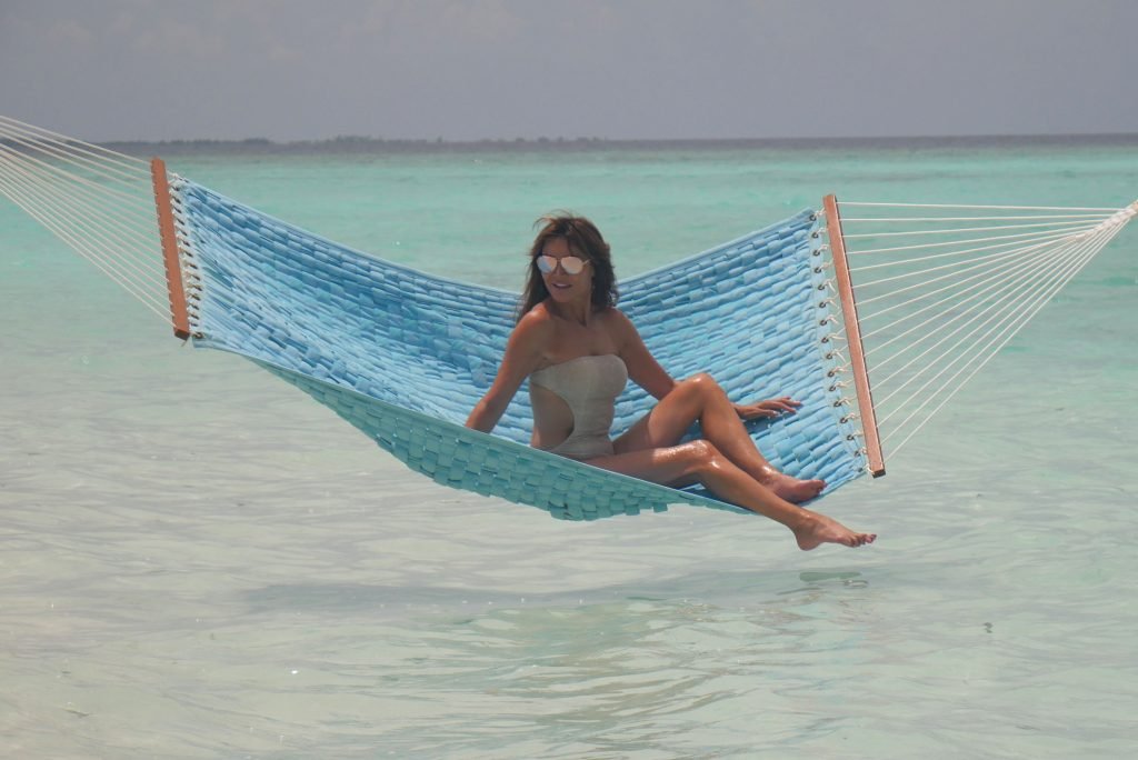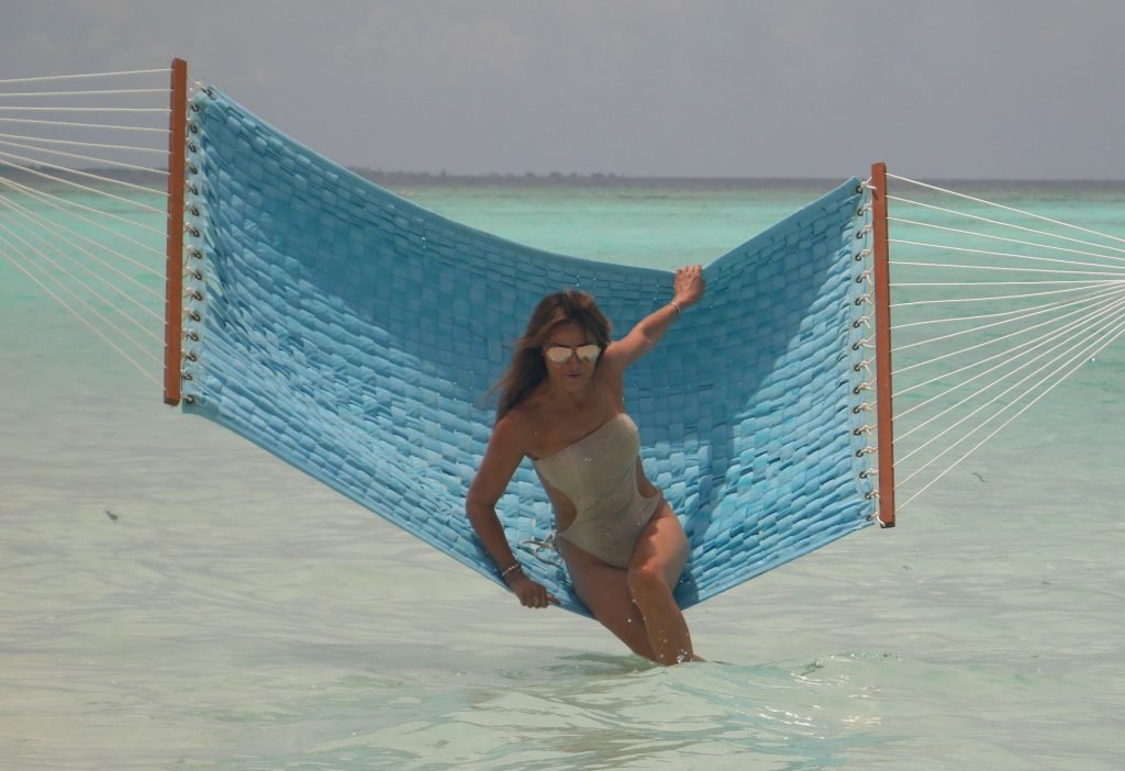 Lizzie Cundy (48 ans) anime le Festival International du Film à Sun Siyam Iru Fushi, Maldives. Elle parvient à trouver un peu de temps pour se détendre dans un hamac au-dessus de la mer, 09/08/2018.