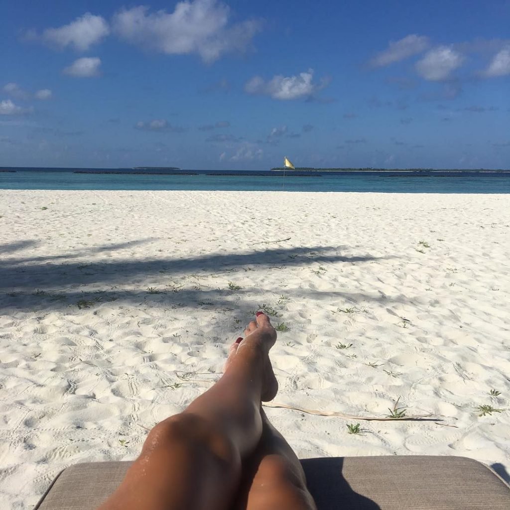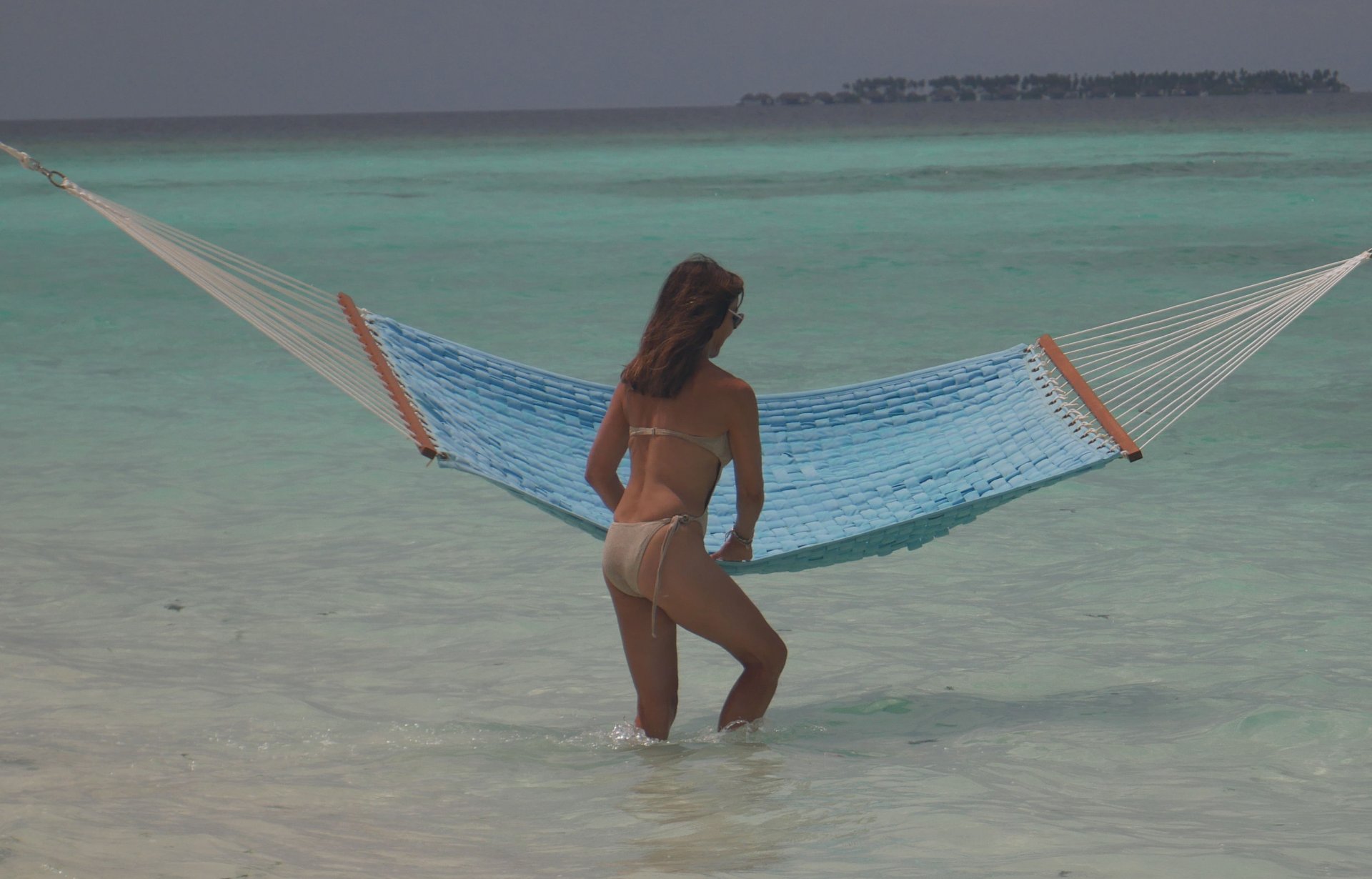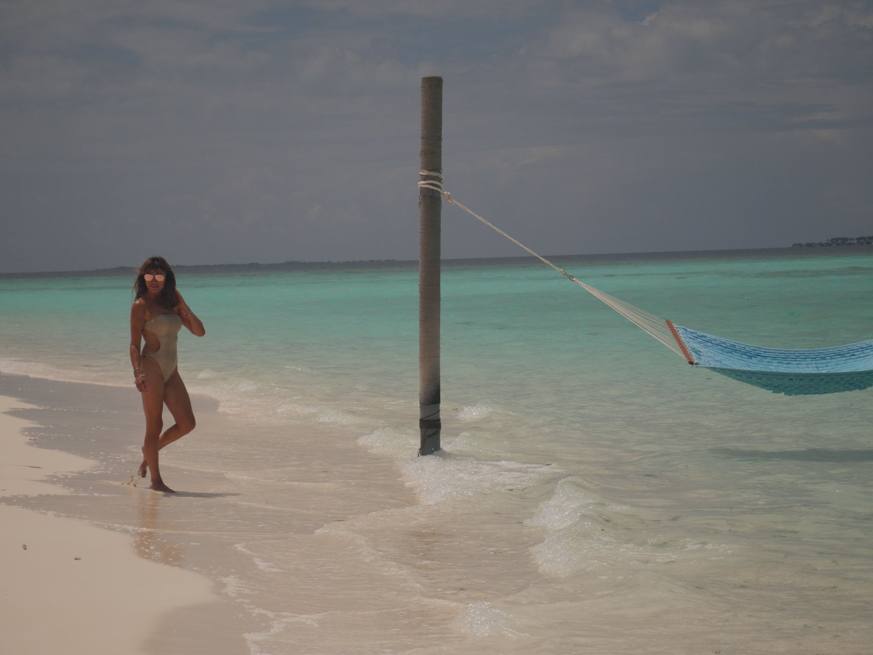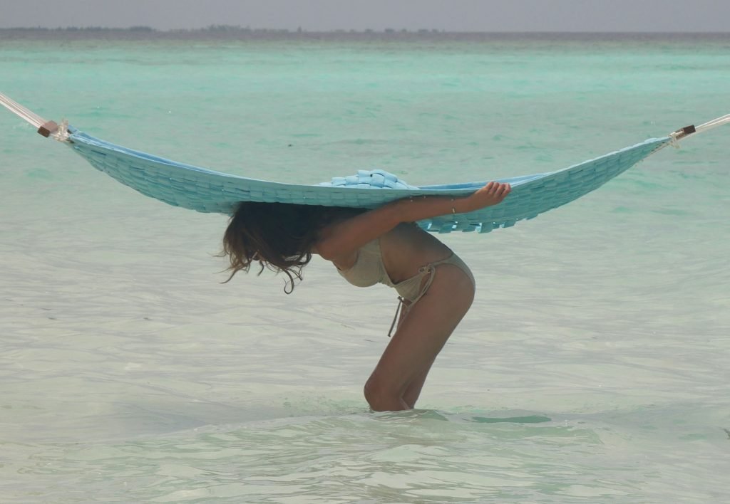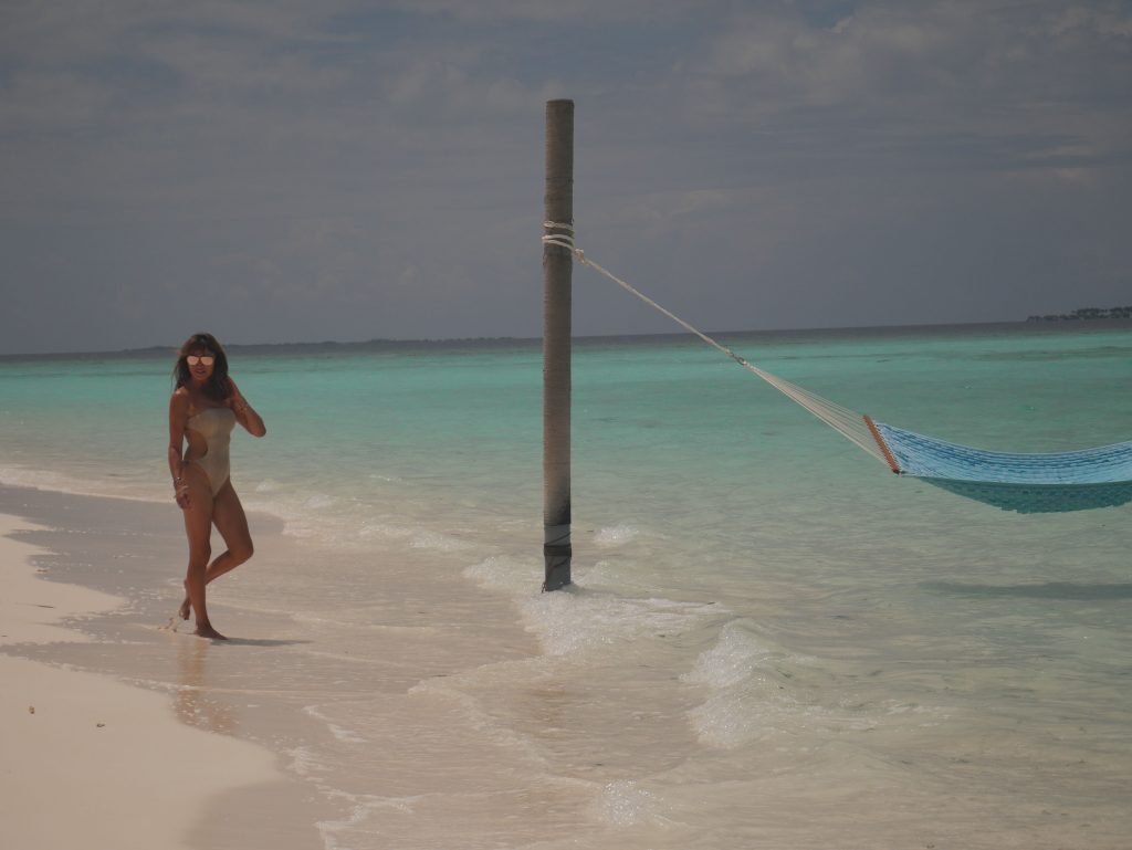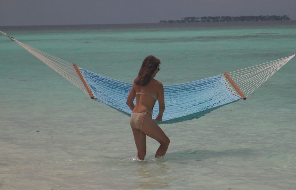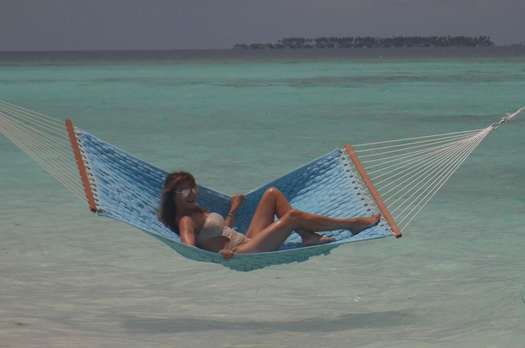 Lizzie Cundy (48 ans) anime le Festival International du Film à Sun Siyam Iru Fushi, Maldives. Elle parvient à trouver un peu de temps pour se détendre dans un hamac au-dessus de la mer, 09/08/2018.