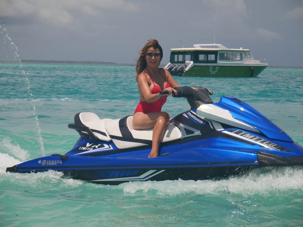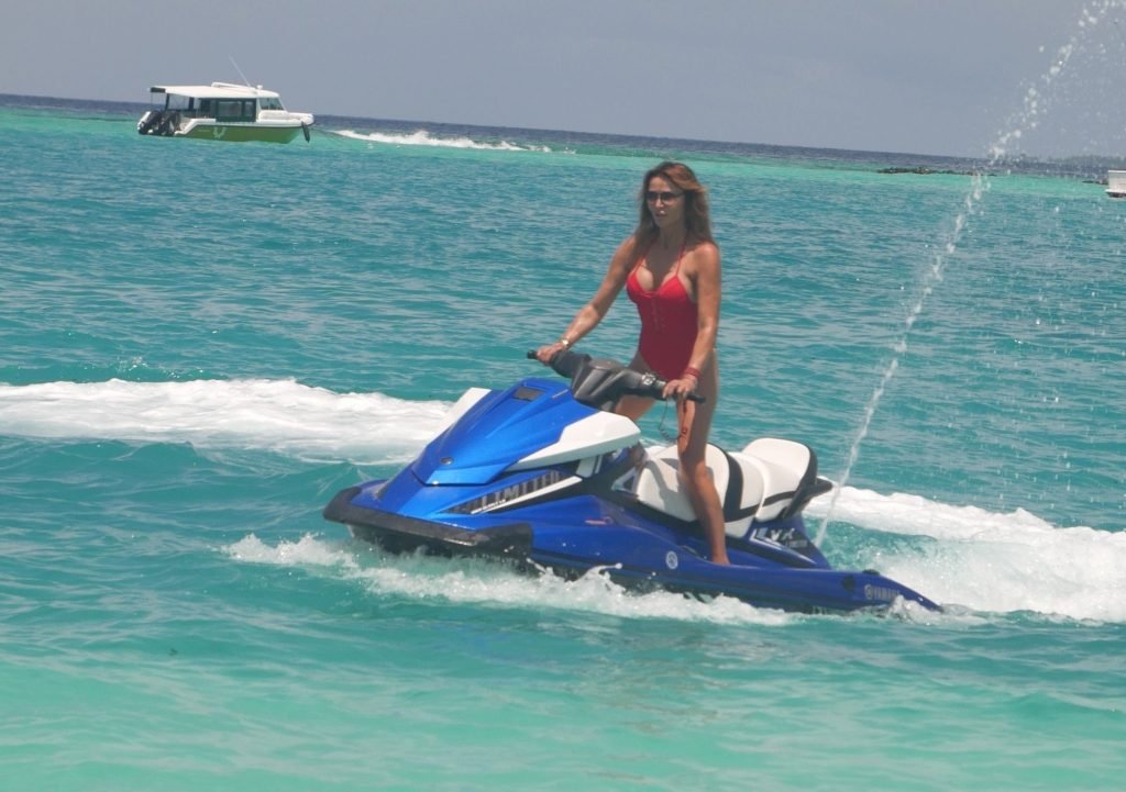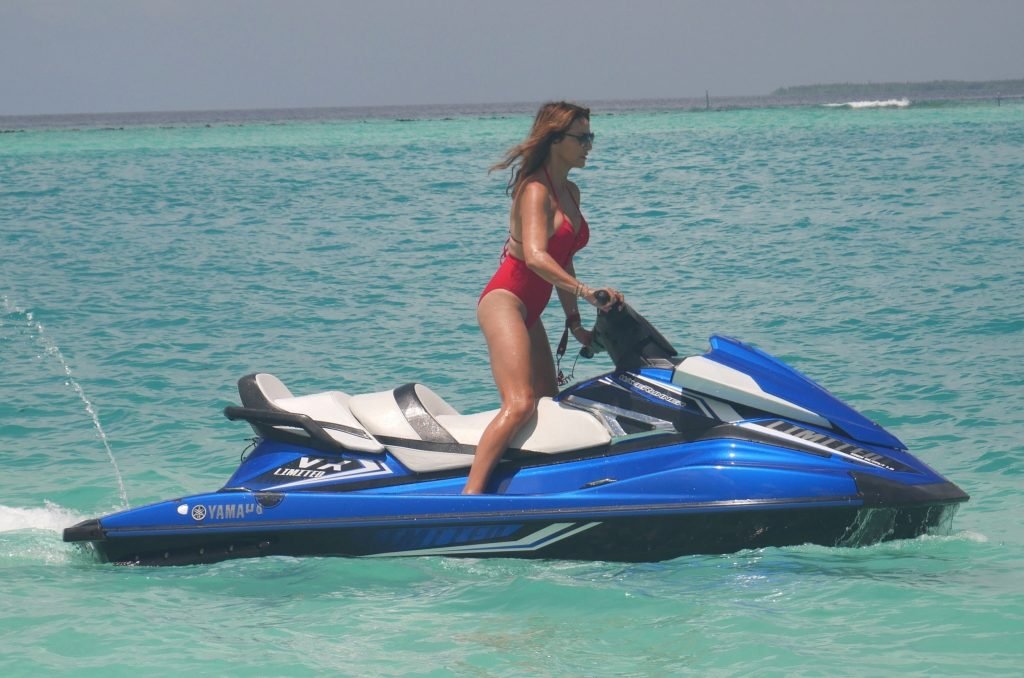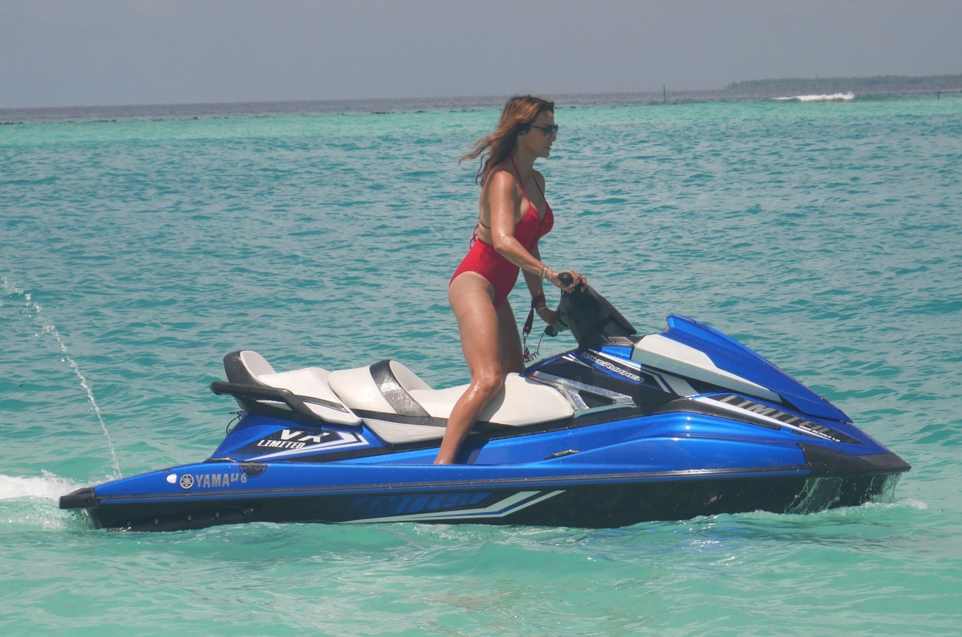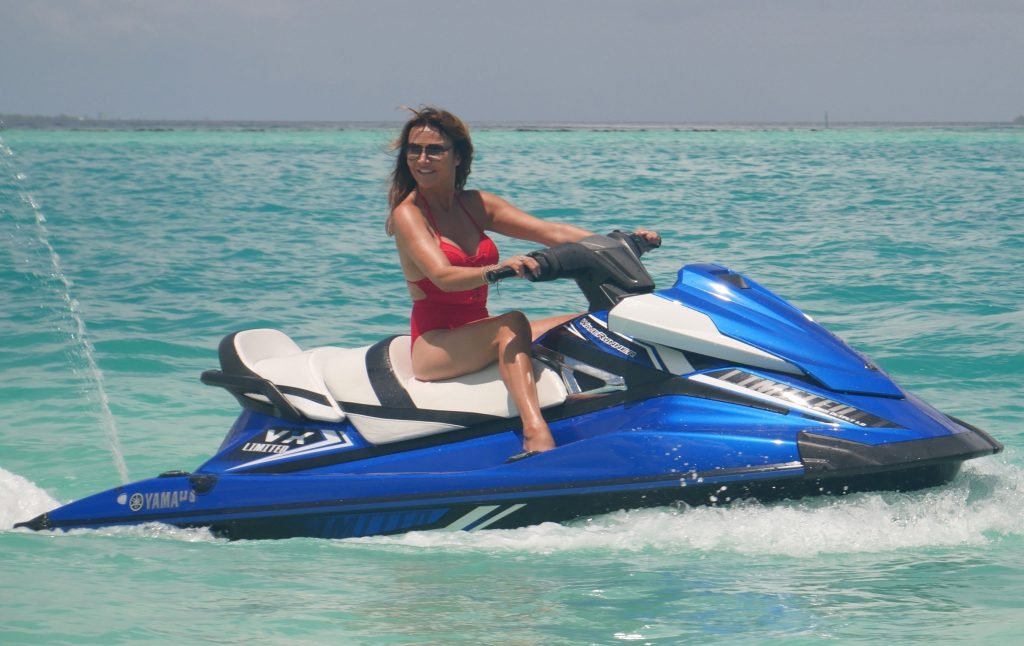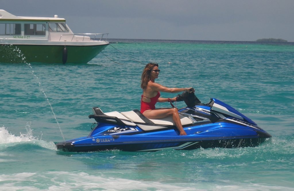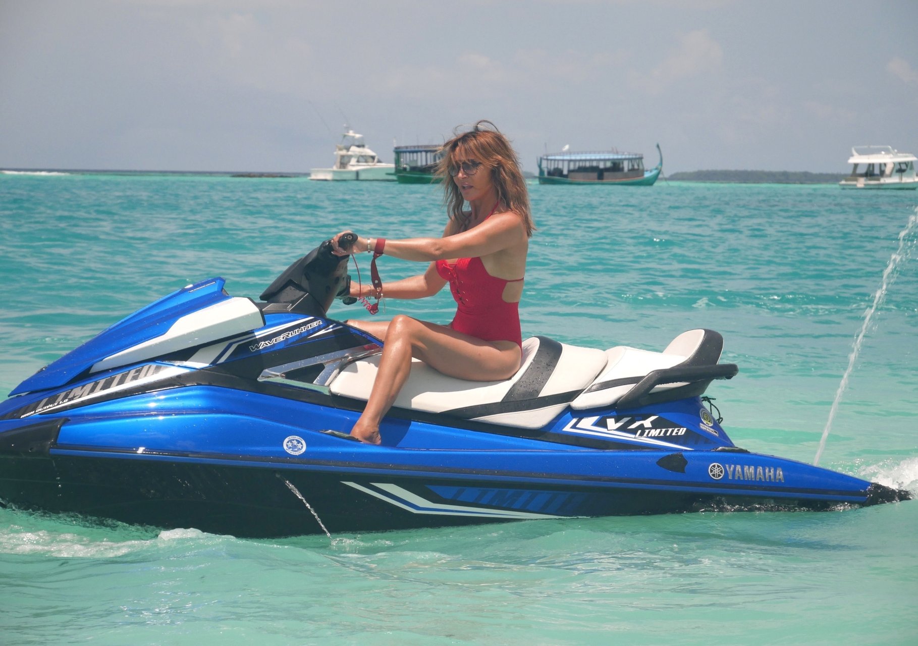 Lizzie Cundy a été vue au Sun Siyam Iru Fushi Resort aux Maldives, le 09/10/2018. Elle parvient à prendre un peu de temps pour se détendre au bord de la piscine et s’amuse un peu en jet ski.