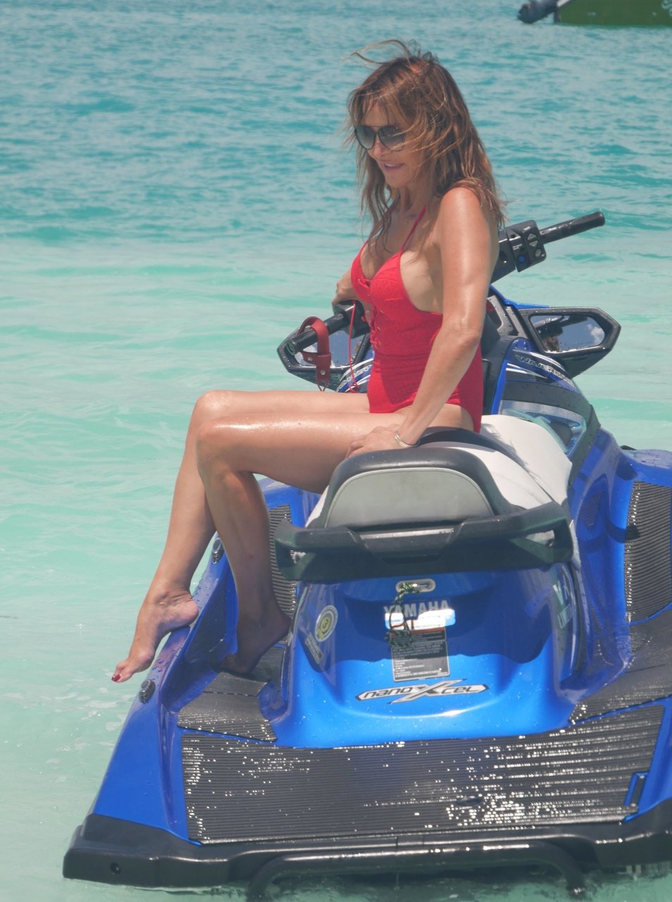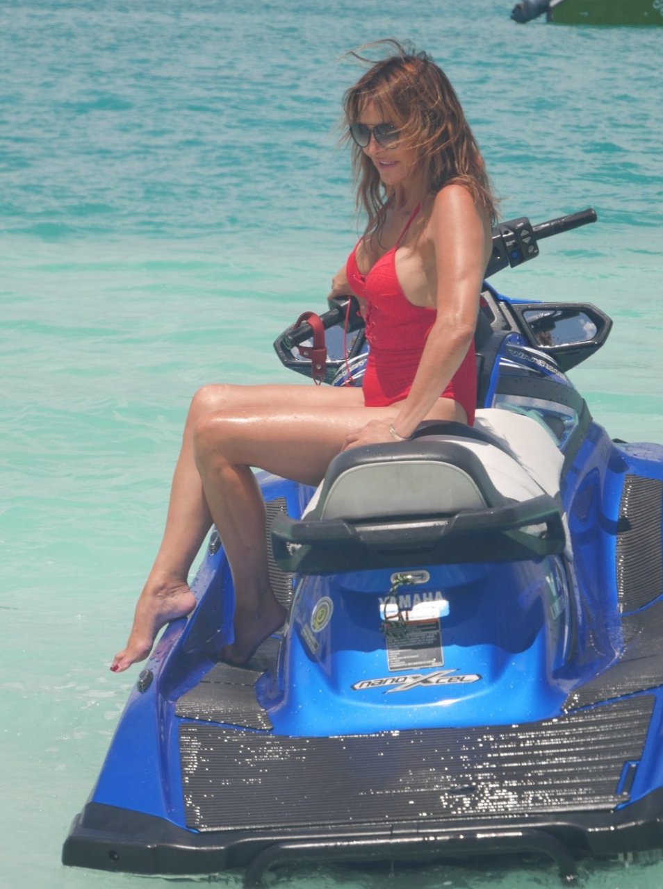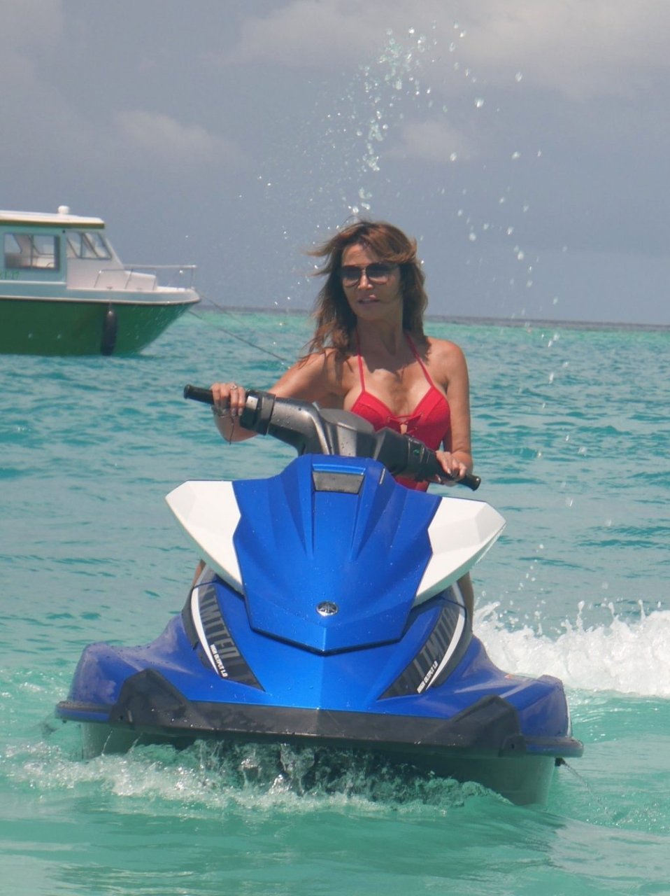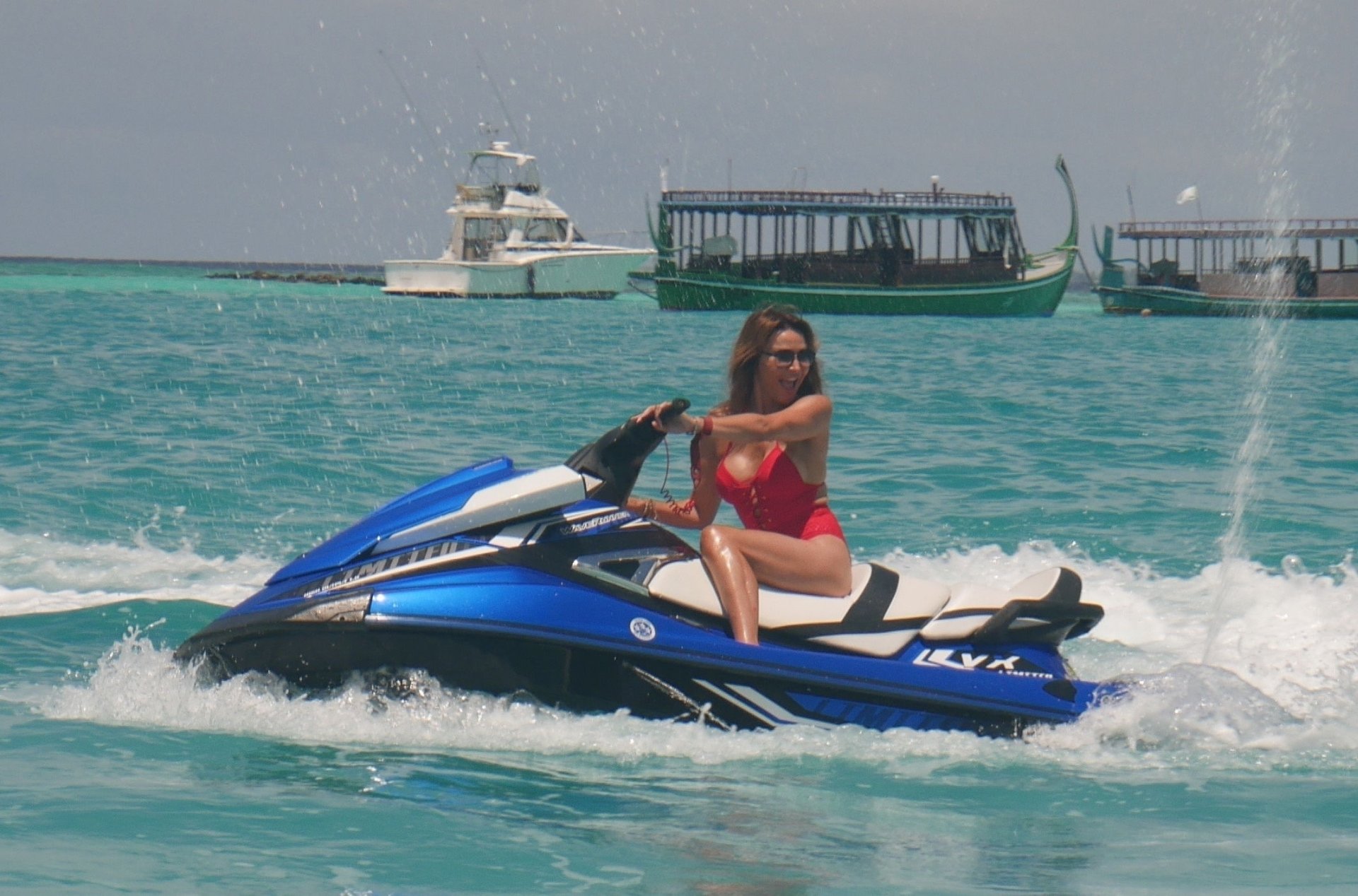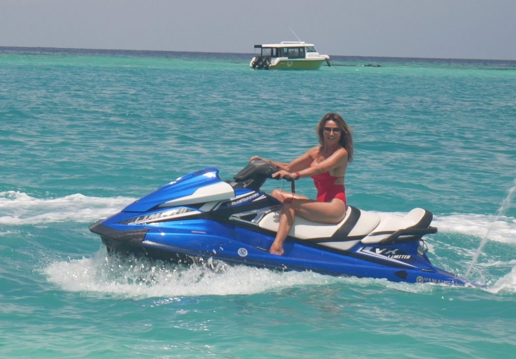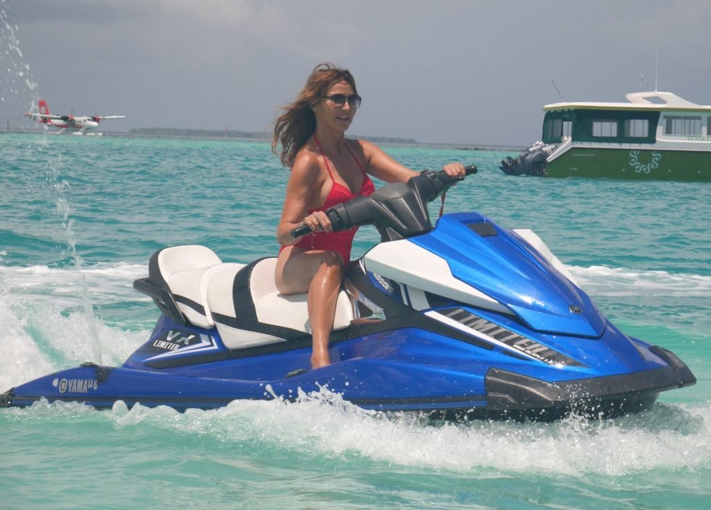 Lizzie Cundy a été vue au Sun Siyam Iru Fushi Resort aux Maldives, le 09/10/2018. Elle parvient à prendre un peu de temps pour se détendre au bord de la piscine et s’amuse un peu en jet ski.