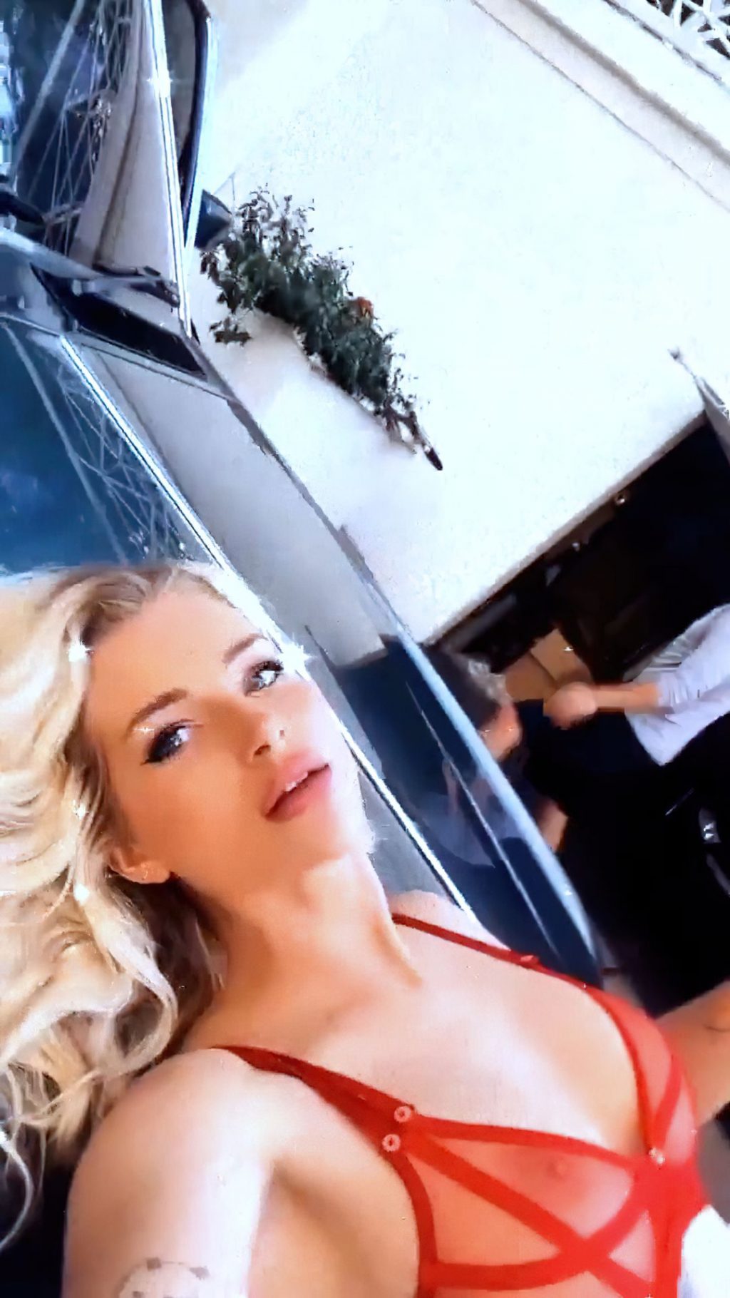 Model Lottie Moss montre ses seins légèrement nus alors qu’elle pose sur une voiture en lingerie rouge en dentelle lors d’une séance photo récente pour @mymomwillneverseethese – Instagram, 13/03/2021.