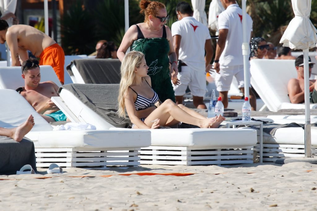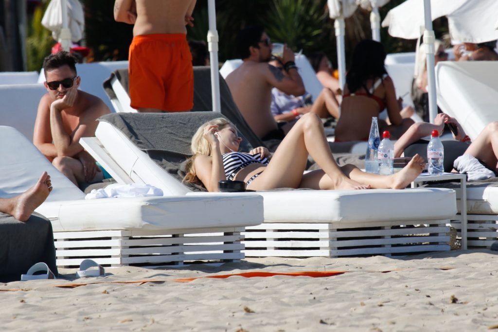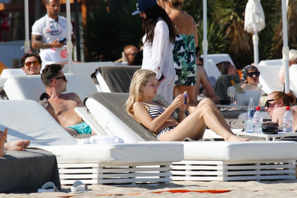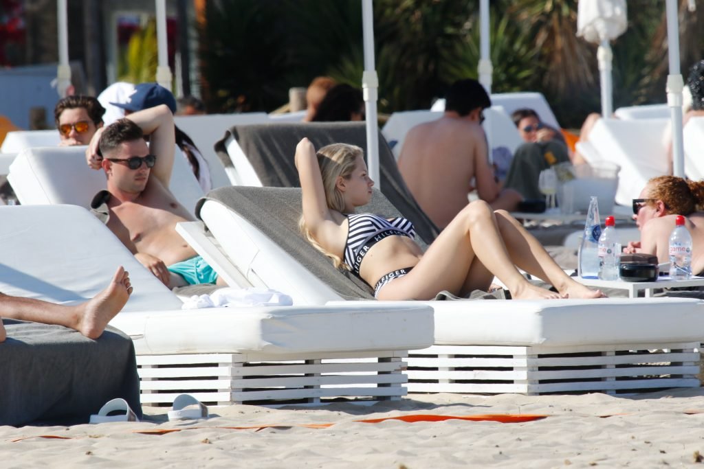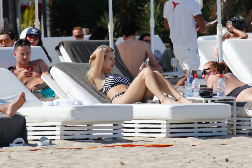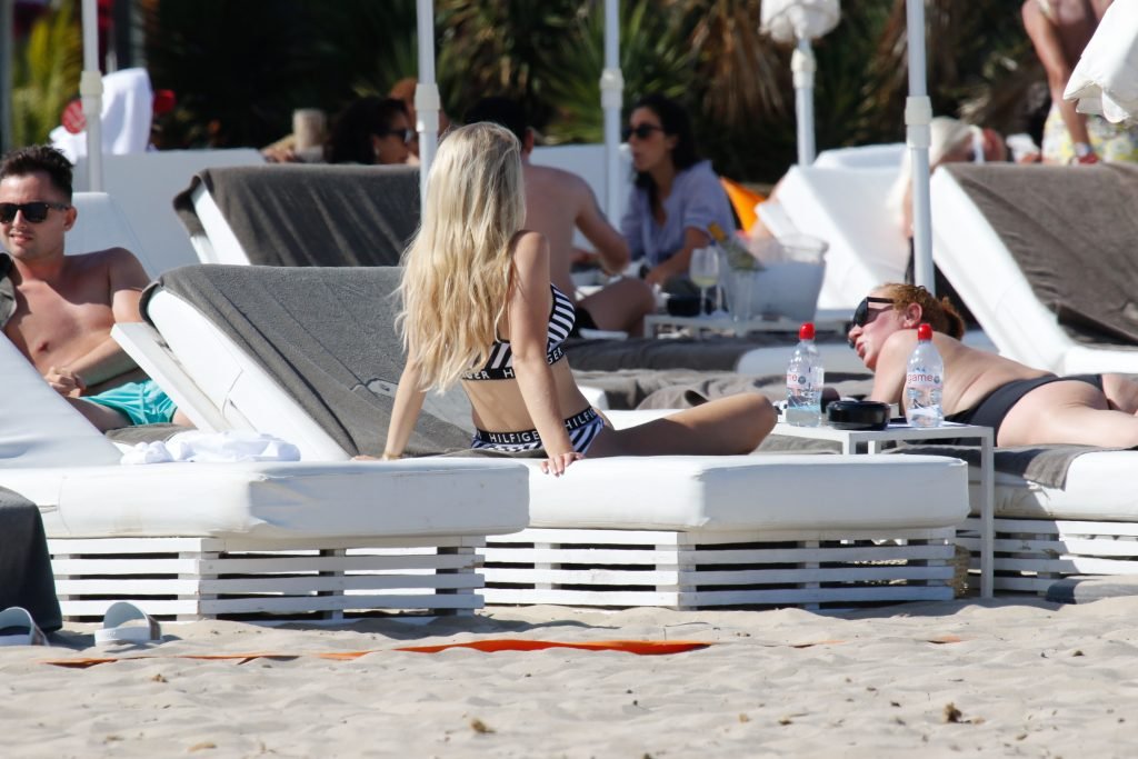 Le mannequin Lottie Moss, 20 ans, se détend sur la plage en bikini Tommy Hilfiger à Ibiza, le 23/05/2018. Le mannequin a été vu en train de se relaxer avec une amie au soleil, consultant son téléphone et fumant une cigarette.