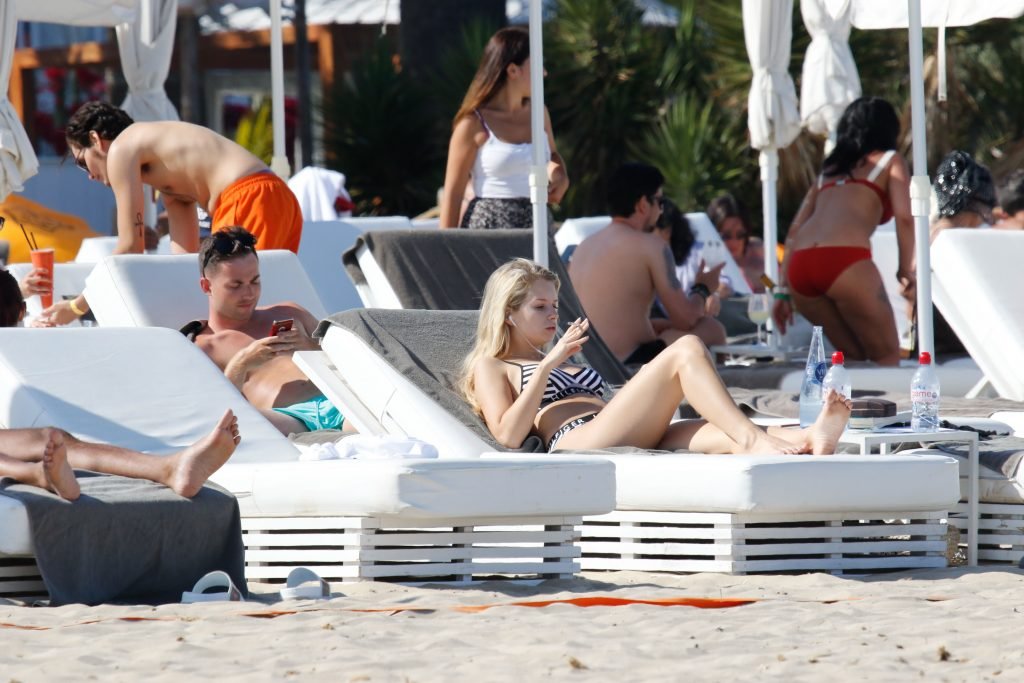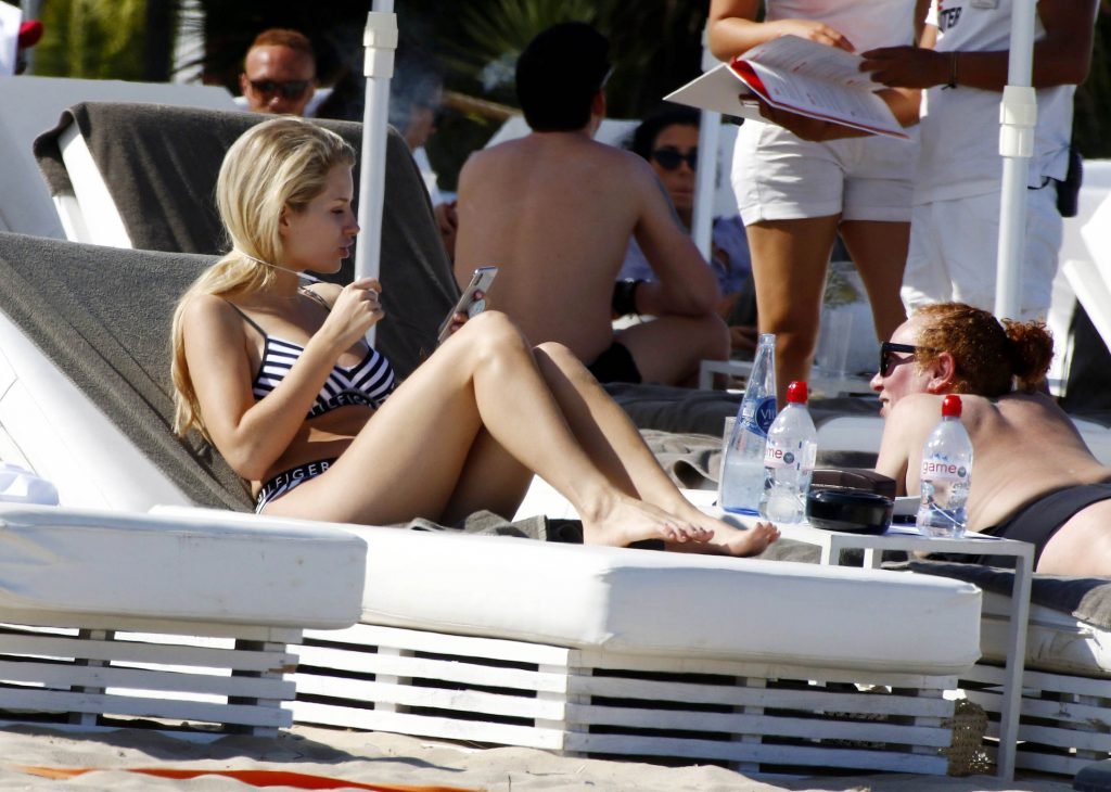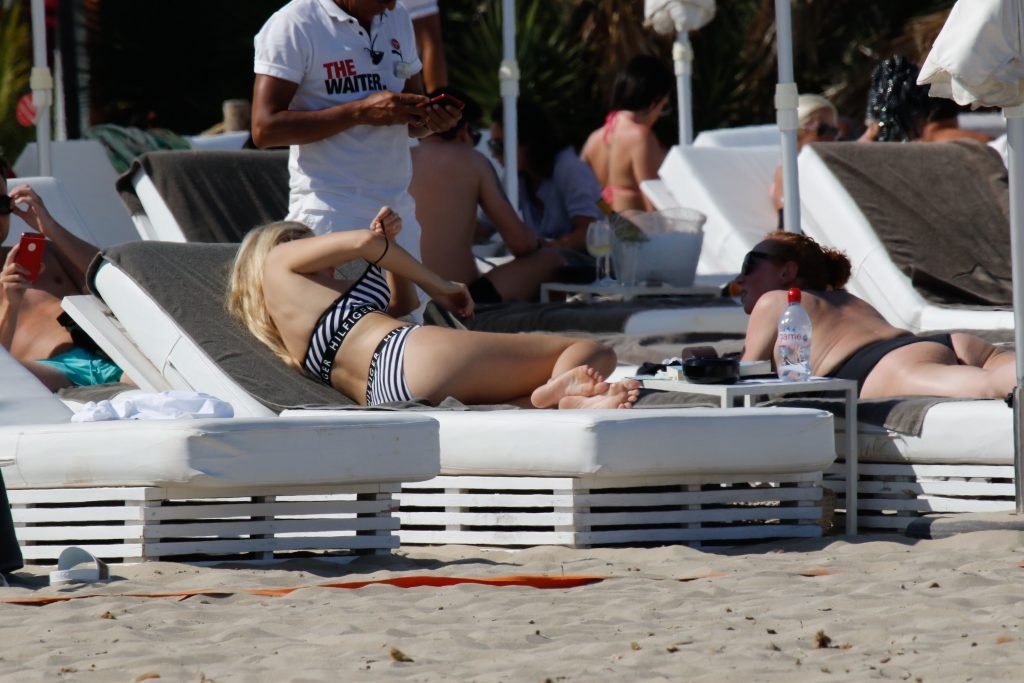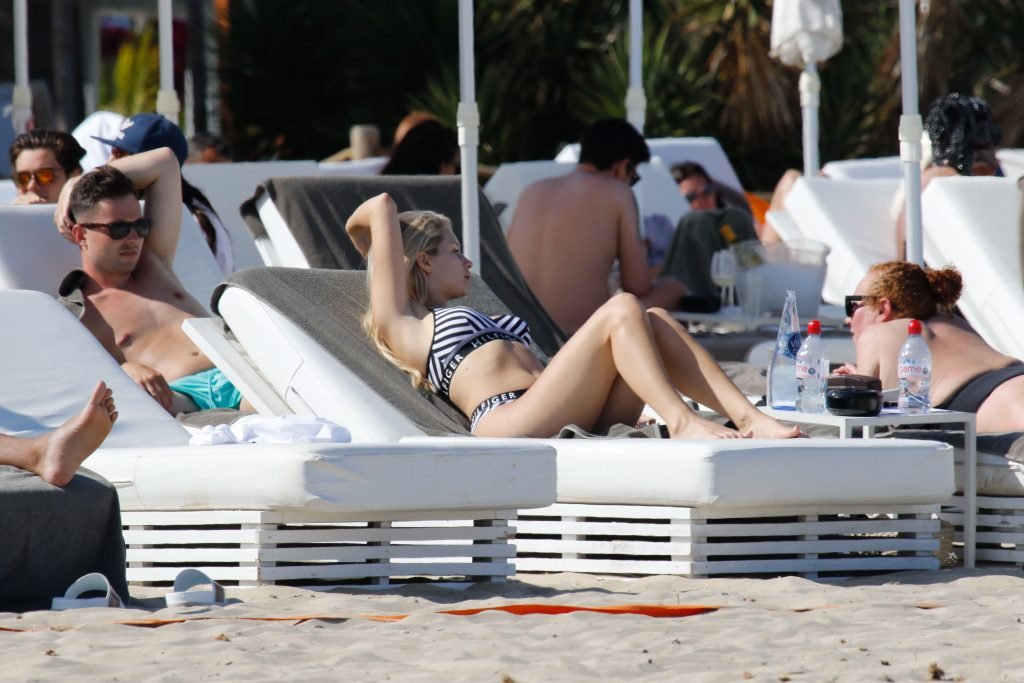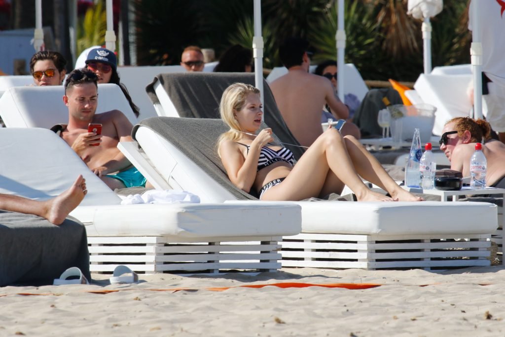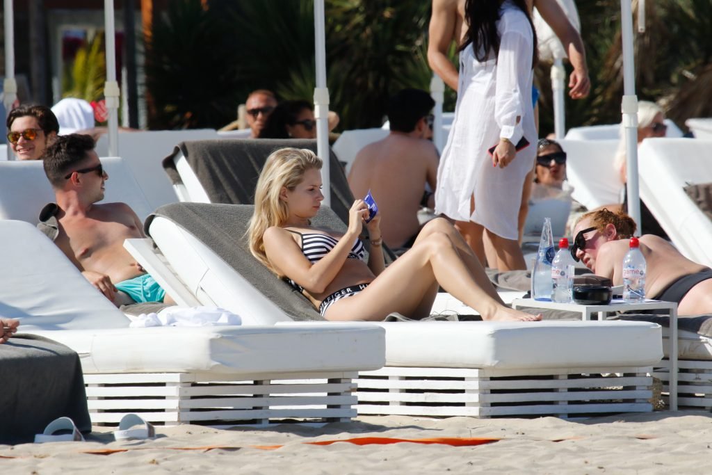 Le mannequin Lottie Moss, 20 ans, se détend sur la plage en bikini Tommy Hilfiger à Ibiza, le 23/05/2018. Le mannequin a été vu en train de se relaxer avec une amie au soleil, consultant son téléphone et fumant une cigarette.