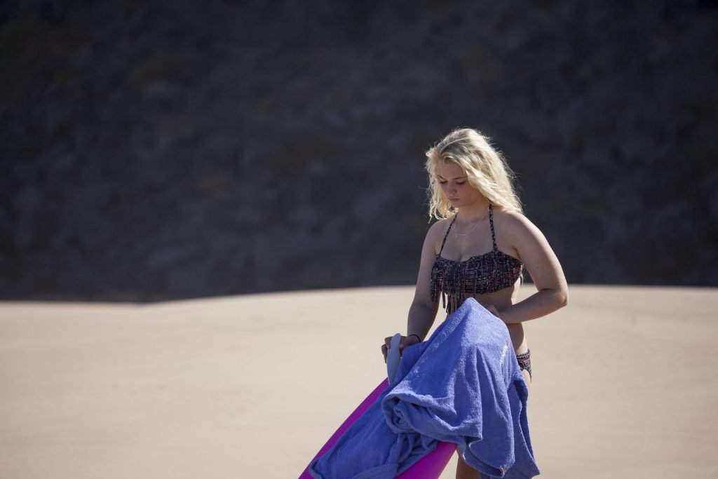 Lucie Donlan de Love Island pose pour une séance photo de surfwear à Fuerteventura. L’autoproclamée « Barbie du surf » a défilé sur la plage en bikinis et combinaisons de plongée pour la marque Protest en 2014 et 2015. Lucie est restée célibataire dans la villa après que Joe Garratt ait été évincé par le public.